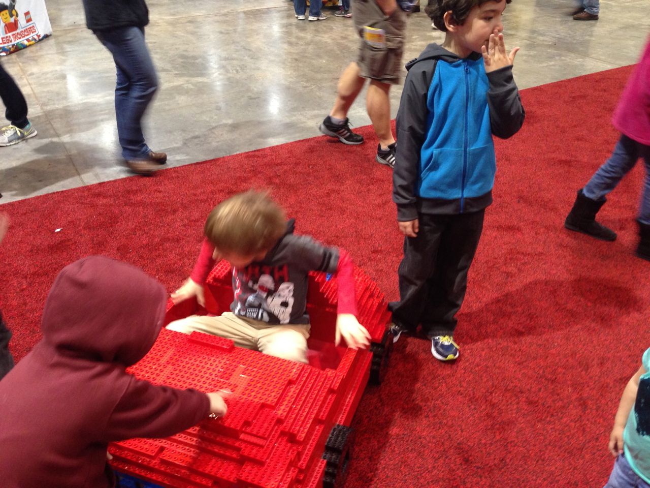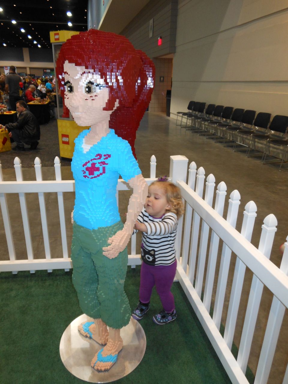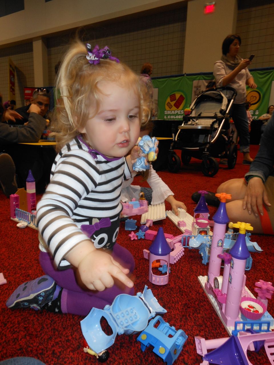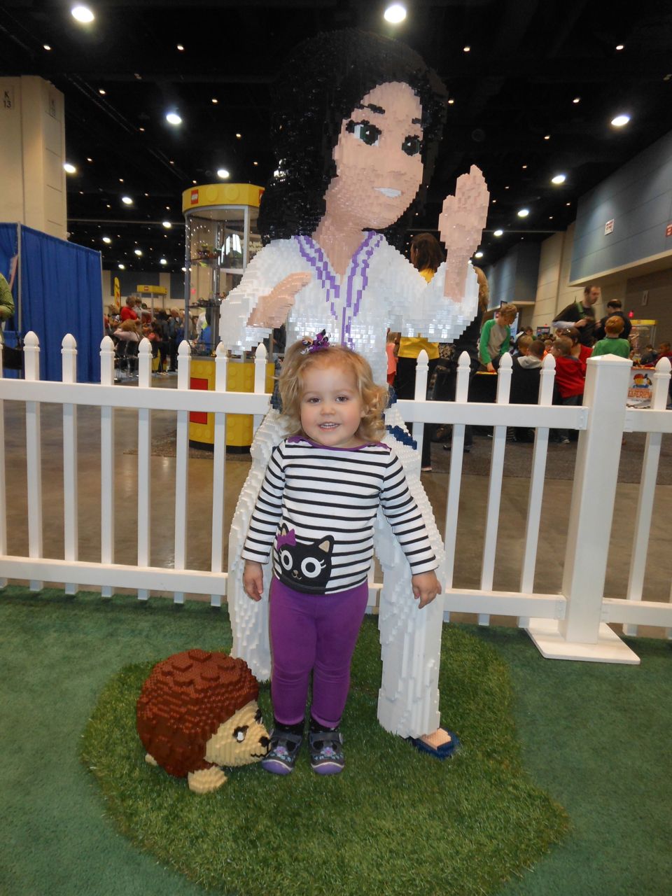Lego Kids Fest is back in Raleigh! We didn’t think it would be back so soon–usually they don’t repeat cities, but I suppose the Fest was a big success here! I know we did our part when it was here last time, and today was no different. 😉 Like before, the Fest is about four hours of somewhat-controlled chaos, and never seems quite long enough. There were some new attractions this year, and Kendall got a lot more out of it this time! She enjoyed the Duplo piles quite a bit (I am always a little dismayed that they make two Duplo piles, one of standard bricks and one of pink princess bricks–why not mix them together? Argh!) Kendall had fun with both piles, though, and we made some cool things with the Cinderella castle elements. I did not plan on liking that princess stuff at all, but..! Kendall showed me that there are more possibilities than I’d considered. 🙂 She also really liked the Lego Friends section–she’s technically too little for those, but she can build with them like bigger kids, and she doesn’t try to eat the small pieces anymore. 😉 Brian had a very special Fest, because both Ty and Nico also attended! He spent some time with each friend, and all three of them managed to get together now and then. Brian enjoyed the car racing as usual, and he spent some time with the Chima stuff with Ty, and attended the Master Builder session with Nico. There were lots of cool life-size models, and the Star Wars ones were pretty popular. Kendall liked the Lego Movie and Lego Friends ones, especially a very cute little panda bear. He was really cute–I loved all the details and his little teeth! Brian liked the tiger a lot, and the super heroes (even though he insists he’s not into superheroes). We picked up some items for the kids at the shop, and Brian told us some ideas for his wish list–particularly this Star Wars Republic Gunship. The kids both played in the giant brick pile, making brick angels and crashing noisily through the bricks. We stayed until the closing bell, just like before, and although it was tough to leave, we had to. Kendall was pretty much toast by the end, so we had to head home for her nap. With one last burst of energy, the kids leaped onto their plasma cars in the garage–but we did get Kendall down for a nap, eventually, and Brian played with more Legos on the first floor. He made a pretty awesome minifigure party, and we remembered to take some pictures of the Family House with the light-up chandelier that we’d built awhile ago.
