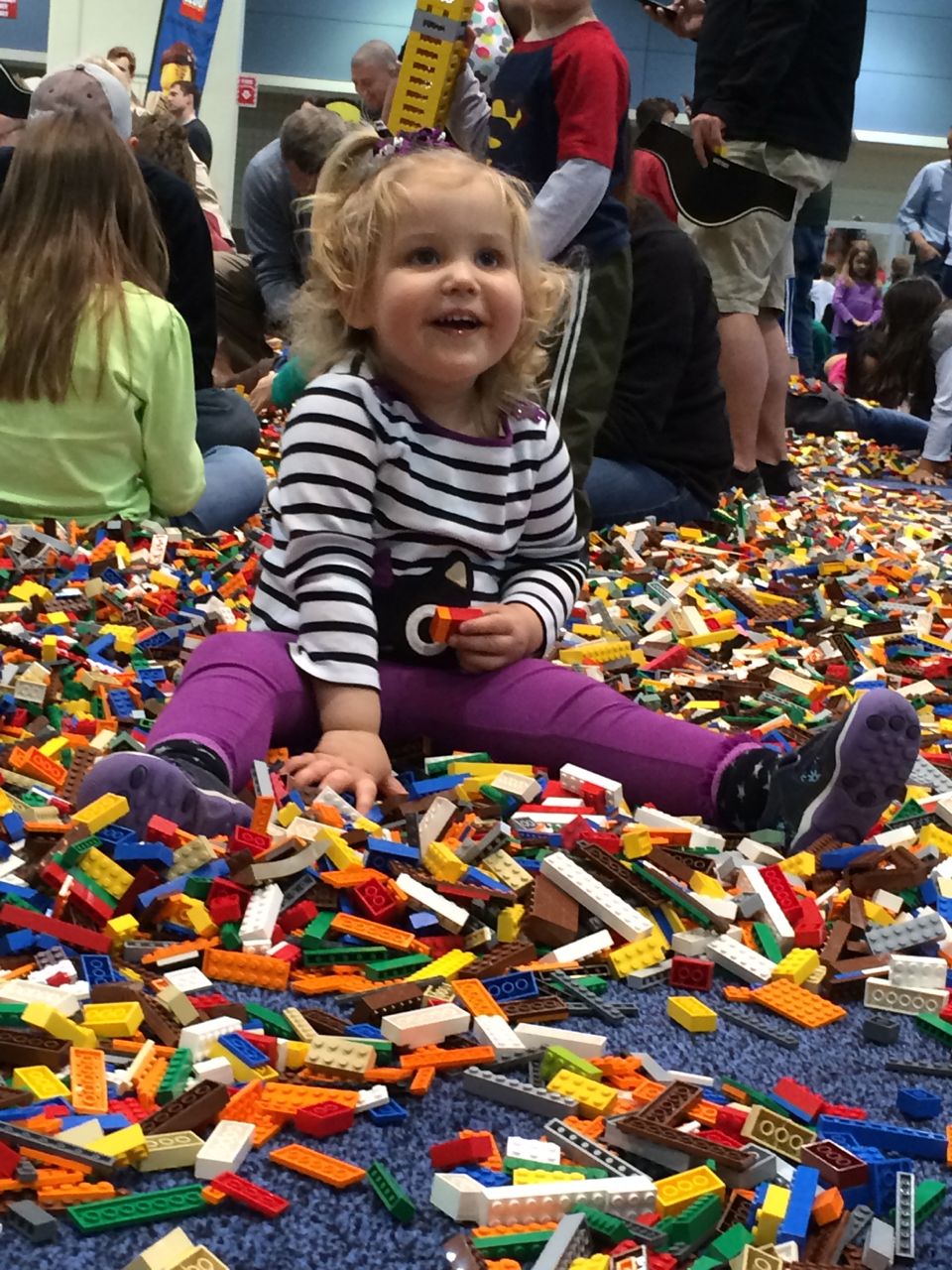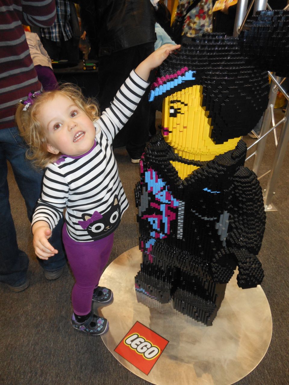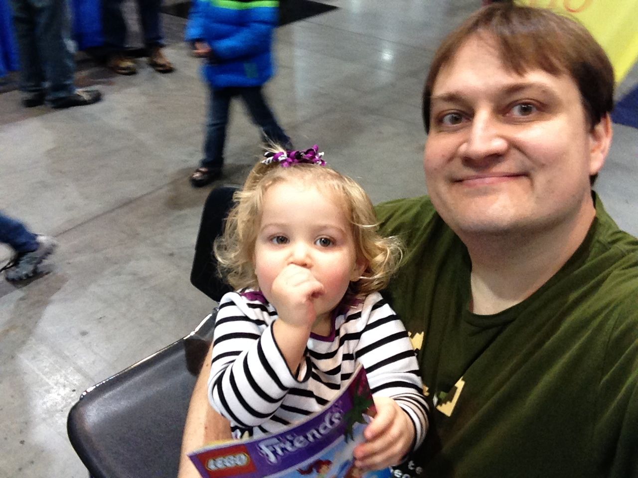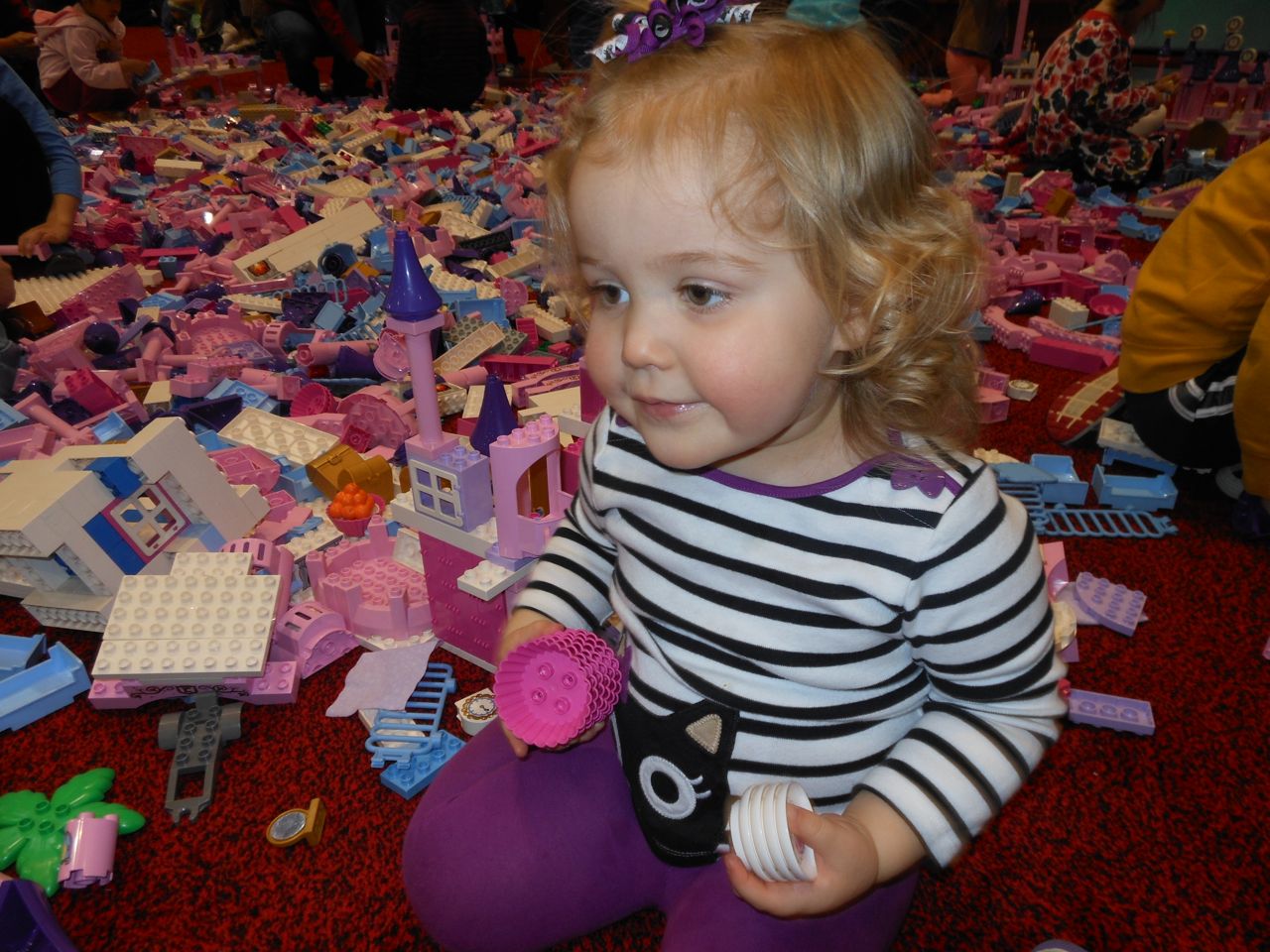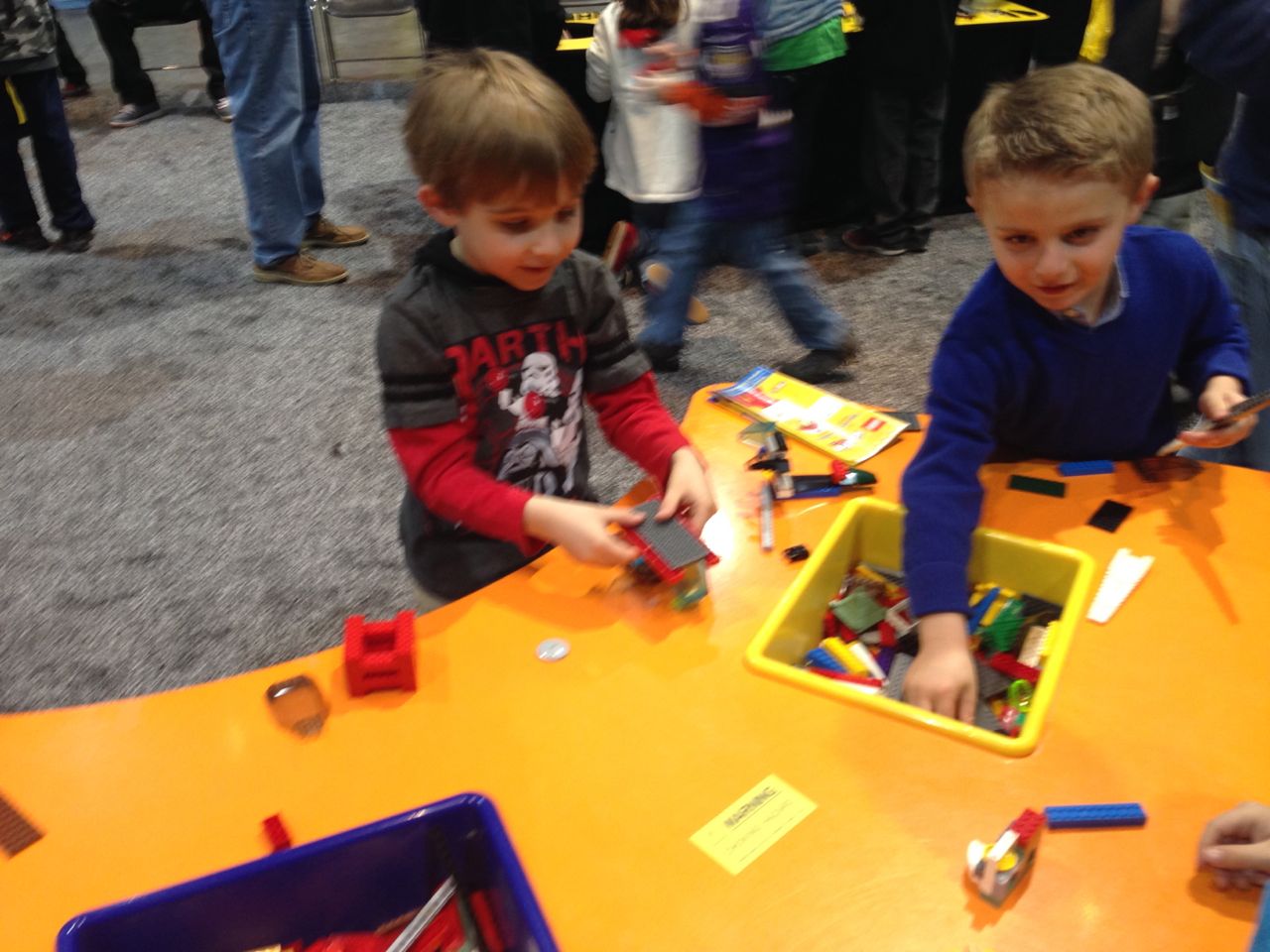 Lego Kids Fest is back in Raleigh! We didn’t think it would be back so soon–usually they don’t repeat cities, but I suppose the Fest was a big success here! I know we did our part when it was here last time, and today was no different. 😉 Like before, the Fest is about four hours of somewhat-controlled chaos, and never seems quite long enough. There were some new attractions this year, and Kendall got a lot more out of it this time! She enjoyed the Duplo piles quite a bit (I am always a little dismayed that they make two Duplo piles, one of standard bricks and one of pink princess bricks–why not mix them together? Argh!) Kendall had fun with both piles, though, and we made some cool things with the Cinderella castle elements. I did not plan on liking that princess stuff at all, but..! Kendall showed me that there are more possibilities than I’d considered. 🙂 She also really liked the Lego Friends section–she’s technically too little for those, but she can build with them like bigger kids, and she doesn’t try to eat the small pieces anymore. 😉 Brian had a very special Fest, because both Ty and Nico also attended! He spent some time with each friend, and all three of them managed to get together now and then. Brian enjoyed the car racing as usual, and he spent some time with the Chima stuff with Ty, and attended the Master Builder session with Nico. There were lots of cool life-size models, and the Star Wars ones were pretty popular. Kendall liked the Lego Movie and Lego Friends ones, especially a very cute little panda bear. He was really cute–I loved all the details and his little teeth! Brian liked the tiger a lot, and the super heroes (even though he insists he’s not into superheroes). We picked up some items for the kids at the shop, and Brian told us some ideas for his wish list–particularly this Star Wars Republic Gunship. The kids both played in the giant brick pile, making brick angels and crashing noisily through the bricks. We stayed until the closing bell, just like before, and although it was tough to leave, we had to. Kendall was pretty much toast by the end, so we had to head home for her nap. With one last burst of energy, the kids leaped onto their plasma cars in the garage–but we did get Kendall down for a nap, eventually, and Brian played with more Legos on the first floor. He made a pretty awesome minifigure party, and we remembered to take some pictures of the Family House with the light-up chandelier that we’d built awhile ago.
