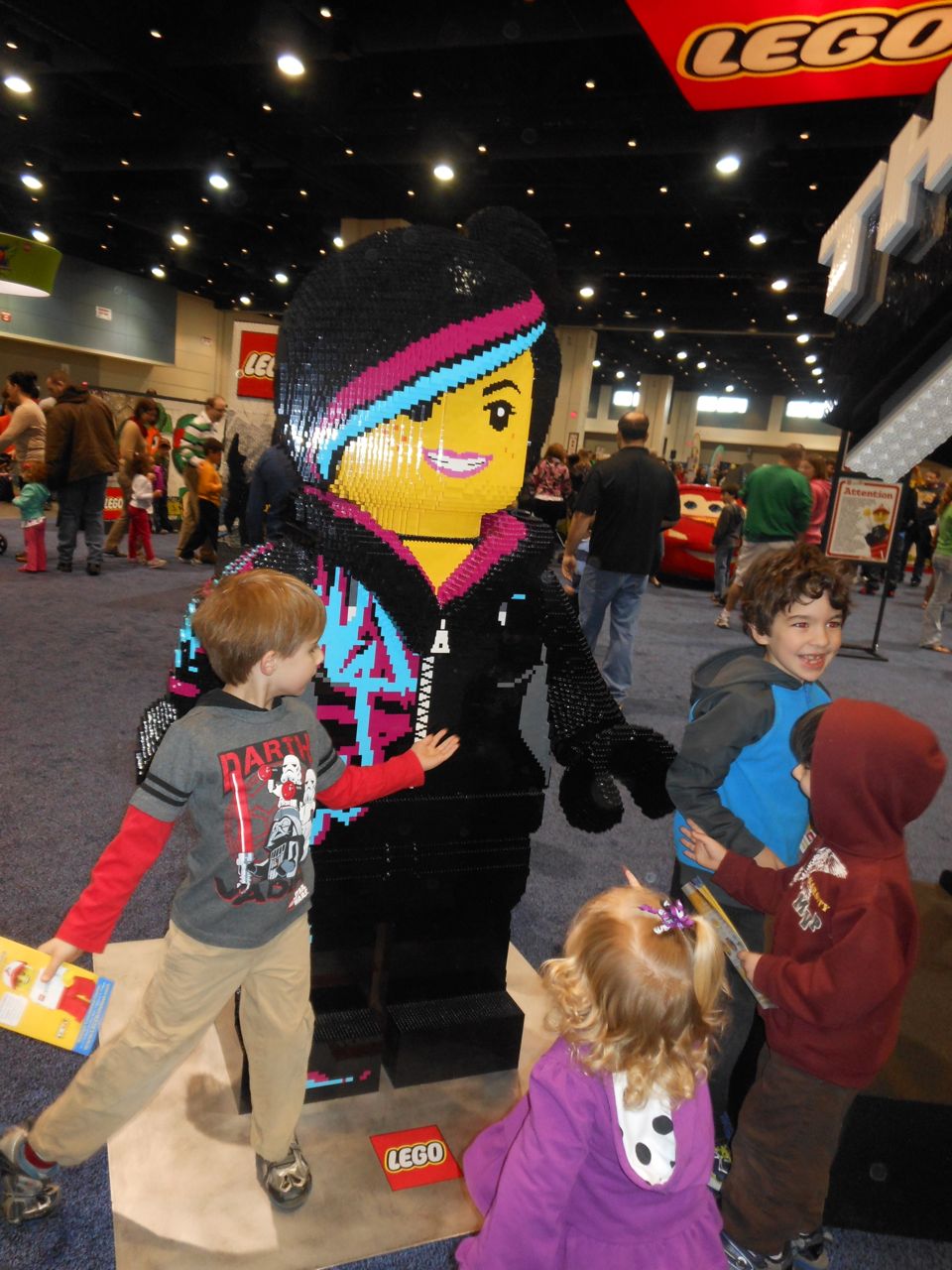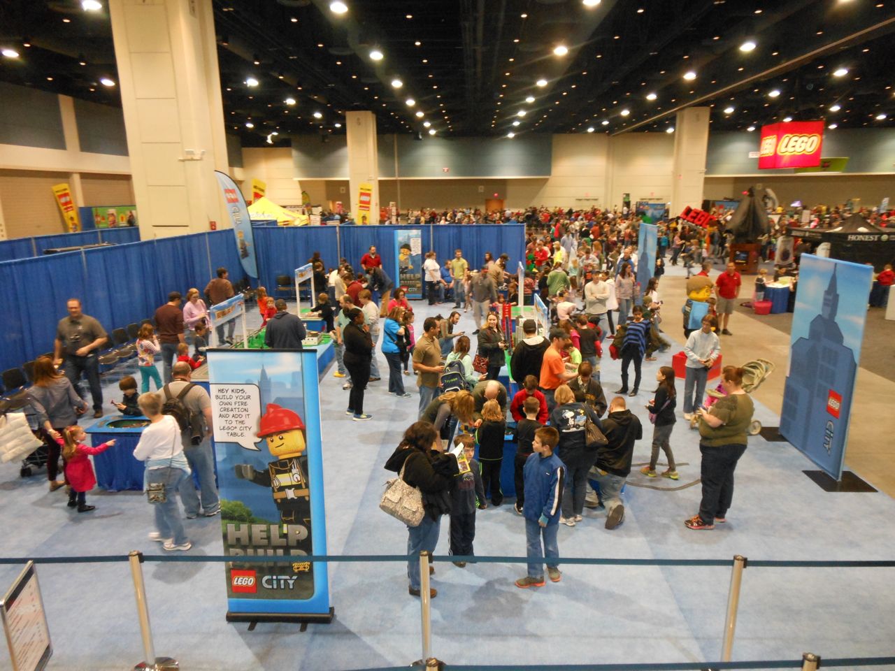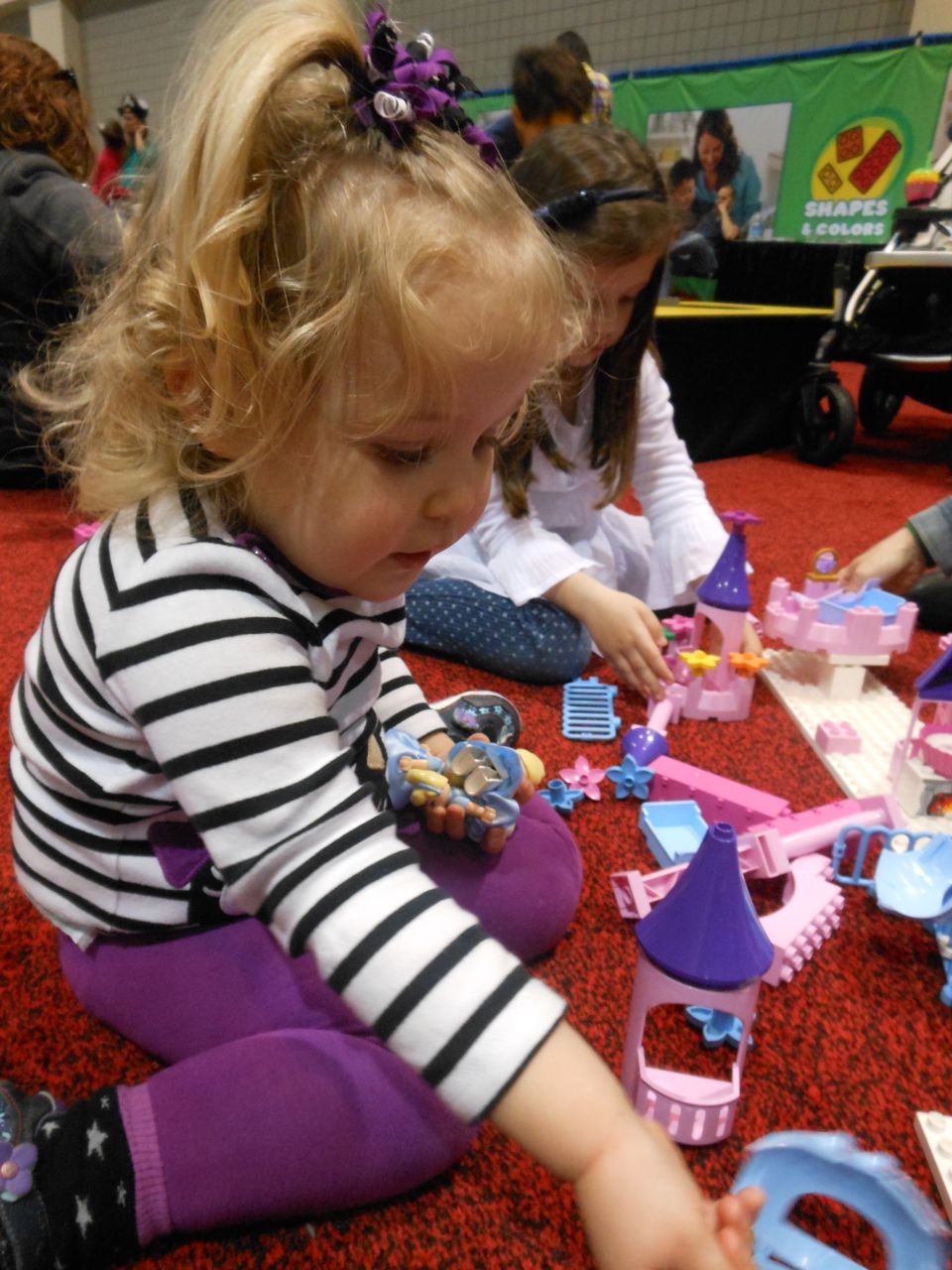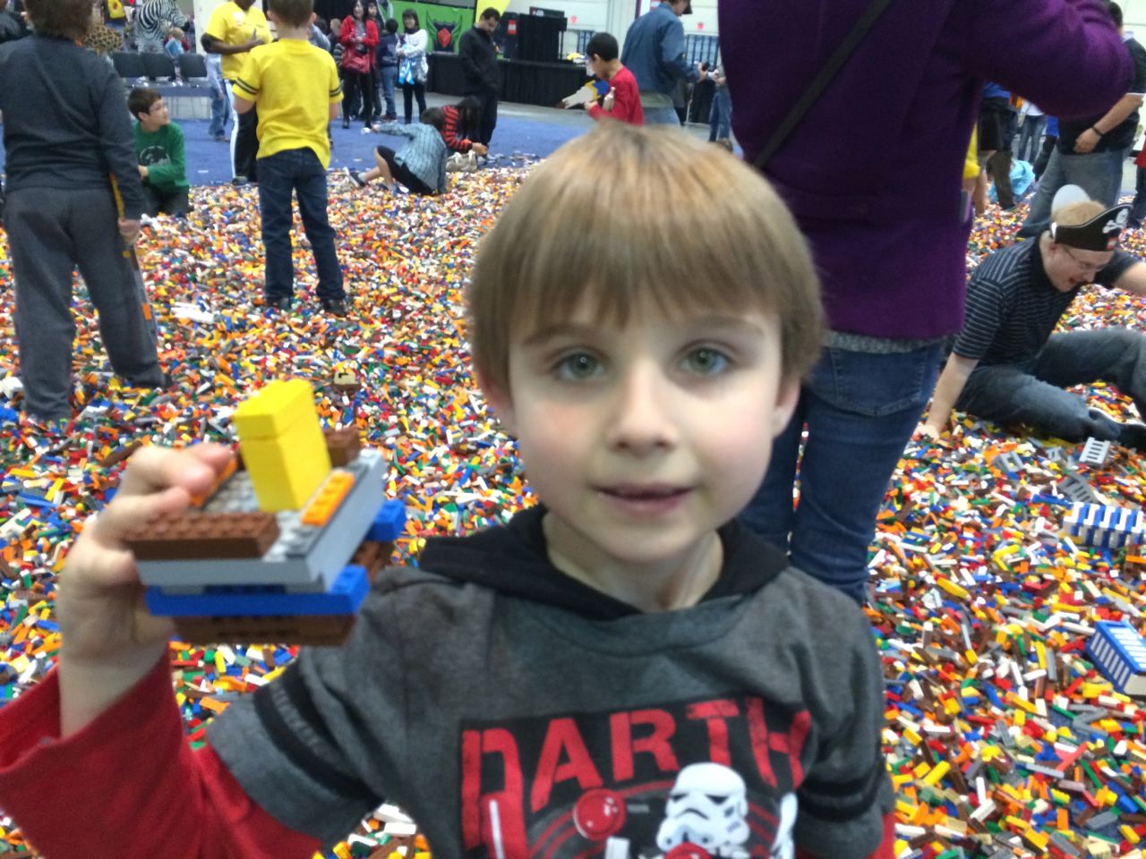Lego Kids Fest is back in Raleigh! We didn’t think it would be back so soon–usually they don’t repeat cities, but I suppose the Fest was a big success here! I know we did our part when it was here last time, and today was no different. 😉 Like before, the Fest is about four hours of somewhat-controlled chaos, and never seems quite long enough. There were some new attractions this year, and Kendall got a lot more out of it this time! She enjoyed the Duplo piles quite a bit (I am always a little dismayed that they make two Duplo piles, one of standard bricks and one of pink princess bricks–why not mix them together? Argh!) Kendall had fun with both piles, though, and we made some cool things with the Cinderella castle elements. I did not plan on liking that princess stuff at all, but..! Kendall showed me that there are more possibilities than I’d considered. 🙂 She also really liked the Lego Friends section–she’s technically too little for those, but she can build with them like bigger kids, and she doesn’t try to eat the small pieces anymore. 😉 Brian had a very special Fest, because both Ty and Nico also attended! He spent some time with each friend, and all three of them managed to get together now and then. Brian enjoyed the car racing as usual, and he spent some time with the Chima stuff with Ty, and attended the Master Builder session with Nico. There were lots of cool life-size models, and the Star Wars ones were pretty popular. Kendall liked the Lego Movie and Lego Friends ones, especially a very cute little panda bear. He was really cute–I loved all the details and his little teeth! Brian liked the tiger a lot, and the super heroes (even though he insists he’s not into superheroes). We picked up some items for the kids at the shop, and Brian told us some ideas for his wish list–particularly this Star Wars Republic Gunship. The kids both played in the giant brick pile, making brick angels and crashing noisily through the bricks. We stayed until the closing bell, just like before, and although it was tough to leave, we had to. Kendall was pretty much toast by the end, so we had to head home for her nap. With one last burst of energy, the kids leaped onto their plasma cars in the garage–but we did get Kendall down for a nap, eventually, and Brian played with more Legos on the first floor. He made a pretty awesome minifigure party, and we remembered to take some pictures of the Family House with the light-up chandelier that we’d built awhile ago.