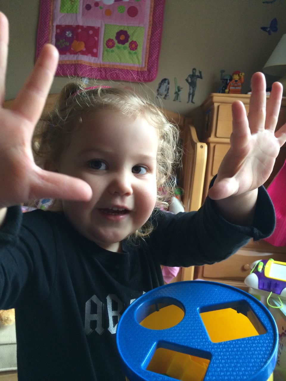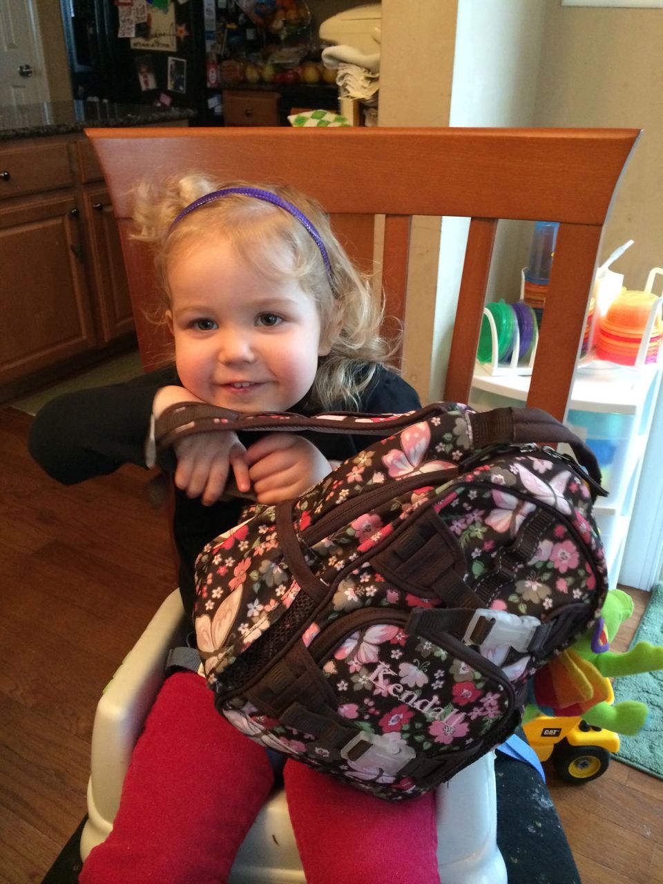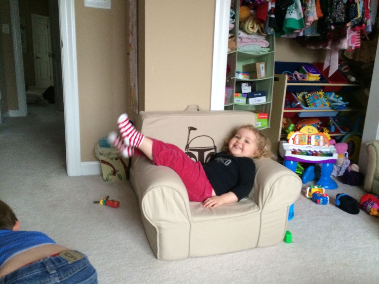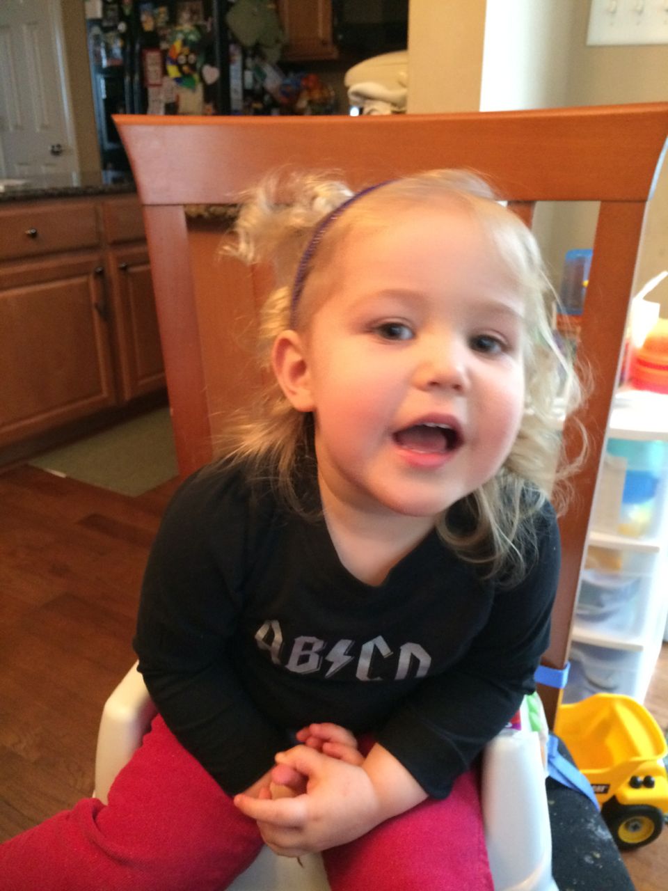 She’s a maniac, maaaaniac on the flo-oor!  And on her chair, and in the hallway, pretty much everywhere.  Kendall is a dancing, bouncing ball of energy!  She and Brian were hamming it up this morning, both wearing her headbands (Kendall was both indignant and amused by Brian wearing one of her things!)  Kendall still loves her lion, but orange “Kitty Cat” is also a popular friend these days.  We are potty training now, and Kendall is pretty excited about her pull-ups!  Finally, Brian’s blue “Vader Rules!” tee is getting to be too small–I love this one, and will miss it when we have to retire it..  I took some pictures just because. 🙂