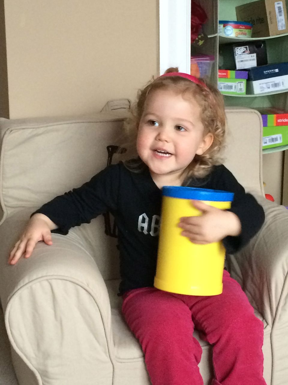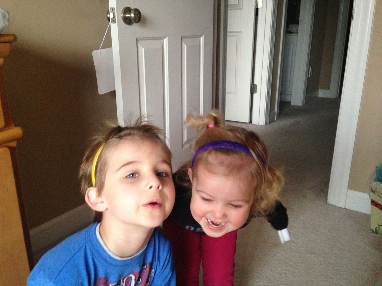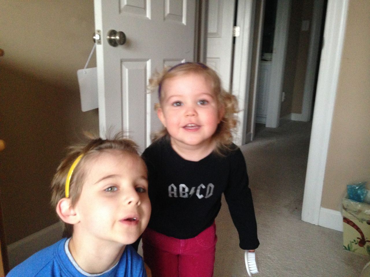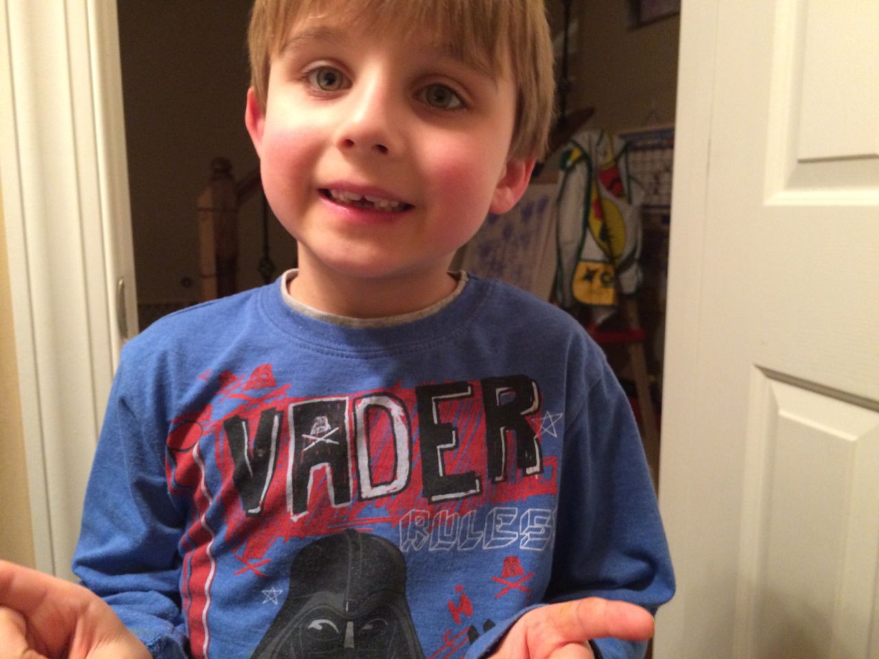 She’s a maniac, maaaaniac on the flo-oor!  And on her chair, and in the hallway, pretty much everywhere.  Kendall is a dancing, bouncing ball of energy!  She and Brian were hamming it up this morning, both wearing her headbands (Kendall was both indignant and amused by Brian wearing one of her things!)  Kendall still loves her lion, but orange “Kitty Cat” is also a popular friend these days.  We are potty training now, and Kendall is pretty excited about her pull-ups!  Finally, Brian’s blue “Vader Rules!” tee is getting to be too small–I love this one, and will miss it when we have to retire it..  I took some pictures just because. 🙂
