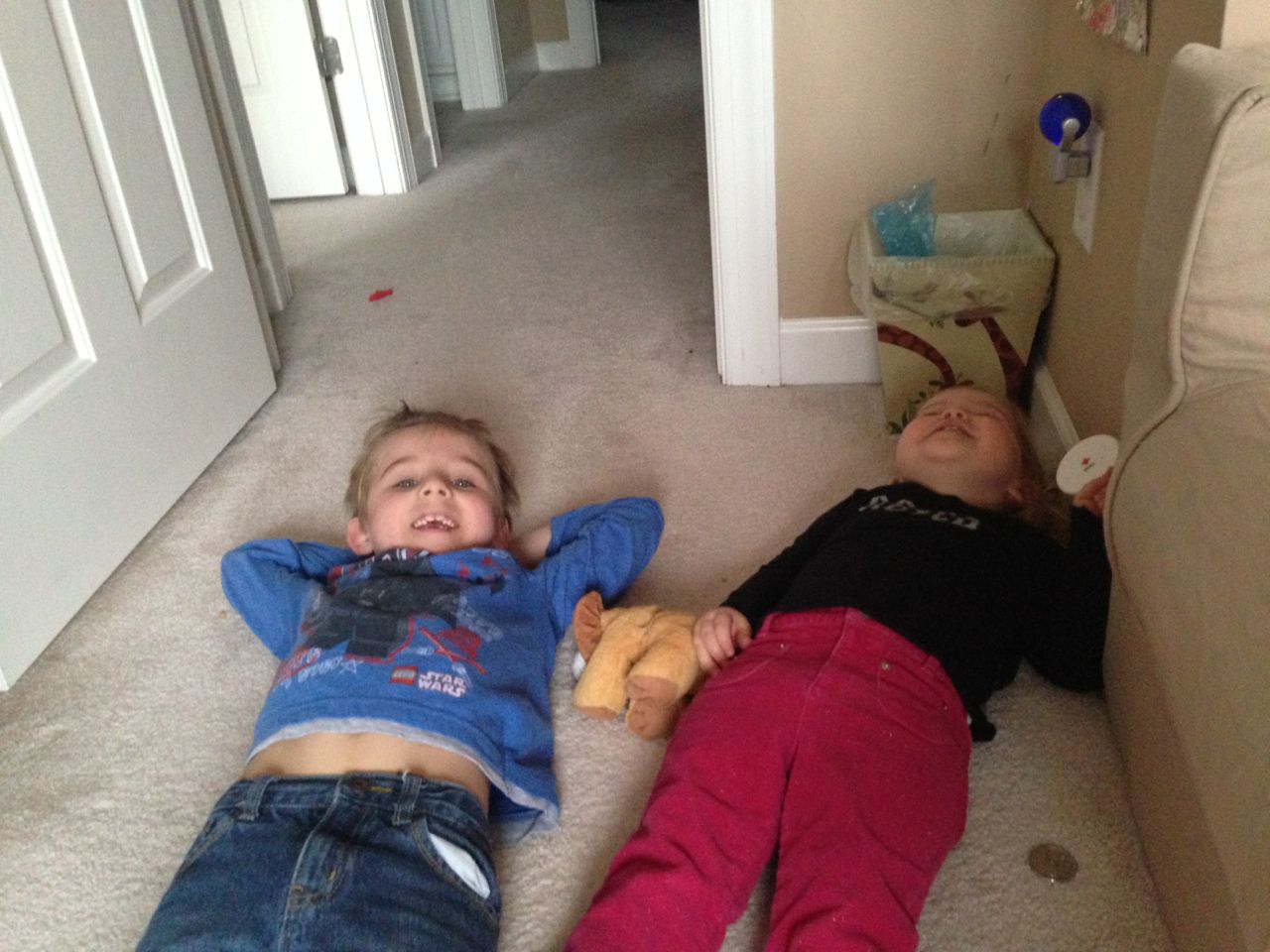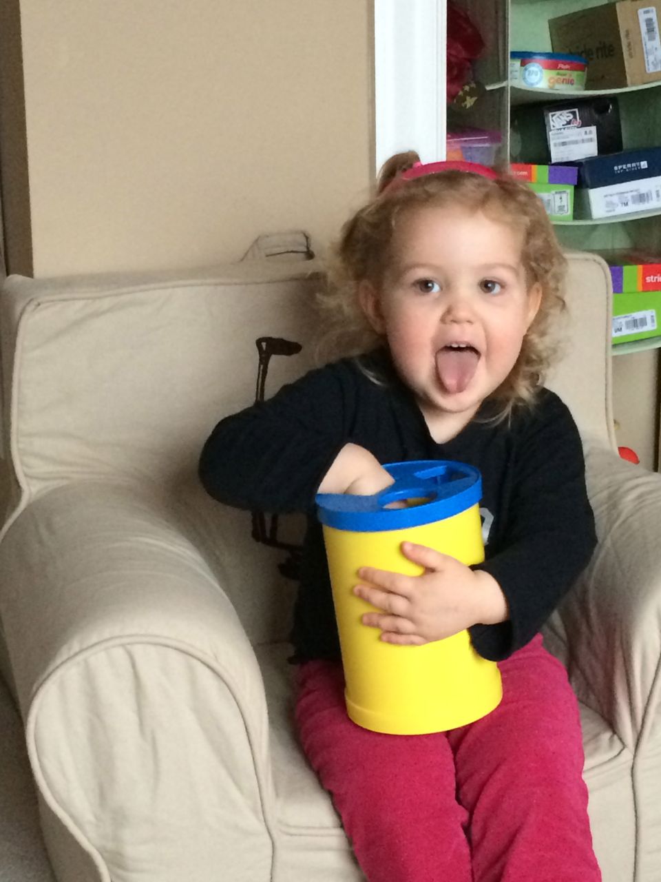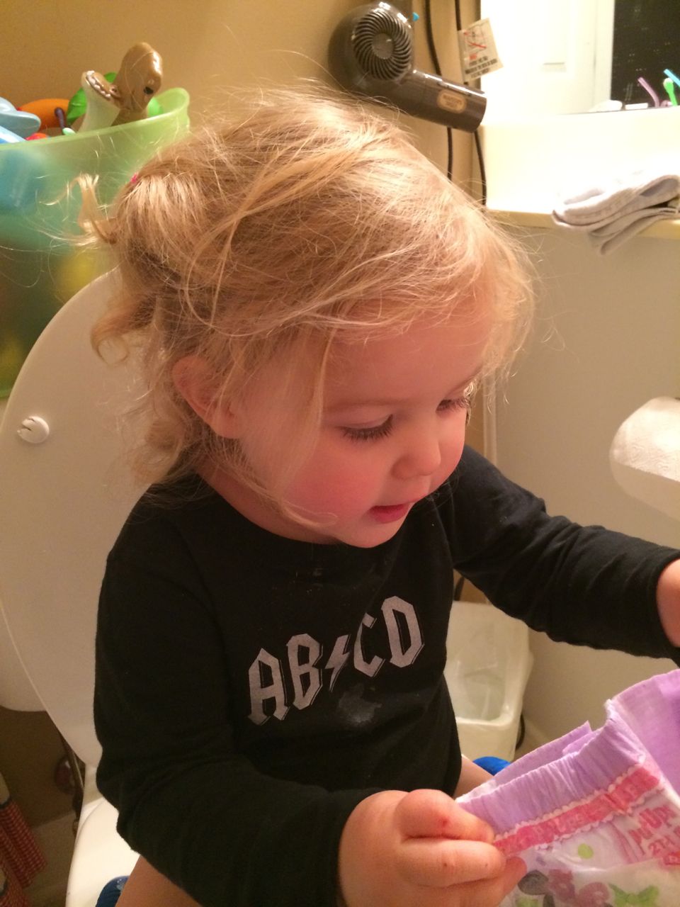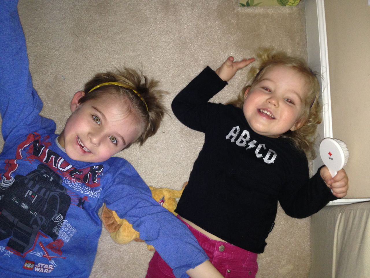 She’s a maniac, maaaaniac on the flo-oor!  And on her chair, and in the hallway, pretty much everywhere.  Kendall is a dancing, bouncing ball of energy!  She and Brian were hamming it up this morning, both wearing her headbands (Kendall was both indignant and amused by Brian wearing one of her things!)  Kendall still loves her lion, but orange “Kitty Cat” is also a popular friend these days.  We are potty training now, and Kendall is pretty excited about her pull-ups!  Finally, Brian’s blue “Vader Rules!” tee is getting to be too small–I love this one, and will miss it when we have to retire it..  I took some pictures just because. 🙂