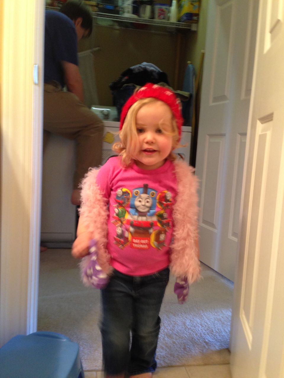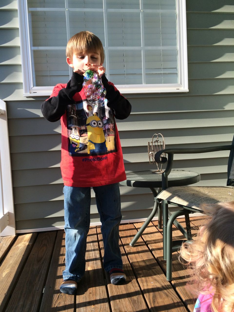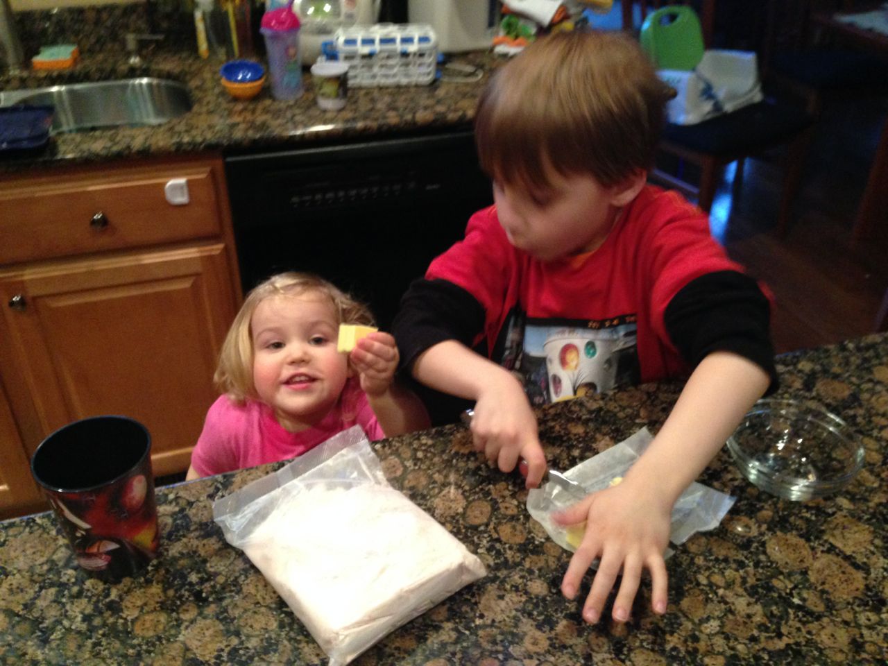 Today we did a bit of spring cleaning and organizing. I repacked some winter gear, after having realized a space bag had sprung a leak and gotten stuck in a drawer. In the process, pulled out a bunch of things I’d knitted years ago, most of which the kids had never seen. They seemed to like my gaudy creations quite a bit! Kendall really liked the Hello Kitty hat and a soft pink scarf, and Brian liked a colorful fair isle hat and a really crazy poncho. It was just warm enough to blow some bubbles on the porch–we did a little of that and the kids enjoyed it, although Kendall got pretty frustrated once she realized she couldn’t blow bubbles as reliably as Brian! We rewarded the kids for their patience dealing with us while we cleaned and organized by letting them make some pink lemonade cookies! They enjoyed mixing up the dough and using the scoop to make evenly-sized cookies.