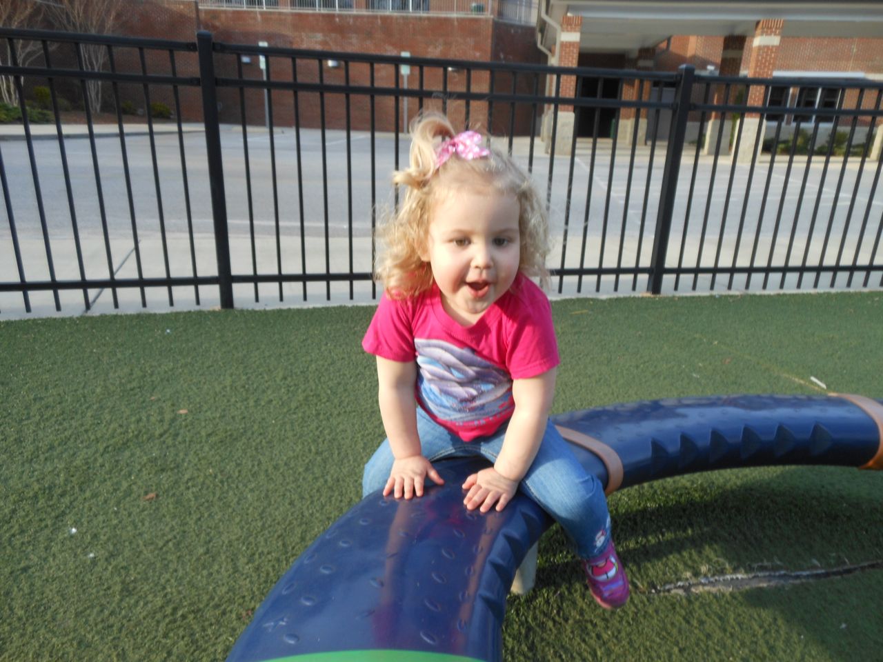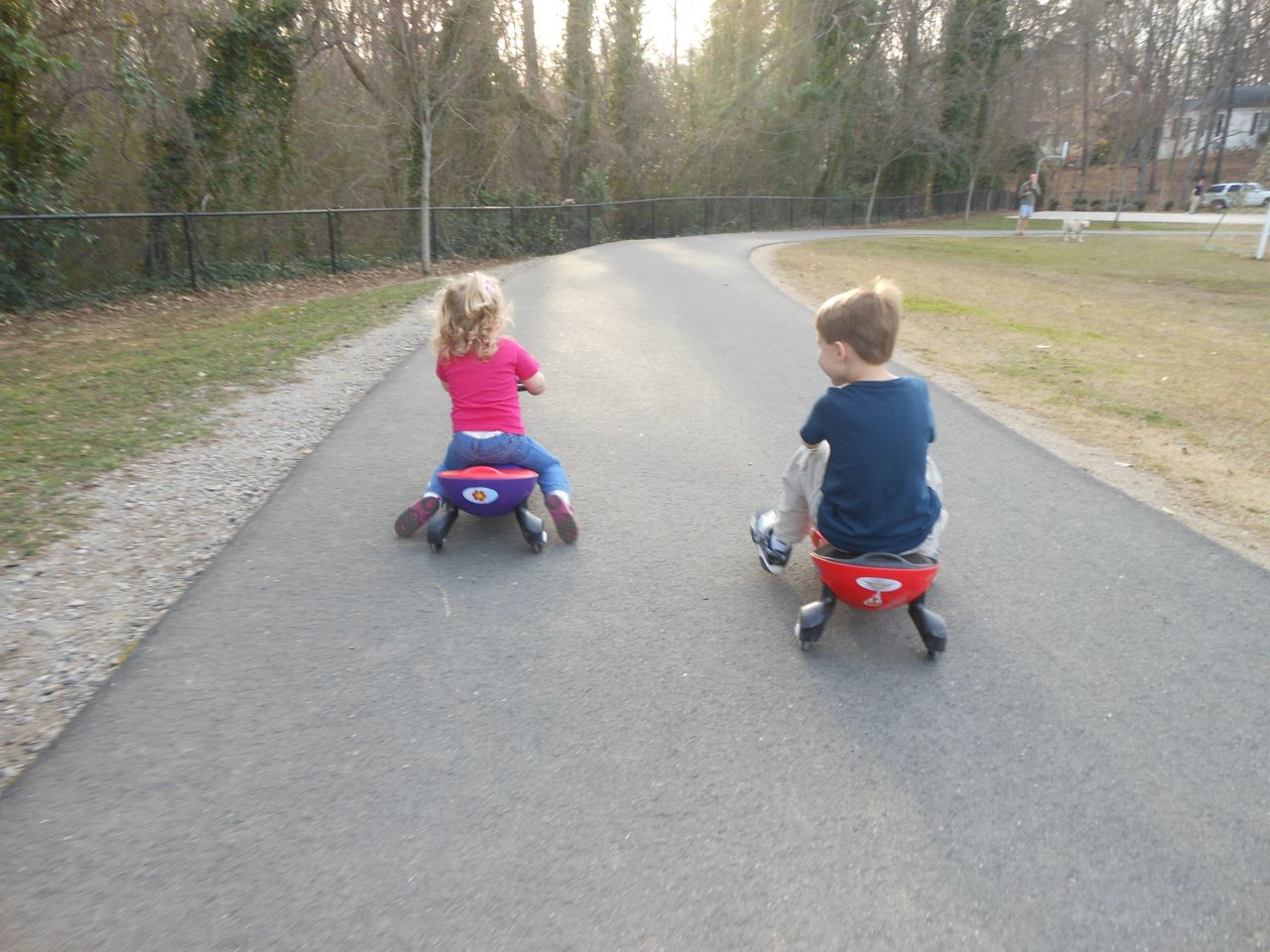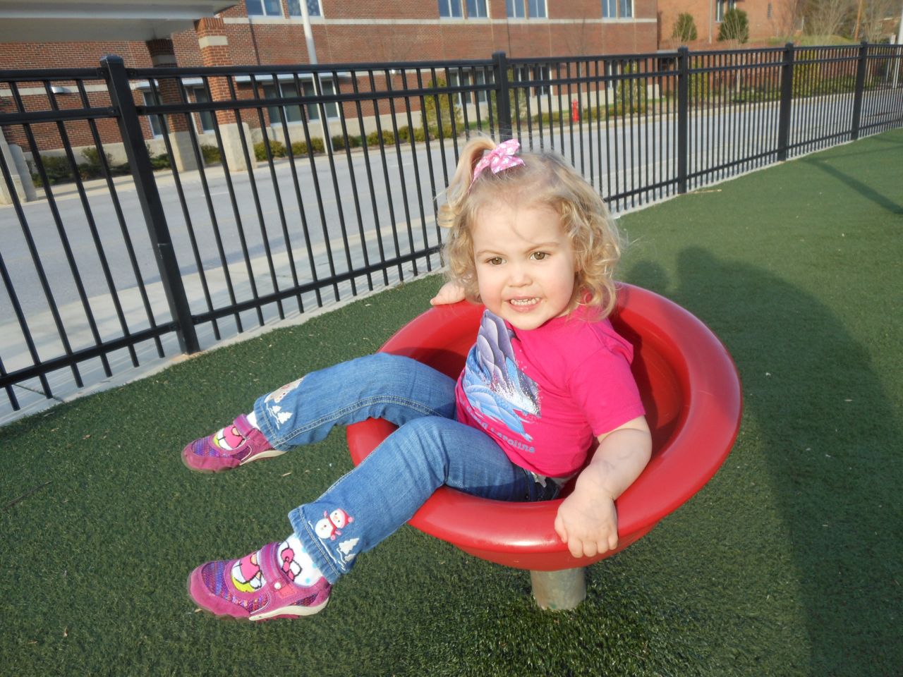 Today started early, with Brian’s swim lessons this morning!  Kendall tagged along, and Brandon got some cute pictures of them sitting outside in the sun.  Then, Brian was off to get a haircut while I hung out with Kendall.  Later, Brian went to his friend Emily’s birthday party–he was happy to discover that that it was at Orange Leaf, one of our favorite frozen yogurt places nearby.  He picked out this kind of weird-looking octopus birthday card for her, and while he was writing the message inside, I got a little worried when he started with “You are one”!  But, what he wanted to write ended up rather sweet:  “You are one birthday octopus!  You can handle anything.”  Kendall napped a little while Brian partied, but was up fairly quickly, so yours truly didn’t get to make a lot of progress on this blog, yet again!  It was a nice day and the kids were still full of energy, so once the boys got home, we decided to pick up a picnic dinner from Neomonde took it over to Root.  The idea was to eat, and then let the kids race plasma cars and tear around the playground until they got tired, hopefully resulting in an early bedtime–but that worked about as well as usual. 😉  The plasma cars are so noisy on the track, I hope it didn’t disturb all the neighbors!  Luckily the playground equipment was also a big hit, and Brian spent some time playing soccer with Brandon as well.  The kids both love this round spinning toy–I’m not sure what to call it, it’s like a smooth tractor tire, mounted at an angle, so there’s  a high side and a low side.  Kendall gets a real charge out of feeling the acceleration as she whirls around to the low side!  They also have these odd angled buckets that spin, and Kendall kept wanting to try them, even though I think those felt a little bit scary to her as she spun around!