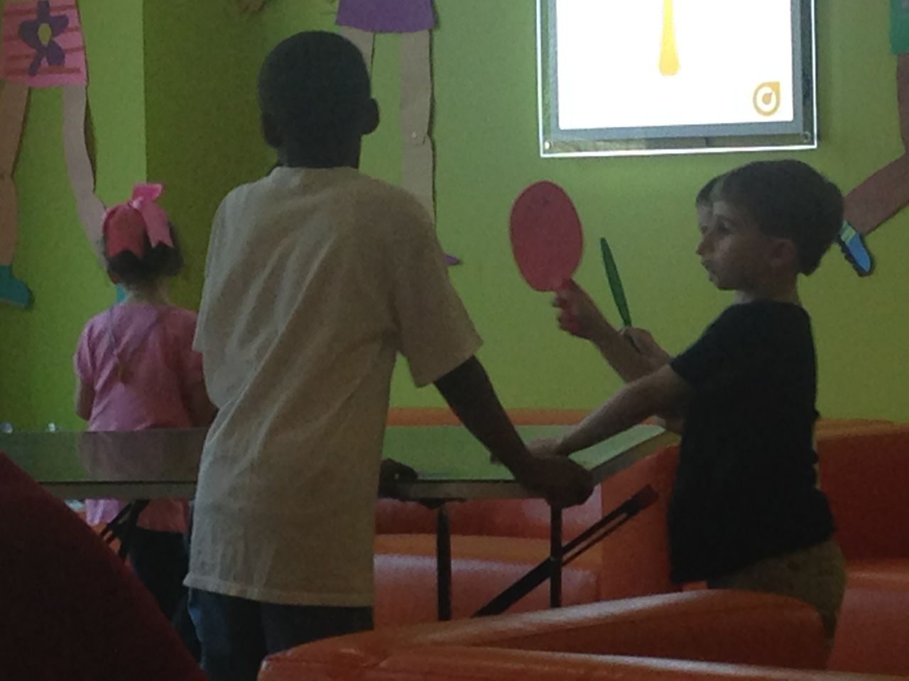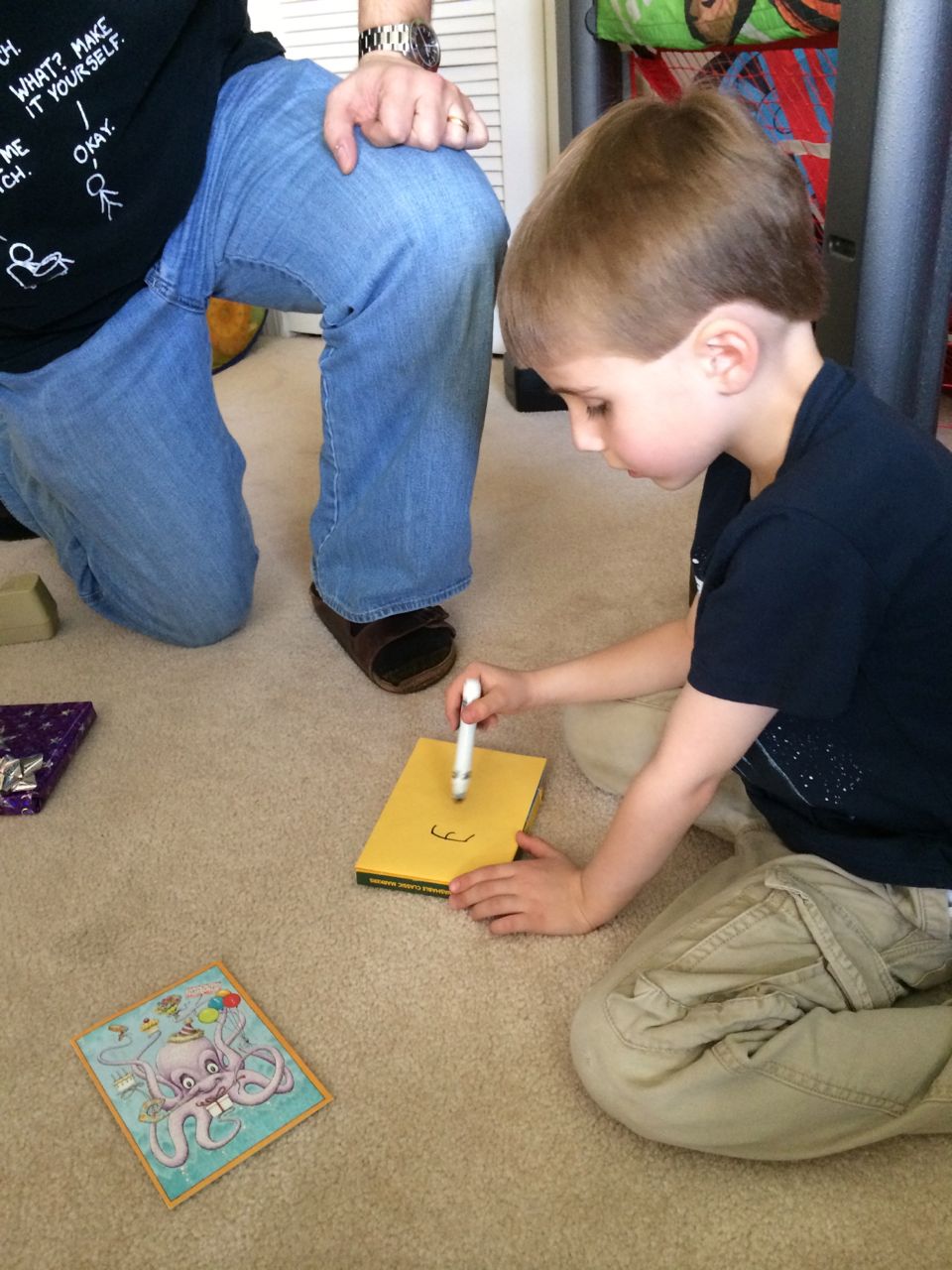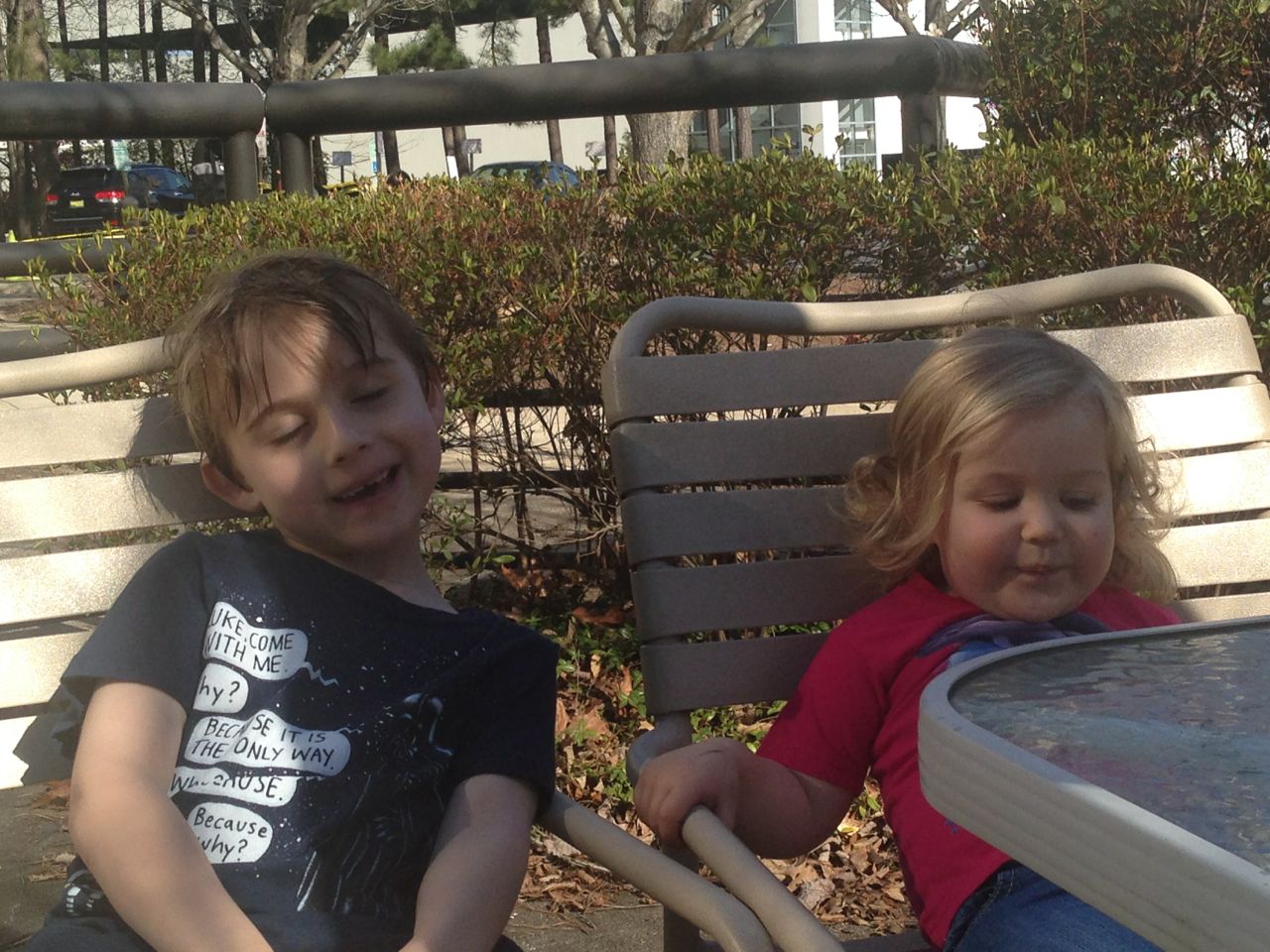 Today started early, with Brian’s swim lessons this morning!  Kendall tagged along, and Brandon got some cute pictures of them sitting outside in the sun.  Then, Brian was off to get a haircut while I hung out with Kendall.  Later, Brian went to his friend Emily’s birthday party–he was happy to discover that that it was at Orange Leaf, one of our favorite frozen yogurt places nearby.  He picked out this kind of weird-looking octopus birthday card for her, and while he was writing the message inside, I got a little worried when he started with “You are one”!  But, what he wanted to write ended up rather sweet:  “You are one birthday octopus!  You can handle anything.”  Kendall napped a little while Brian partied, but was up fairly quickly, so yours truly didn’t get to make a lot of progress on this blog, yet again!  It was a nice day and the kids were still full of energy, so once the boys got home, we decided to pick up a picnic dinner from Neomonde took it over to Root.  The idea was to eat, and then let the kids race plasma cars and tear around the playground until they got tired, hopefully resulting in an early bedtime–but that worked about as well as usual. 😉  The plasma cars are so noisy on the track, I hope it didn’t disturb all the neighbors!  Luckily the playground equipment was also a big hit, and Brian spent some time playing soccer with Brandon as well.  The kids both love this round spinning toy–I’m not sure what to call it, it’s like a smooth tractor tire, mounted at an angle, so there’s  a high side and a low side.  Kendall gets a real charge out of feeling the acceleration as she whirls around to the low side!  They also have these odd angled buckets that spin, and Kendall kept wanting to try them, even though I think those felt a little bit scary to her as she spun around!