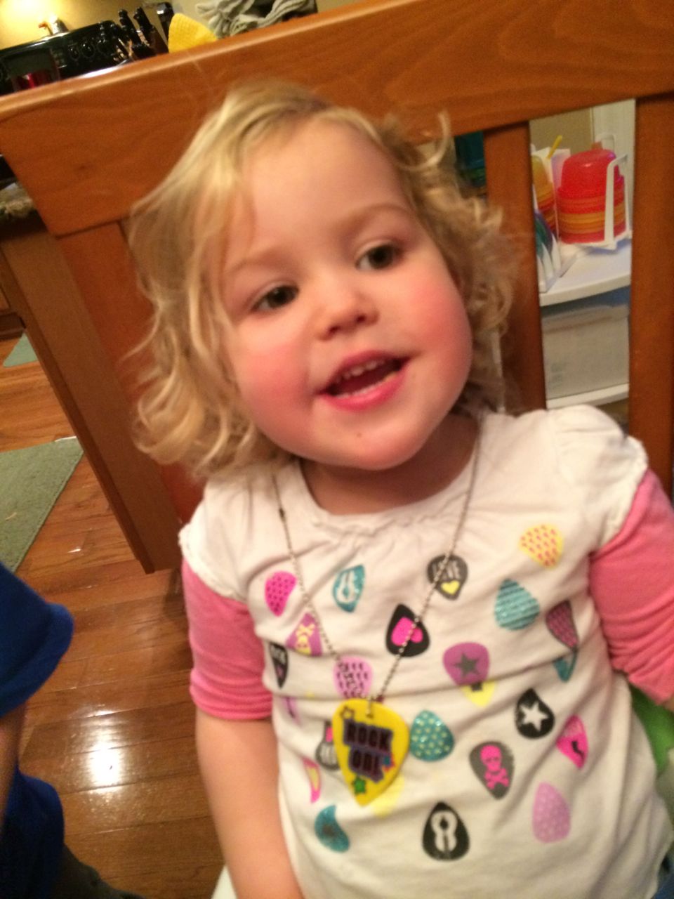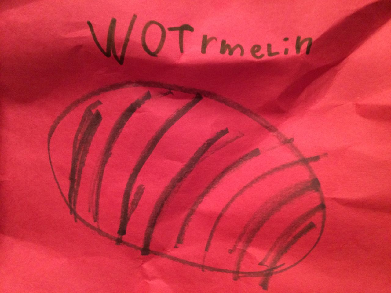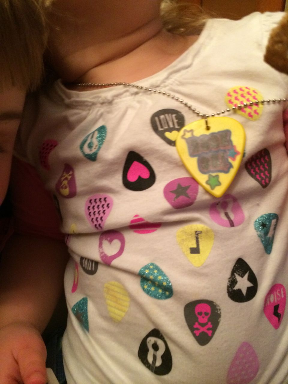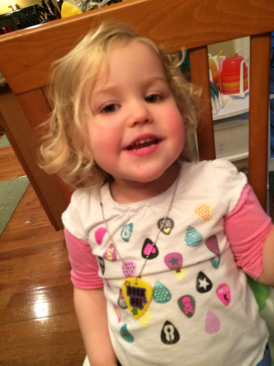 At Brian’s after-school program at Laurel Hills, the kids get to earn play money that they can turn in for prizes or treats.  Today, Brian came out sporting a new necklace shaped like a guitar pick, that said “Rock On!”  He was pretty proud of it. 😉  At dinnertime, he realized that Kendall’s shirt was decorated with guitar picks, and he thought she should wear it.  Aww!  Kendall was quite pleased with this turn of events, I think she’d been a little jealous of it!  Also, Brian’s watermelon, just because his spelling is so cute, and I’m so proud of him for sounding out such a big word.  He was telling me that he knows watermelons are usually red on the inside, and the stripes usually go the long way, but this one is is a backwards watermelon (I guess it’s green on the inside?)