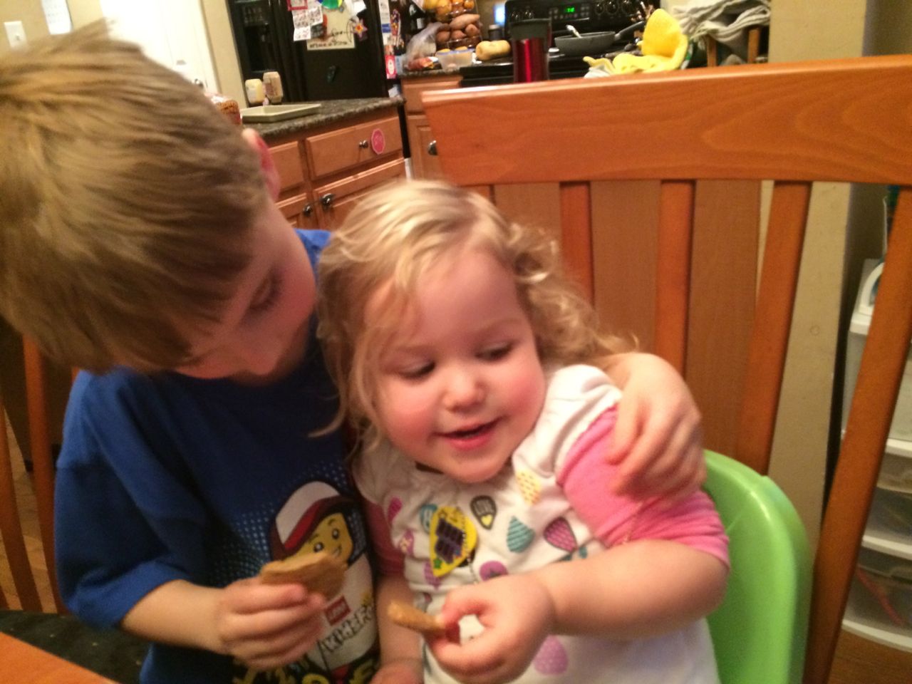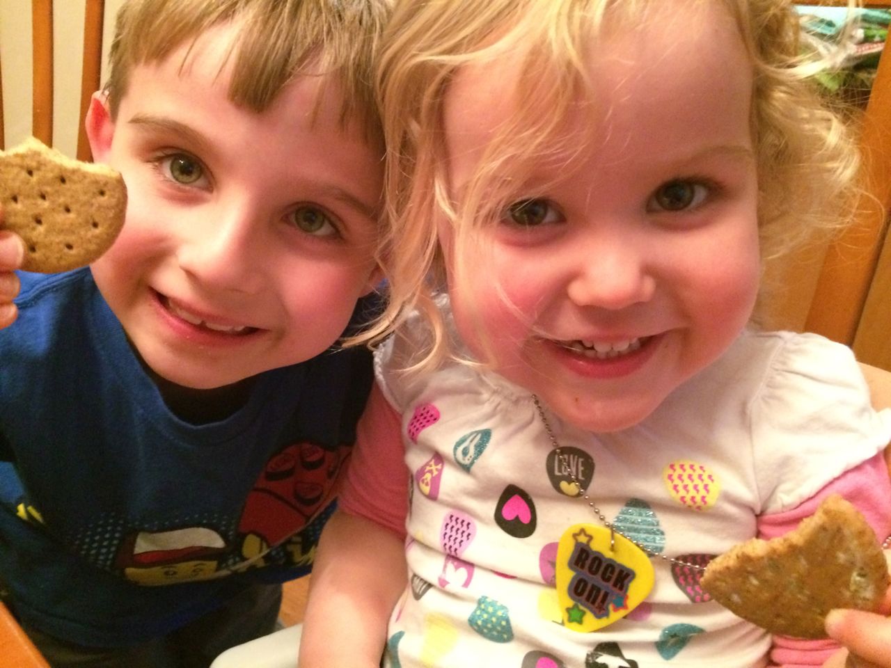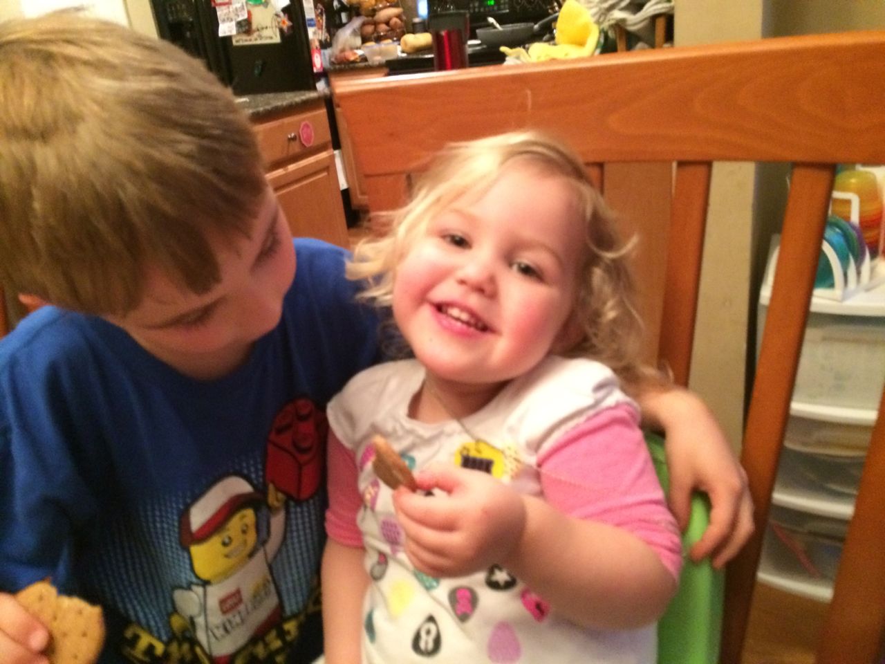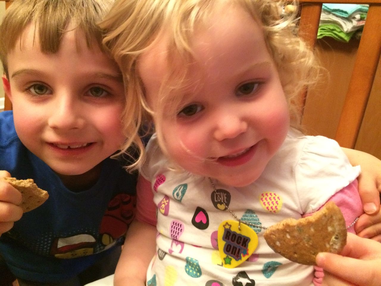 At Brian’s after-school program at Laurel Hills, the kids get to earn play money that they can turn in for prizes or treats.  Today, Brian came out sporting a new necklace shaped like a guitar pick, that said “Rock On!”  He was pretty proud of it. 😉  At dinnertime, he realized that Kendall’s shirt was decorated with guitar picks, and he thought she should wear it.  Aww!  Kendall was quite pleased with this turn of events, I think she’d been a little jealous of it!  Also, Brian’s watermelon, just because his spelling is so cute, and I’m so proud of him for sounding out such a big word.  He was telling me that he knows watermelons are usually red on the inside, and the stripes usually go the long way, but this one is is a backwards watermelon (I guess it’s green on the inside?)