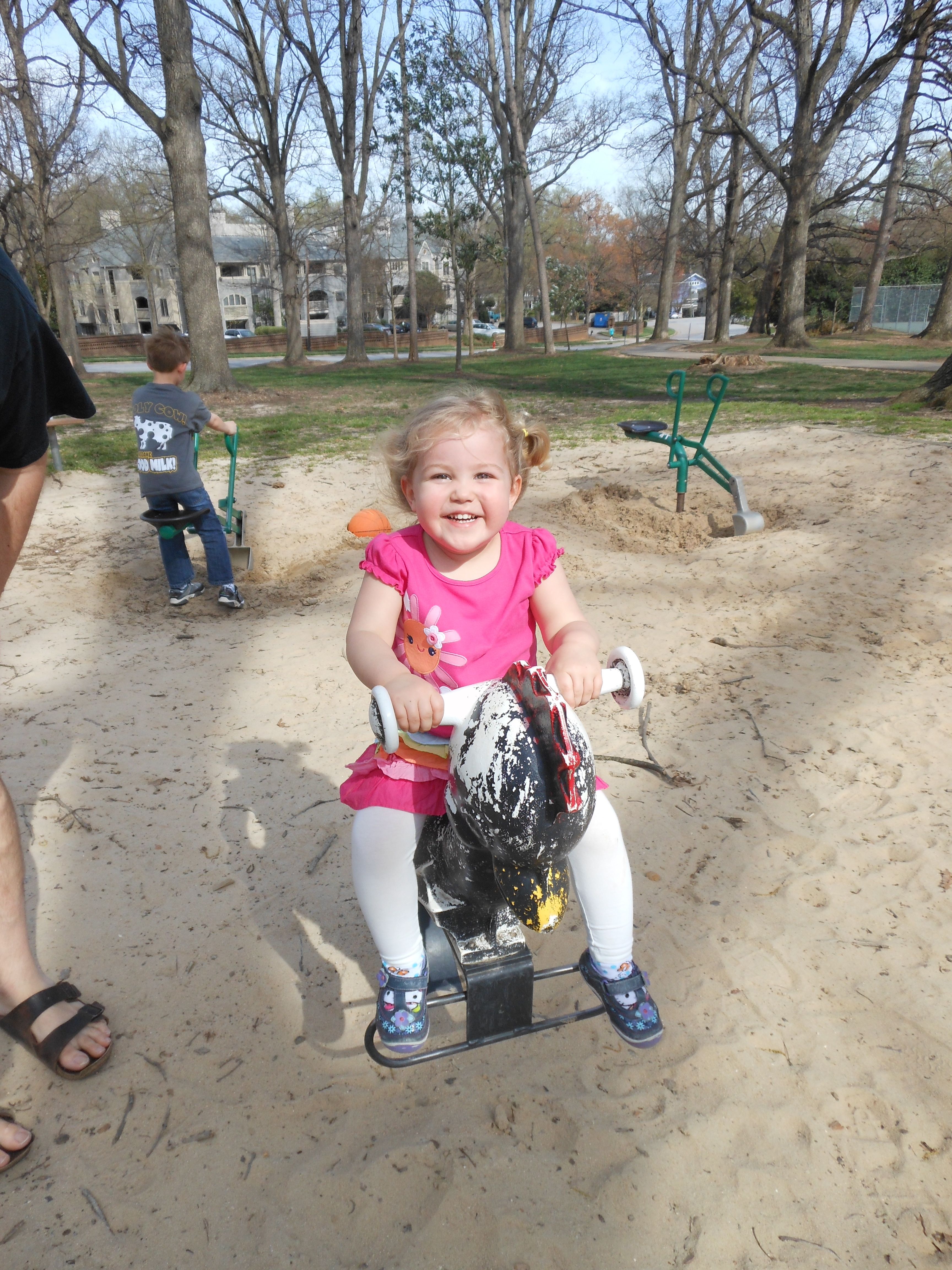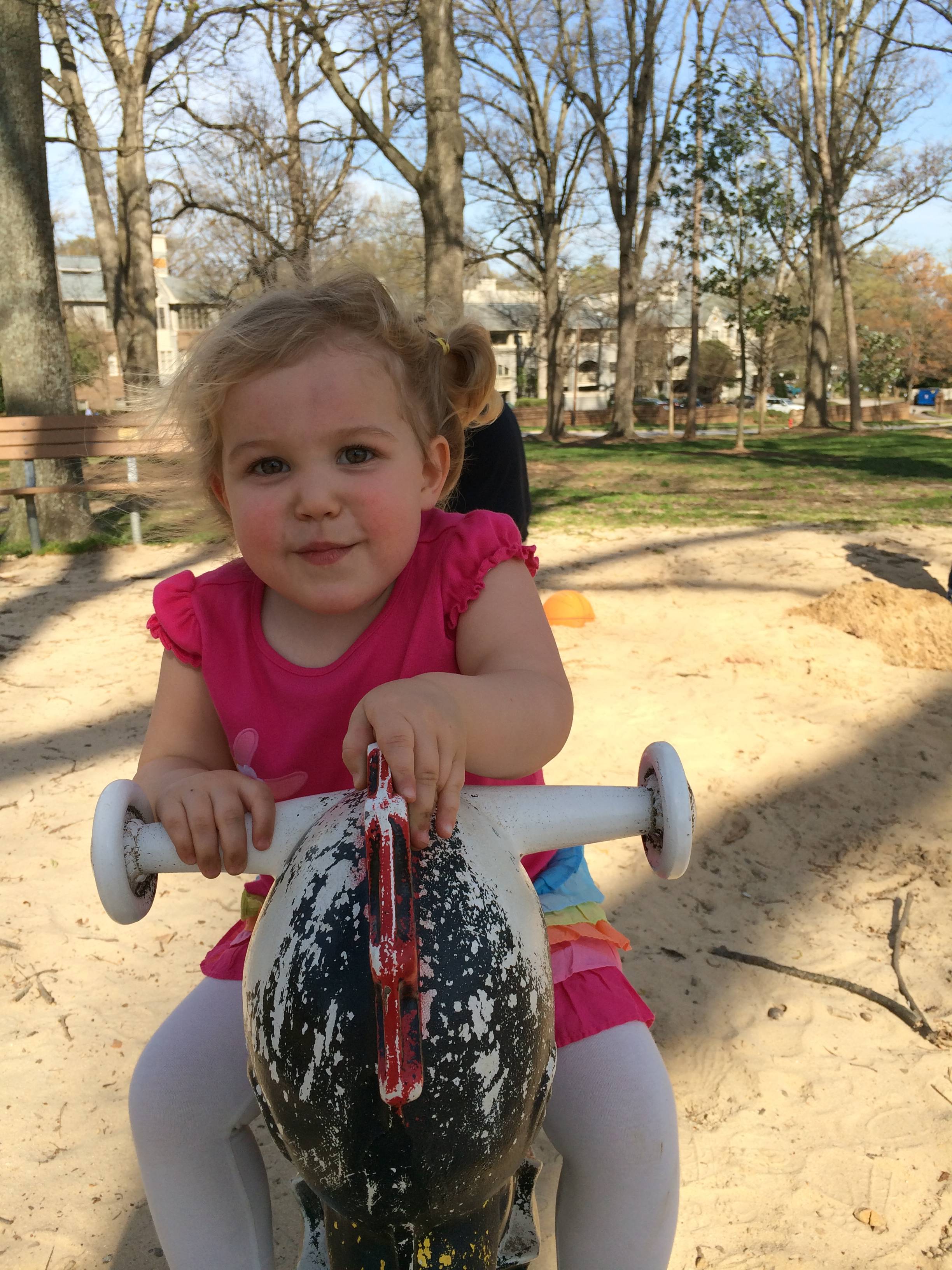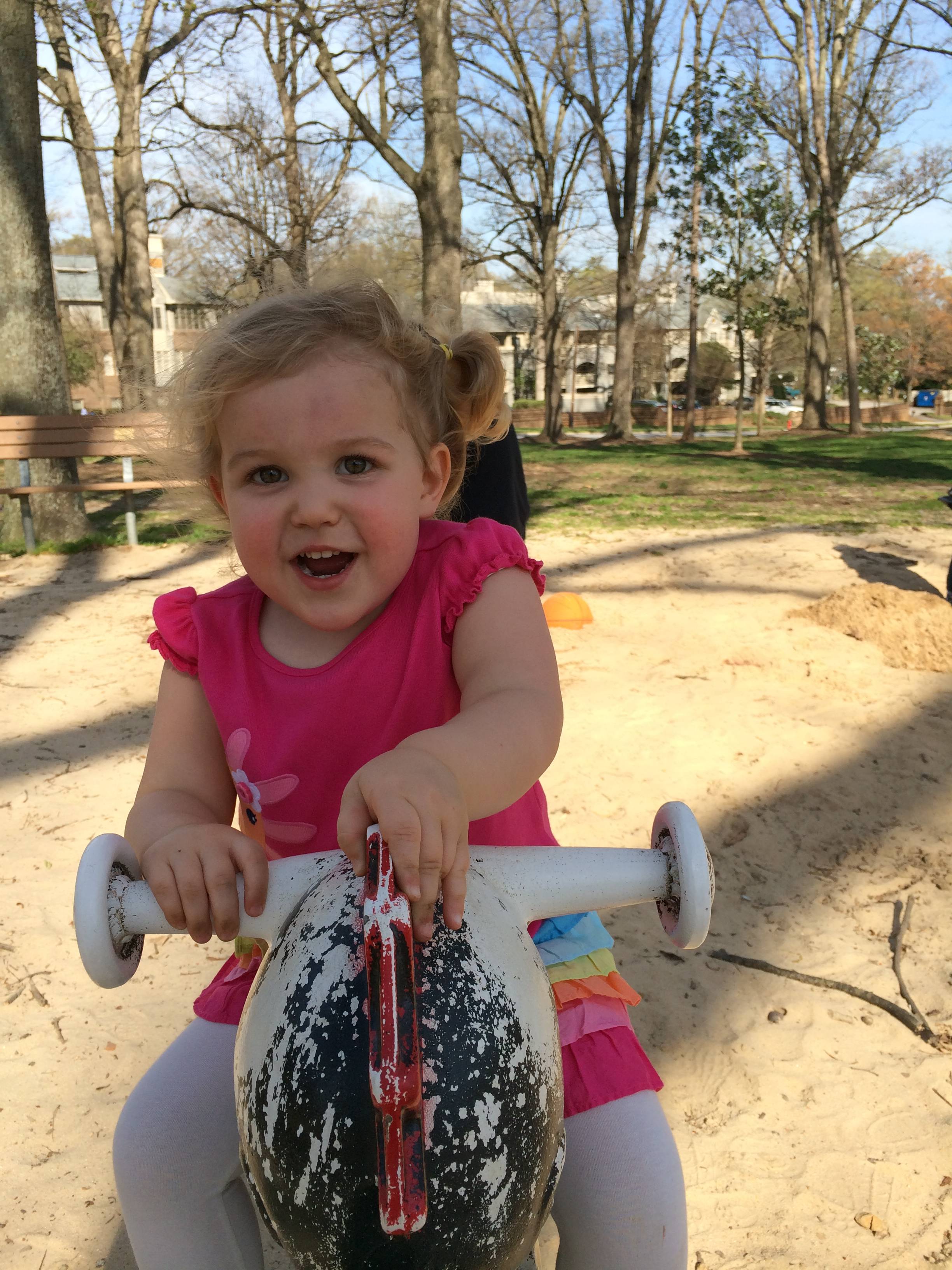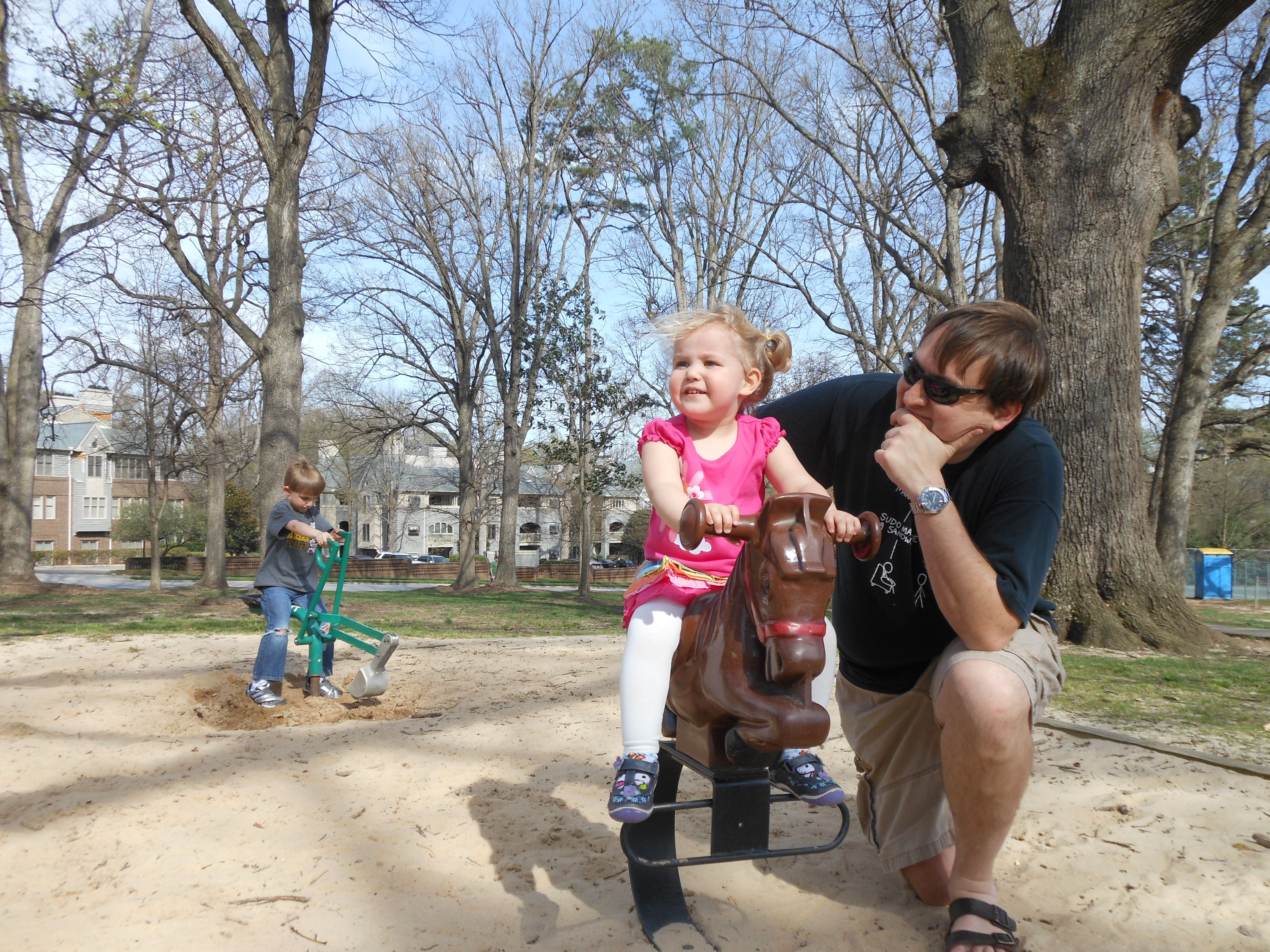 We celebrated the lovely spring day by visiting Fred Fletcher park, one of the really nice inside-the-beltline parks here in Raleigh. When Brandon and I were considering moving here from Chapel Hill, we aspired to live in this area. It was out of our price range then, and probably forever..! But we can visit the park. 🙂 The kids enjoyed seeing the tulips and tulip trees, and Brian randomly tried to make a gravel-angel on one of the paths–ouch! Not sure he’ll re-try that experiment. 😉 The kids really loved running around the stone circle, we weren’t sure we’d even make it over to the playground, they liked it so much! Eventually, we did make it to the playground, and both kids loved the ride-on toys and sand digging toys. The swings were also a good time. We took a chocolate milk break, and then played a little soccer on the big field (we being Brandon and Brian!) Brian spotted some Stormtrooper stickers on one of the goals from easily 100 paces–he is a Star Wars seeking machine! Too soon, it was time to head out to Brian’s skating lessons, but we discovered a slope just covered in violets as we were leaving–that was a fun and lessened the pain of leaving the park a bit.
