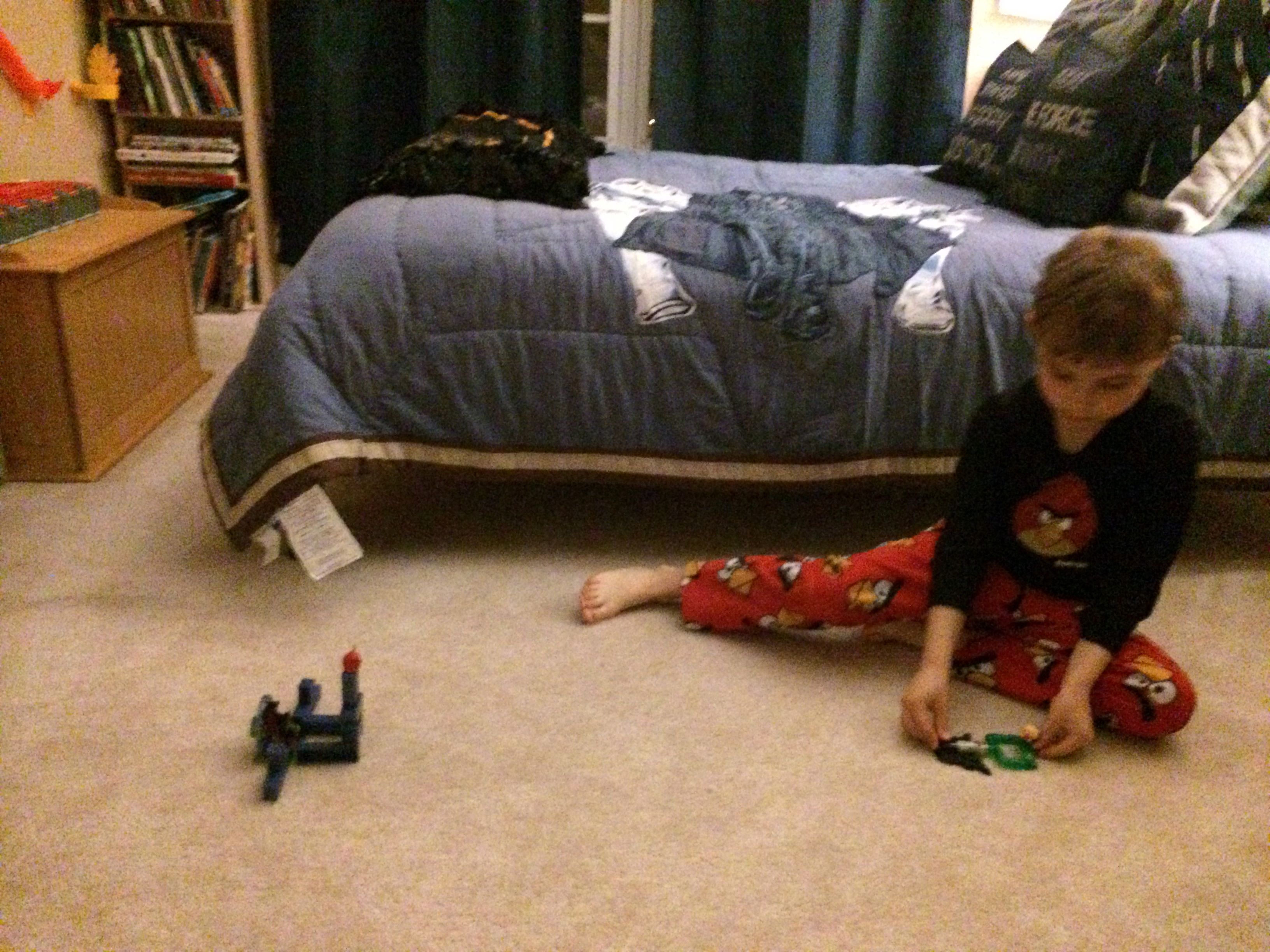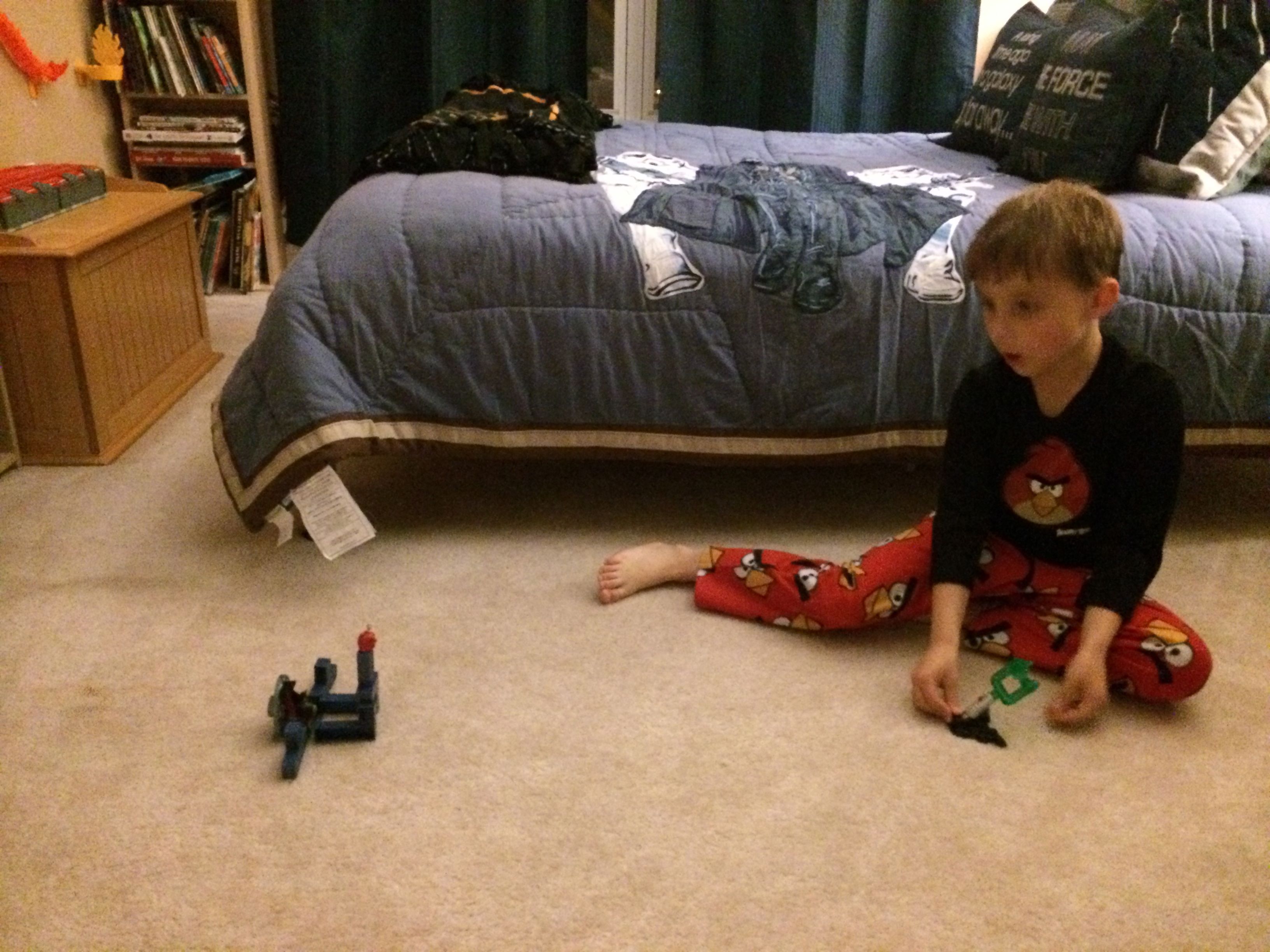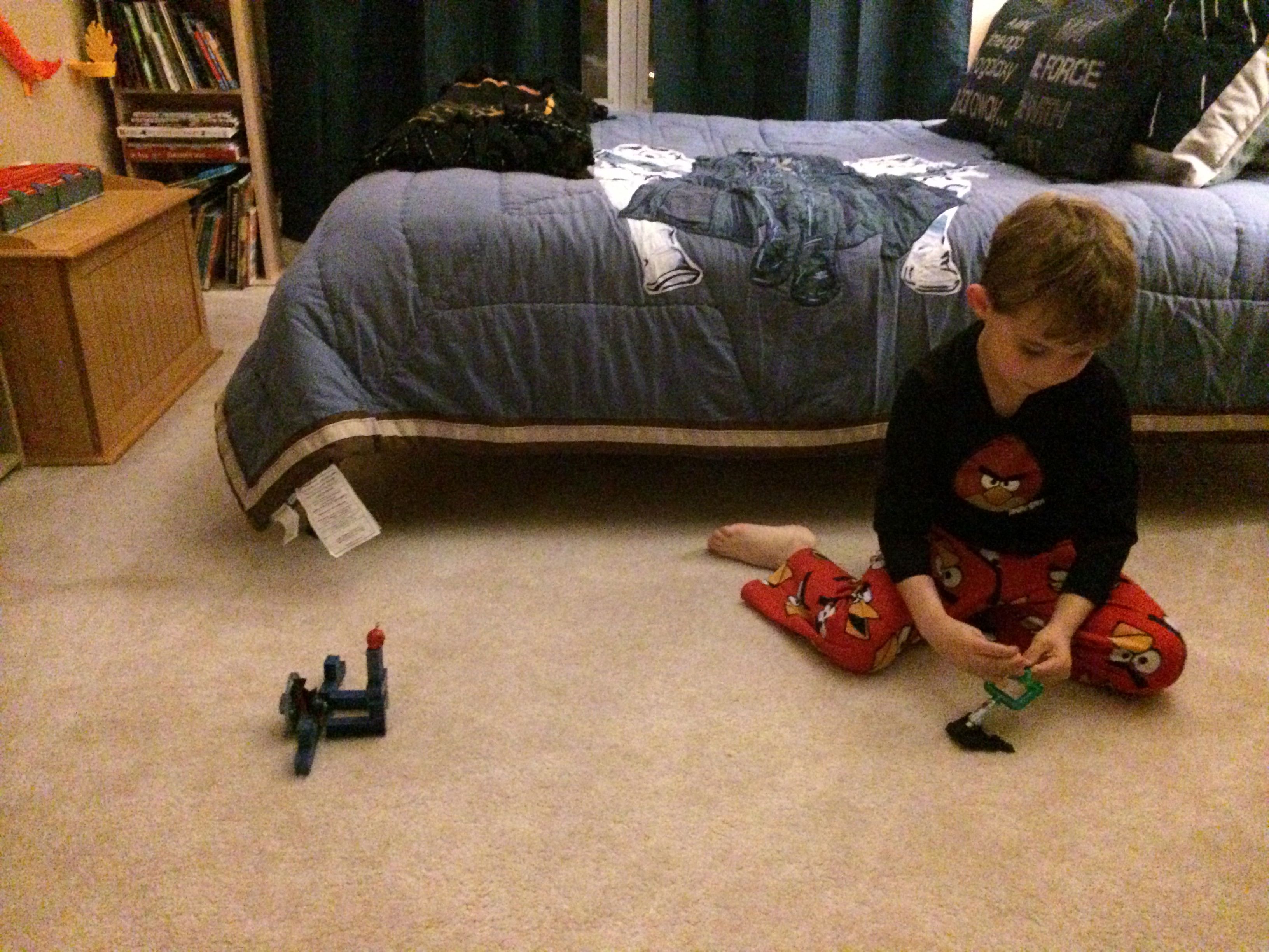 Tonight Brian “just had to” play some live-action Angry Birds in his room after bath. Of course he should have been reading and getting to sleep, but–our little negotiator can really get his way sometimes! Then, predictably, Kendall gets in on the action, too. You can really see the resignation on Brandon’s face. 😉 If you can’t beat ’em, join ’em!