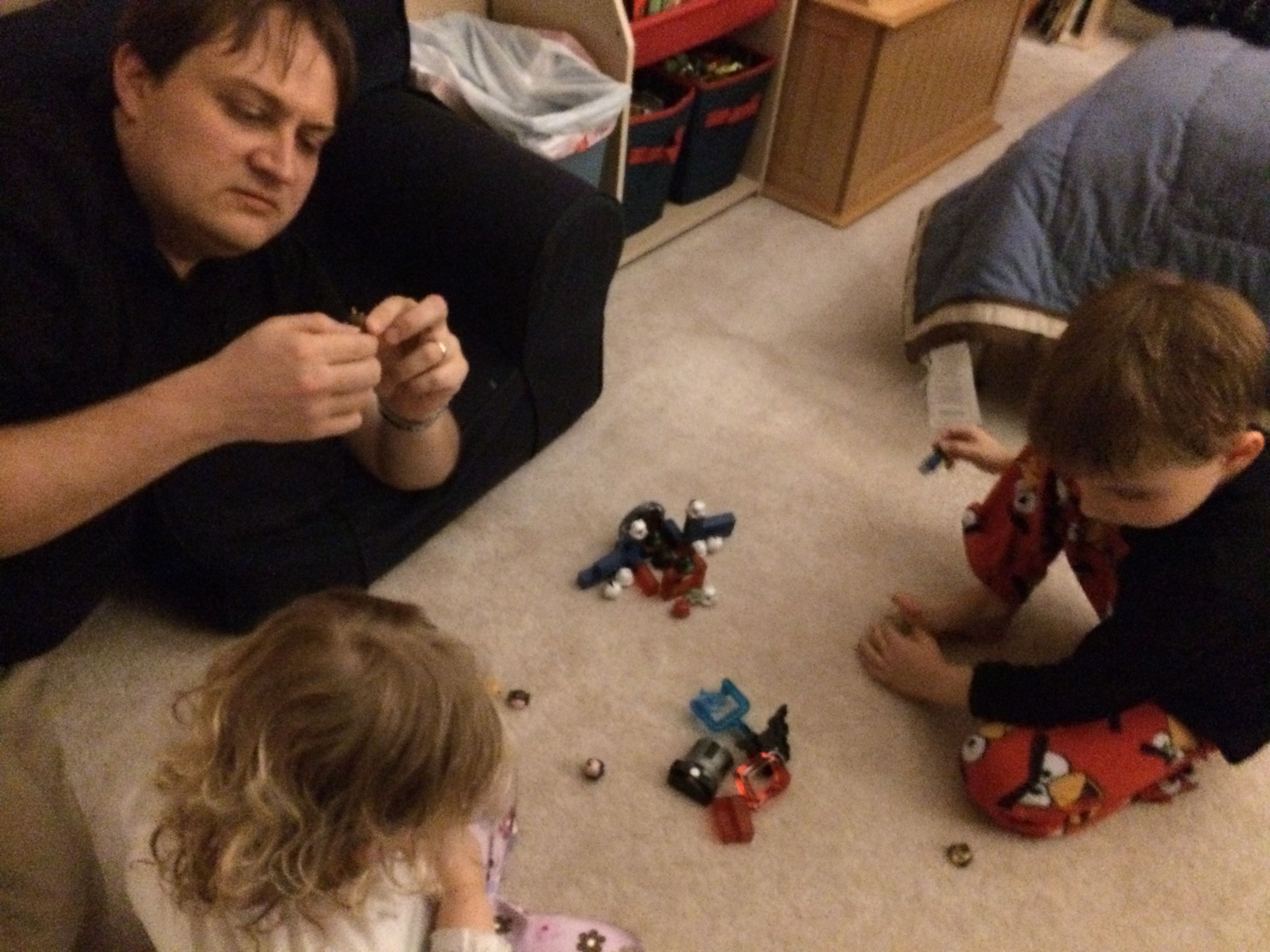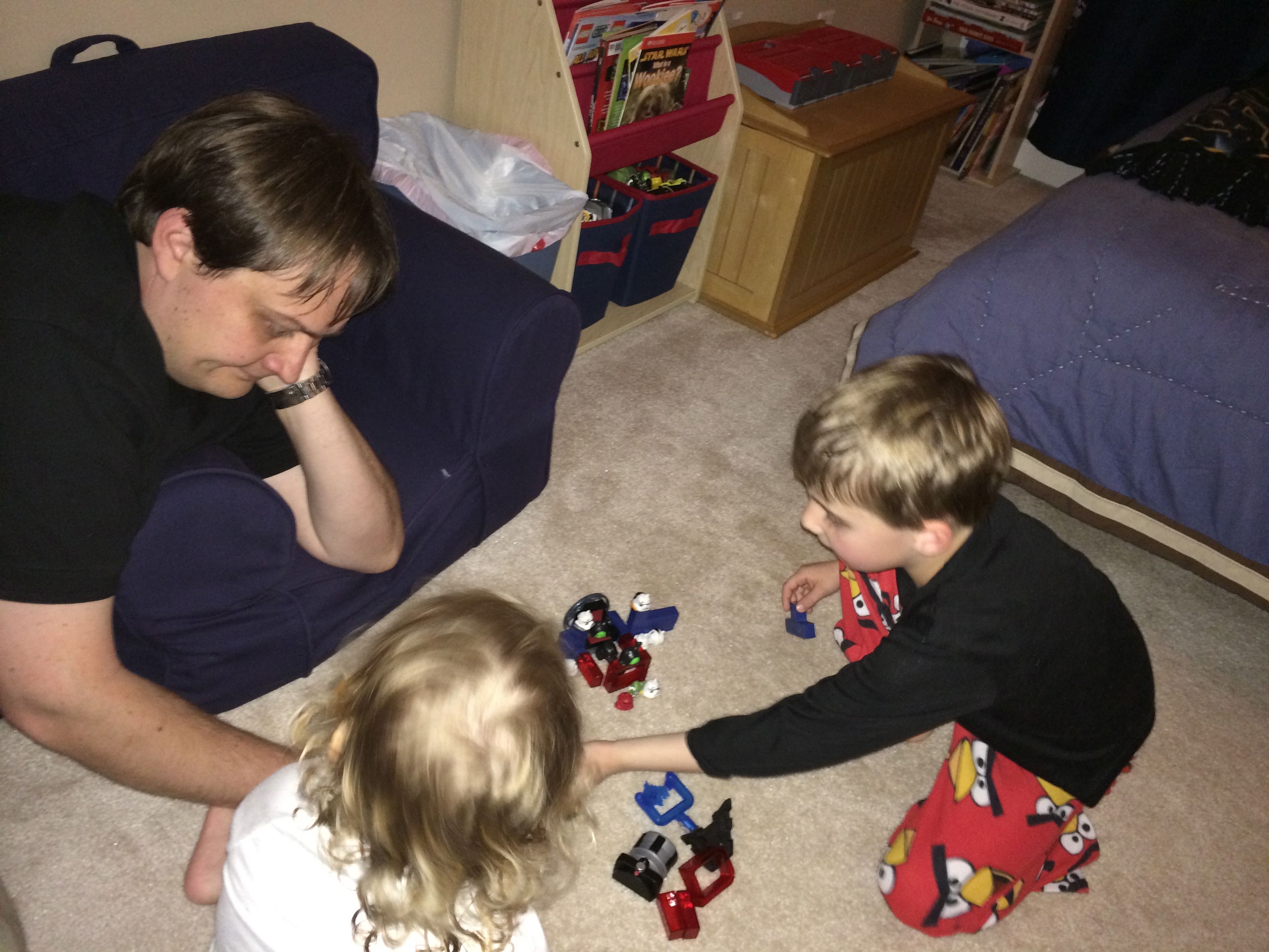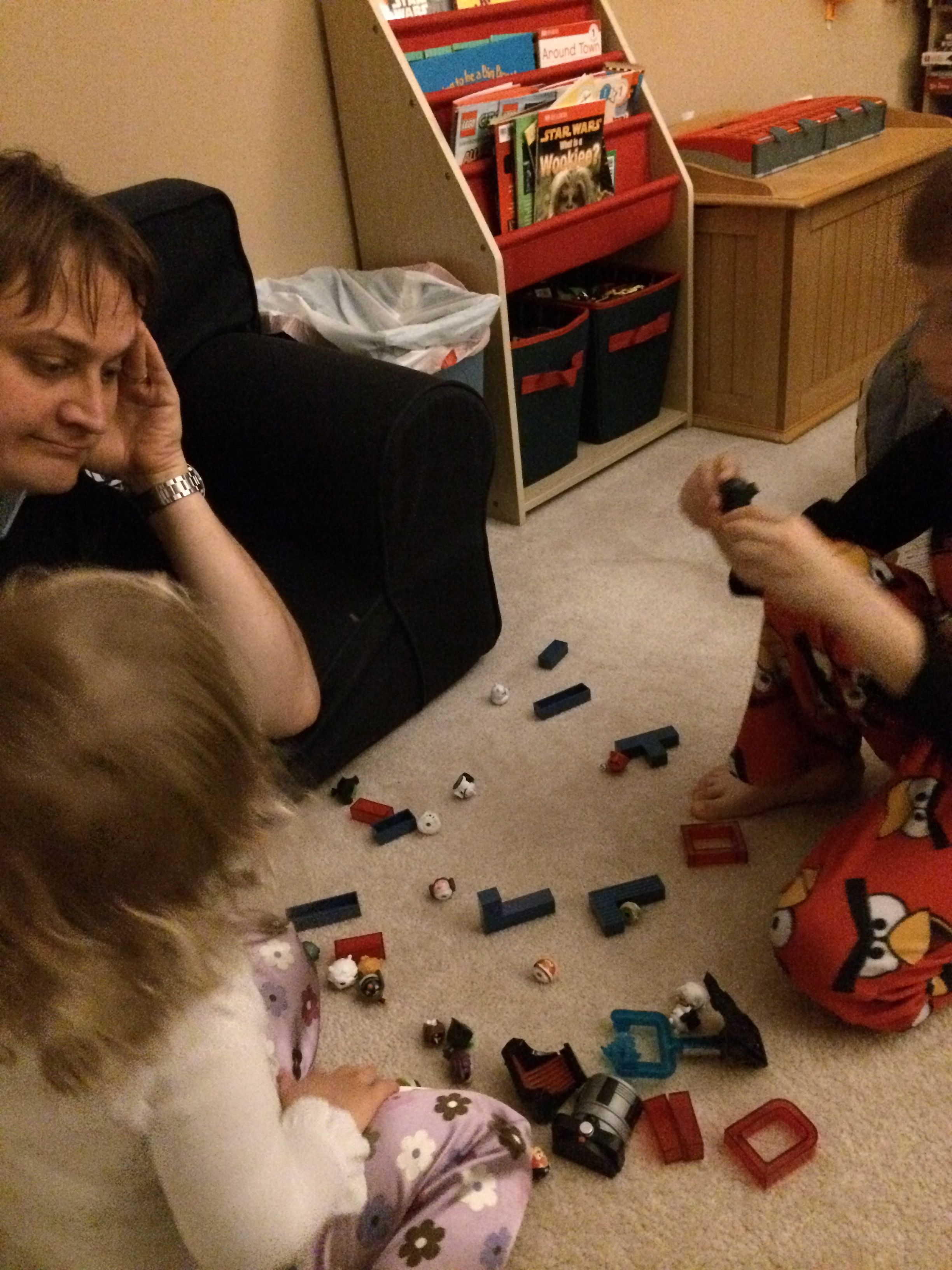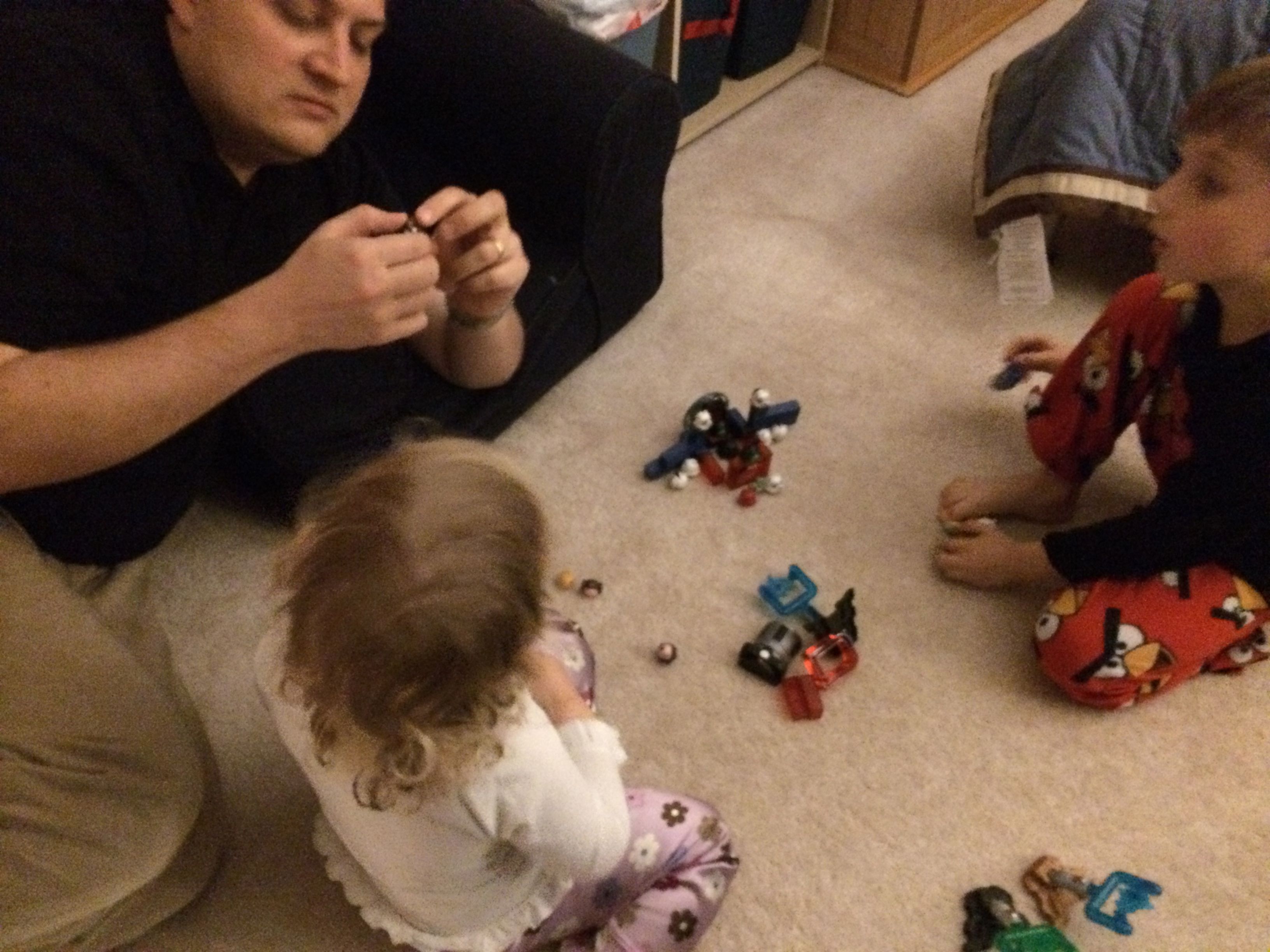 Tonight Brian “just had to” play some live-action Angry Birds in his room after bath. Of course he should have been reading and getting to sleep, but–our little negotiator can really get his way sometimes! Then, predictably, Kendall gets in on the action, too. You can really see the resignation on Brandon’s face. 😉 If you can’t beat ’em, join ’em!