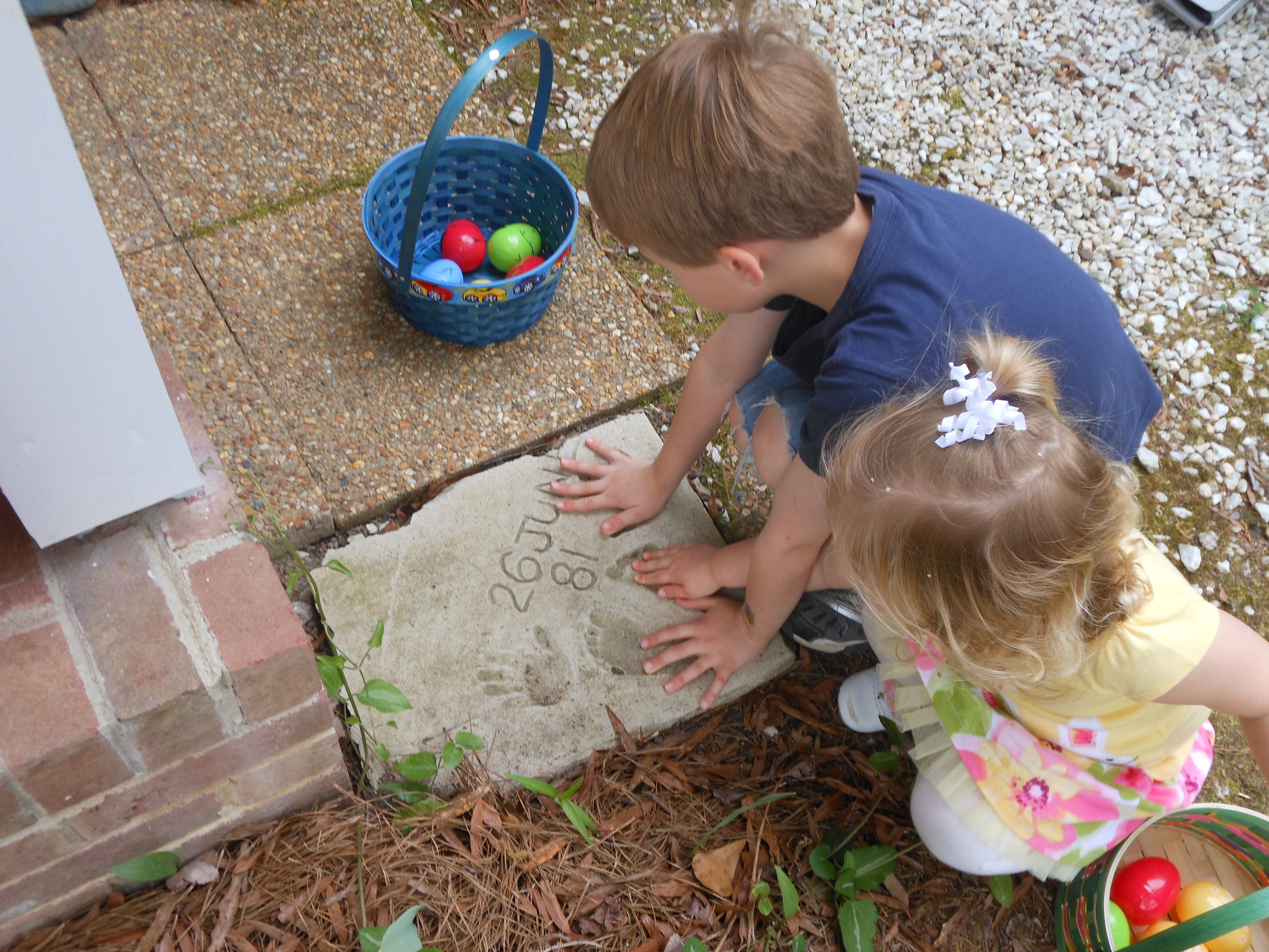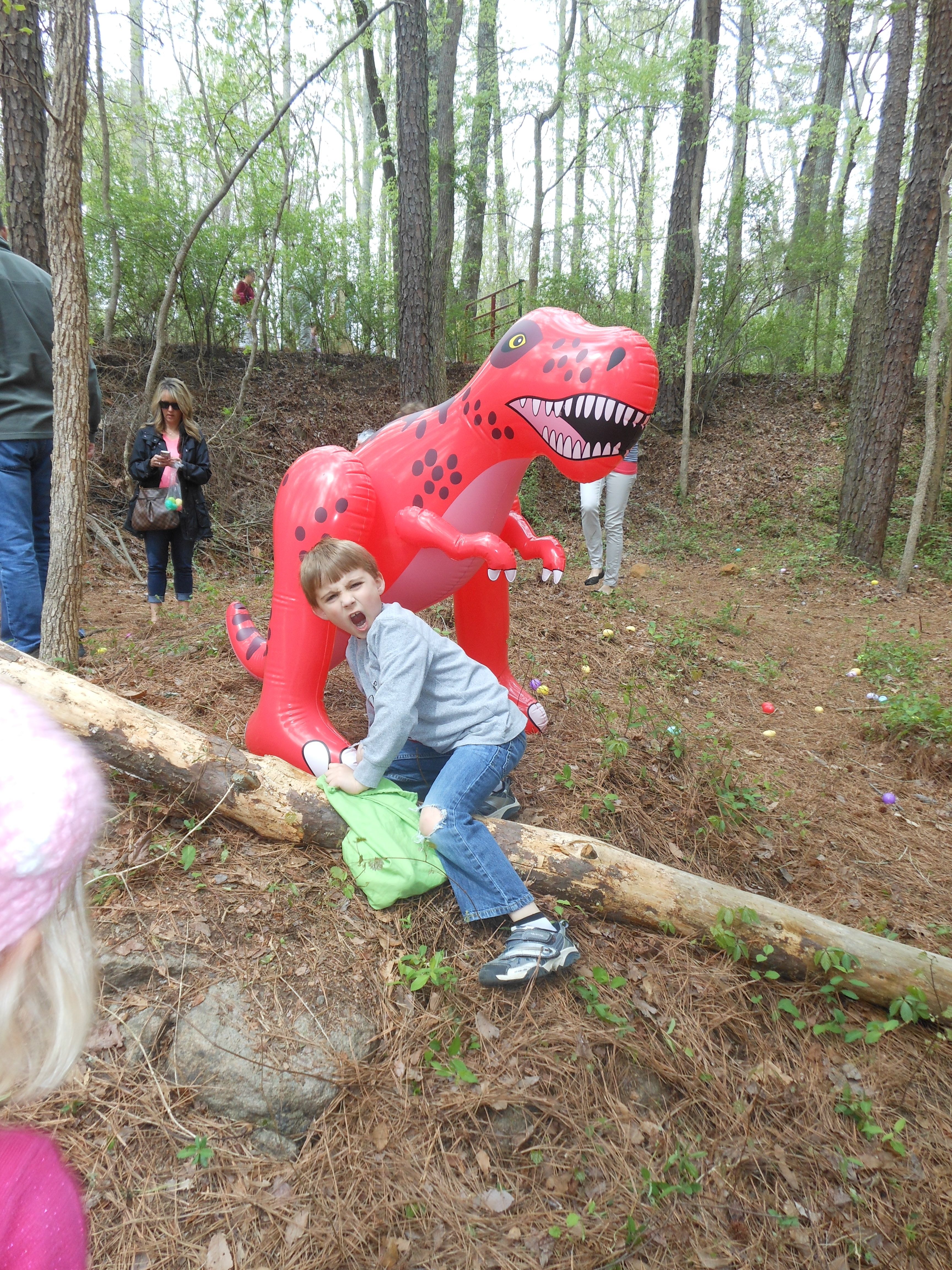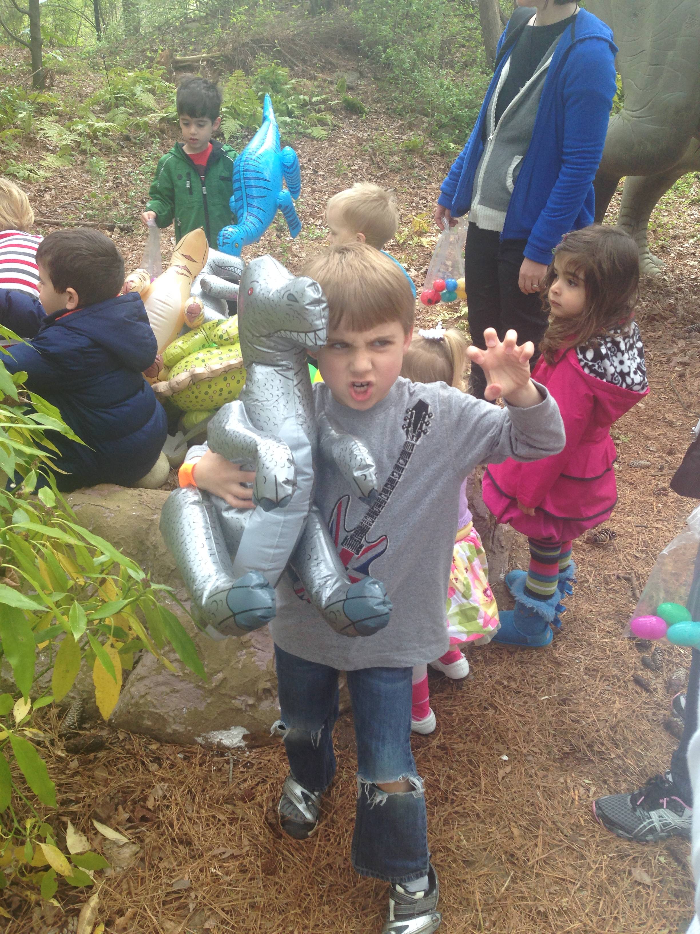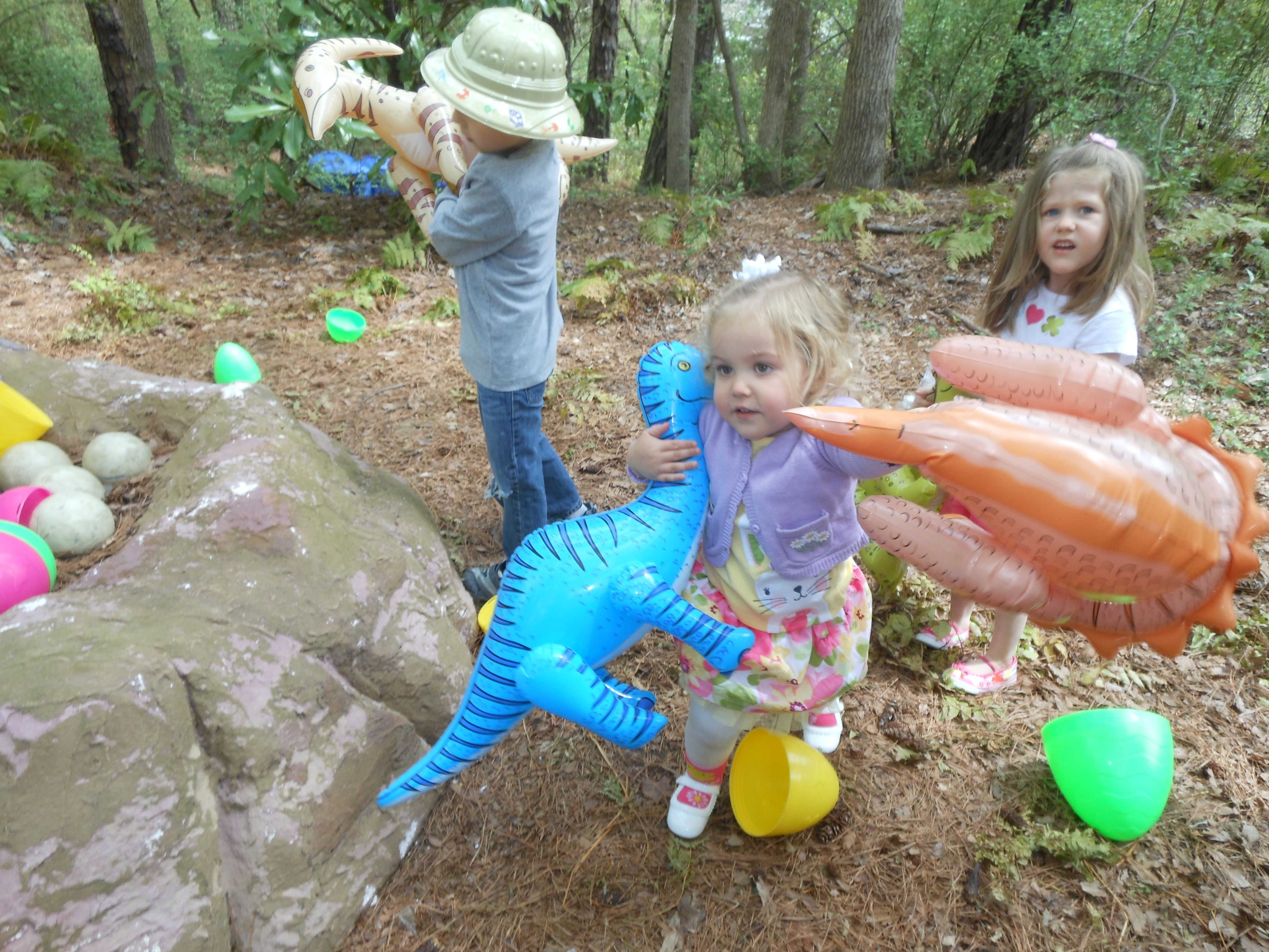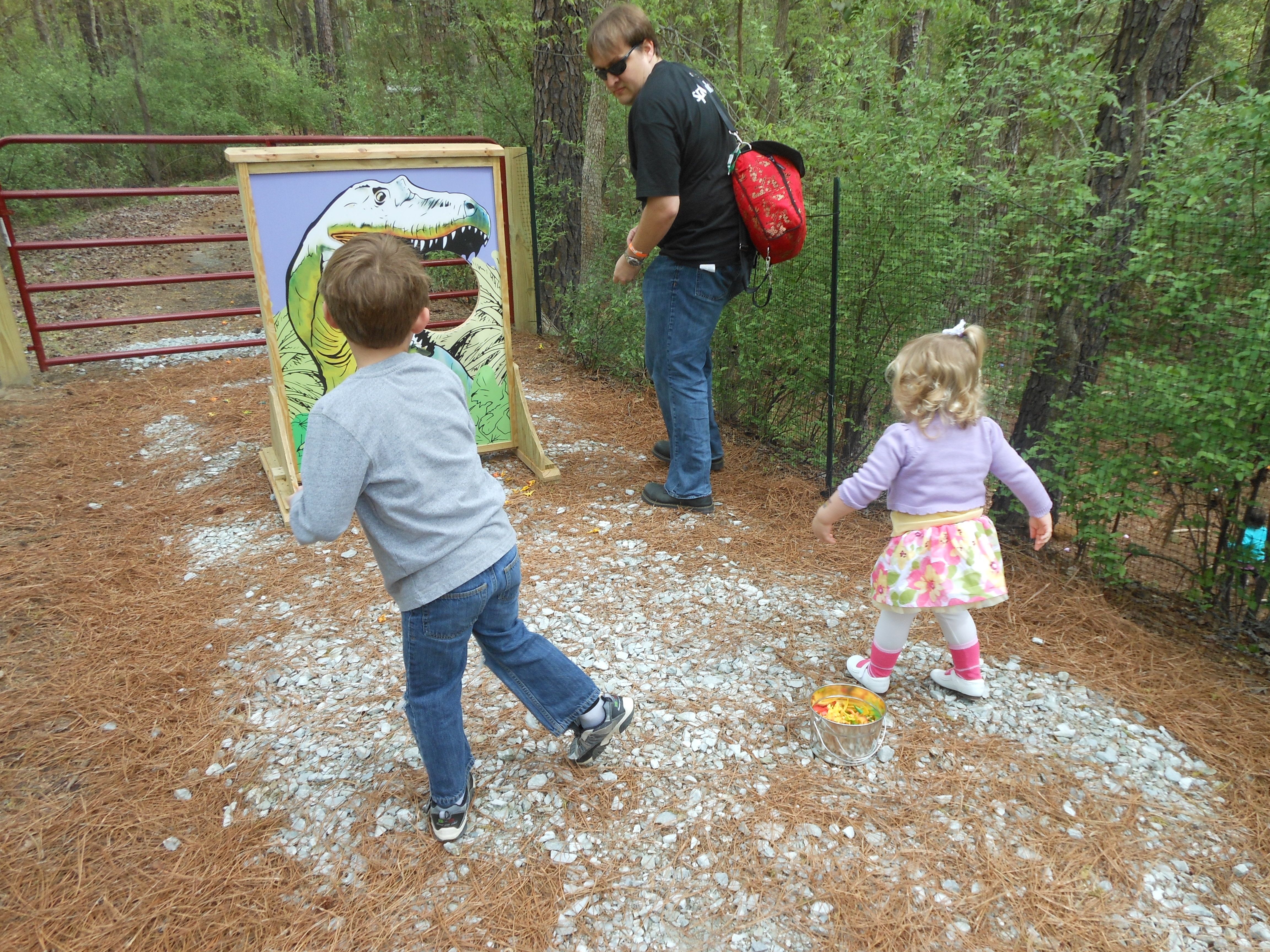 Today we were off to Durham for more Easter-themed fun! The Museum of Life+Science has a Dino Egg Hunt annually, and we’d hoped to attend last year, but it didn’t work out. We did manage it this year, and the kids had a fantastic time! We visited some of their favorite things, like the boats, and the Soundspace 2 room, but the main attraction was the egg hunt! It was located in the woods adjacent to the dinosaur trail, in an area that isn’t usually open to the public. It was a really cool hunt, in that there wasn’t any waiting in line–you had to pre-purchase tickets for a particular slot, and during your time, you could hunt for eggs whenever. The staff kept the hunt area fully stocked at all times, which was no small feat! You were supposed to keep it to 12 eggs per child, but I’m not sure anyone actually adhered to that. 😉 The kids picked up some pretty unique eggs, which contained some interesting science-themed contents. Much cooler than the usual plastic-egg-filler suspects. 😉 There were some fun dinosaur-themed activities, and both kids enjoyed coloring, the dino toss, and Brian really got into a match the dinosaur with the skeleton game. Kendall particularly loved the inflatable dinosaurs, especially a blue one. She really did not want to leave it behind! Once we started feeling a little hungry and tired, we headed out and got some lunch at Arby’s. The kids got these red rubber wristbands as prizes in their kids’ meals, and for some reason, were quite taken with them. After that, we packed them back up and drove out to Rosemary’s for a visit. We hoped the kids would rest some on the way, but we weren’t that lucky! When we got there, Brian wanted to play Easter Bunny, just like he has in years past. He took turns hiding and finding eggs with us, and Kendall participated, too! The kids could play this game all day. 🙂 Rosemary showed the kids how to make “snow” fall from the snowdrop bushes–Brian and Kendall both loved that! The kids both tried out their hand and footprints against some of mine from back in the day. 😉