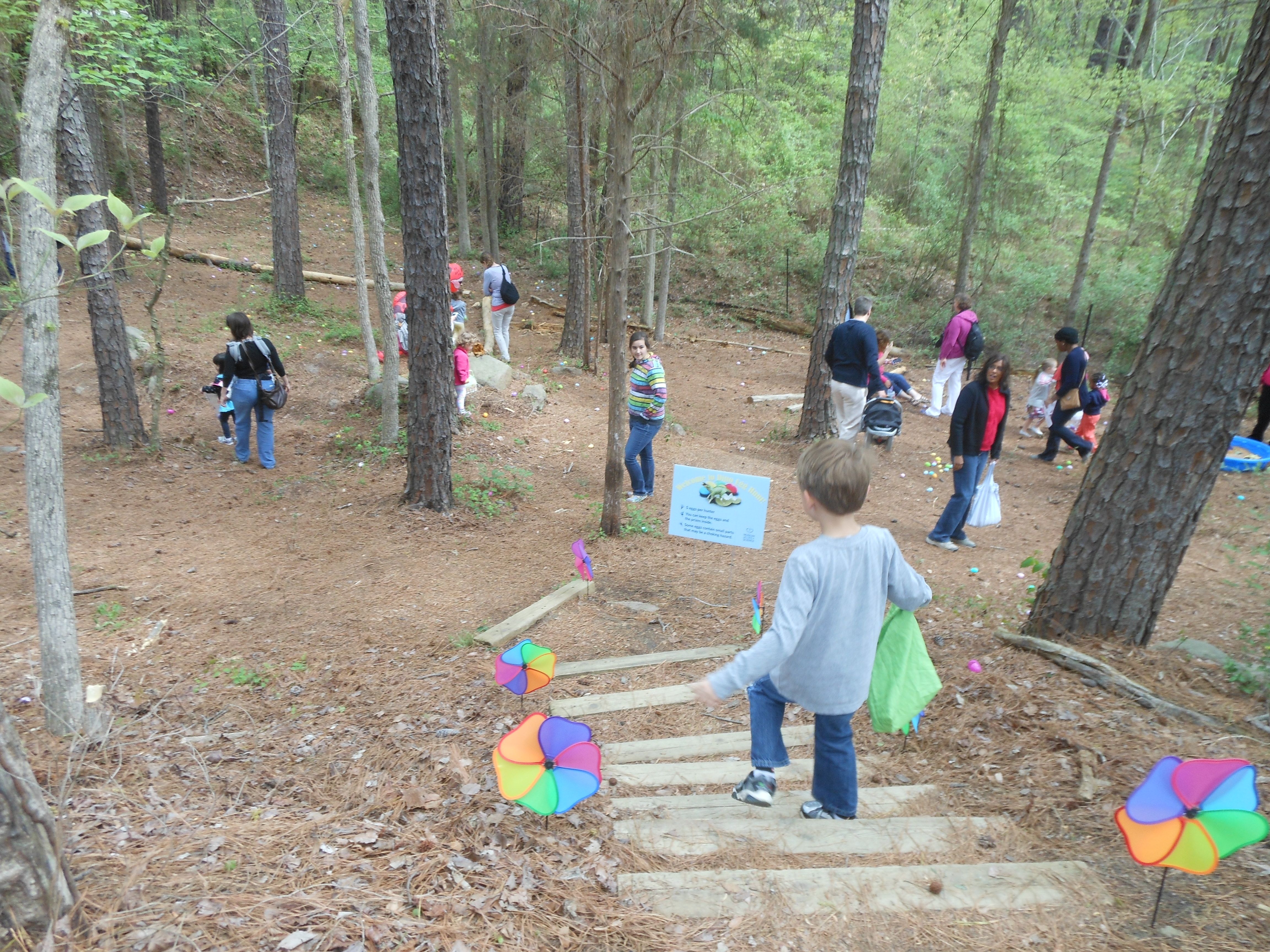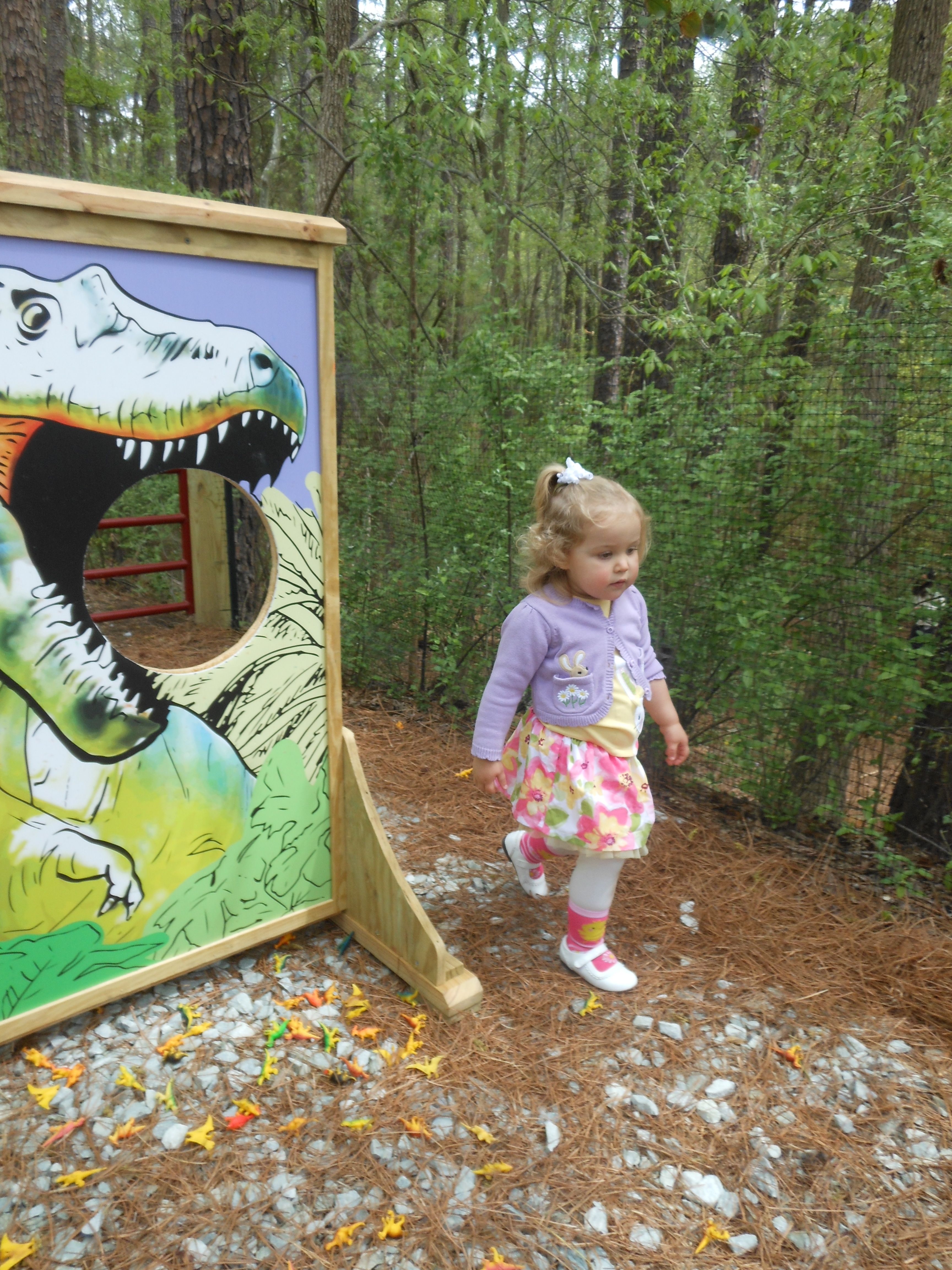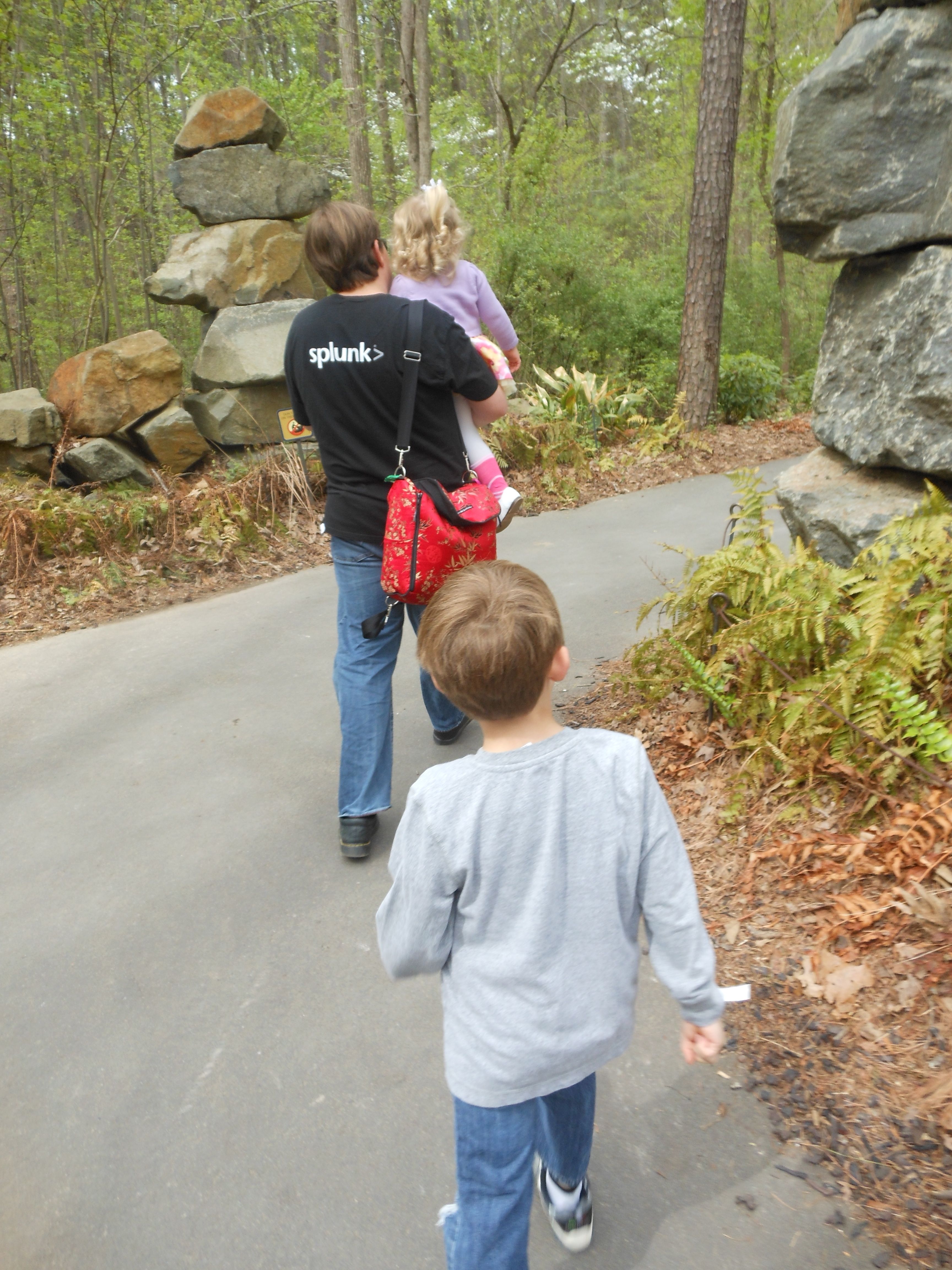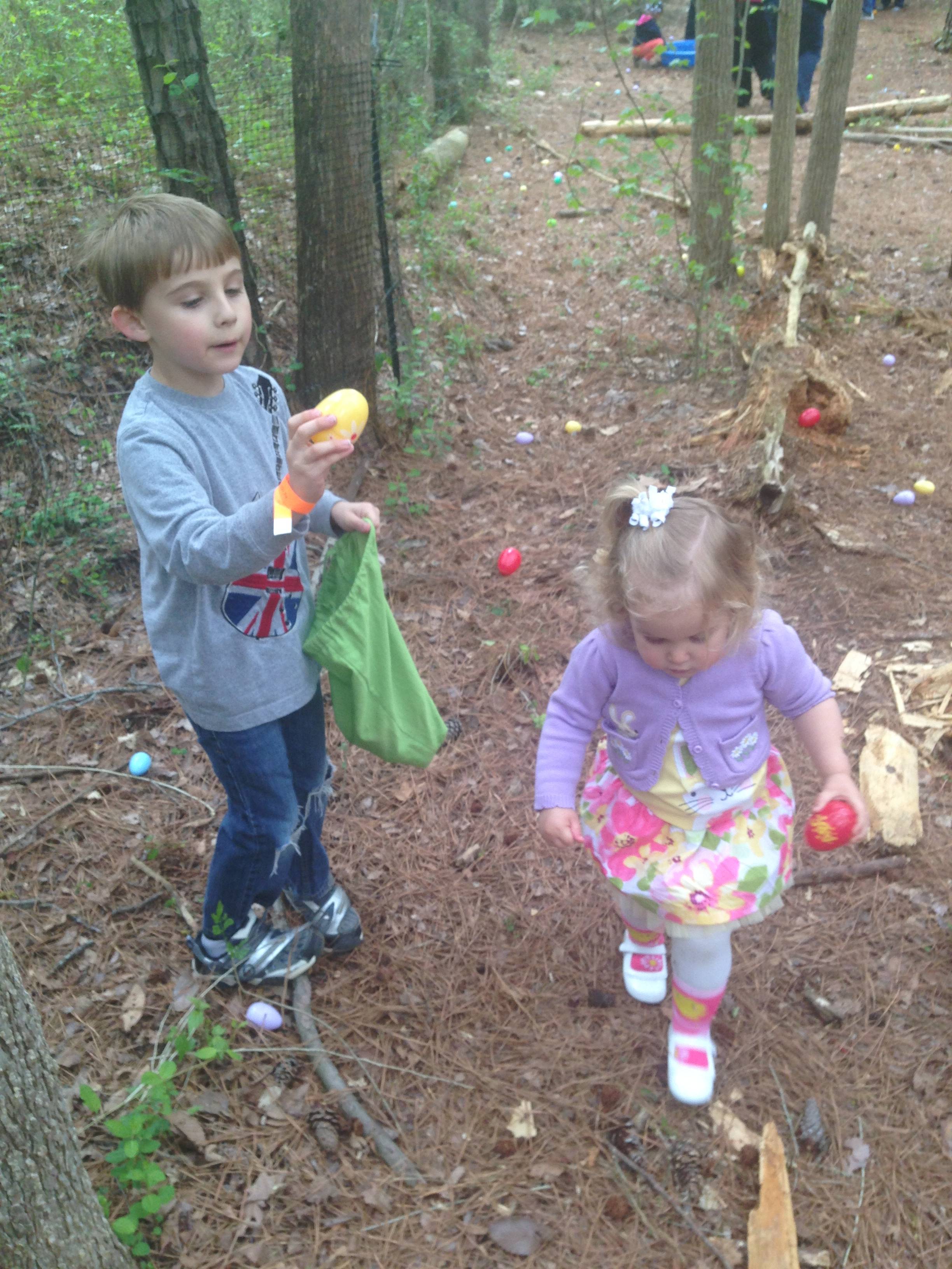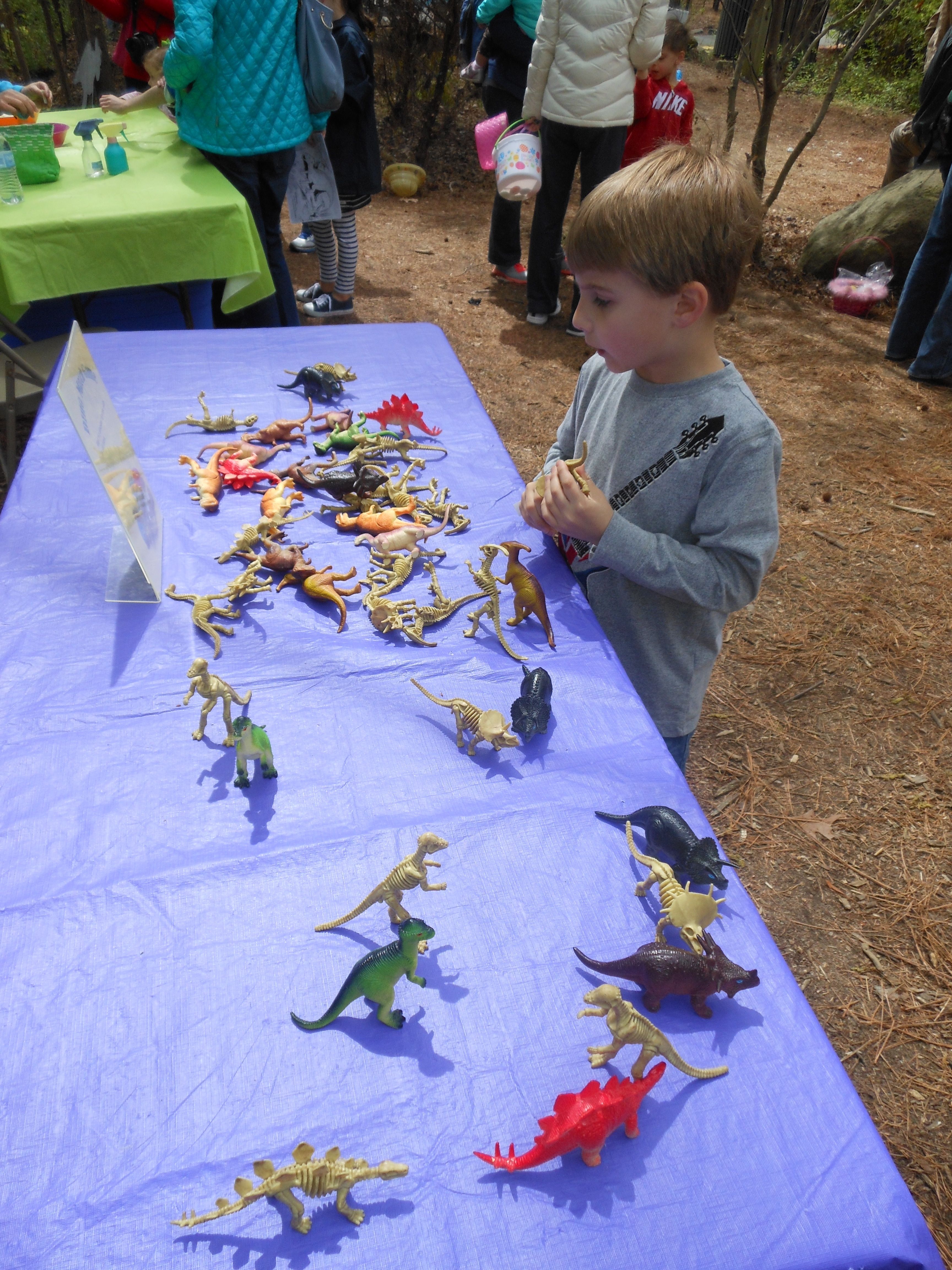 Today we were off to Durham for more Easter-themed fun! The Museum of Life+Science has a Dino Egg Hunt annually, and we’d hoped to attend last year, but it didn’t work out. We did manage it this year, and the kids had a fantastic time! We visited some of their favorite things, like the boats, and the Soundspace 2 room, but the main attraction was the egg hunt! It was located in the woods adjacent to the dinosaur trail, in an area that isn’t usually open to the public. It was a really cool hunt, in that there wasn’t any waiting in line–you had to pre-purchase tickets for a particular slot, and during your time, you could hunt for eggs whenever. The staff kept the hunt area fully stocked at all times, which was no small feat! You were supposed to keep it to 12 eggs per child, but I’m not sure anyone actually adhered to that. 😉 The kids picked up some pretty unique eggs, which contained some interesting science-themed contents. Much cooler than the usual plastic-egg-filler suspects. 😉 There were some fun dinosaur-themed activities, and both kids enjoyed coloring, the dino toss, and Brian really got into a match the dinosaur with the skeleton game. Kendall particularly loved the inflatable dinosaurs, especially a blue one. She really did not want to leave it behind! Once we started feeling a little hungry and tired, we headed out and got some lunch at Arby’s. The kids got these red rubber wristbands as prizes in their kids’ meals, and for some reason, were quite taken with them. After that, we packed them back up and drove out to Rosemary’s for a visit. We hoped the kids would rest some on the way, but we weren’t that lucky! When we got there, Brian wanted to play Easter Bunny, just like he has in years past. He took turns hiding and finding eggs with us, and Kendall participated, too! The kids could play this game all day. 🙂 Rosemary showed the kids how to make “snow” fall from the snowdrop bushes–Brian and Kendall both loved that! The kids both tried out their hand and footprints against some of mine from back in the day. 😉