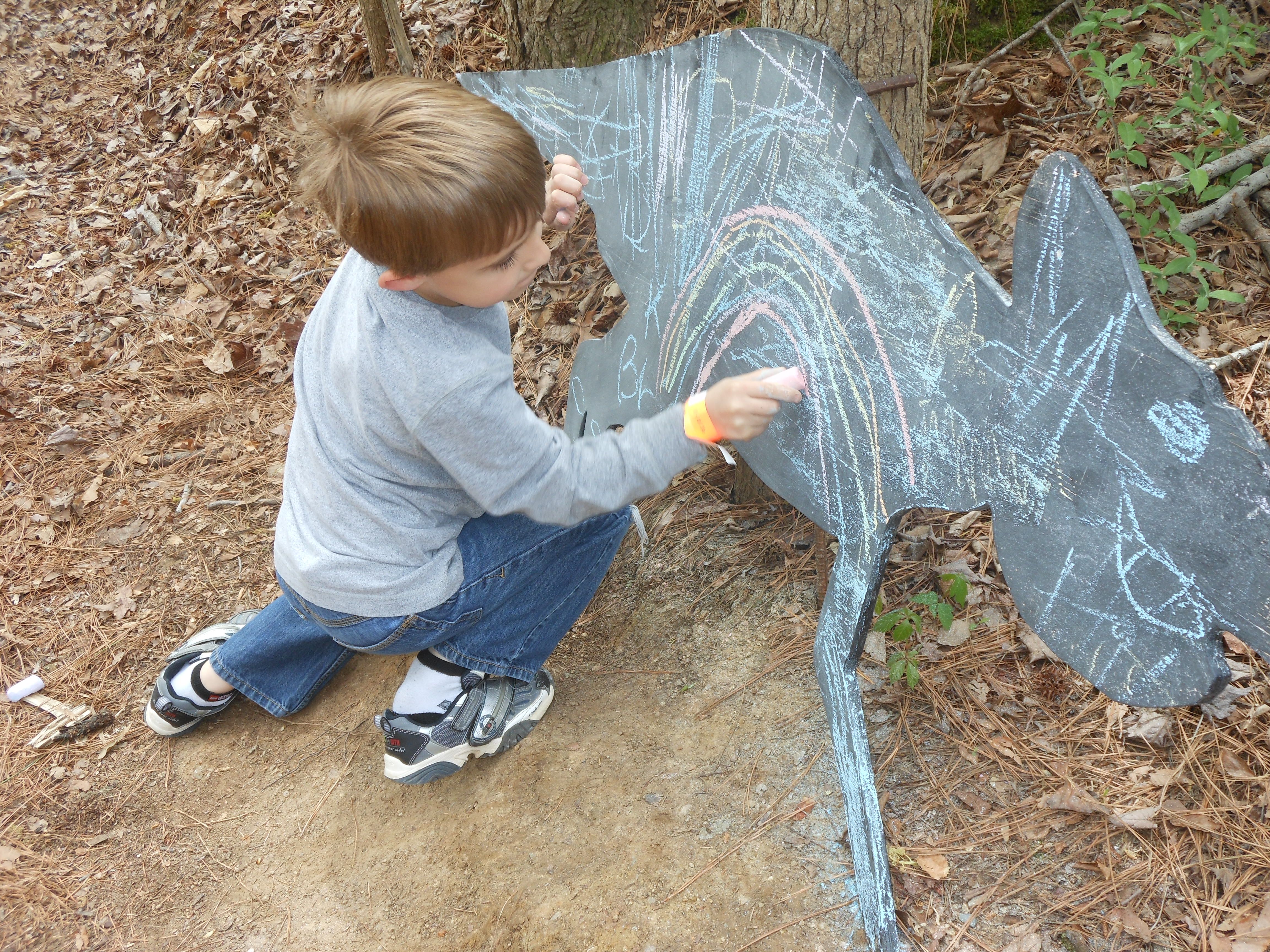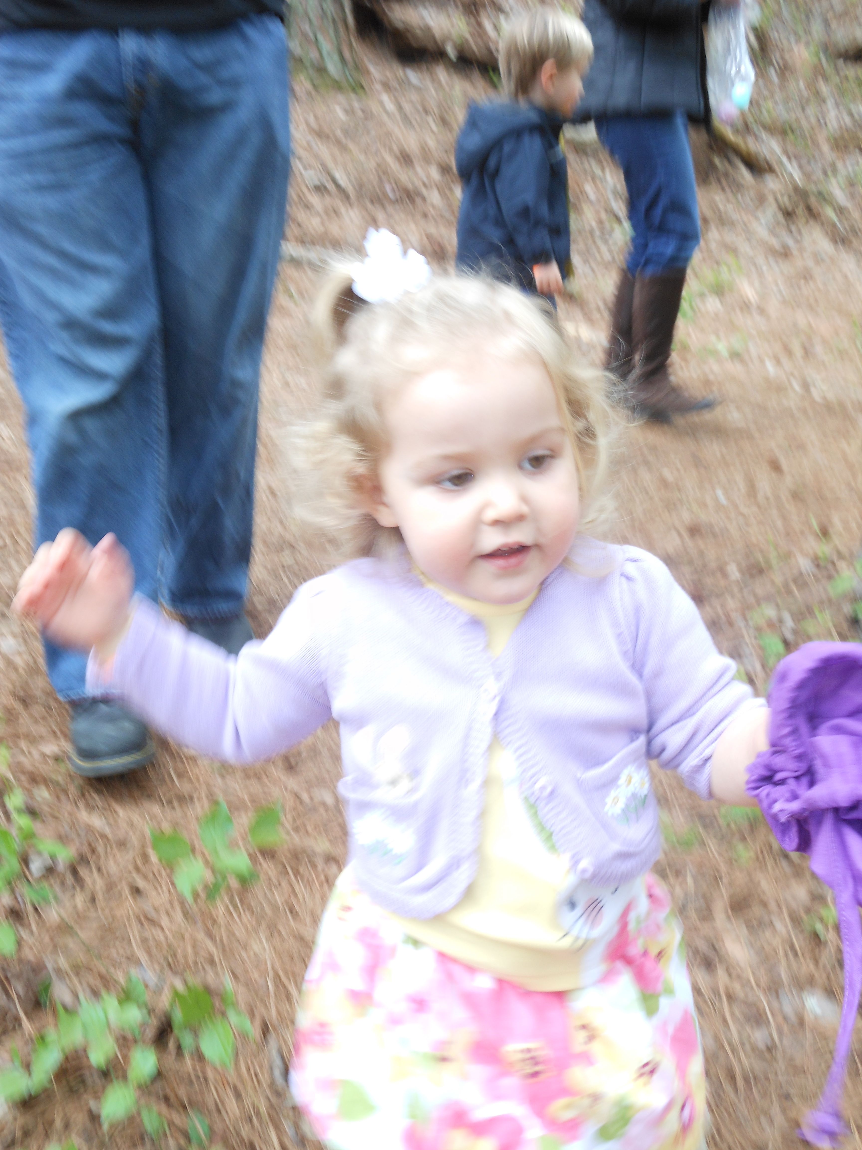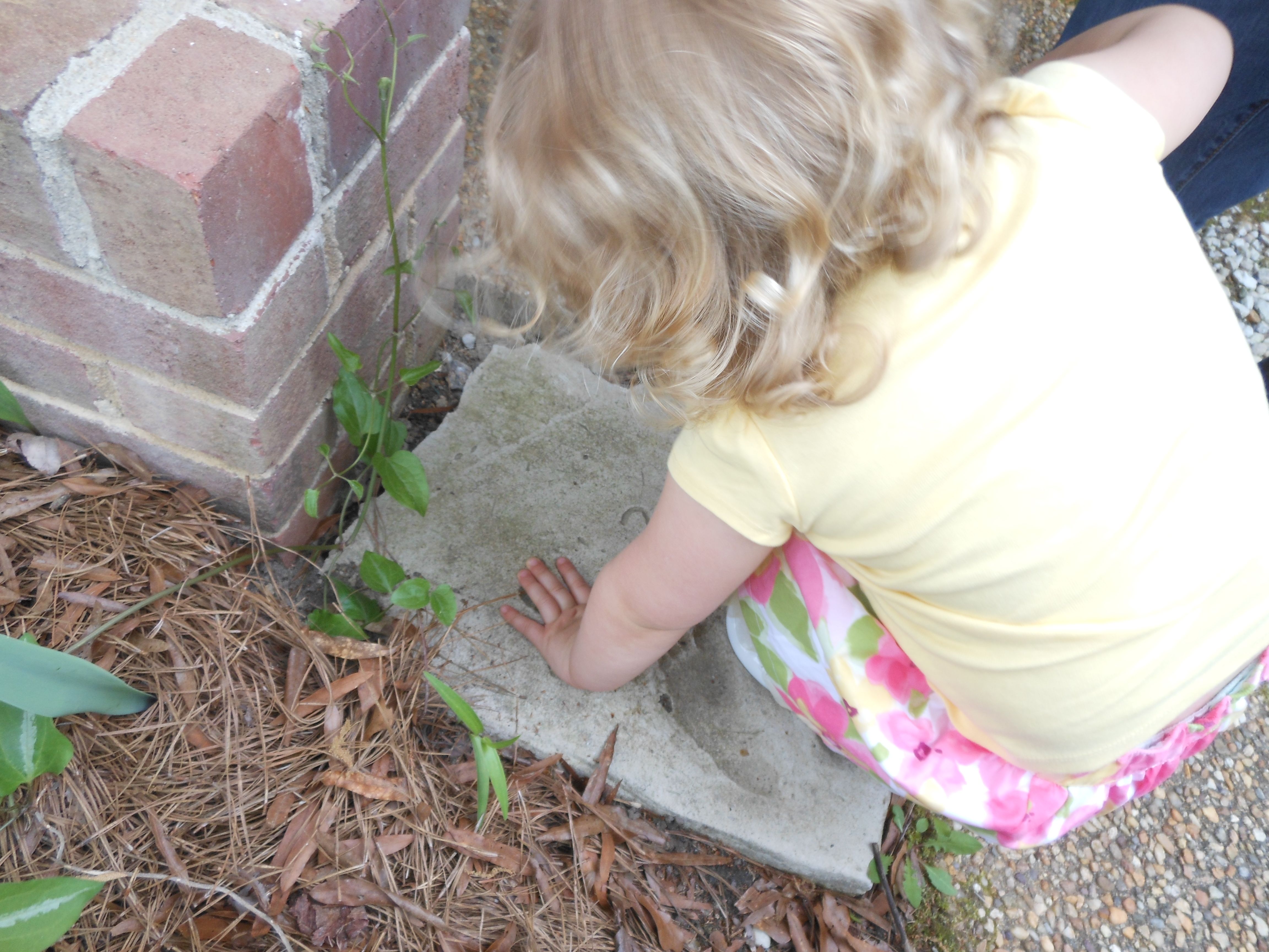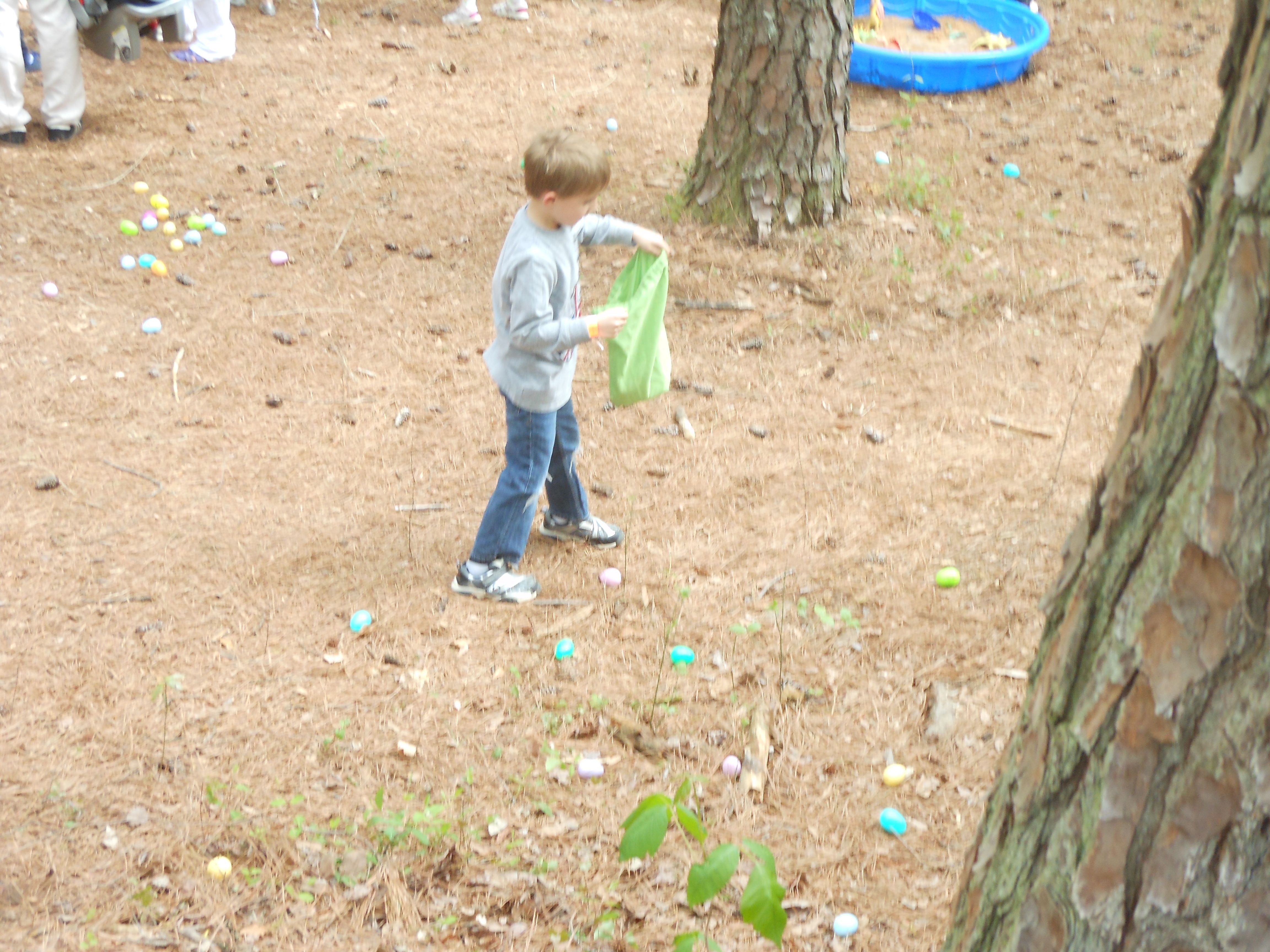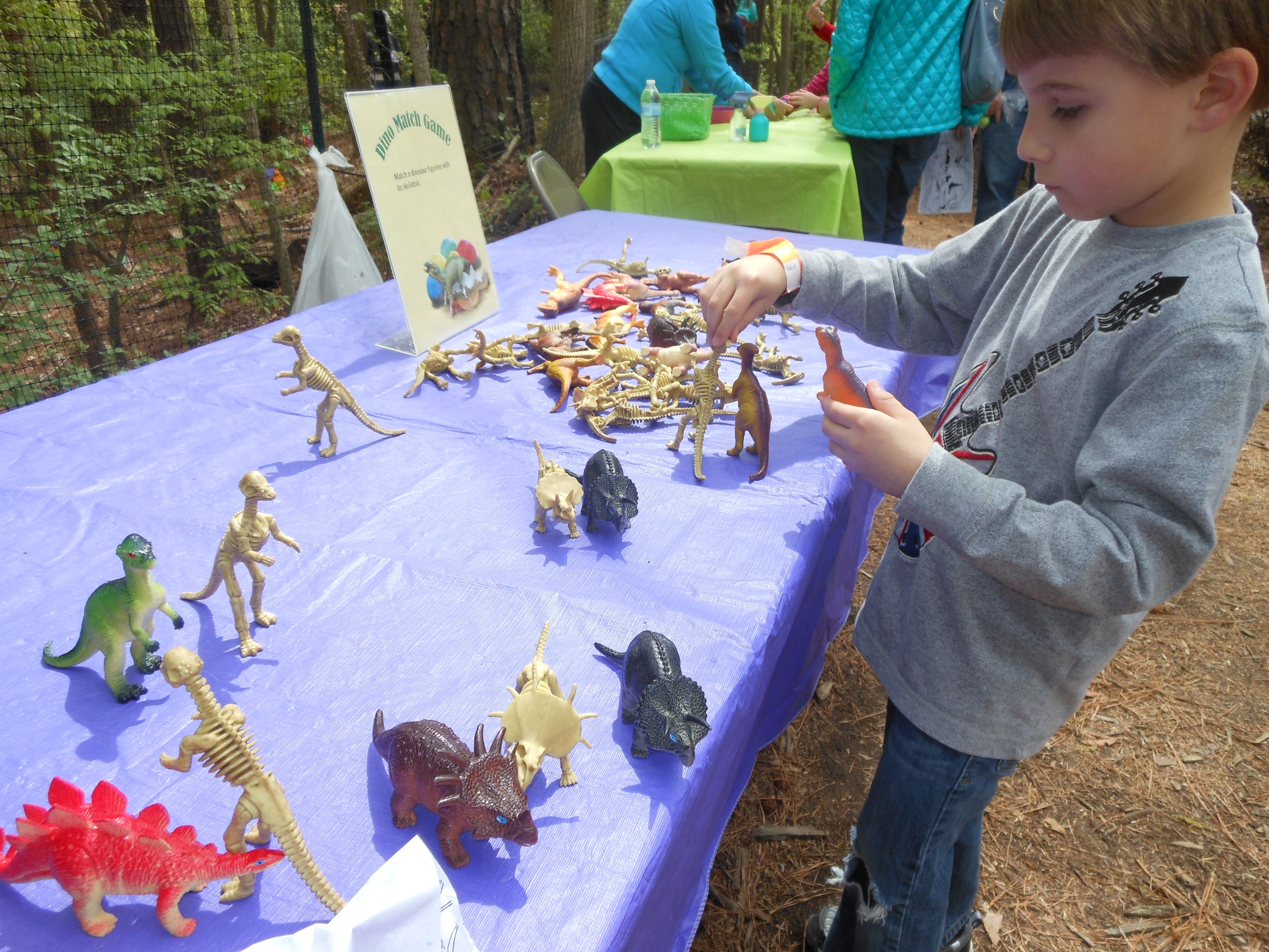 Today we were off to Durham for more Easter-themed fun! The Museum of Life+Science has a Dino Egg Hunt annually, and we’d hoped to attend last year, but it didn’t work out. We did manage it this year, and the kids had a fantastic time! We visited some of their favorite things, like the boats, and the Soundspace 2 room, but the main attraction was the egg hunt! It was located in the woods adjacent to the dinosaur trail, in an area that isn’t usually open to the public. It was a really cool hunt, in that there wasn’t any waiting in line–you had to pre-purchase tickets for a particular slot, and during your time, you could hunt for eggs whenever. The staff kept the hunt area fully stocked at all times, which was no small feat! You were supposed to keep it to 12 eggs per child, but I’m not sure anyone actually adhered to that. 😉 The kids picked up some pretty unique eggs, which contained some interesting science-themed contents. Much cooler than the usual plastic-egg-filler suspects. 😉 There were some fun dinosaur-themed activities, and both kids enjoyed coloring, the dino toss, and Brian really got into a match the dinosaur with the skeleton game. Kendall particularly loved the inflatable dinosaurs, especially a blue one. She really did not want to leave it behind! Once we started feeling a little hungry and tired, we headed out and got some lunch at Arby’s. The kids got these red rubber wristbands as prizes in their kids’ meals, and for some reason, were quite taken with them. After that, we packed them back up and drove out to Rosemary’s for a visit. We hoped the kids would rest some on the way, but we weren’t that lucky! When we got there, Brian wanted to play Easter Bunny, just like he has in years past. He took turns hiding and finding eggs with us, and Kendall participated, too! The kids could play this game all day. 🙂 Rosemary showed the kids how to make “snow” fall from the snowdrop bushes–Brian and Kendall both loved that! The kids both tried out their hand and footprints against some of mine from back in the day. 😉