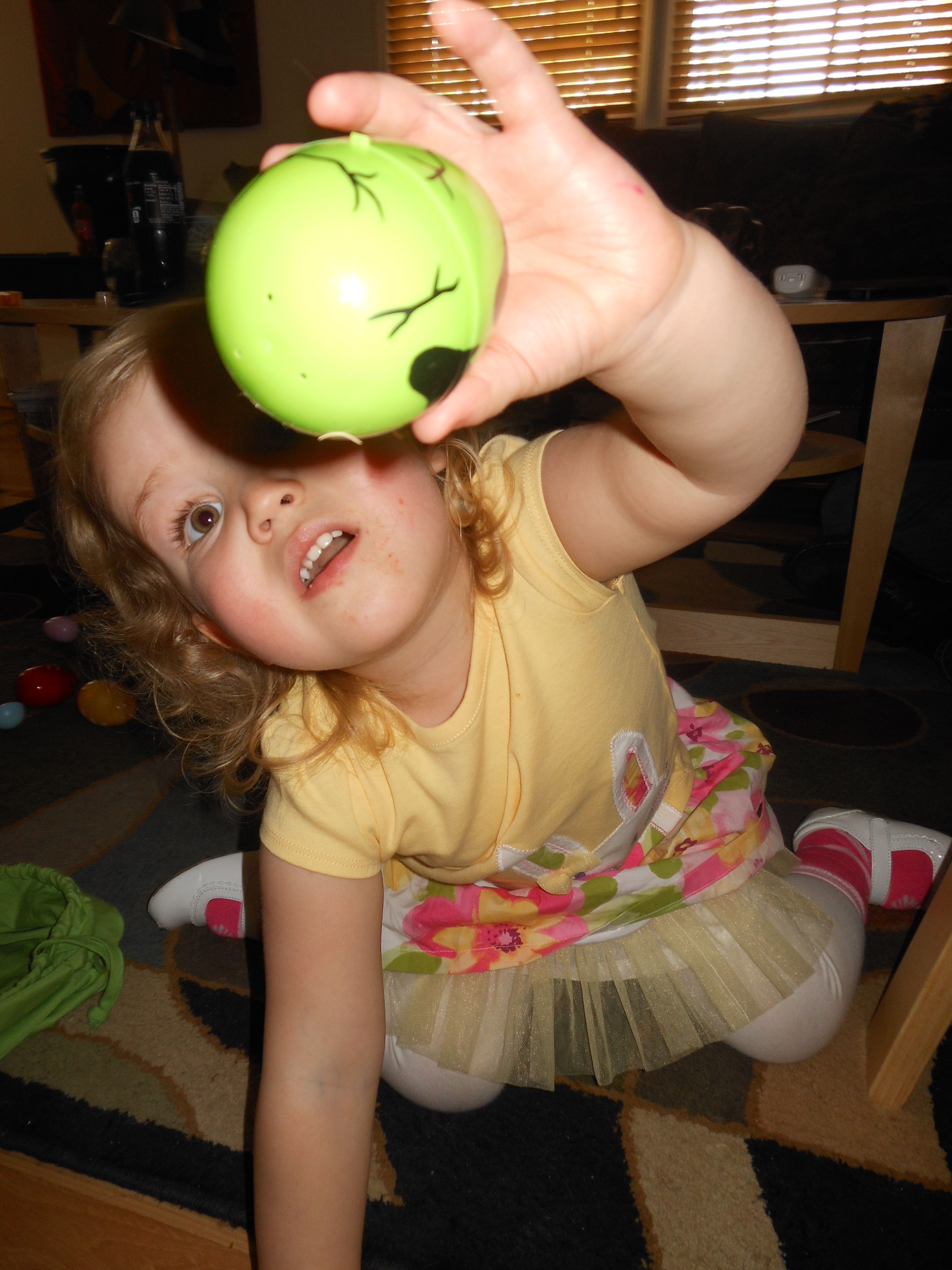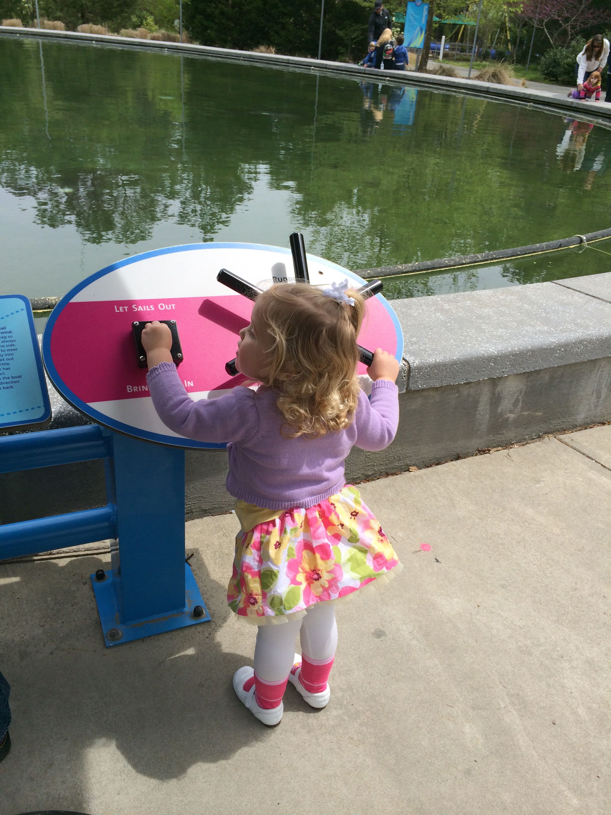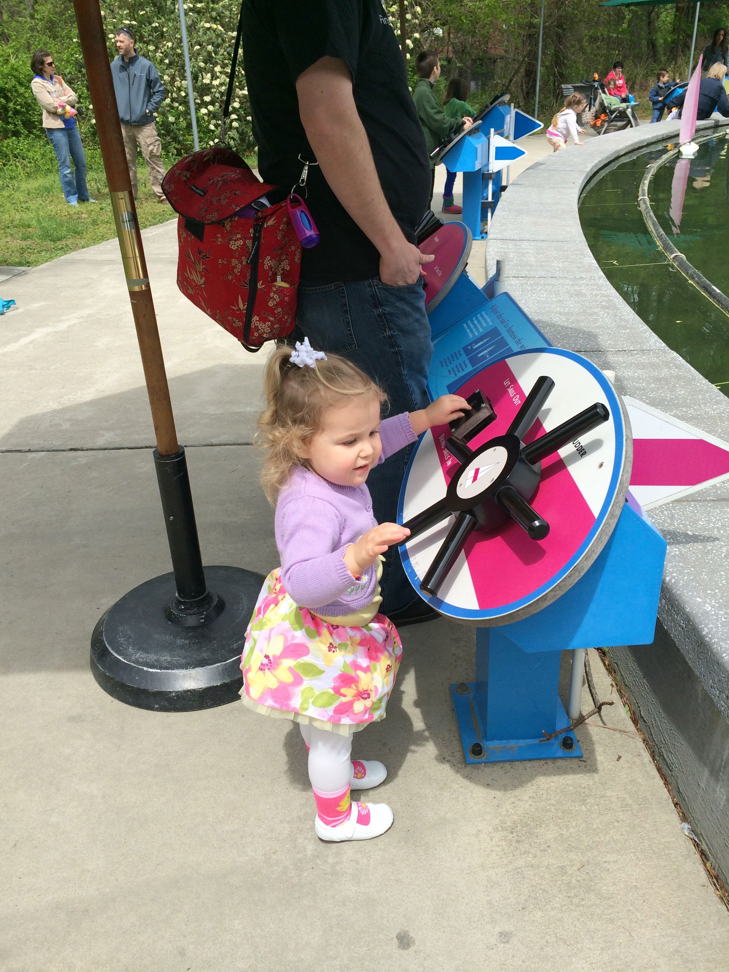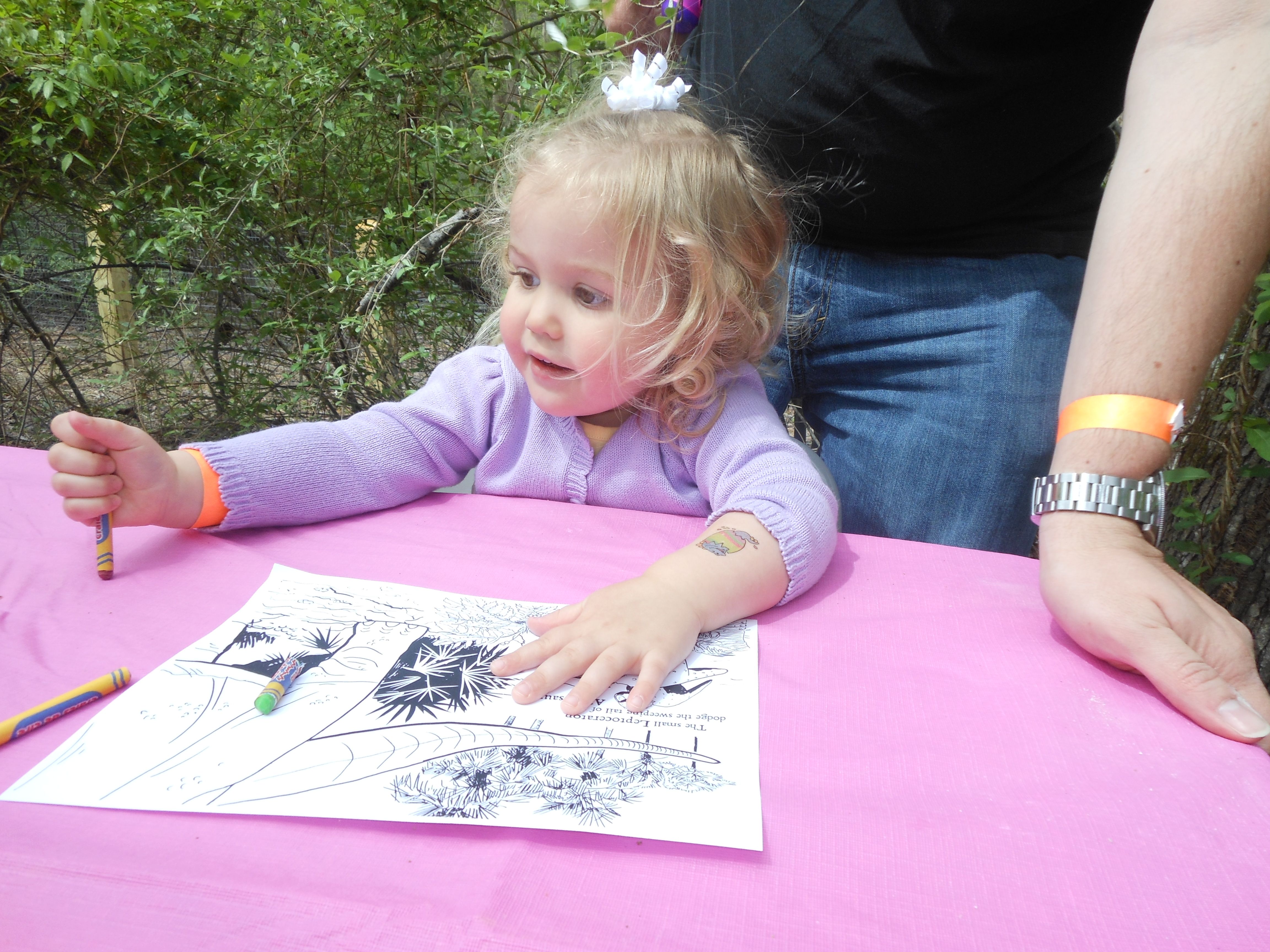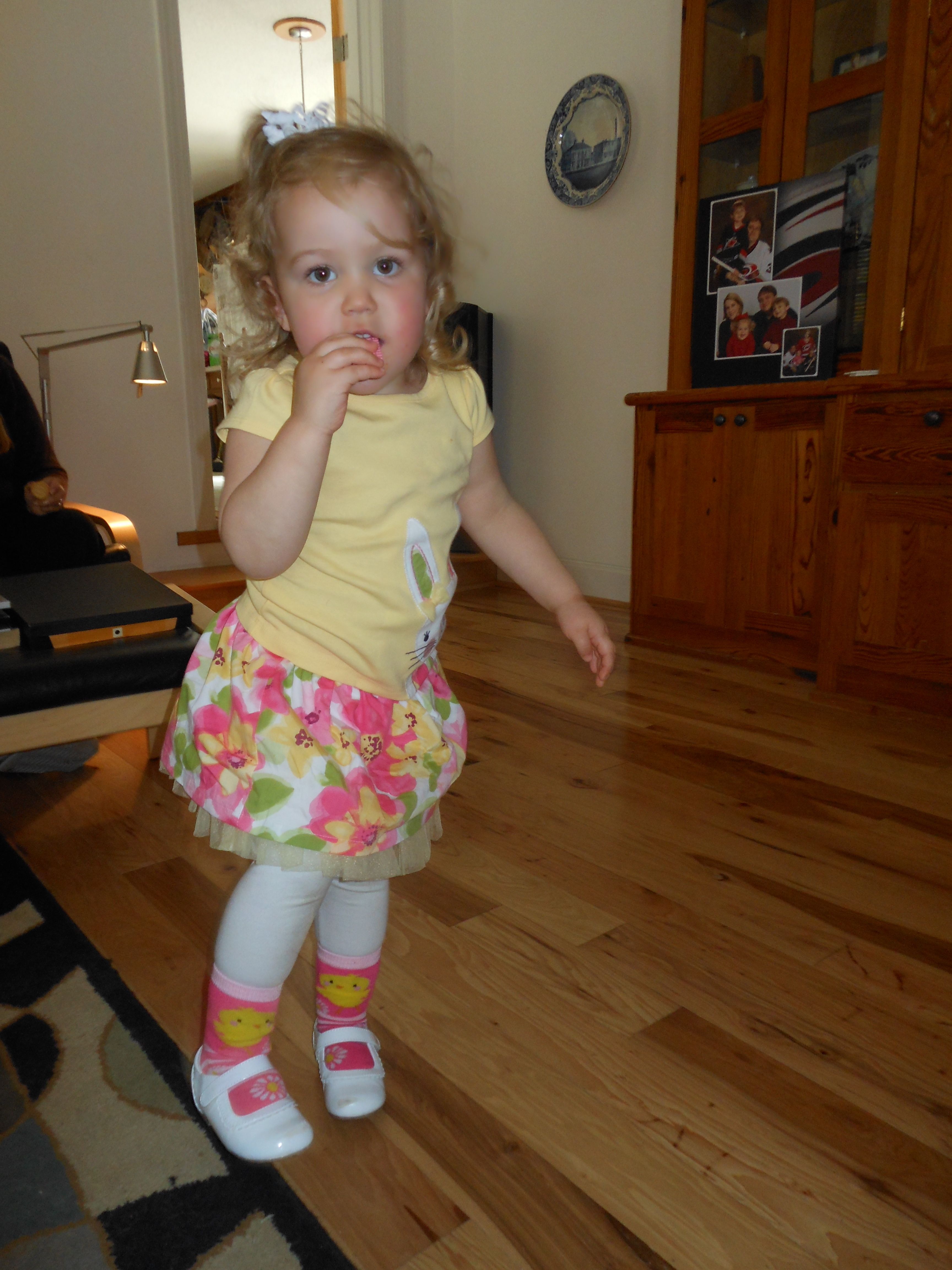 Today we were off to Durham for more Easter-themed fun! The Museum of Life+Science has a Dino Egg Hunt annually, and we’d hoped to attend last year, but it didn’t work out. We did manage it this year, and the kids had a fantastic time! We visited some of their favorite things, like the boats, and the Soundspace 2 room, but the main attraction was the egg hunt! It was located in the woods adjacent to the dinosaur trail, in an area that isn’t usually open to the public. It was a really cool hunt, in that there wasn’t any waiting in line–you had to pre-purchase tickets for a particular slot, and during your time, you could hunt for eggs whenever. The staff kept the hunt area fully stocked at all times, which was no small feat! You were supposed to keep it to 12 eggs per child, but I’m not sure anyone actually adhered to that. 😉 The kids picked up some pretty unique eggs, which contained some interesting science-themed contents. Much cooler than the usual plastic-egg-filler suspects. 😉 There were some fun dinosaur-themed activities, and both kids enjoyed coloring, the dino toss, and Brian really got into a match the dinosaur with the skeleton game. Kendall particularly loved the inflatable dinosaurs, especially a blue one. She really did not want to leave it behind! Once we started feeling a little hungry and tired, we headed out and got some lunch at Arby’s. The kids got these red rubber wristbands as prizes in their kids’ meals, and for some reason, were quite taken with them. After that, we packed them back up and drove out to Rosemary’s for a visit. We hoped the kids would rest some on the way, but we weren’t that lucky! When we got there, Brian wanted to play Easter Bunny, just like he has in years past. He took turns hiding and finding eggs with us, and Kendall participated, too! The kids could play this game all day. 🙂 Rosemary showed the kids how to make “snow” fall from the snowdrop bushes–Brian and Kendall both loved that! The kids both tried out their hand and footprints against some of mine from back in the day. 😉