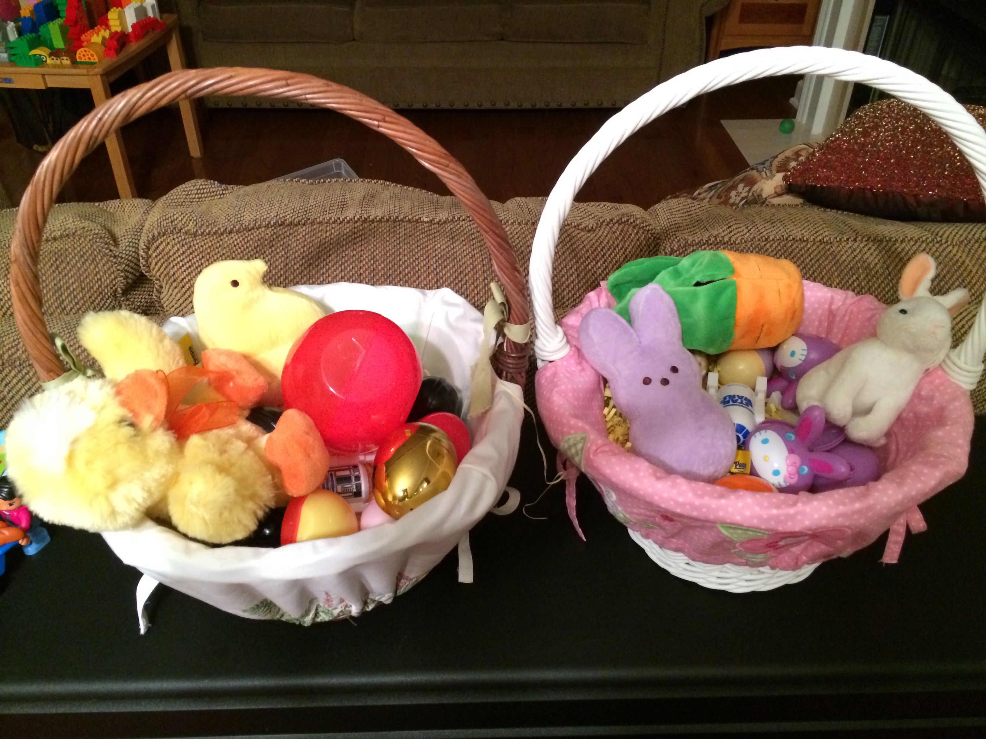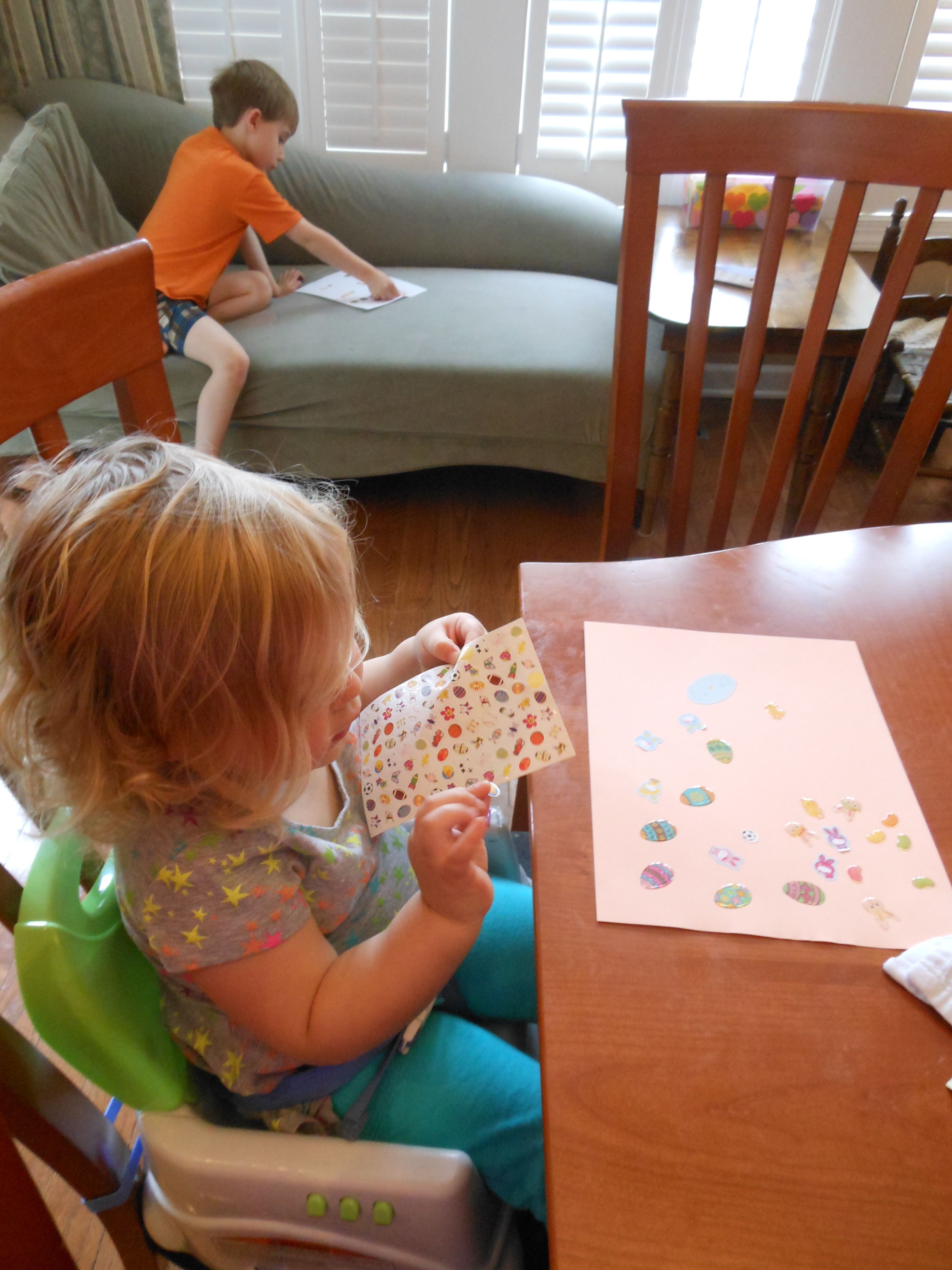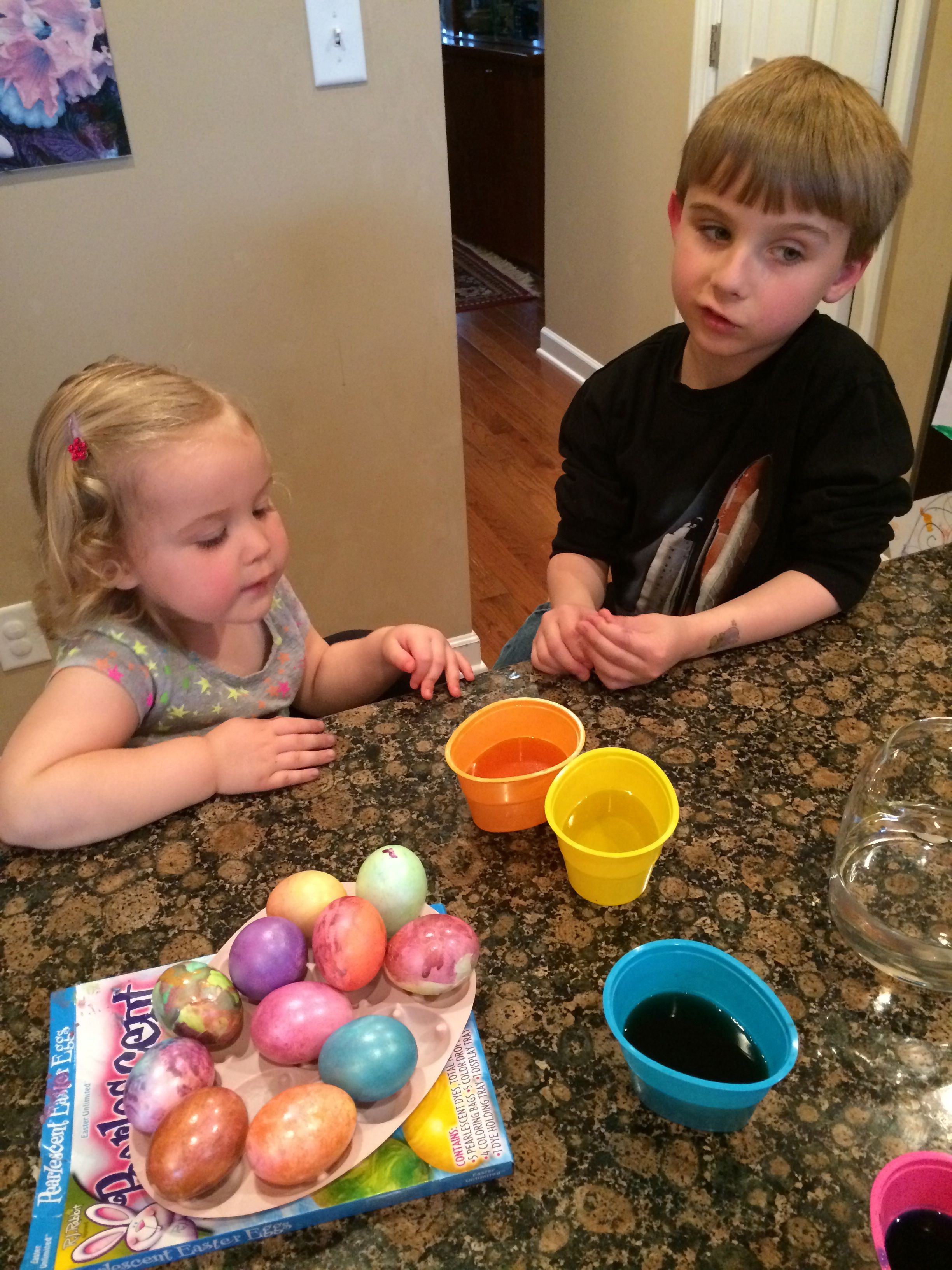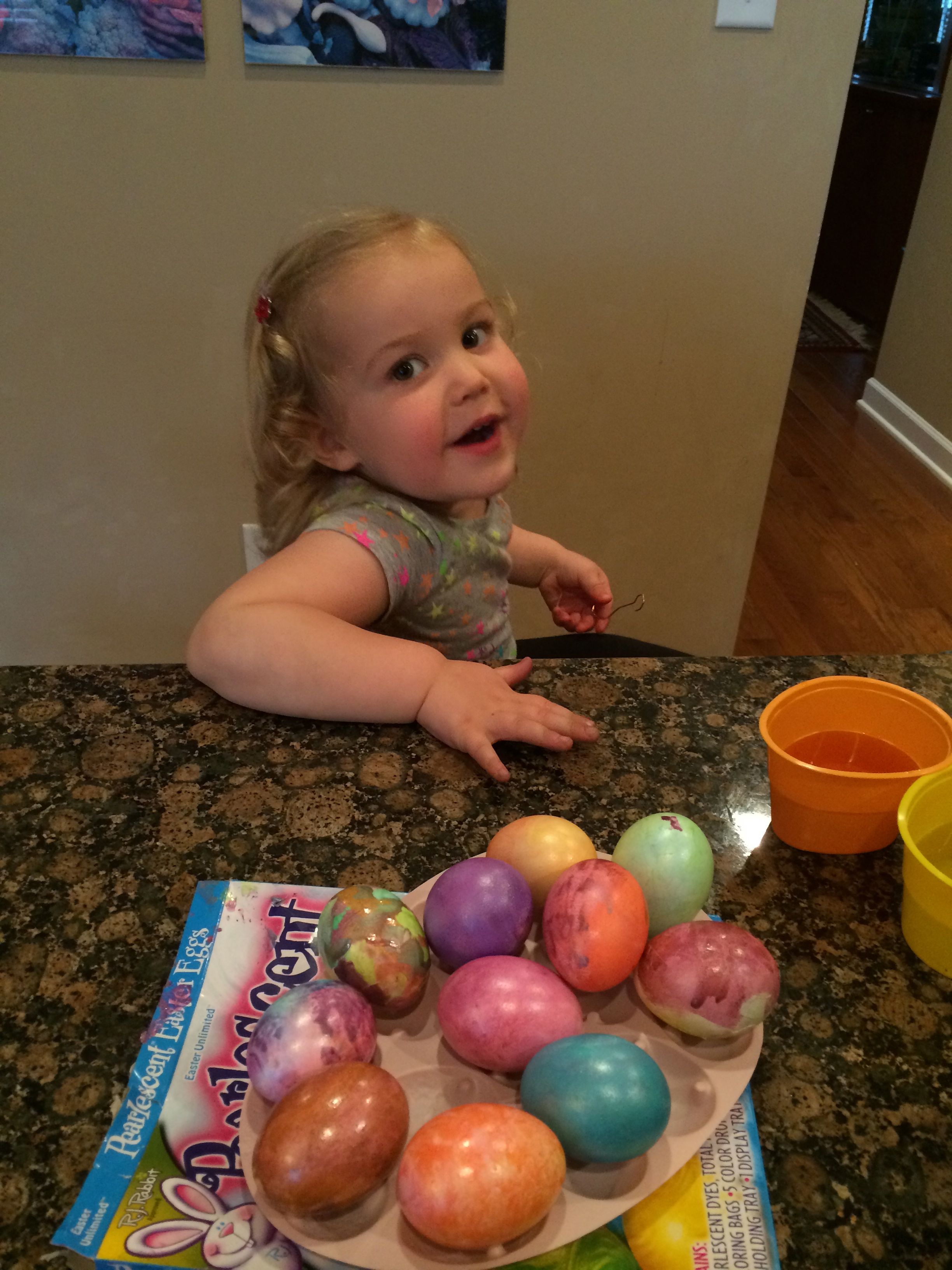 Tomorrow is Easter, so that means today is egg coloring day!  Kendall was able to participate this year, and she really enjoyed it!  We did some traditional coloring, and some iridescent shimmery sort of eggs as well–those were particularly messy (and sort of stinky!) so I don’t think we’ll do those again.  Brian came up with some interesting coloring techniques this year, and Kendall seemed to just enjoy everything about the process.  The kids played with Legos a lot, and made some Easter-themed sticker pictures as well.  Tonight we had a movie night with Brian’s favorite, a party tray, for dinner.  The kids had some strawberry Pocky for dessert–well, mostly Kendall!  She’s a big fan. 😉   For anyone who doesn’t believe that the kids get crazy after some sugar, there’s video evidence of them being completely wild after dinner.  Kendall is pretending to be one of the Hurricanes, skating around and around the ice, and Brian is quoting Gangnam Style and a few lines from Monsters University and The Empire Strikes out.  (Kendall was talking about it a lot more before I turned the camera on, and of course, prompting her to say it again doesn’t usually work.)  😉  Still very active after bath, there’s video of Kendall singing along to a song about the moon in one of the Japanese board books I brought back from Japan years ago.  She doesn’t know she’s singing in Japanese, of course, but it’s certainly cute!  Brandon and I helped out with the Easter Bunny’s work after the kids went to bed–I’m sure they will have an awesome surprise in the morning! 🙂