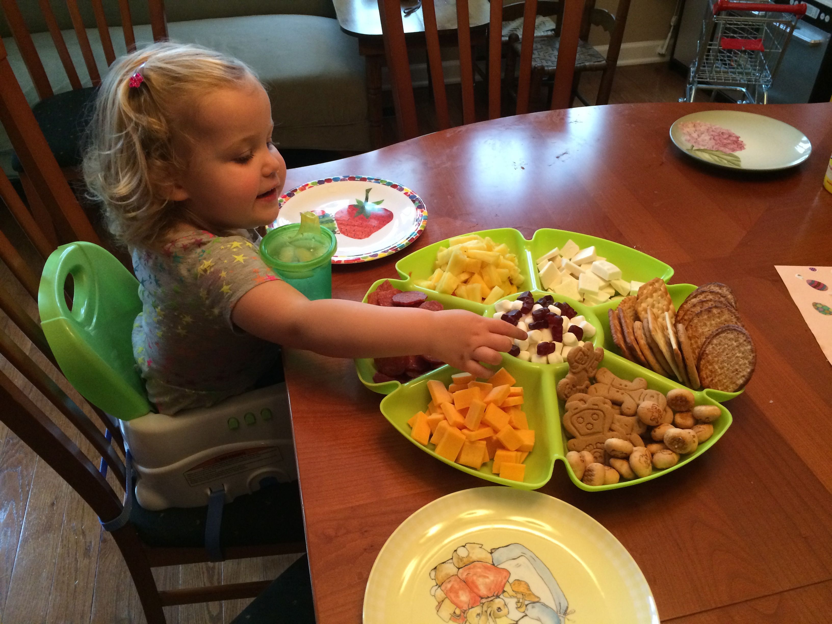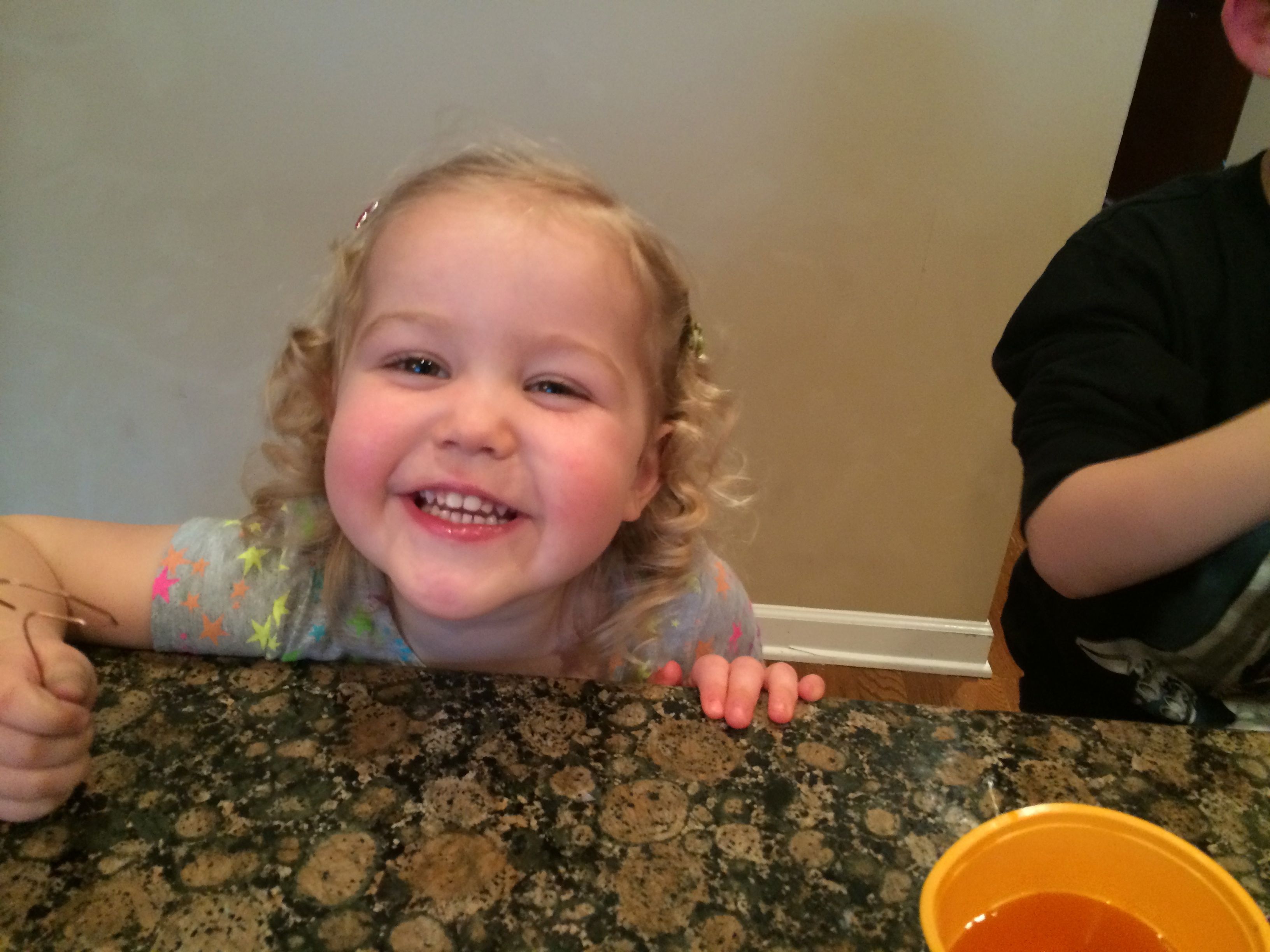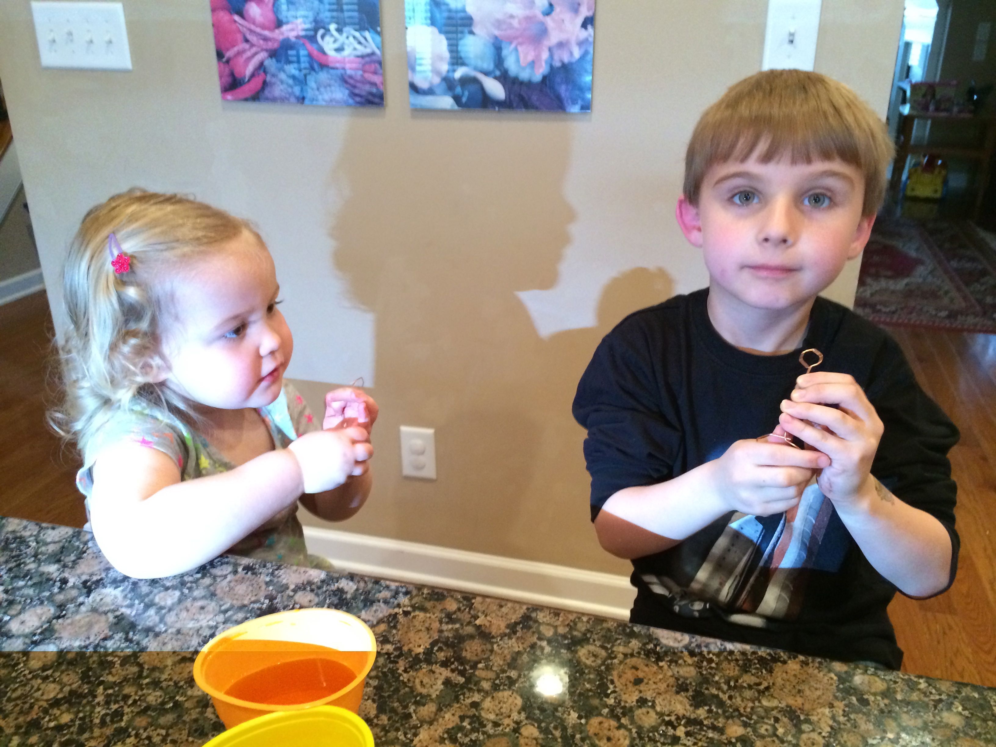 Tomorrow is Easter, so that means today is egg coloring day!  Kendall was able to participate this year, and she really enjoyed it!  We did some traditional coloring, and some iridescent shimmery sort of eggs as well–those were particularly messy (and sort of stinky!) so I don’t think we’ll do those again.  Brian came up with some interesting coloring techniques this year, and Kendall seemed to just enjoy everything about the process.  The kids played with Legos a lot, and made some Easter-themed sticker pictures as well.  Tonight we had a movie night with Brian’s favorite, a party tray, for dinner.  The kids had some strawberry Pocky for dessert–well, mostly Kendall!  She’s a big fan. 😉   For anyone who doesn’t believe that the kids get crazy after some sugar, there’s video evidence of them being completely wild after dinner.  Kendall is pretending to be one of the Hurricanes, skating around and around the ice, and Brian is quoting Gangnam Style and a few lines from Monsters University and The Empire Strikes out.  (Kendall was talking about it a lot more before I turned the camera on, and of course, prompting her to say it again doesn’t usually work.)  😉  Still very active after bath, there’s video of Kendall singing along to a song about the moon in one of the Japanese board books I brought back from Japan years ago.  She doesn’t know she’s singing in Japanese, of course, but it’s certainly cute!  Brandon and I helped out with the Easter Bunny’s work after the kids went to bed–I’m sure they will have an awesome surprise in the morning! 🙂