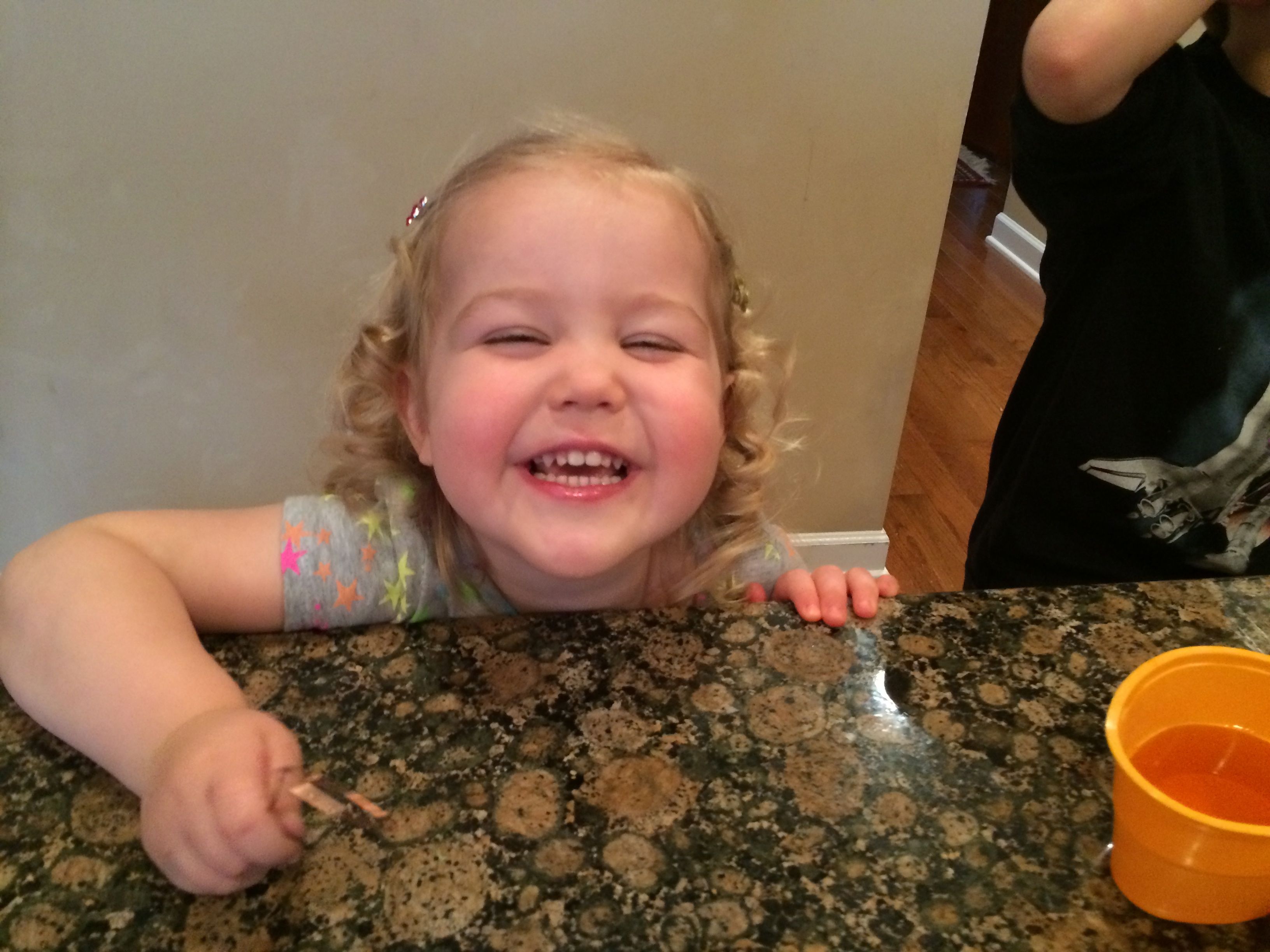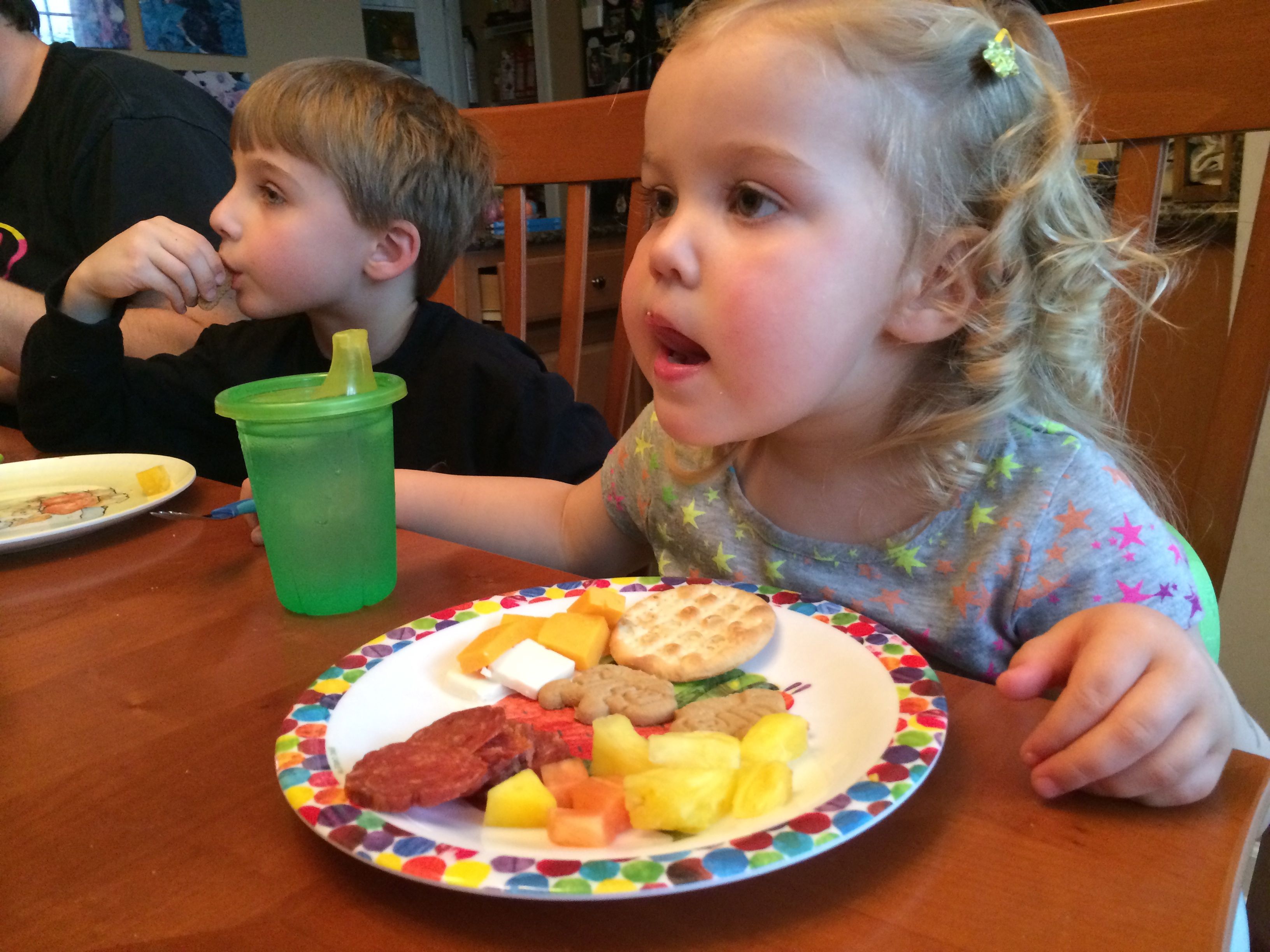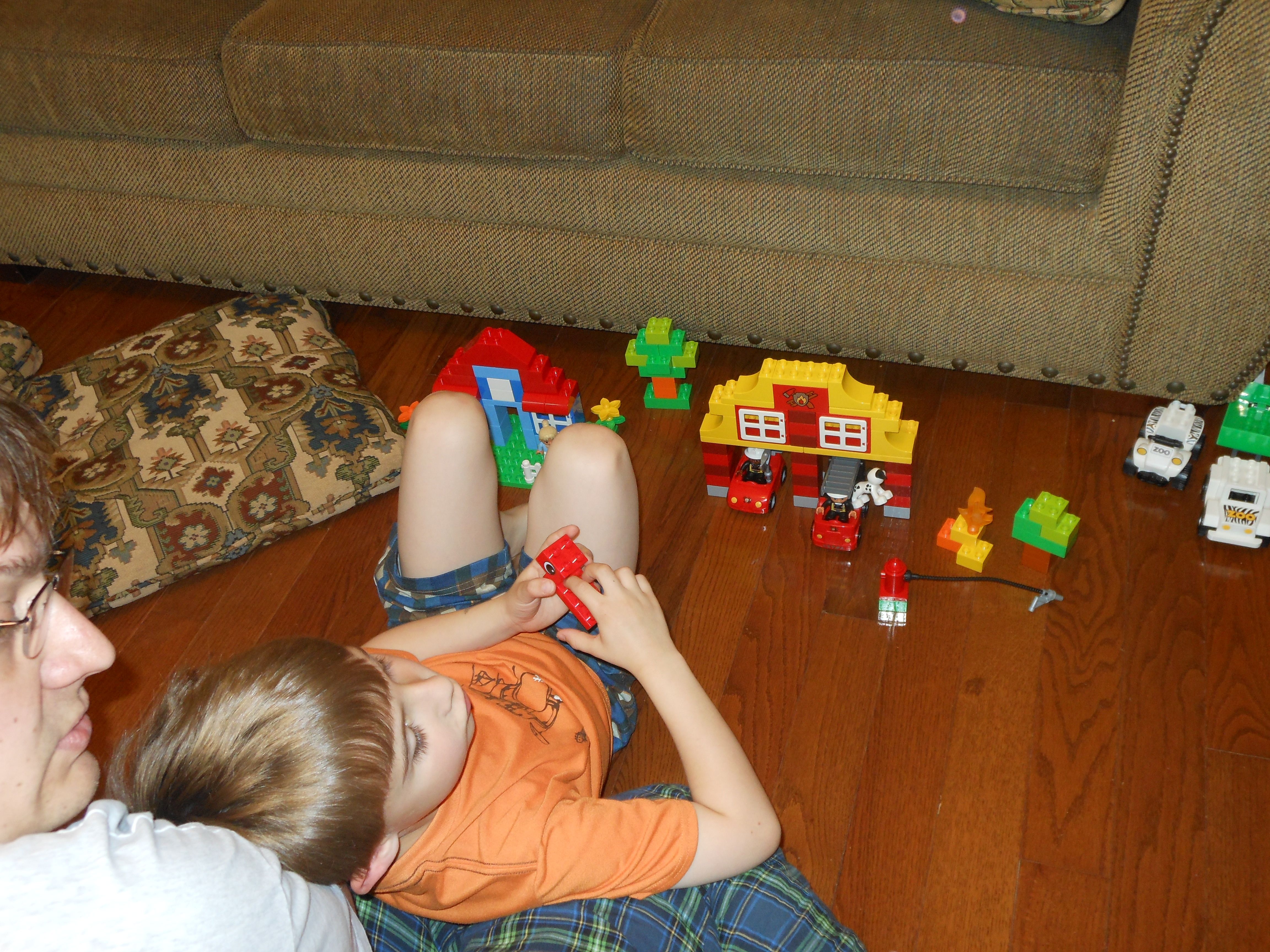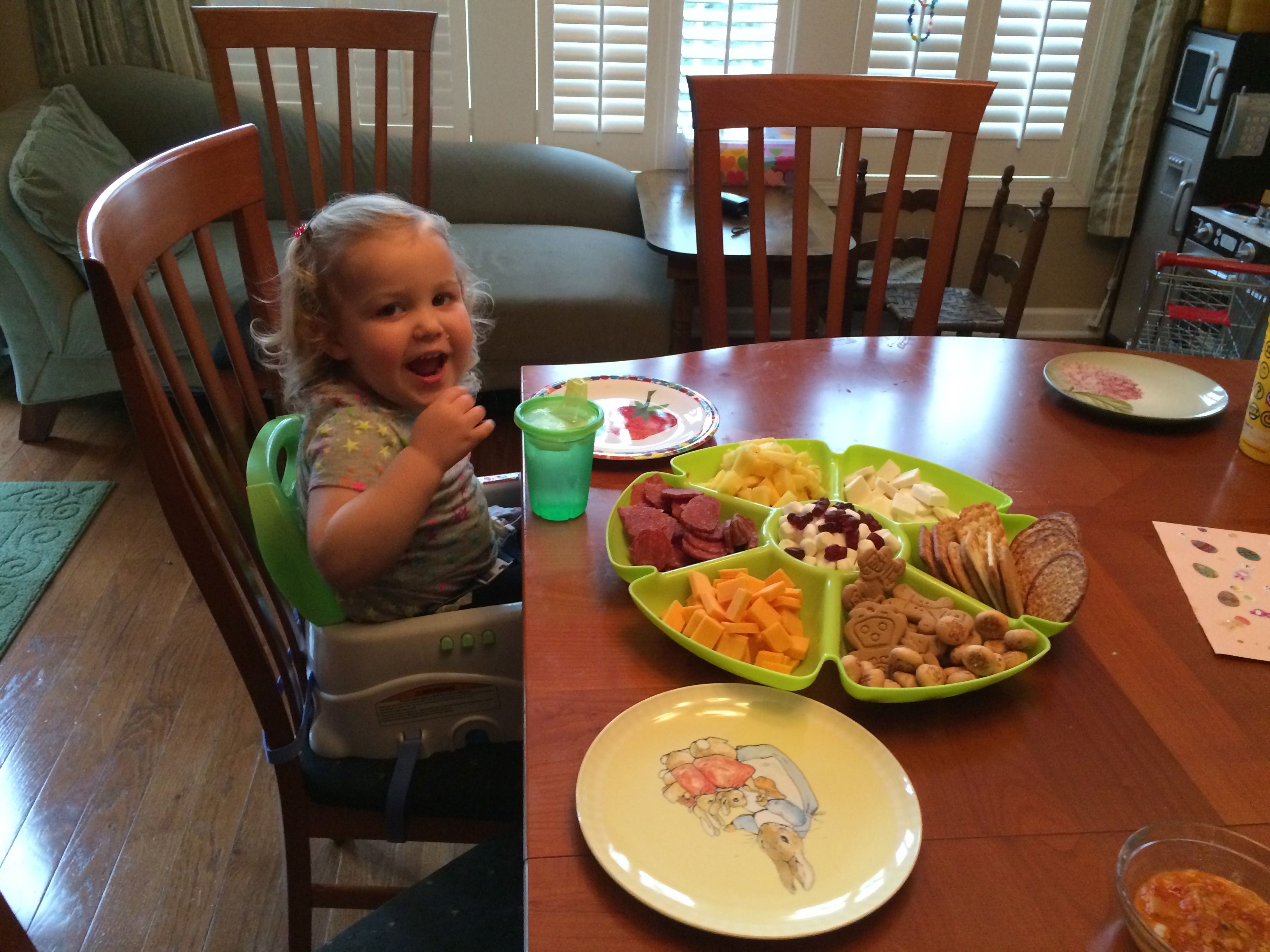 Tomorrow is Easter, so that means today is egg coloring day!  Kendall was able to participate this year, and she really enjoyed it!  We did some traditional coloring, and some iridescent shimmery sort of eggs as well–those were particularly messy (and sort of stinky!) so I don’t think we’ll do those again.  Brian came up with some interesting coloring techniques this year, and Kendall seemed to just enjoy everything about the process.  The kids played with Legos a lot, and made some Easter-themed sticker pictures as well.  Tonight we had a movie night with Brian’s favorite, a party tray, for dinner.  The kids had some strawberry Pocky for dessert–well, mostly Kendall!  She’s a big fan. 😉   For anyone who doesn’t believe that the kids get crazy after some sugar, there’s video evidence of them being completely wild after dinner.  Kendall is pretending to be one of the Hurricanes, skating around and around the ice, and Brian is quoting Gangnam Style and a few lines from Monsters University and The Empire Strikes out.  (Kendall was talking about it a lot more before I turned the camera on, and of course, prompting her to say it again doesn’t usually work.)  😉  Still very active after bath, there’s video of Kendall singing along to a song about the moon in one of the Japanese board books I brought back from Japan years ago.  She doesn’t know she’s singing in Japanese, of course, but it’s certainly cute!  Brandon and I helped out with the Easter Bunny’s work after the kids went to bed–I’m sure they will have an awesome surprise in the morning! 🙂