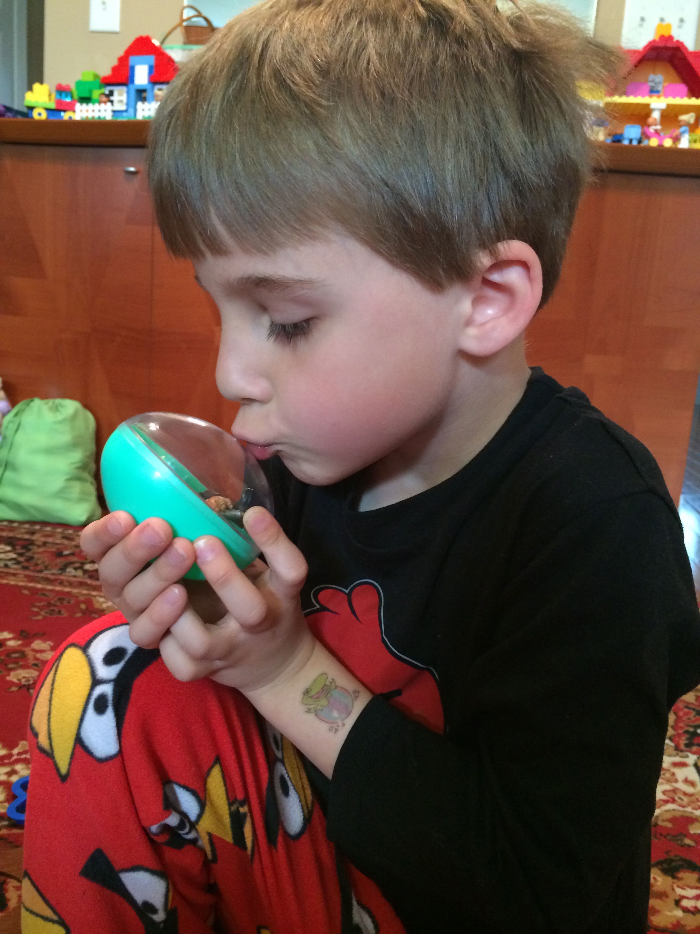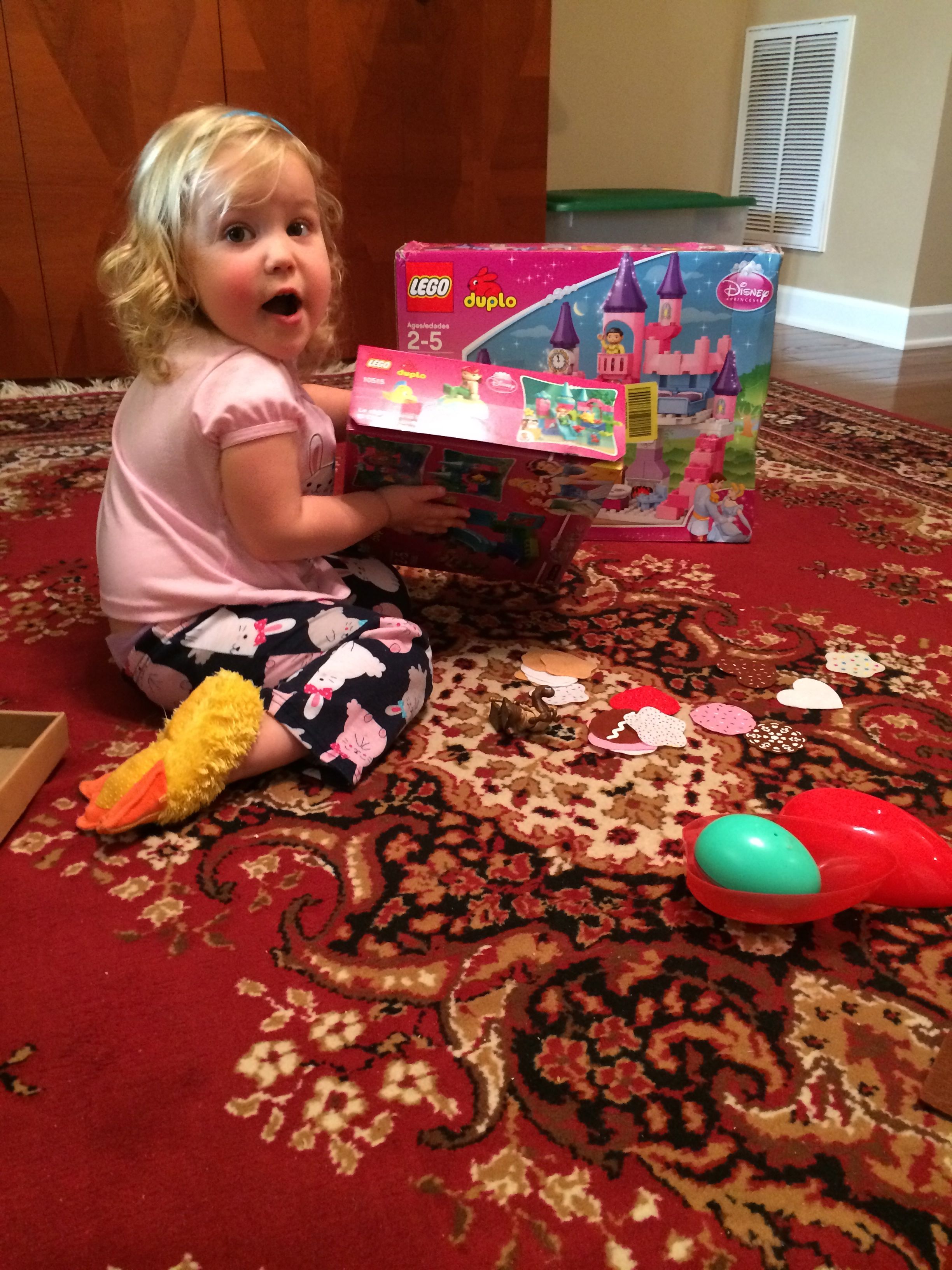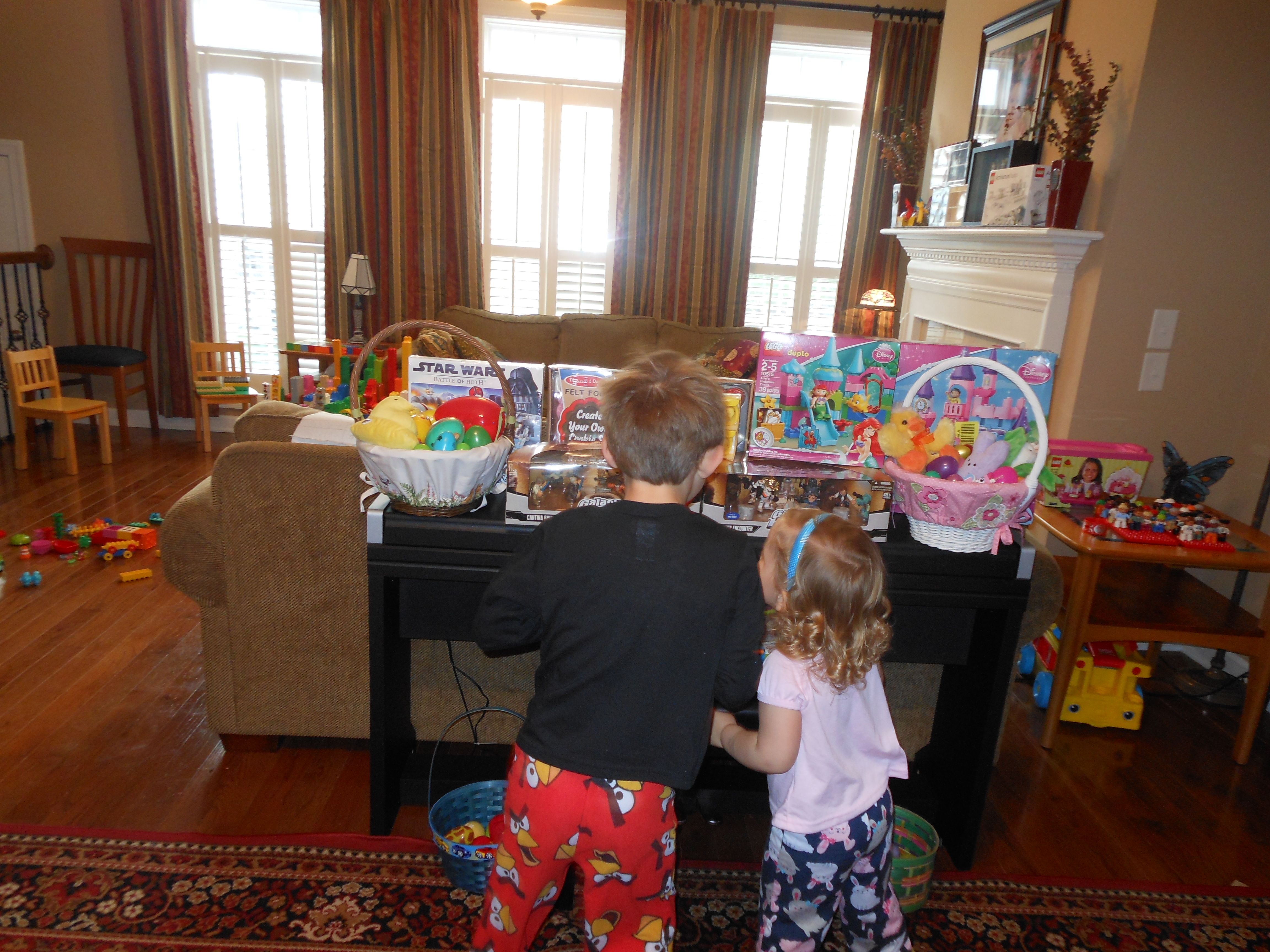 Happy Easter! We sure had an awesome one. We started off the day with the kids getting their Easter baskets and presents, and they were so surprised! We had collected a number of really cool presents for them, including a Lego Star Wars Battle of Hoth game that wasn’t even release in the US. Brian liked his Lego City game so much, and since Empire is one of his favorite Star Wars movies, I knew he just had to have it. Kendall got the Duplo Cinderella Castle that she liked so much back at Lego Kids Fest, and a Little Mermaid set as well. She was pretty excited about those! We had to get into the Little Mermaid one right away. Brian got some Galactic Heroes playsets with some of his favorite Star Wars characters, including the Cantina Band. Of course they didn’t include all five members in the boxed set, but I wasn’t deterred by that–I tracked down the last member and had him in an Easter egg there in Brian’s basket. We made a Butter Braid for breakfast, and let the kids play with their new toys until it was lunchtime. We had to wrap it up temporarily, since we were going to meet Grandpa Steve and Grandma Sue at Wakefield for Easter Brunch. Wow, that was a very special affair! We had an amazing buffet lunch, and I’m surprised they didn’t have to roll Brandon and myself out of there, we had so much awesome food. The kids enjoyed all the variety, especially all of the fruit, breakfast items, and treats, and they both ate very well. They got to meet the Easter Bunny and get a few more Easter Eggs. All in all, an excellent time was had by all. After our brunch we planned to meet Steve and Sue back at their place, but on the way, the kids just begged and begged to visit their neighborhood playground. We couldn’t resist, and we let them play for a little while! They had a great time with the swings, slides, play structure, and Brian just owned the monkey bars! I was so proud of him when he made it all the way across for the first time ever! Soon, we were off to Grandpa and Grandma’s house, and we had a nice visit, and the kids got even more presents! They really racked up this year! Of course that’s not the point, but it’s just so much fun to spoil them, isn’t it? 😉