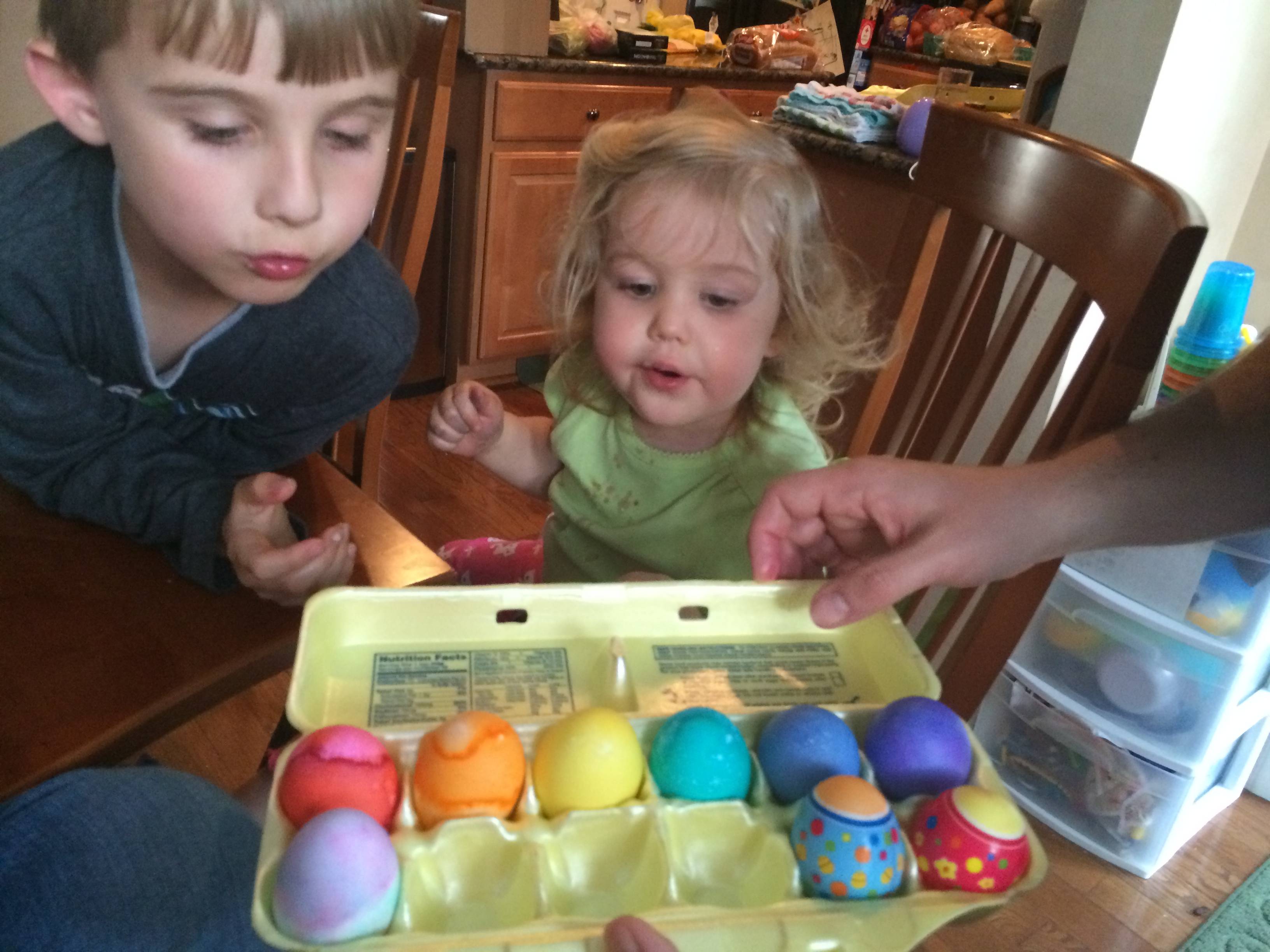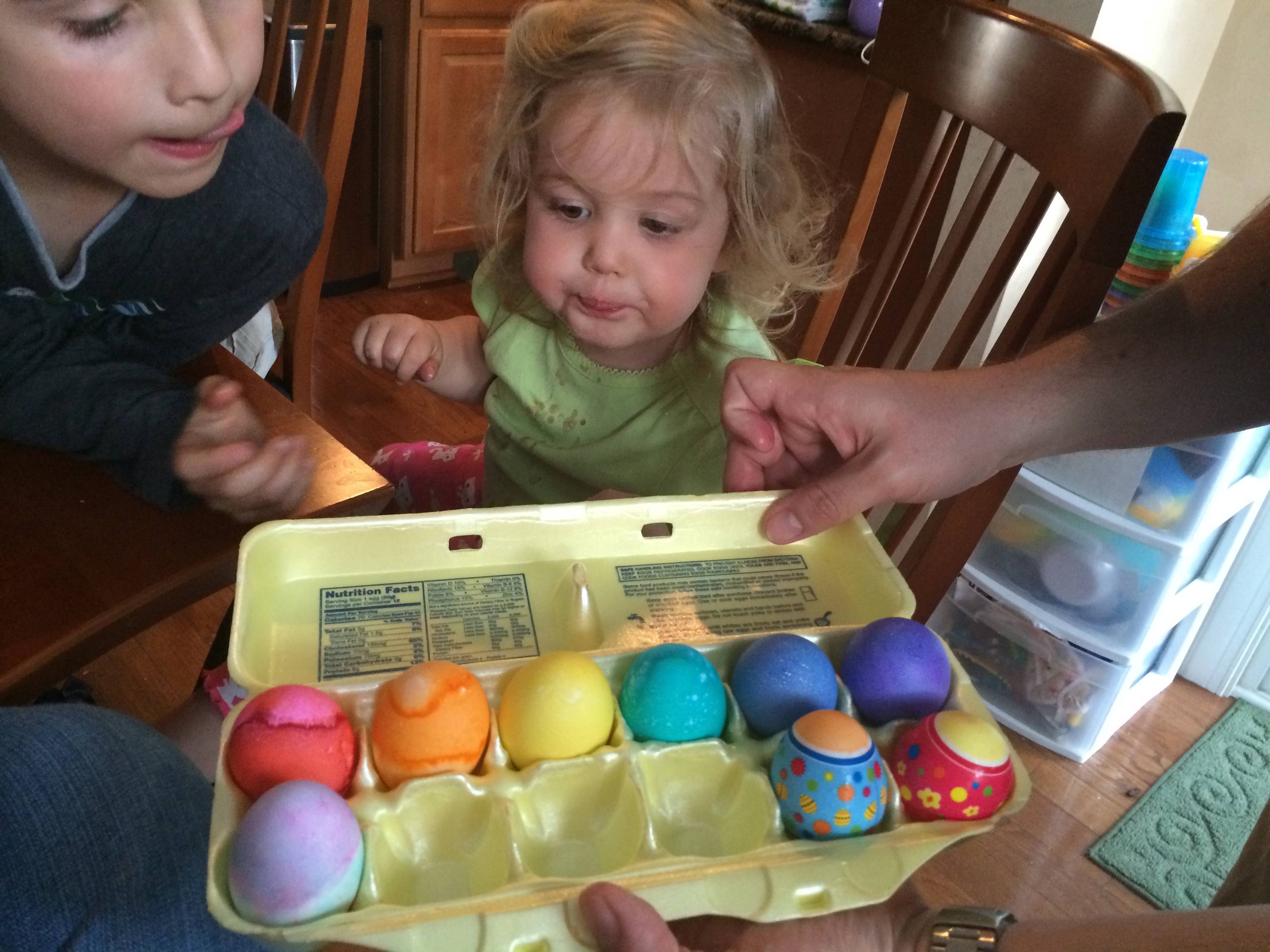 Time to say goodbye to the colored eggs!  Easter Monday means it’s egg salad time at our house. 😉  I only make it once a year, and my recipe features quite a bit of crumbled bacon, so it’s a rare treat around here.  The kids helped me shell the eggs and mix things up this year, so even though they were a little sad at first to let them go, they had fun creating the egg salad.  (No pictures of the result, unfortunately, once my hands got dirty, the phone stayed in my pocket!)