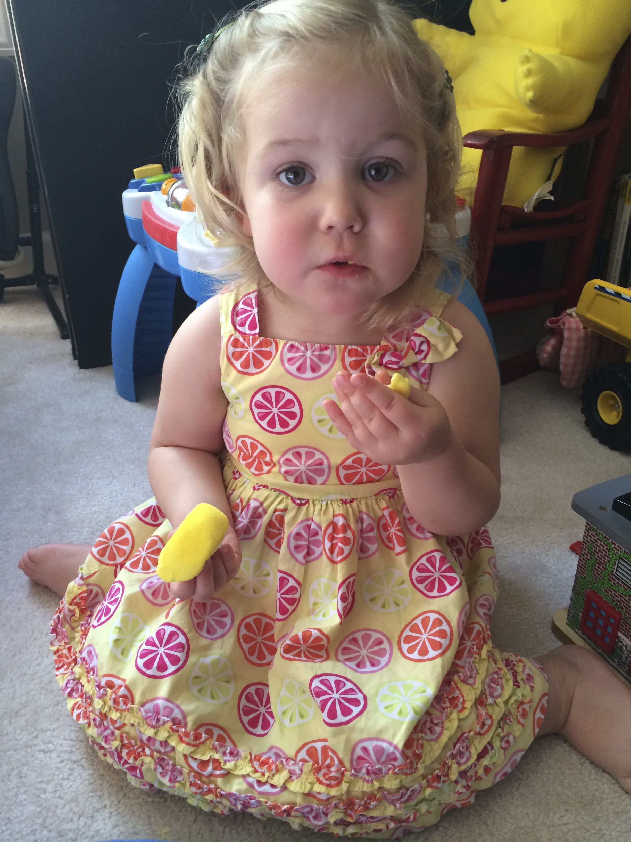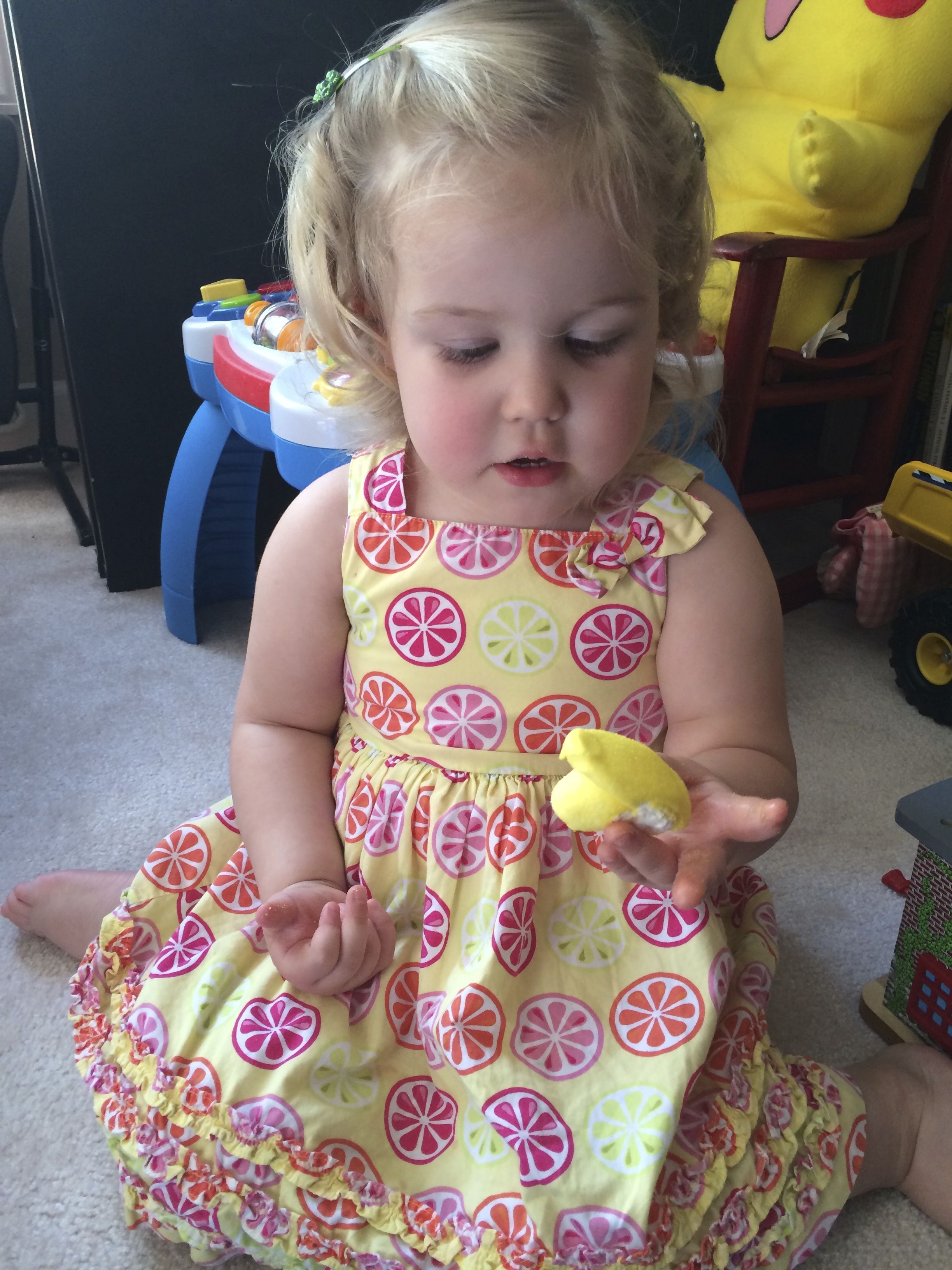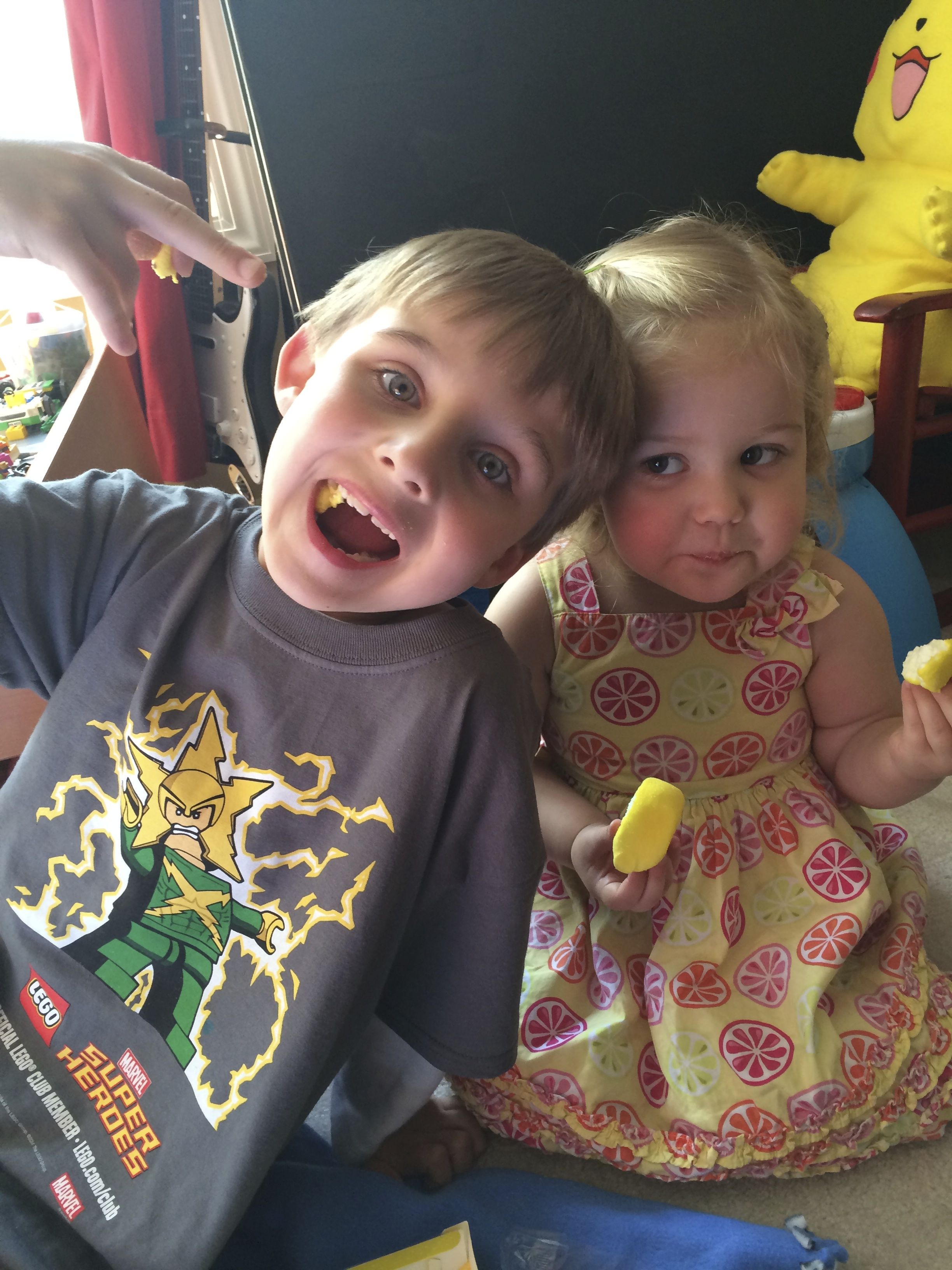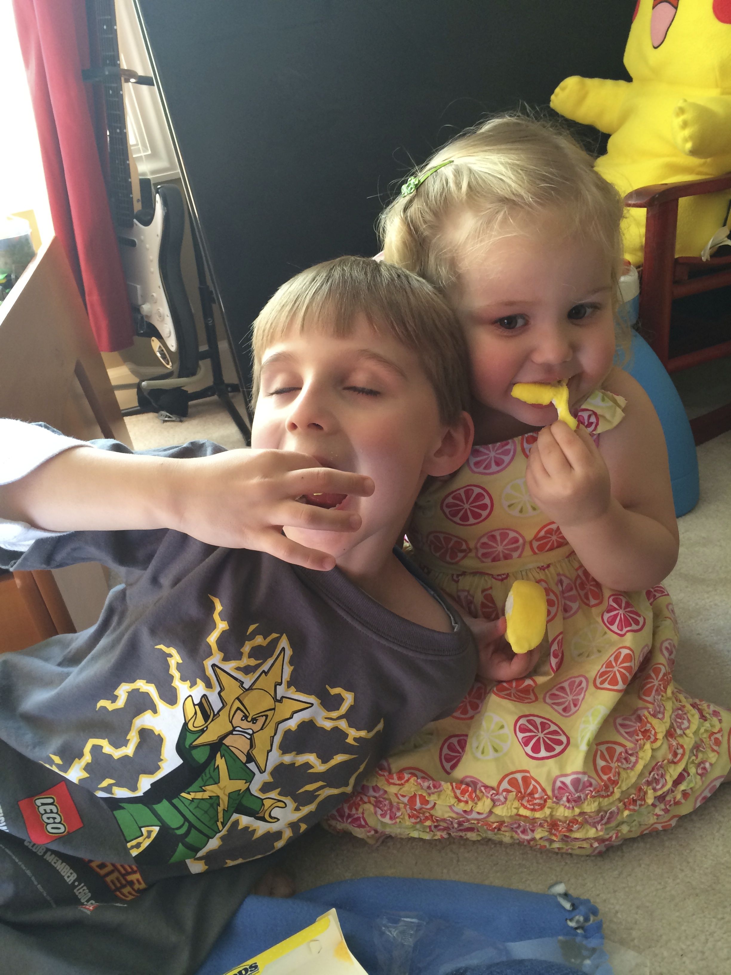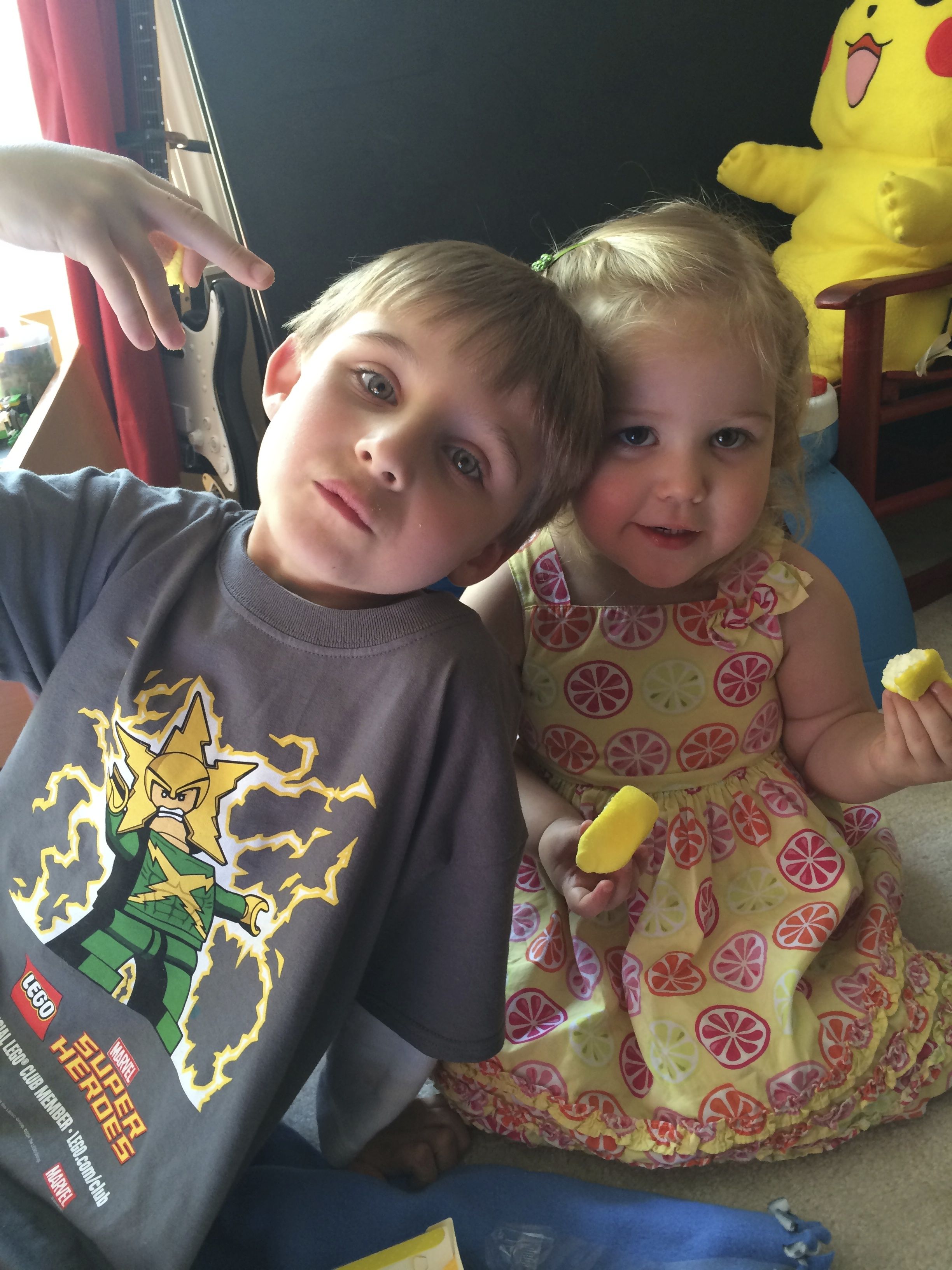 We started off our Saturday with a Lego Club meeting where the theme was Spider-Man. We aren’t all that up-to-date on the happenings in the Marvel universe, and we’d never even heard of Electro, the villian featured on this week’s t-shirt. But, no matter–building is fun no matter what, and Brian was happy enough to get an Electro minifigure, his lightning bolts look a lot like force lightning, so Brian was cool with it. 🙂 He wanted to make minifigures, as always, but I got him to accept me just taking pictures of his funny knights. They are pretty funny! After Lego Club, it was time to go to the Goddard Open House. We hardly miss any Goddard events, but it’s because the kids really enjoy going to them (and we appreciate the free food!) The kids loved the new giant foam building set (they’d played with a similar set at the Life+Science museum in Durham!) Kendall loved playing on the big-kid playground, especially the slide, and delivering me a play-letter. She’ll be moving onto this playground really soon, and I know she’ll be glad! We played inside after we ate and it started getting really hot. Kendall liked the baby dolls in the preschool room, and their new table-style smart board. Brian enjoyed making circle paintings with some repurposed bottles, and driving the truck the preschoolers had made from recycled materials. It was tough to get the kids out of there, we have this tendency to always be the last to leave..! But we bribed them with a promise to visit Fresh for ice cream. It was a great day for it, and we enjoyed our treats outdoors! Back at home, we played Legos downstairs, and after Kendall’s nap, I let the kids have their yellow Peeps candy. 🙂