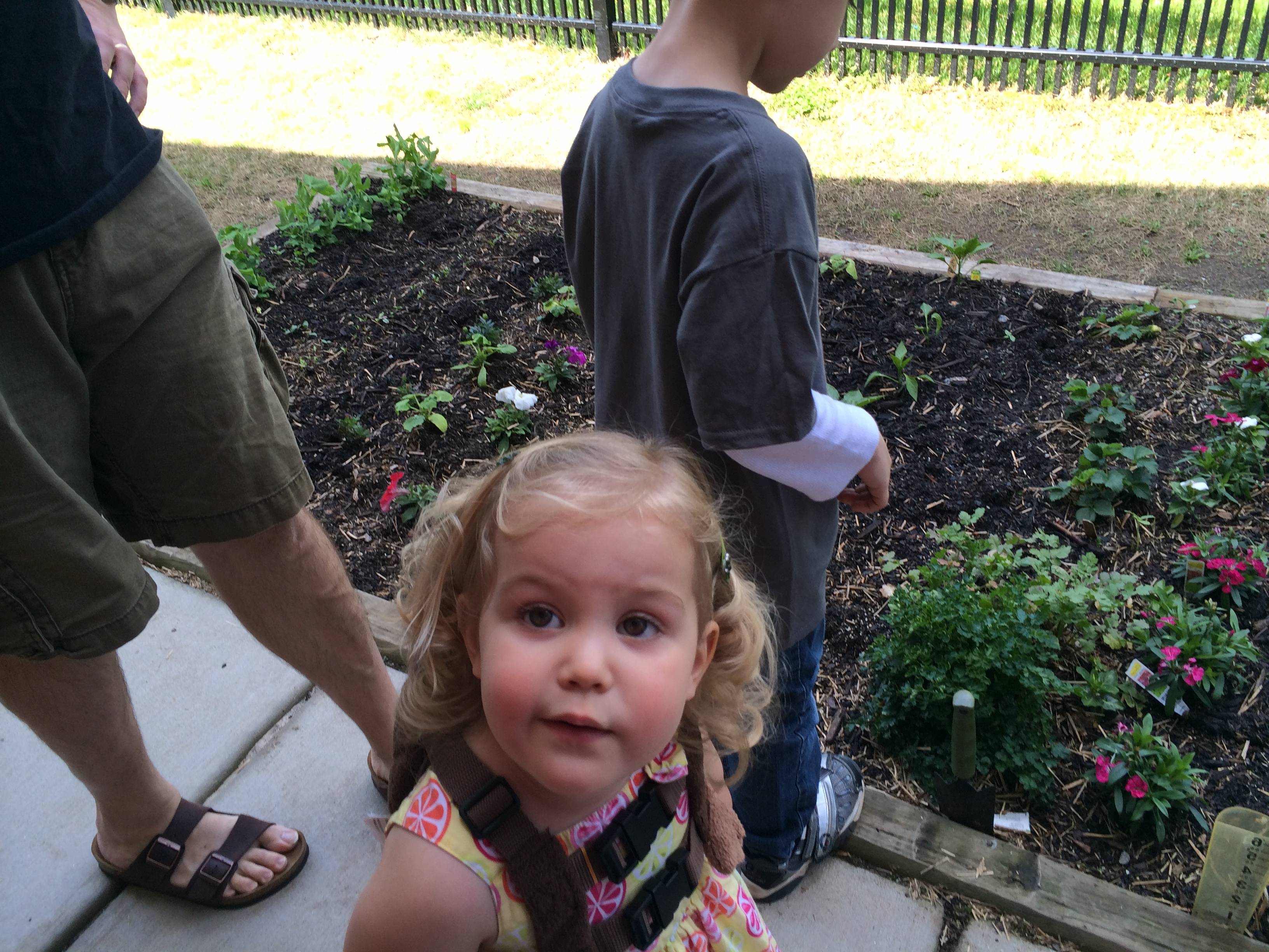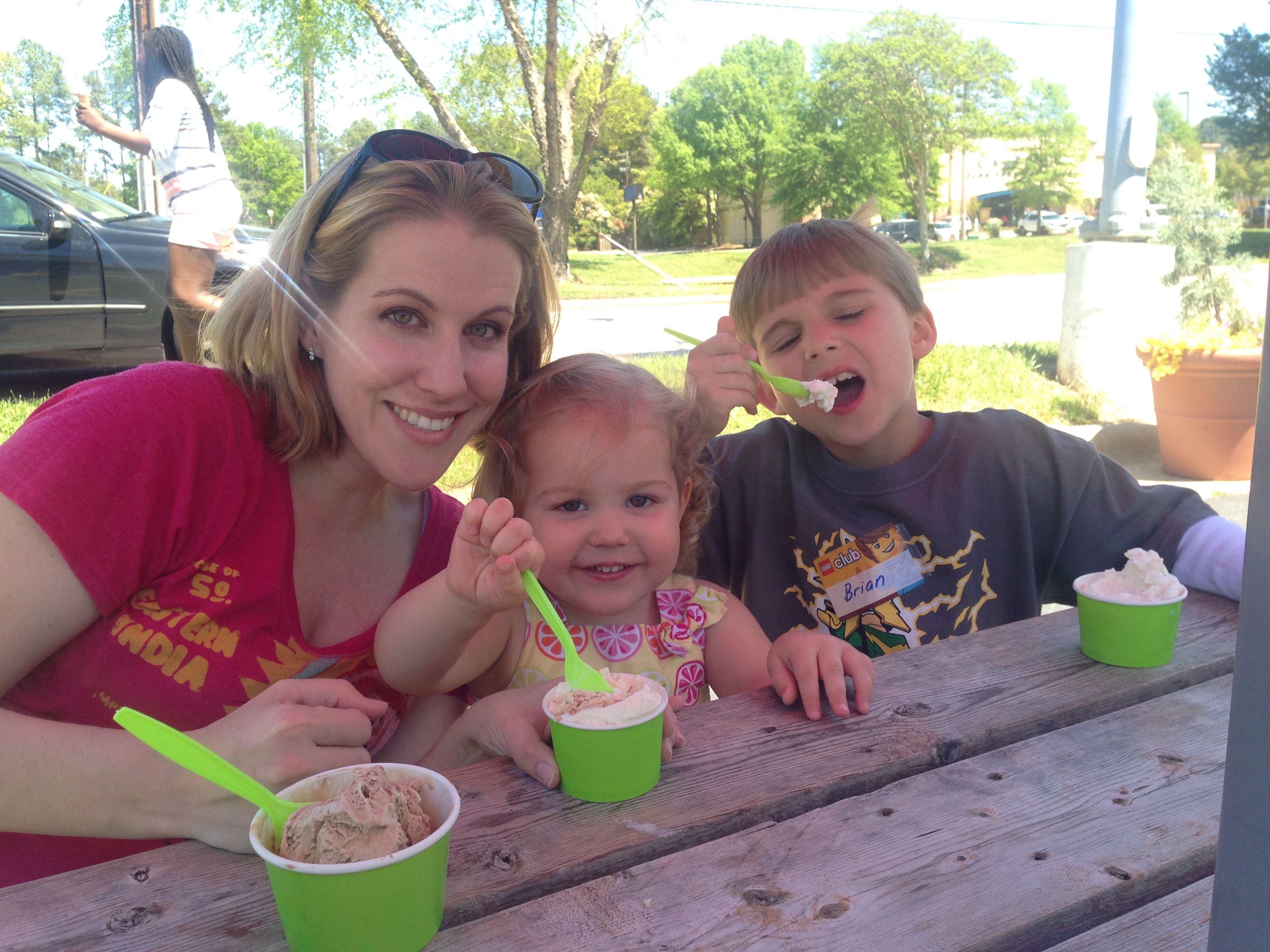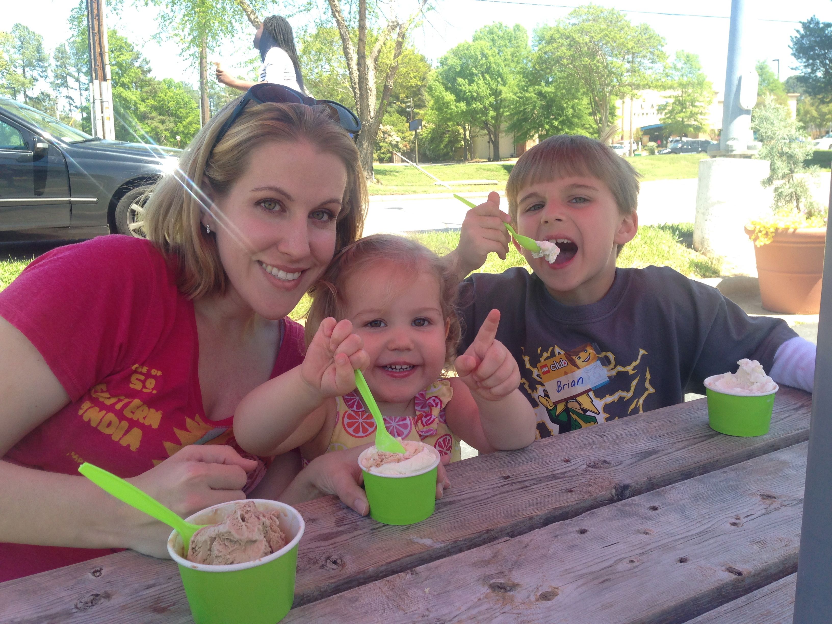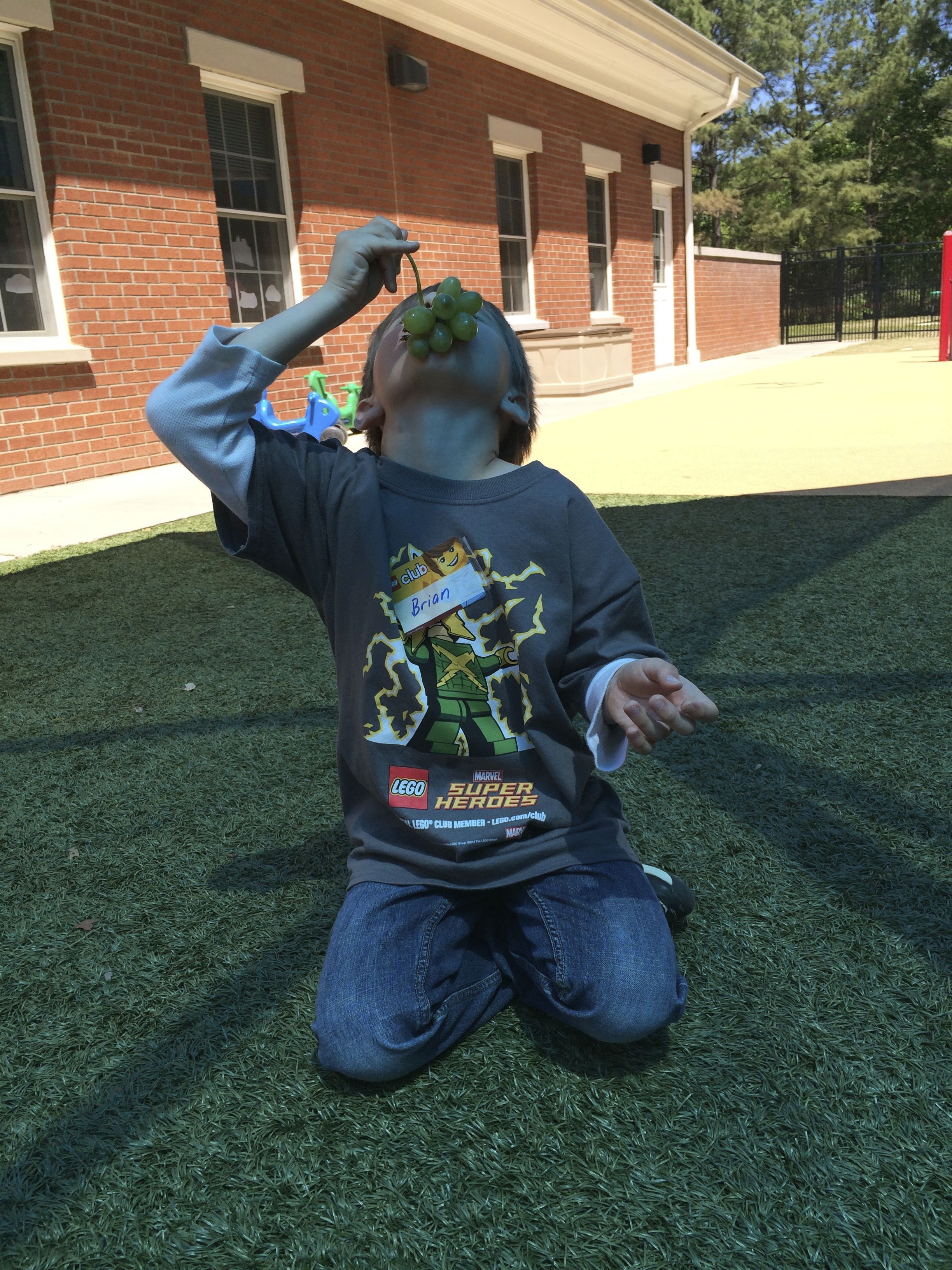 We started off our Saturday with a Lego Club meeting where the theme was Spider-Man. We aren’t all that up-to-date on the happenings in the Marvel universe, and we’d never even heard of Electro, the villian featured on this week’s t-shirt. But, no matter–building is fun no matter what, and Brian was happy enough to get an Electro minifigure, his lightning bolts look a lot like force lightning, so Brian was cool with it. 🙂 He wanted to make minifigures, as always, but I got him to accept me just taking pictures of his funny knights. They are pretty funny! After Lego Club, it was time to go to the Goddard Open House. We hardly miss any Goddard events, but it’s because the kids really enjoy going to them (and we appreciate the free food!) The kids loved the new giant foam building set (they’d played with a similar set at the Life+Science museum in Durham!) Kendall loved playing on the big-kid playground, especially the slide, and delivering me a play-letter. She’ll be moving onto this playground really soon, and I know she’ll be glad! We played inside after we ate and it started getting really hot. Kendall liked the baby dolls in the preschool room, and their new table-style smart board. Brian enjoyed making circle paintings with some repurposed bottles, and driving the truck the preschoolers had made from recycled materials. It was tough to get the kids out of there, we have this tendency to always be the last to leave..! But we bribed them with a promise to visit Fresh for ice cream. It was a great day for it, and we enjoyed our treats outdoors! Back at home, we played Legos downstairs, and after Kendall’s nap, I let the kids have their yellow Peeps candy. 🙂