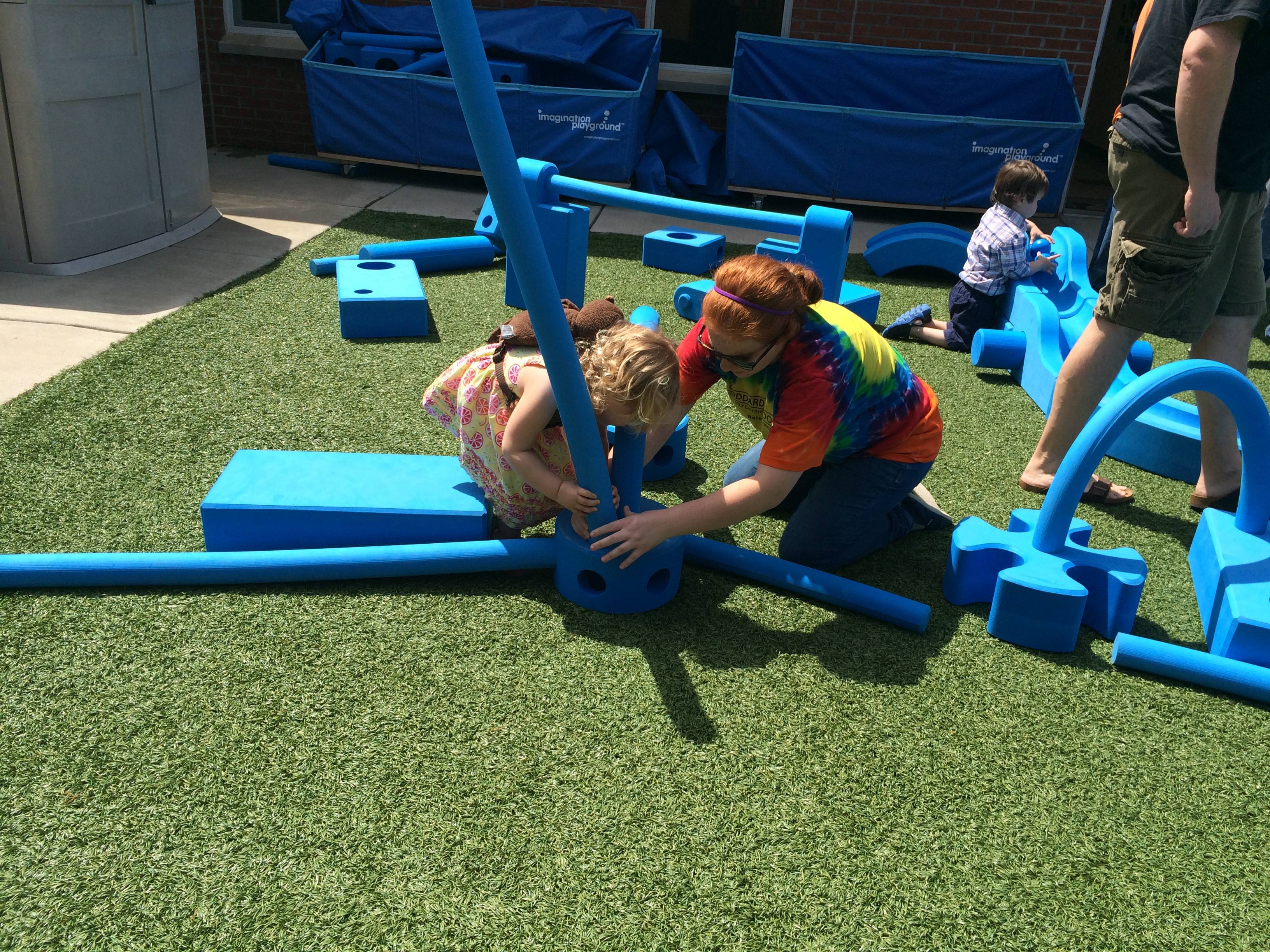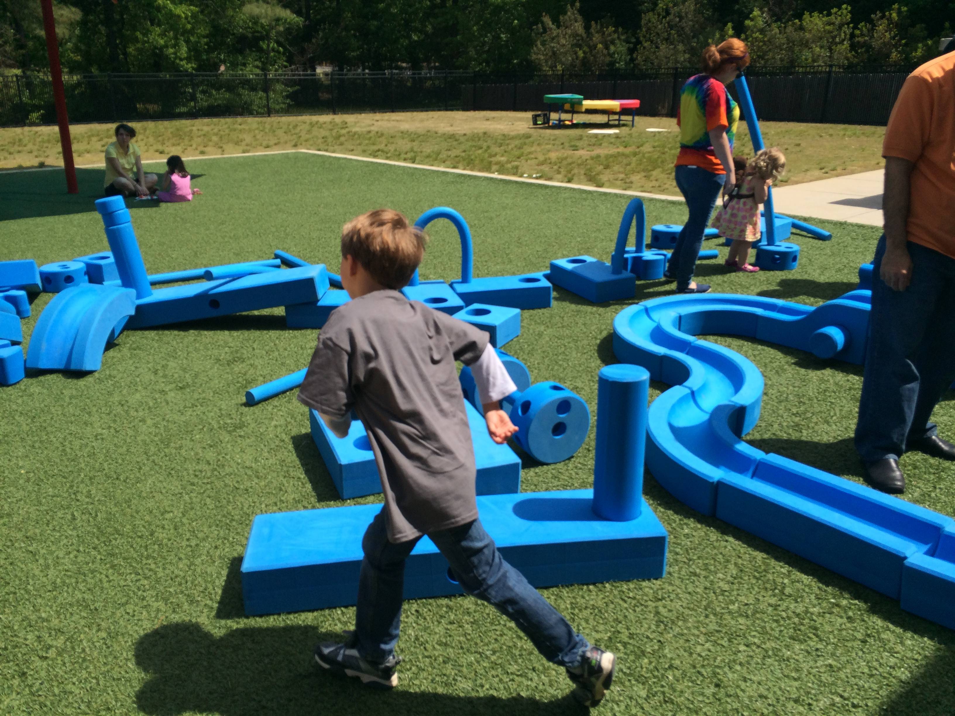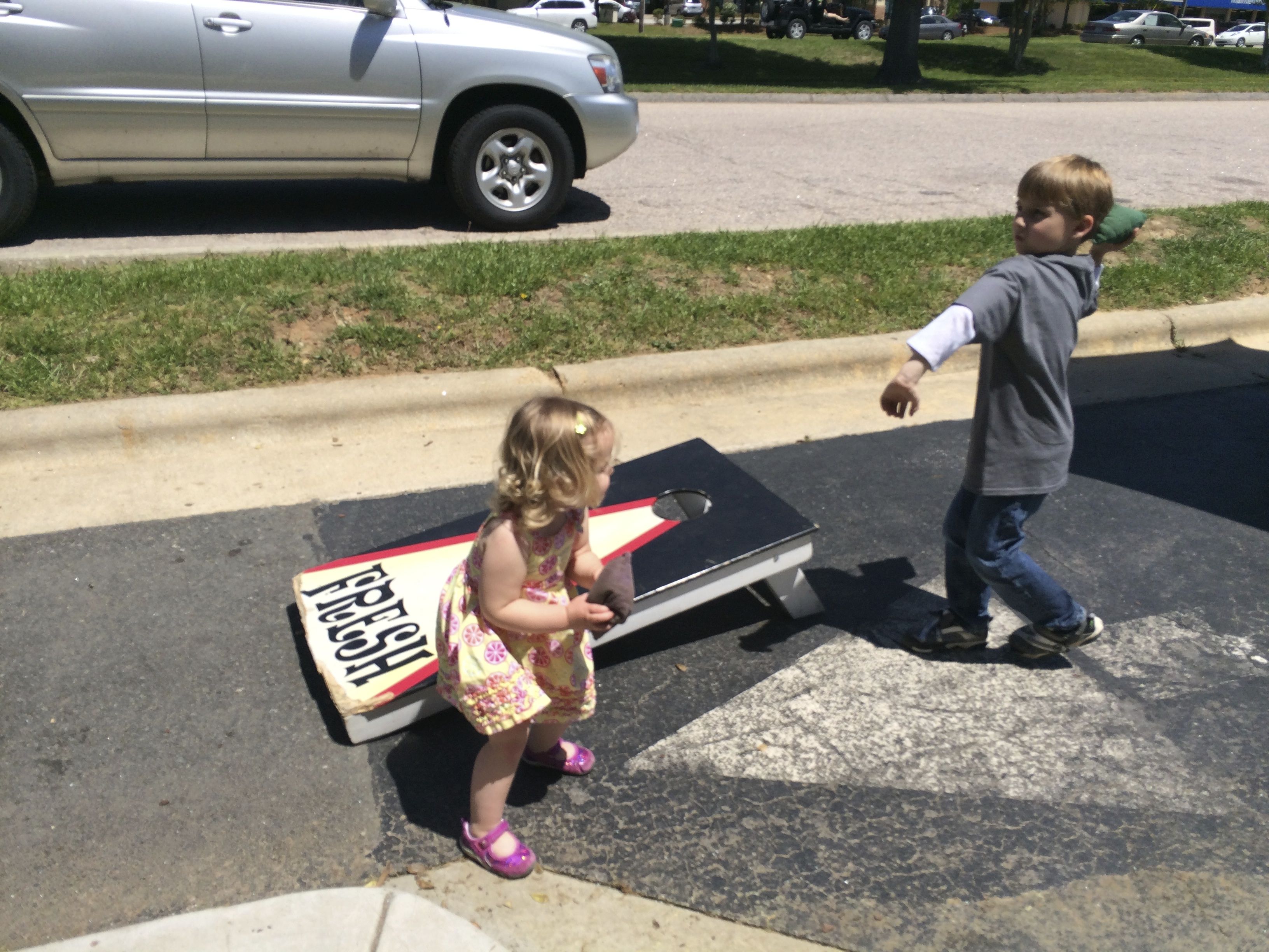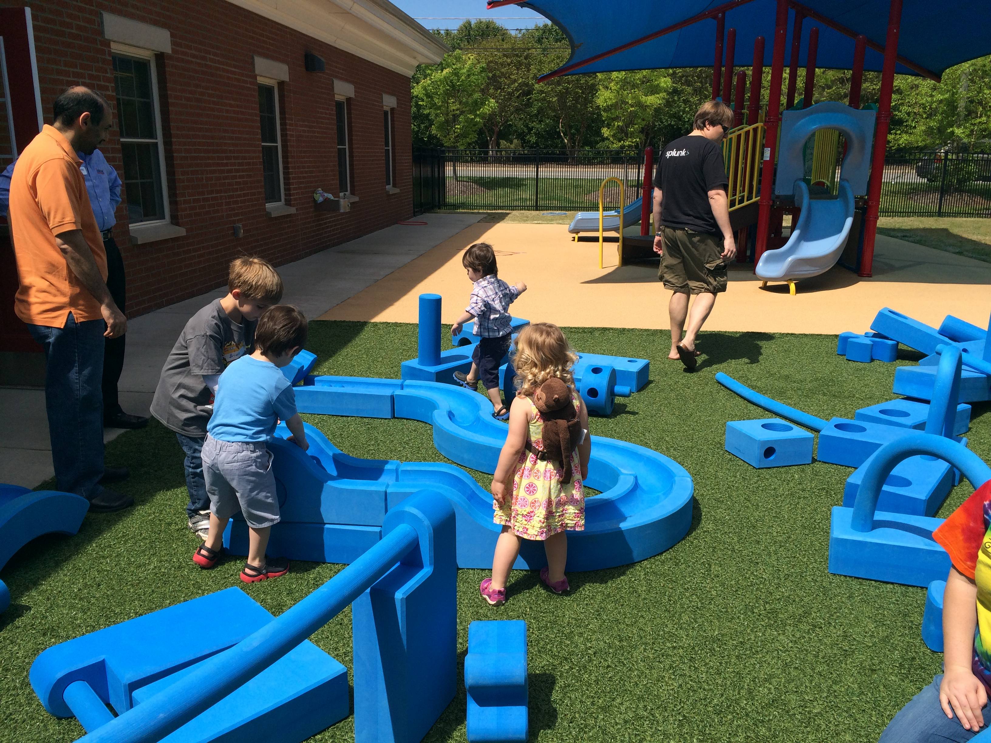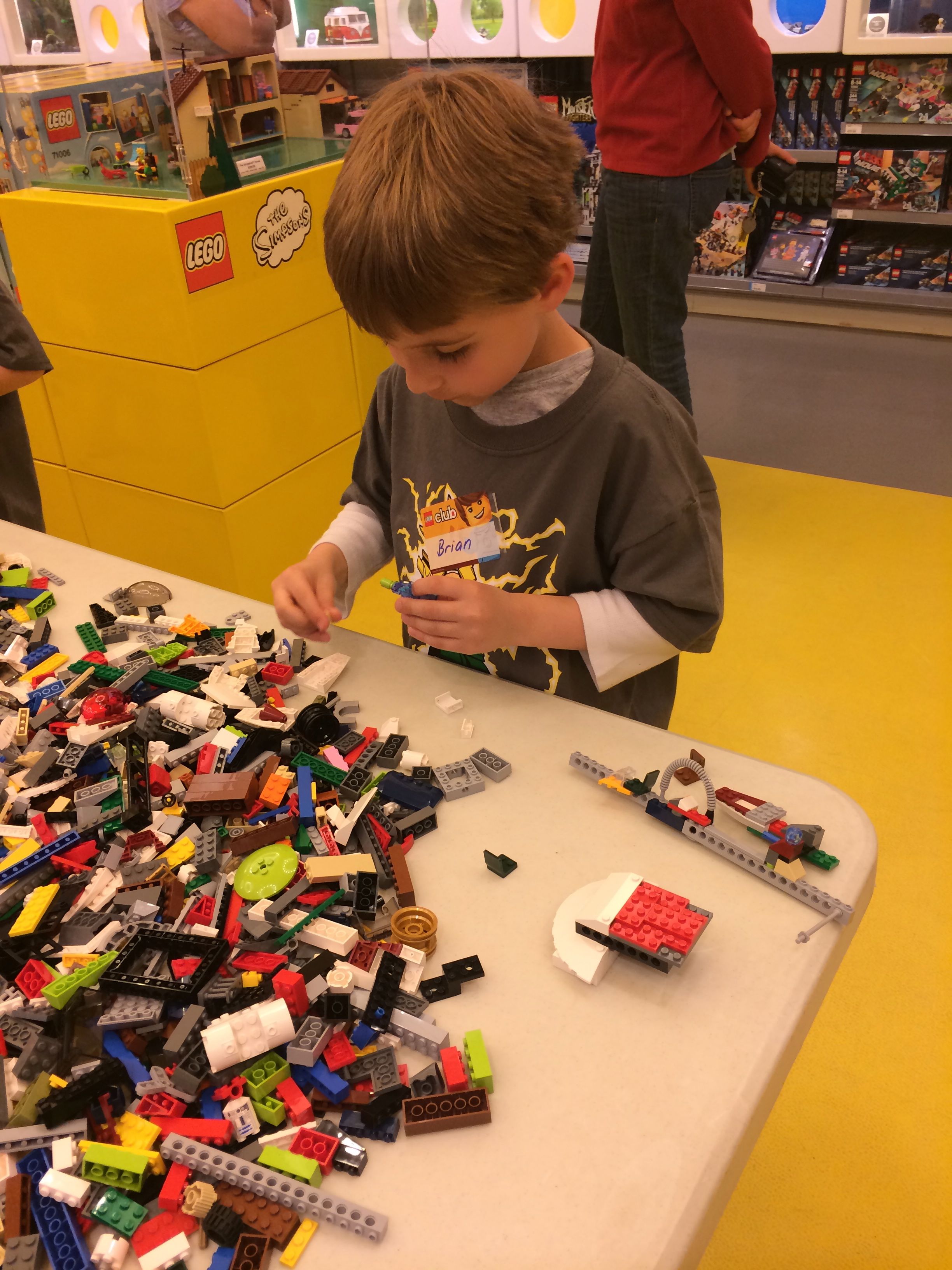 We started off our Saturday with a Lego Club meeting where the theme was Spider-Man. We aren’t all that up-to-date on the happenings in the Marvel universe, and we’d never even heard of Electro, the villian featured on this week’s t-shirt. But, no matter–building is fun no matter what, and Brian was happy enough to get an Electro minifigure, his lightning bolts look a lot like force lightning, so Brian was cool with it. 🙂 He wanted to make minifigures, as always, but I got him to accept me just taking pictures of his funny knights. They are pretty funny! After Lego Club, it was time to go to the Goddard Open House. We hardly miss any Goddard events, but it’s because the kids really enjoy going to them (and we appreciate the free food!) The kids loved the new giant foam building set (they’d played with a similar set at the Life+Science museum in Durham!) Kendall loved playing on the big-kid playground, especially the slide, and delivering me a play-letter. She’ll be moving onto this playground really soon, and I know she’ll be glad! We played inside after we ate and it started getting really hot. Kendall liked the baby dolls in the preschool room, and their new table-style smart board. Brian enjoyed making circle paintings with some repurposed bottles, and driving the truck the preschoolers had made from recycled materials. It was tough to get the kids out of there, we have this tendency to always be the last to leave..! But we bribed them with a promise to visit Fresh for ice cream. It was a great day for it, and we enjoyed our treats outdoors! Back at home, we played Legos downstairs, and after Kendall’s nap, I let the kids have their yellow Peeps candy. 🙂