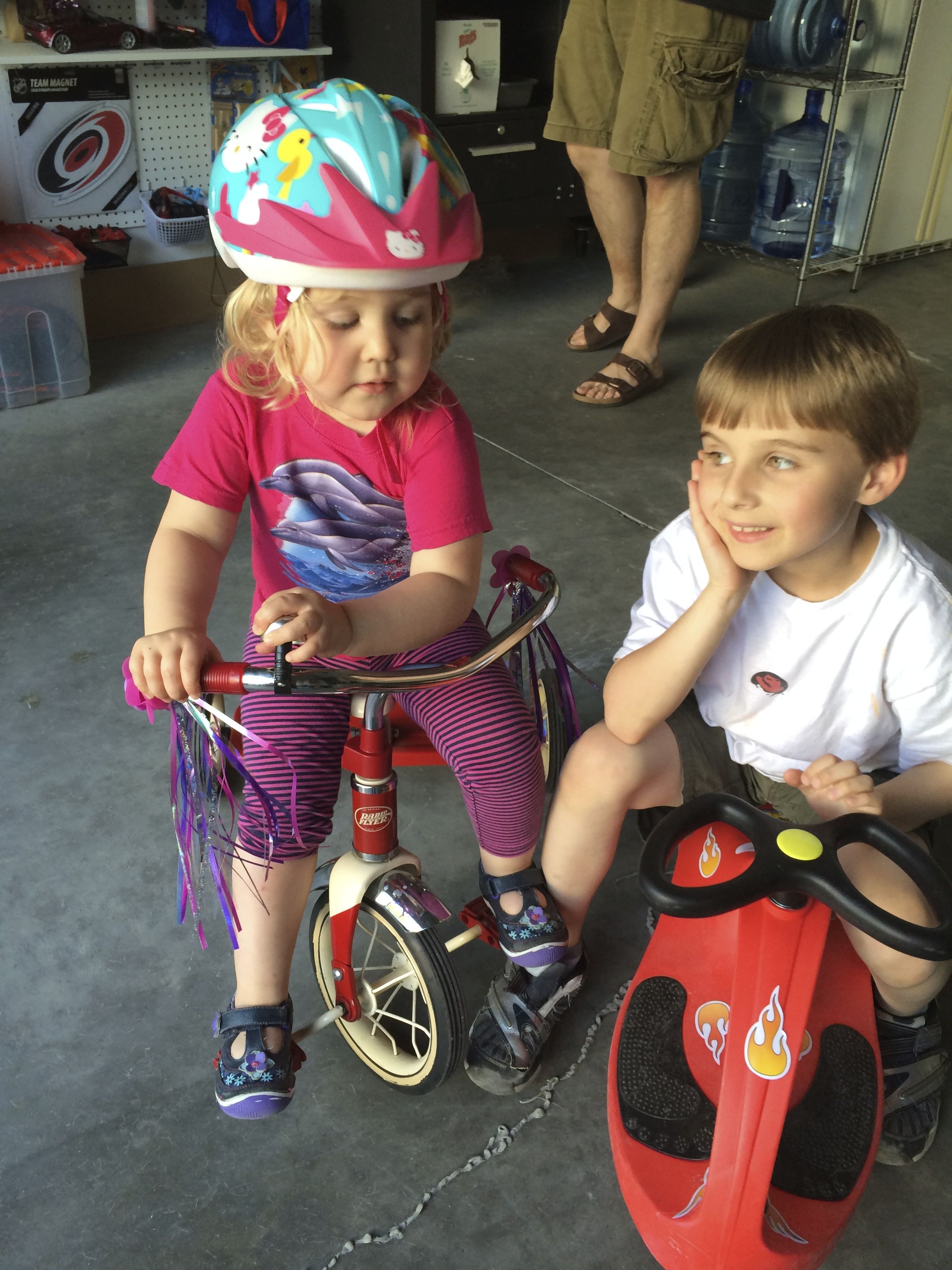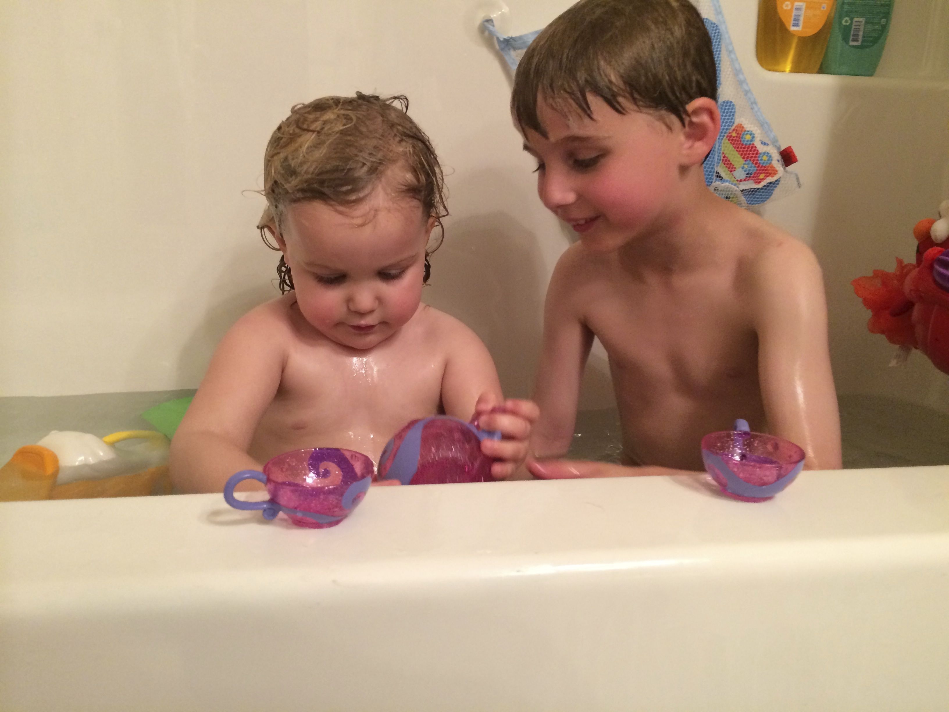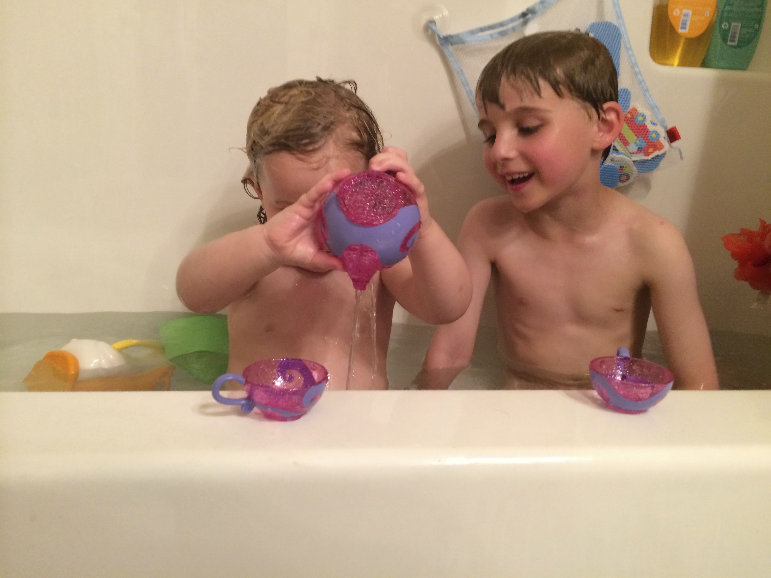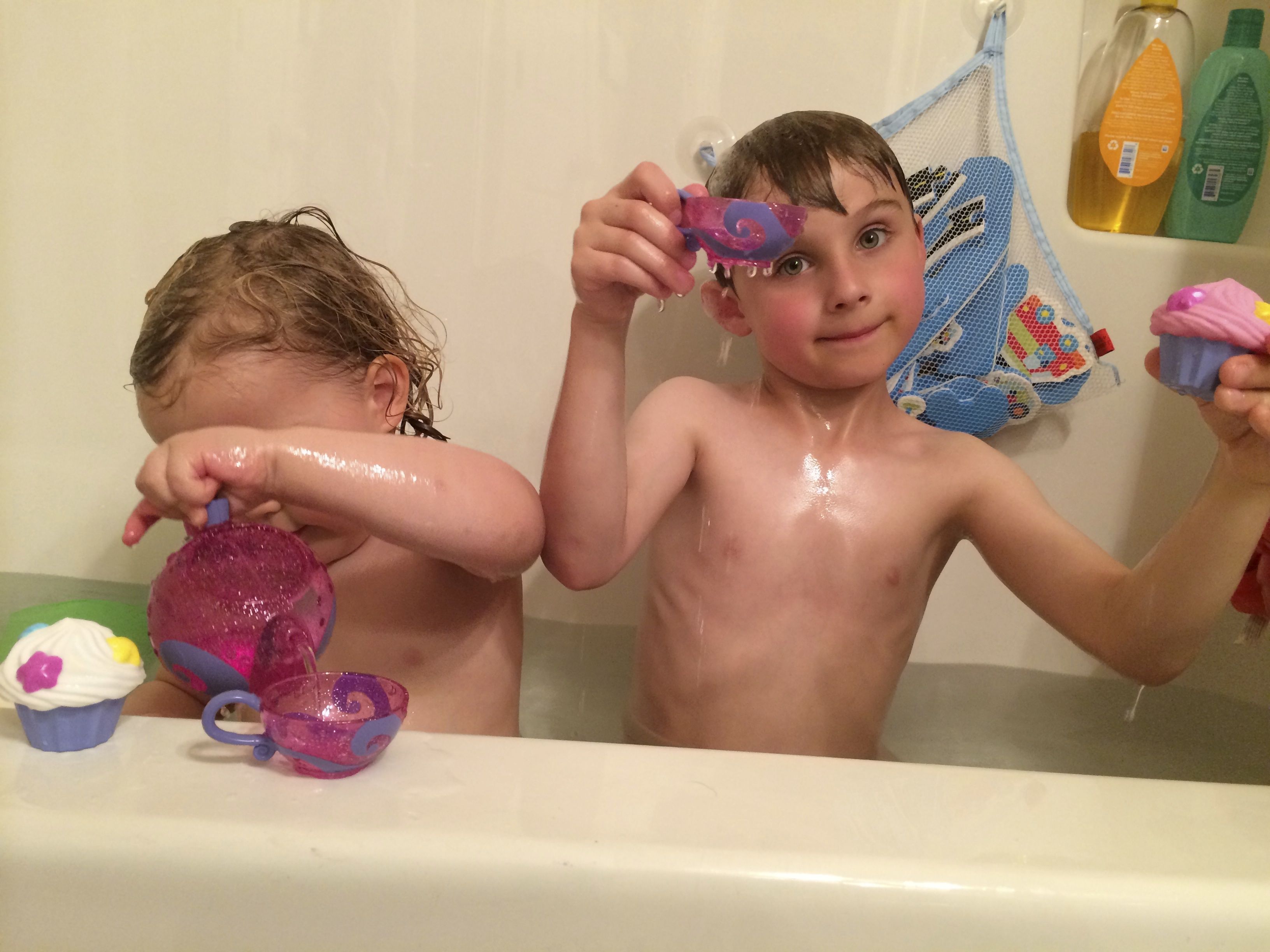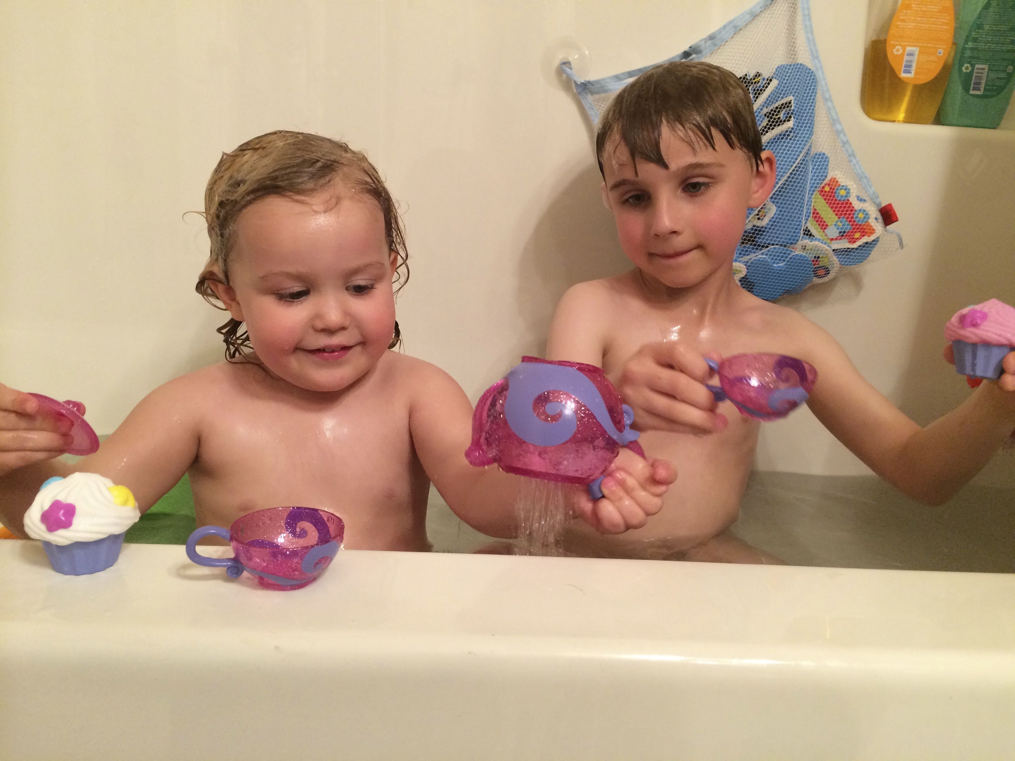 Today, Brian had a playdate with one of his good buddies from Root, Ladd! He was so excited to have Ladd come over for the first time, and a little surprised–Ladd arrived with a brand-new cast on his arm. He’d taken a tumble at school on Friday and it turned out, he’d broken it. Brian knew about hurt arms after his own hairline fracture last fall, and was happy to sign Ladd’s cast before anyone else at school. The boys played video games, staged a big Star Wars battle, and built many creations with Legos. I helped them make smoothies for a snack, and when they were checking out the play kitchen, Brandon surprised Brian with the fruit stand he’s been working on! He’d designed and built this custom set of fold-up shelves to hold the toy food baskets over the past few weeks. Brian was so happy and excited, he gave Brandon the biggest hug! He even seemed a little bit verklempt. 😉 All too soon, the playdate came to an end, and as Ladd was leaving through the garage, he and Brian managed to stall by riding bikes and plasma cars. Ladd’s little sister wanted to get in on the action, and borrowed Kendall’s plasma car–but poor Kendall had just woken up from her nap and did not take kindly to this turn of events! She howled so bad, we brought down the tricycle to try and distract her.. We didn’t expect her to really try to pedal it, since Brian couldn’t do it until well after his 3rd birthday, but she surprised us all! She just took off, forwards even, so quickly we could hardly strap Brian’s helmet on her! After Ladd left, we decided, if we wanted to start good helmet-wearing habits early with her, like we did with Brian, we had to get her a bike helmet, today! So, we took a quick trip over to Target to find a bike helmet for her, and we were happy to find a cute Hello Kitty one! I picked up a cute bathtub tea set for Kendall as well, figuring Brian might enjoy it as well, since he’s forever making us pretend drinks, ice cream, etc. in the bathtub. When we got home, Kendall tried out her new helmet, and rode the trike all around the garage! She was so proud of herself, and of course we were all so happy for her! Still a little amazed how she figured it out so quickly. 🙂 Brian cheered her on, being a really supportive big brother! I unveiled the tea set at bathtime, and as expected, both kids really enjoyed it! The included squirt-toy cupcakes were a nice touch. 😉