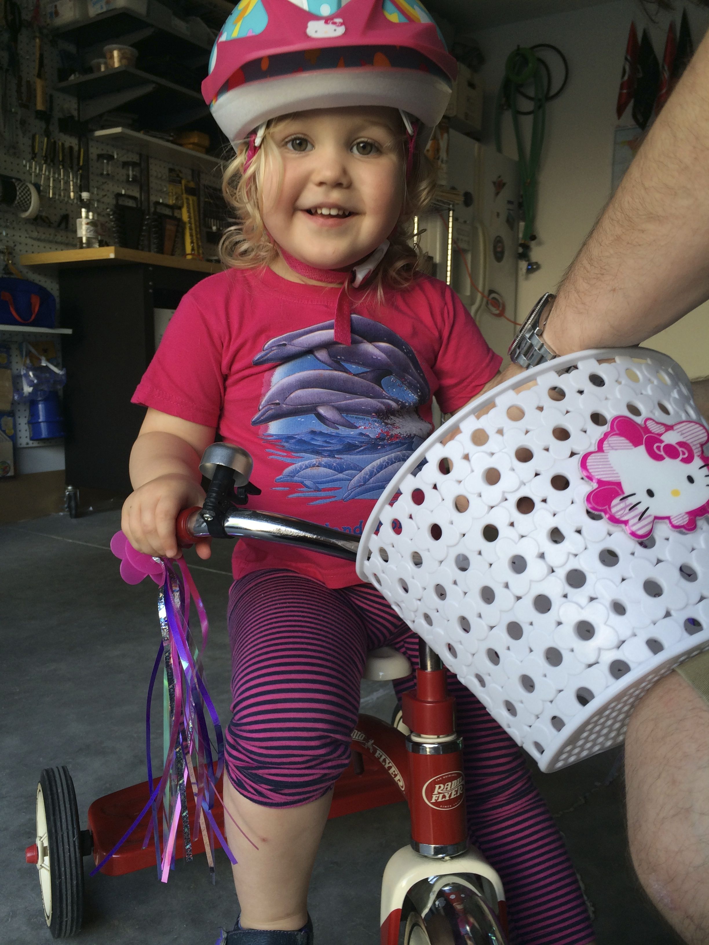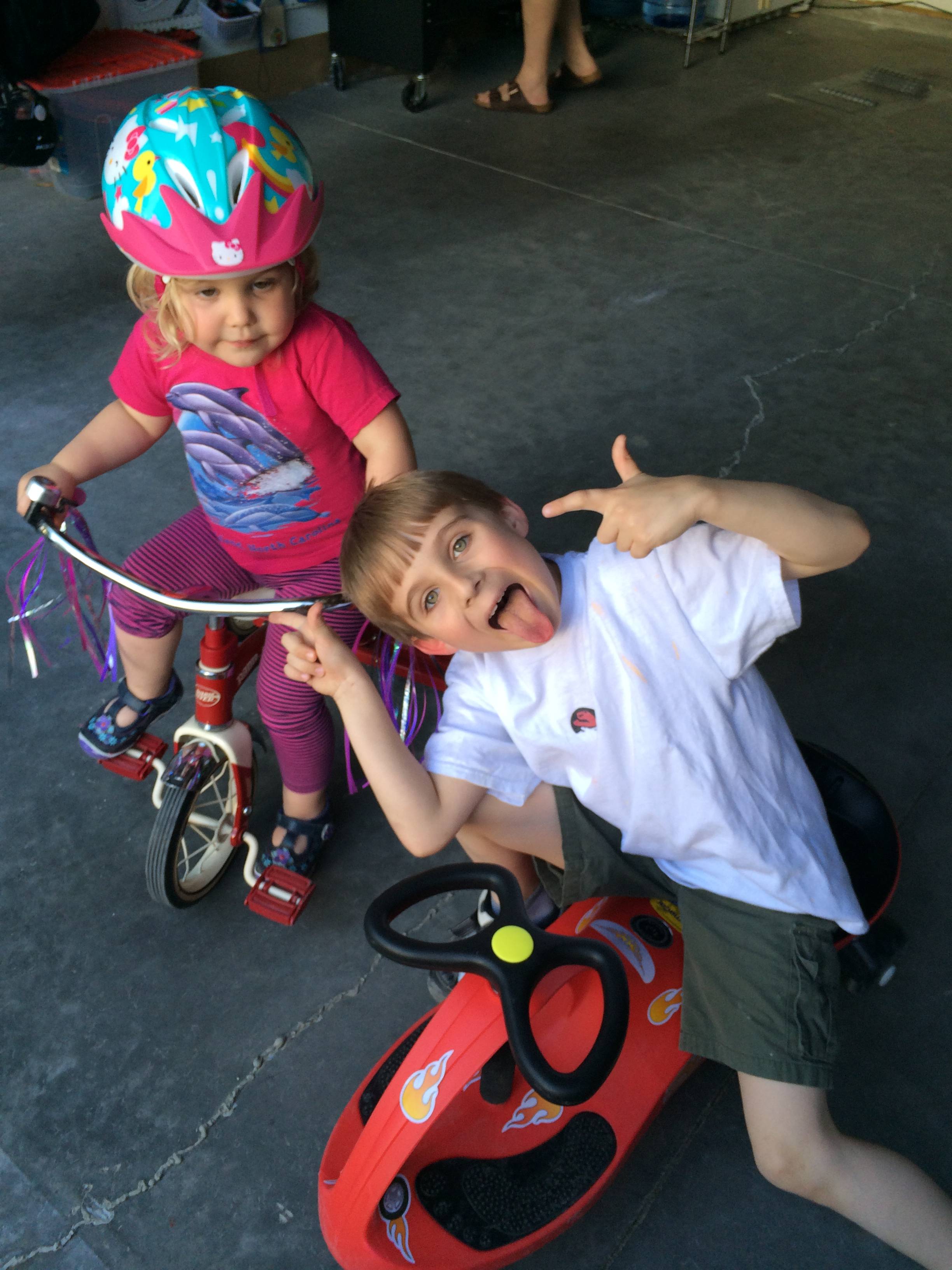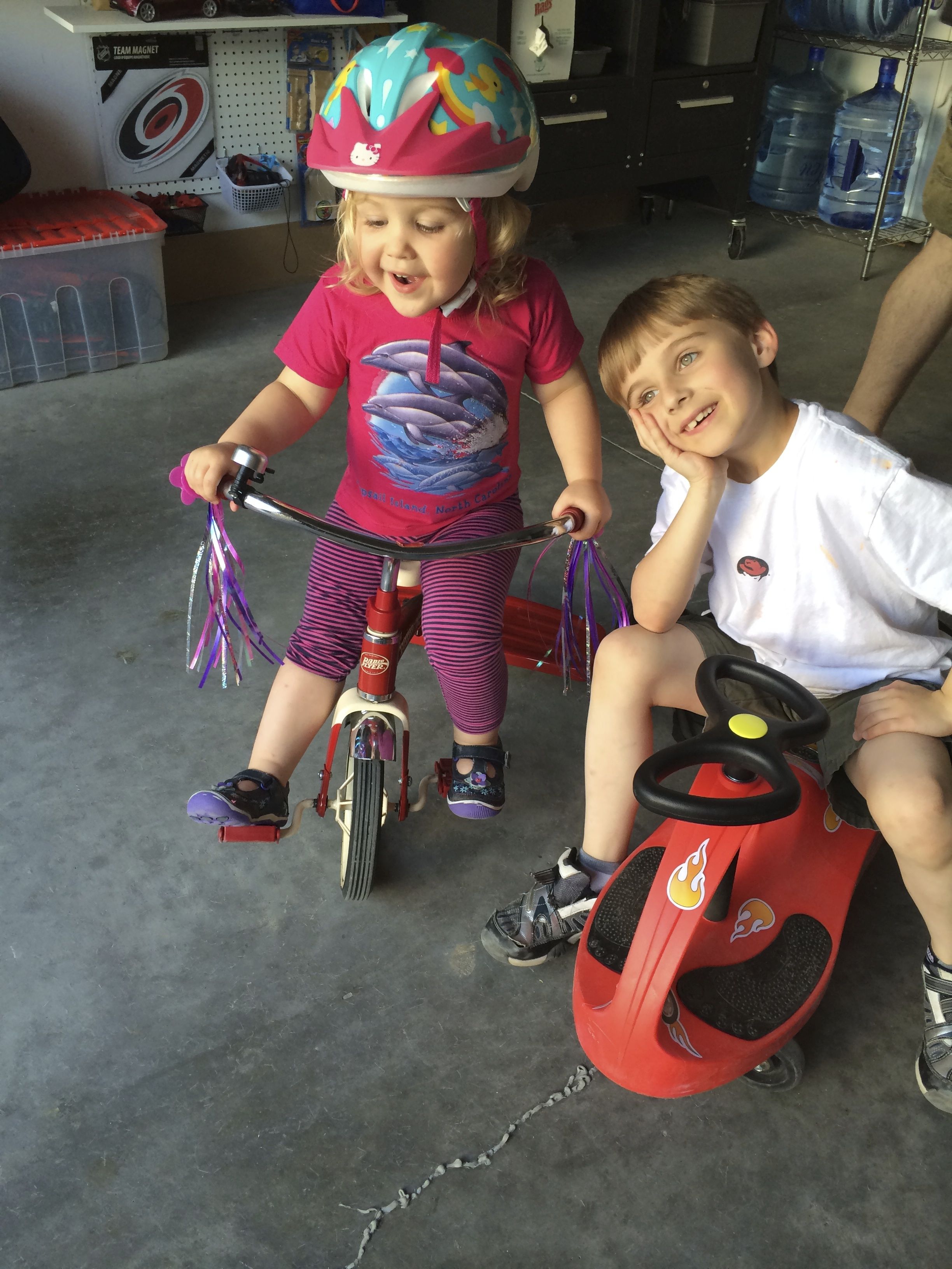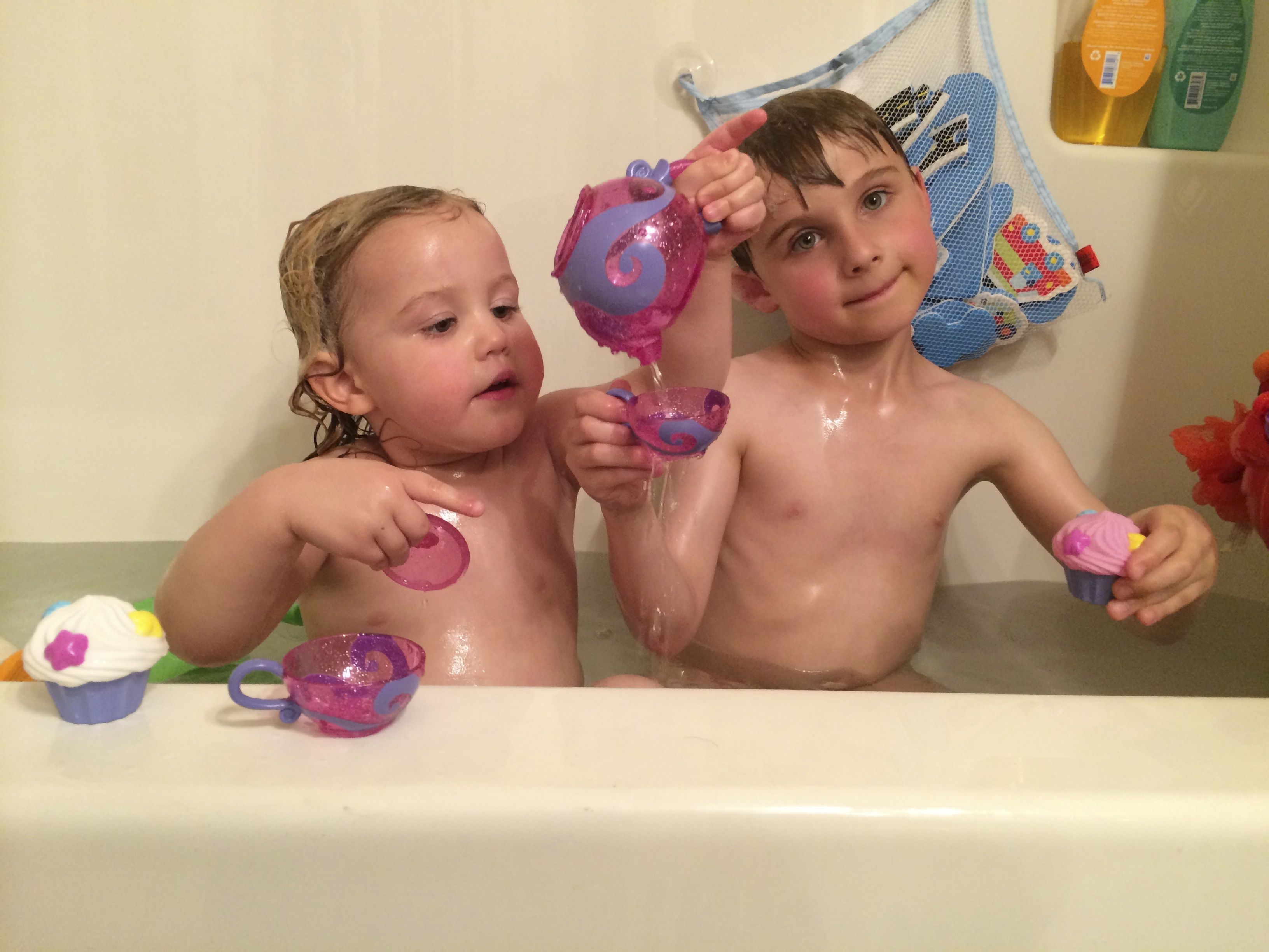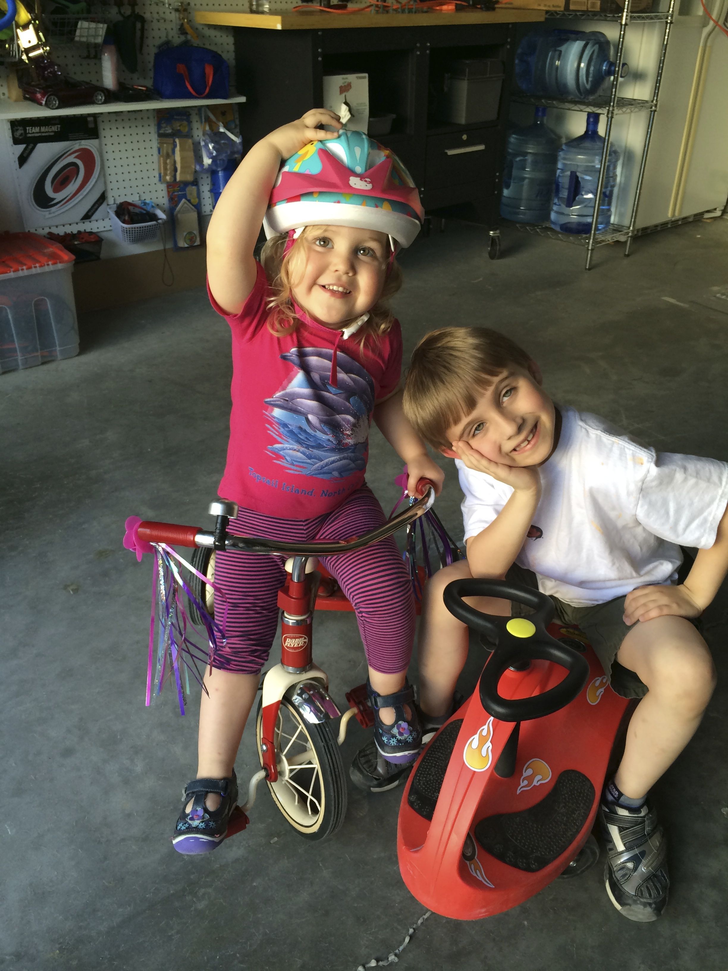 Today, Brian had a playdate with one of his good buddies from Root, Ladd! He was so excited to have Ladd come over for the first time, and a little surprised–Ladd arrived with a brand-new cast on his arm. He’d taken a tumble at school on Friday and it turned out, he’d broken it. Brian knew about hurt arms after his own hairline fracture last fall, and was happy to sign Ladd’s cast before anyone else at school. The boys played video games, staged a big Star Wars battle, and built many creations with Legos. I helped them make smoothies for a snack, and when they were checking out the play kitchen, Brandon surprised Brian with the fruit stand he’s been working on! He’d designed and built this custom set of fold-up shelves to hold the toy food baskets over the past few weeks. Brian was so happy and excited, he gave Brandon the biggest hug! He even seemed a little bit verklempt. 😉 All too soon, the playdate came to an end, and as Ladd was leaving through the garage, he and Brian managed to stall by riding bikes and plasma cars. Ladd’s little sister wanted to get in on the action, and borrowed Kendall’s plasma car–but poor Kendall had just woken up from her nap and did not take kindly to this turn of events! She howled so bad, we brought down the tricycle to try and distract her.. We didn’t expect her to really try to pedal it, since Brian couldn’t do it until well after his 3rd birthday, but she surprised us all! She just took off, forwards even, so quickly we could hardly strap Brian’s helmet on her! After Ladd left, we decided, if we wanted to start good helmet-wearing habits early with her, like we did with Brian, we had to get her a bike helmet, today! So, we took a quick trip over to Target to find a bike helmet for her, and we were happy to find a cute Hello Kitty one! I picked up a cute bathtub tea set for Kendall as well, figuring Brian might enjoy it as well, since he’s forever making us pretend drinks, ice cream, etc. in the bathtub. When we got home, Kendall tried out her new helmet, and rode the trike all around the garage! She was so proud of herself, and of course we were all so happy for her! Still a little amazed how she figured it out so quickly. 🙂 Brian cheered her on, being a really supportive big brother! I unveiled the tea set at bathtime, and as expected, both kids really enjoyed it! The included squirt-toy cupcakes were a nice touch. 😉