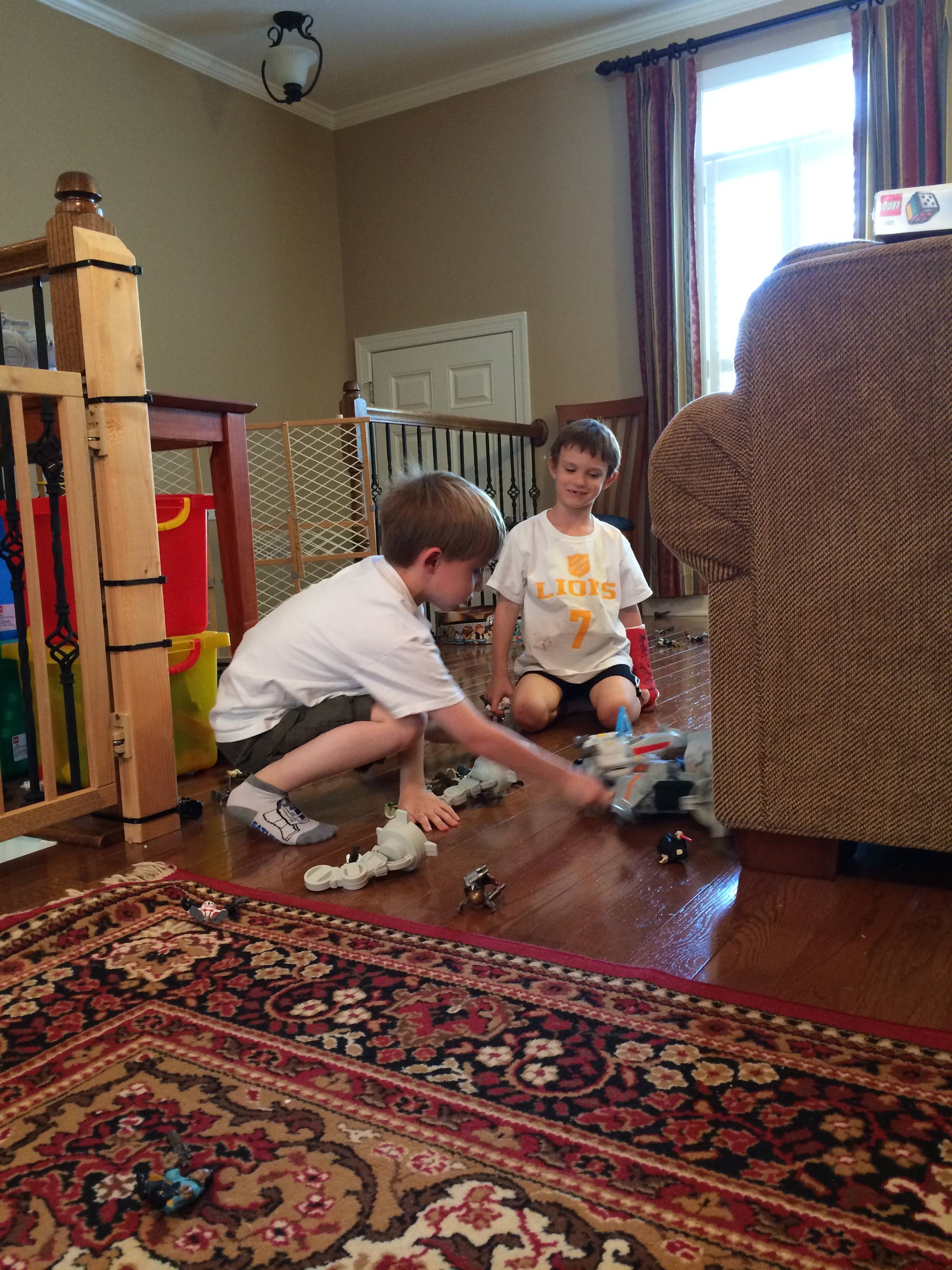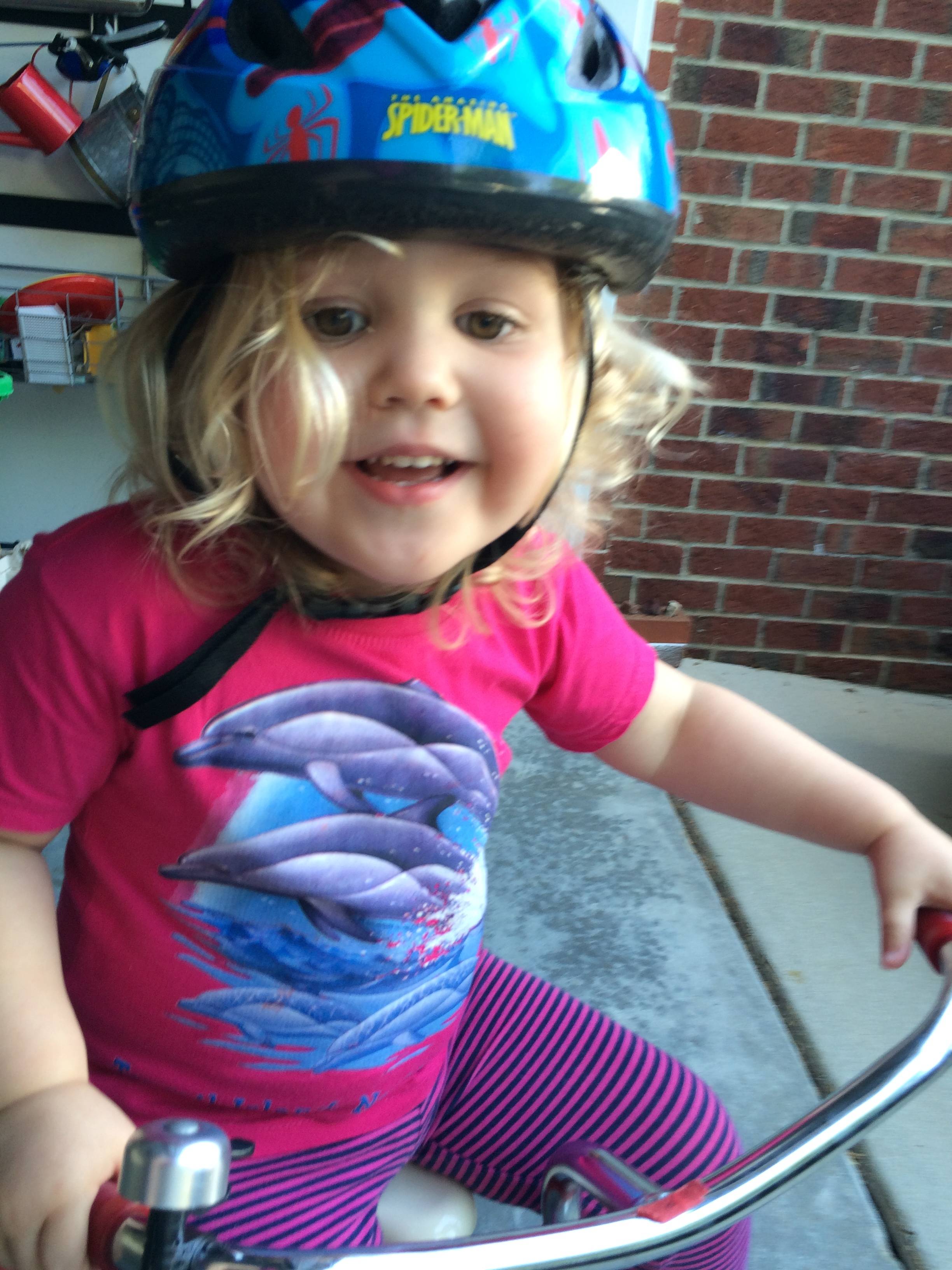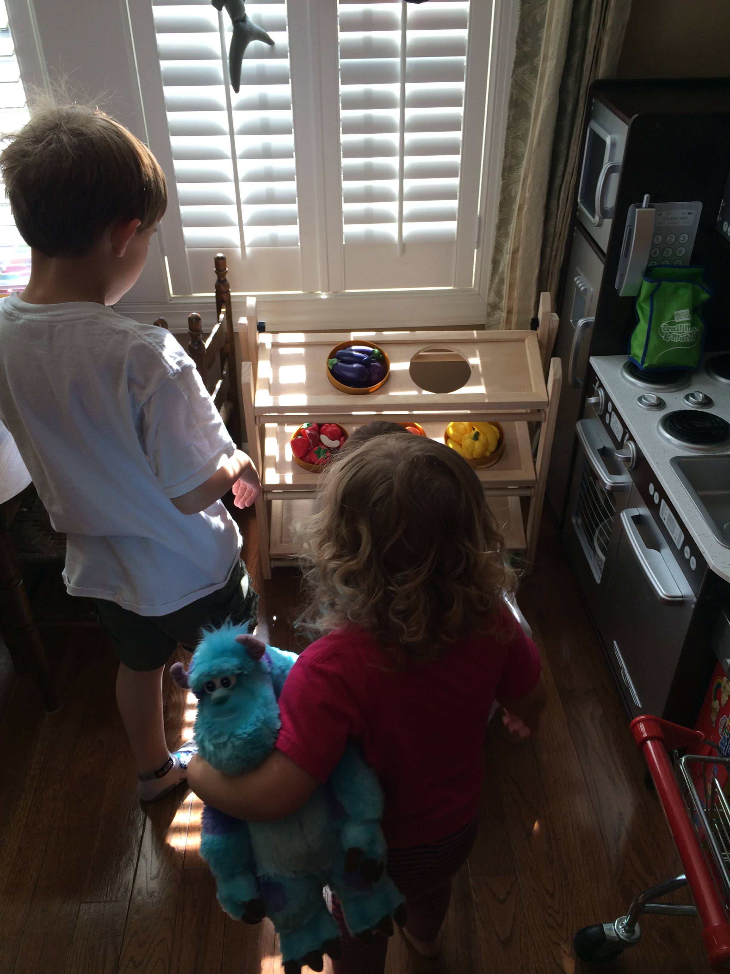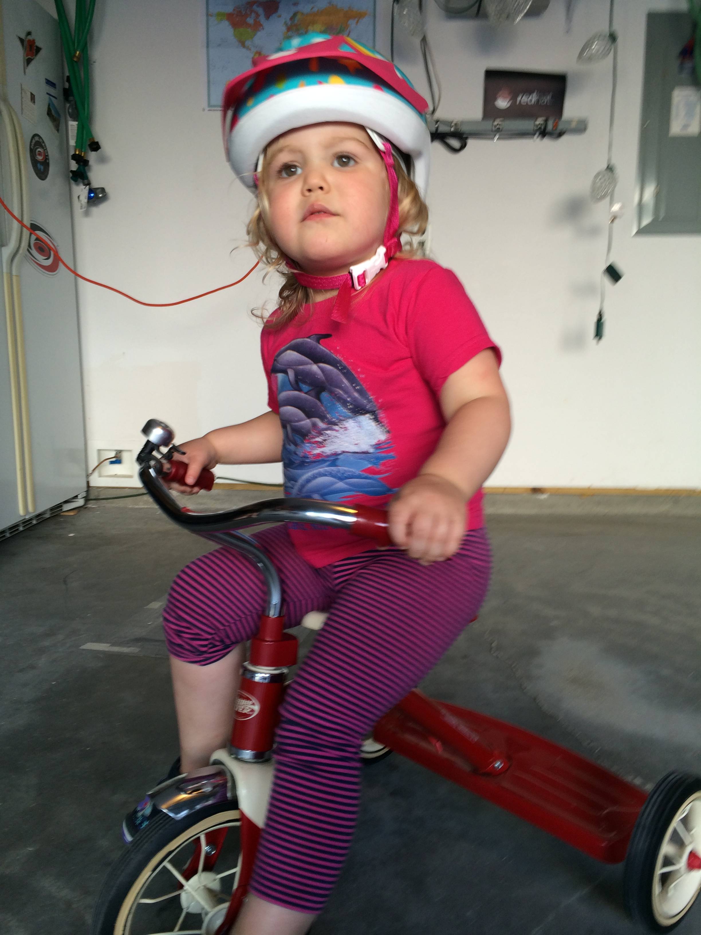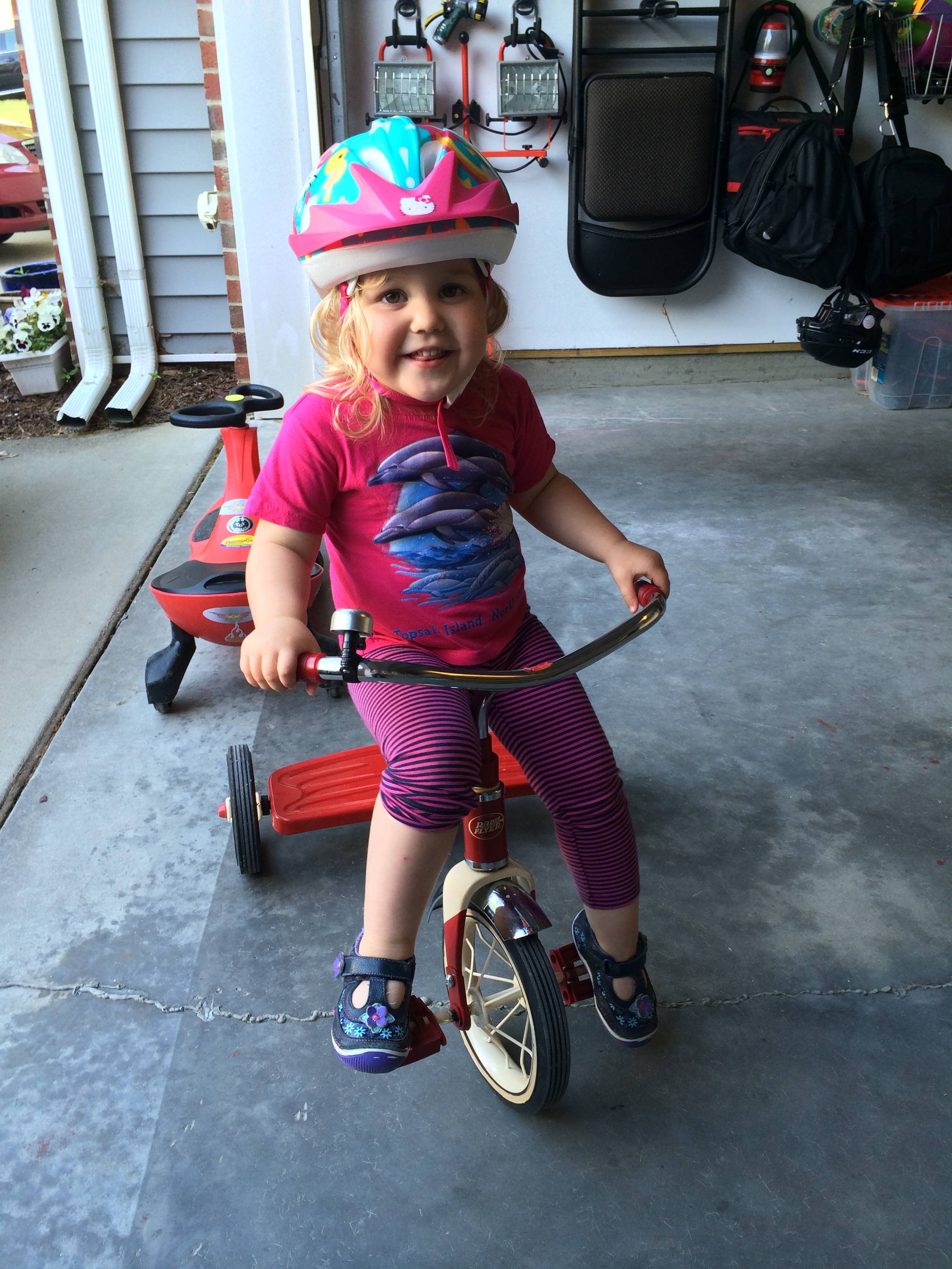 Today, Brian had a playdate with one of his good buddies from Root, Ladd! He was so excited to have Ladd come over for the first time, and a little surprised–Ladd arrived with a brand-new cast on his arm. He’d taken a tumble at school on Friday and it turned out, he’d broken it. Brian knew about hurt arms after his own hairline fracture last fall, and was happy to sign Ladd’s cast before anyone else at school. The boys played video games, staged a big Star Wars battle, and built many creations with Legos. I helped them make smoothies for a snack, and when they were checking out the play kitchen, Brandon surprised Brian with the fruit stand he’s been working on! He’d designed and built this custom set of fold-up shelves to hold the toy food baskets over the past few weeks. Brian was so happy and excited, he gave Brandon the biggest hug! He even seemed a little bit verklempt. 😉 All too soon, the playdate came to an end, and as Ladd was leaving through the garage, he and Brian managed to stall by riding bikes and plasma cars. Ladd’s little sister wanted to get in on the action, and borrowed Kendall’s plasma car–but poor Kendall had just woken up from her nap and did not take kindly to this turn of events! She howled so bad, we brought down the tricycle to try and distract her.. We didn’t expect her to really try to pedal it, since Brian couldn’t do it until well after his 3rd birthday, but she surprised us all! She just took off, forwards even, so quickly we could hardly strap Brian’s helmet on her! After Ladd left, we decided, if we wanted to start good helmet-wearing habits early with her, like we did with Brian, we had to get her a bike helmet, today! So, we took a quick trip over to Target to find a bike helmet for her, and we were happy to find a cute Hello Kitty one! I picked up a cute bathtub tea set for Kendall as well, figuring Brian might enjoy it as well, since he’s forever making us pretend drinks, ice cream, etc. in the bathtub. When we got home, Kendall tried out her new helmet, and rode the trike all around the garage! She was so proud of herself, and of course we were all so happy for her! Still a little amazed how she figured it out so quickly. 🙂 Brian cheered her on, being a really supportive big brother! I unveiled the tea set at bathtime, and as expected, both kids really enjoyed it! The included squirt-toy cupcakes were a nice touch. 😉