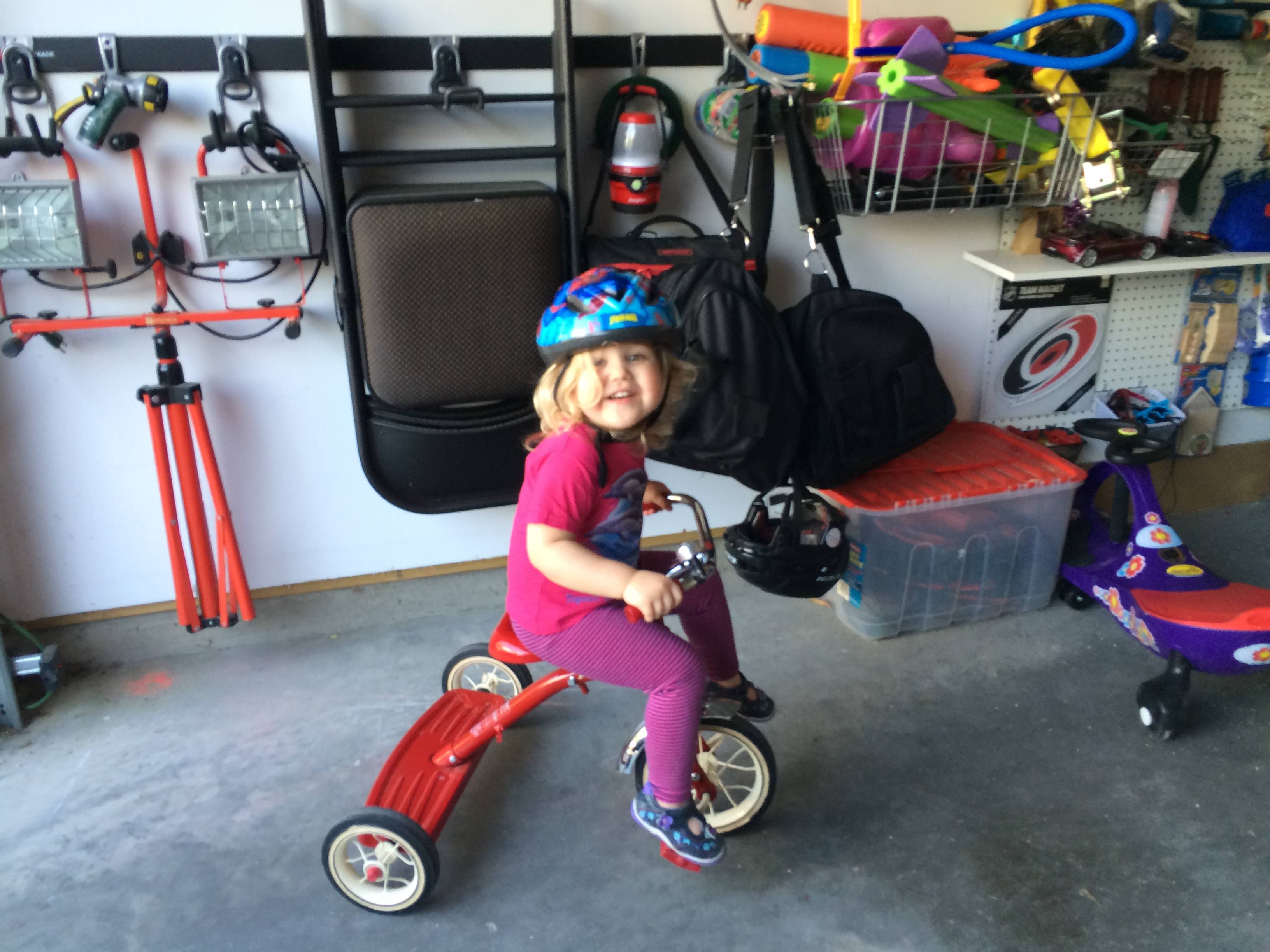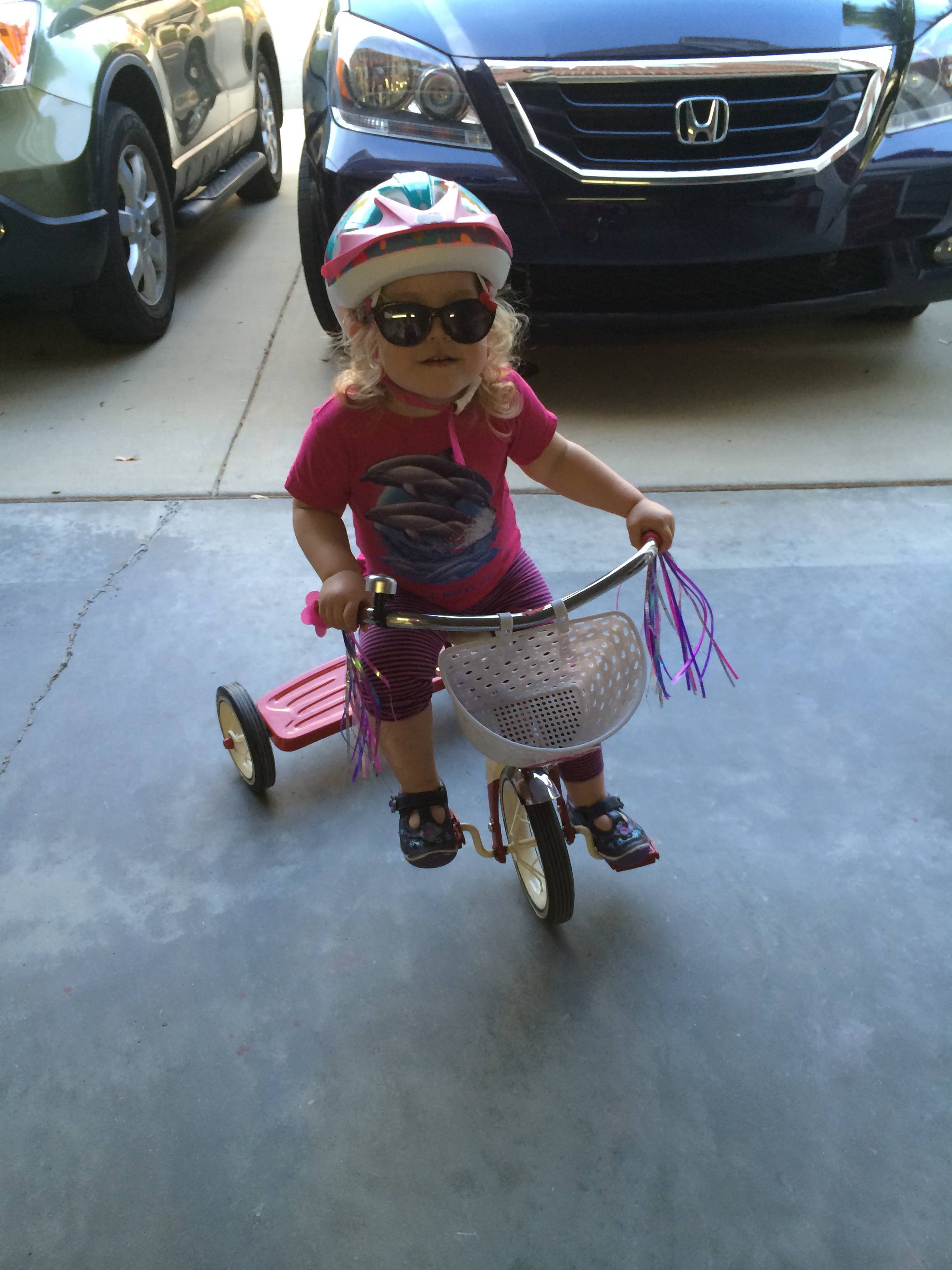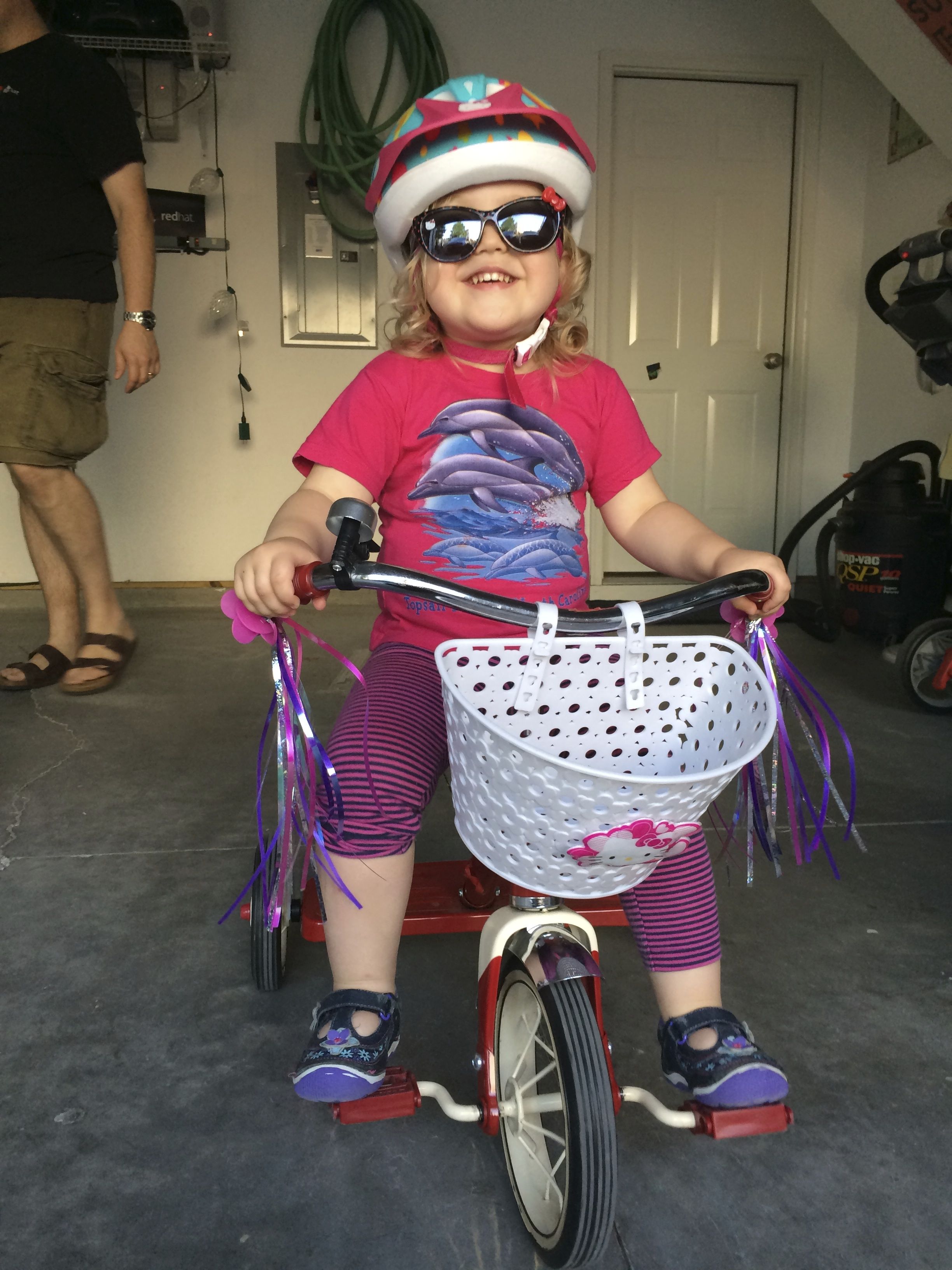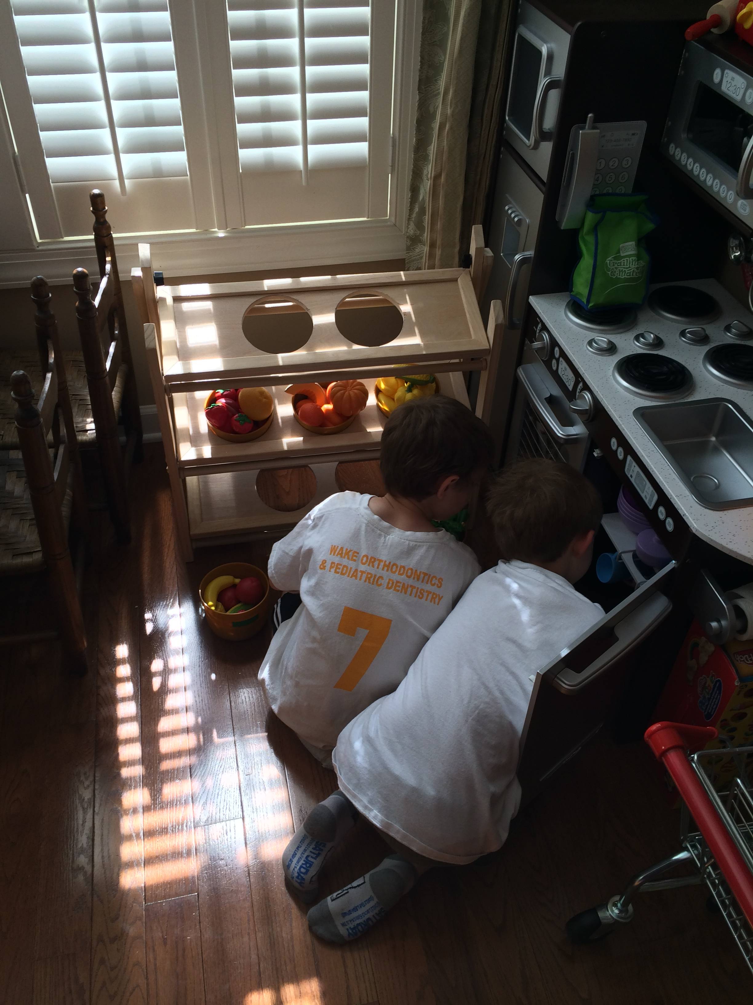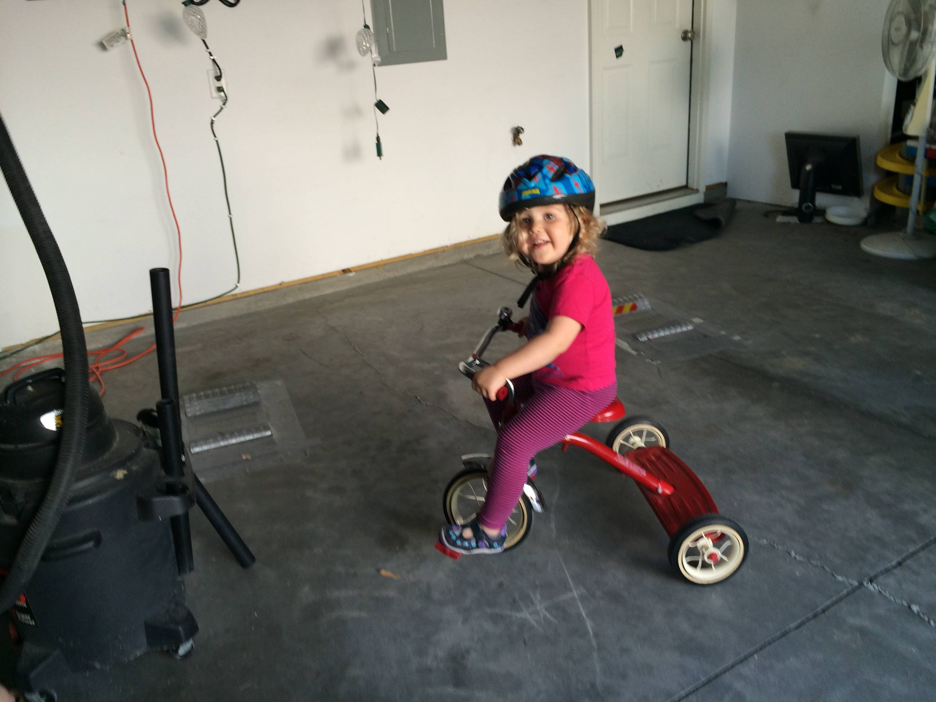 Today, Brian had a playdate with one of his good buddies from Root, Ladd! He was so excited to have Ladd come over for the first time, and a little surprised–Ladd arrived with a brand-new cast on his arm. He’d taken a tumble at school on Friday and it turned out, he’d broken it. Brian knew about hurt arms after his own hairline fracture last fall, and was happy to sign Ladd’s cast before anyone else at school. The boys played video games, staged a big Star Wars battle, and built many creations with Legos. I helped them make smoothies for a snack, and when they were checking out the play kitchen, Brandon surprised Brian with the fruit stand he’s been working on! He’d designed and built this custom set of fold-up shelves to hold the toy food baskets over the past few weeks. Brian was so happy and excited, he gave Brandon the biggest hug! He even seemed a little bit verklempt. 😉 All too soon, the playdate came to an end, and as Ladd was leaving through the garage, he and Brian managed to stall by riding bikes and plasma cars. Ladd’s little sister wanted to get in on the action, and borrowed Kendall’s plasma car–but poor Kendall had just woken up from her nap and did not take kindly to this turn of events! She howled so bad, we brought down the tricycle to try and distract her.. We didn’t expect her to really try to pedal it, since Brian couldn’t do it until well after his 3rd birthday, but she surprised us all! She just took off, forwards even, so quickly we could hardly strap Brian’s helmet on her! After Ladd left, we decided, if we wanted to start good helmet-wearing habits early with her, like we did with Brian, we had to get her a bike helmet, today! So, we took a quick trip over to Target to find a bike helmet for her, and we were happy to find a cute Hello Kitty one! I picked up a cute bathtub tea set for Kendall as well, figuring Brian might enjoy it as well, since he’s forever making us pretend drinks, ice cream, etc. in the bathtub. When we got home, Kendall tried out her new helmet, and rode the trike all around the garage! She was so proud of herself, and of course we were all so happy for her! Still a little amazed how she figured it out so quickly. 🙂 Brian cheered her on, being a really supportive big brother! I unveiled the tea set at bathtime, and as expected, both kids really enjoyed it! The included squirt-toy cupcakes were a nice touch. 😉