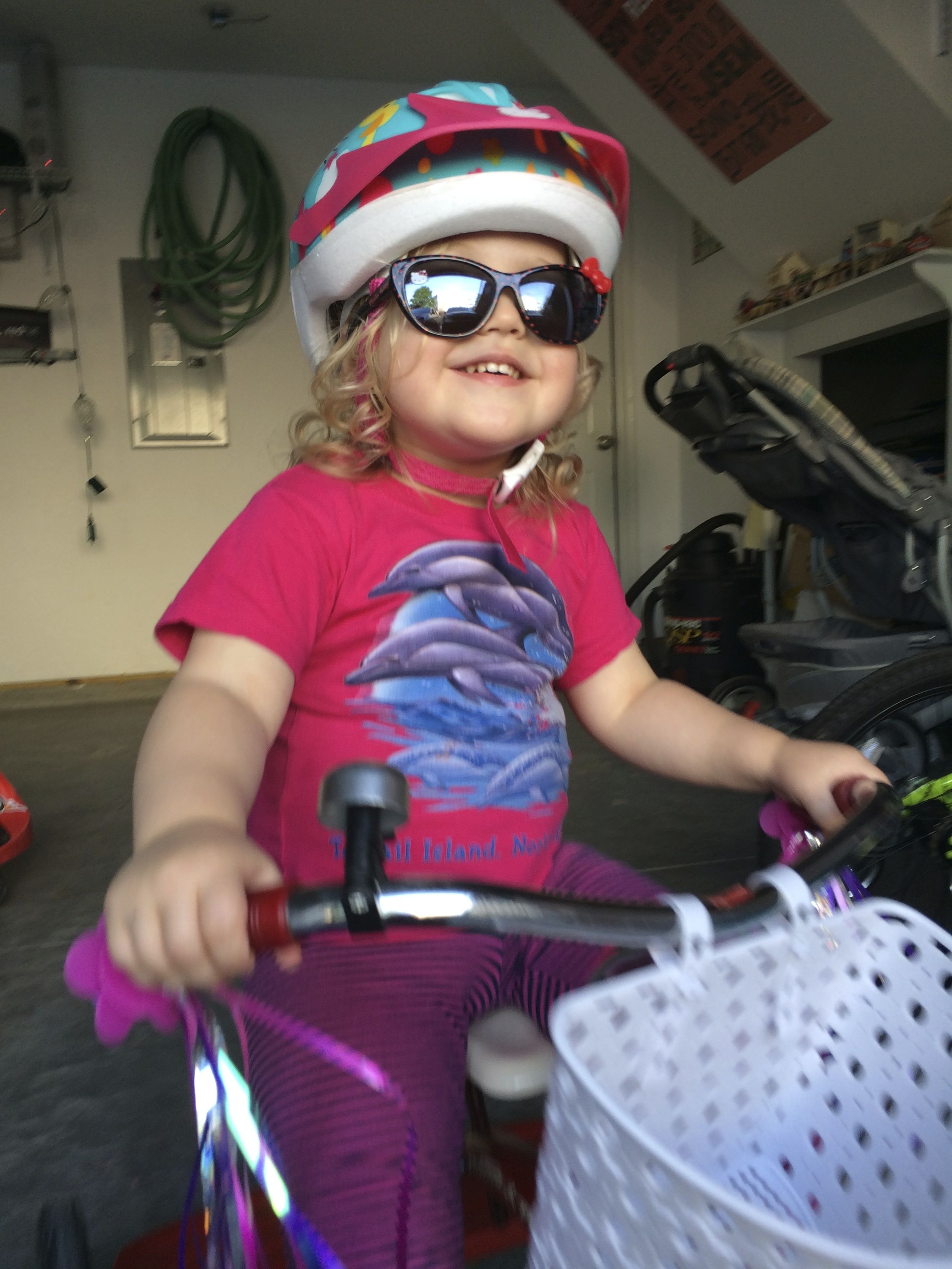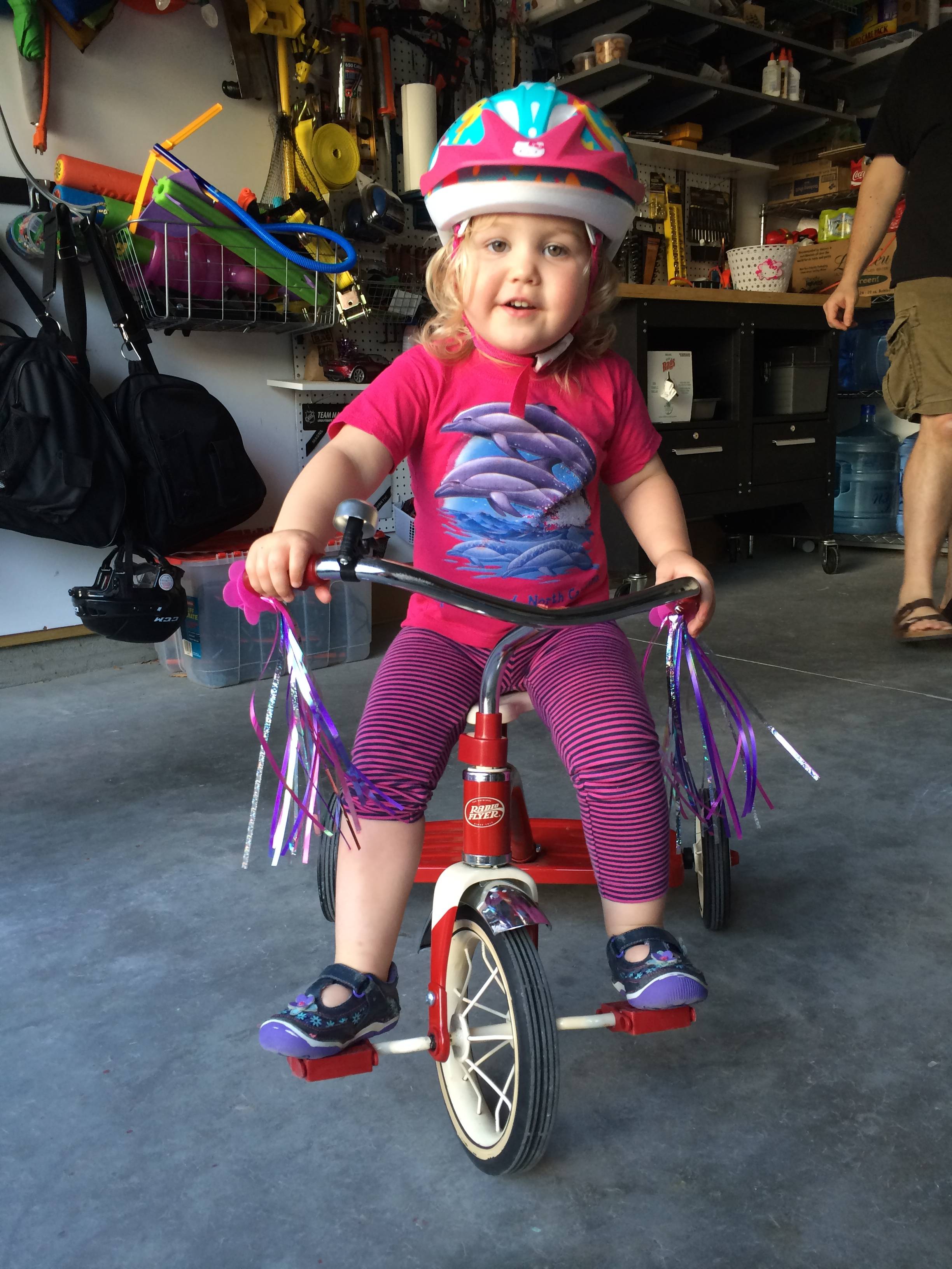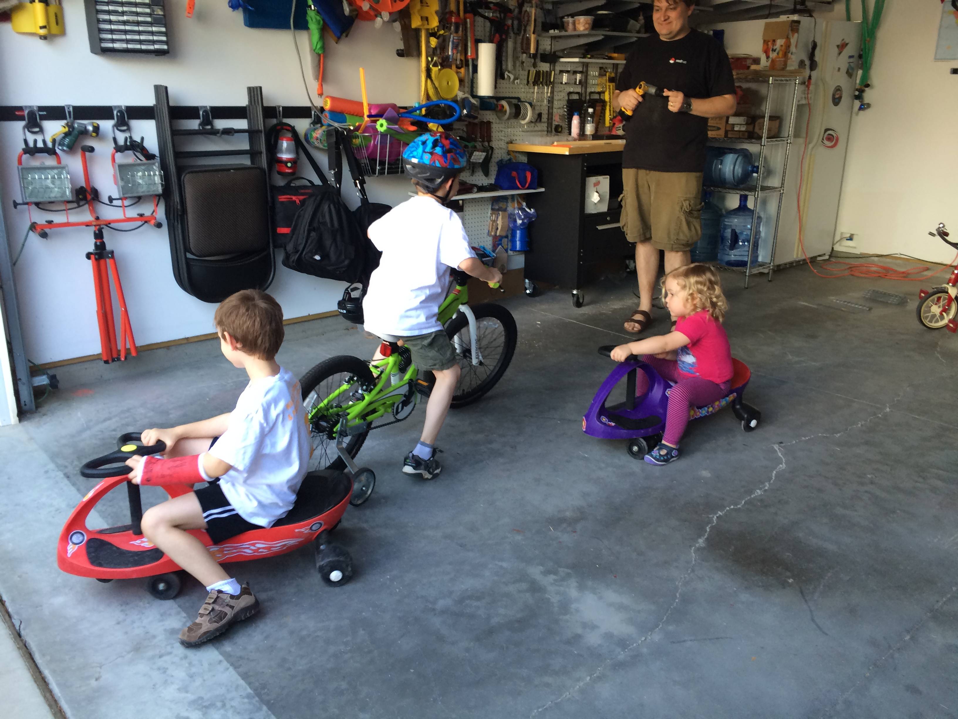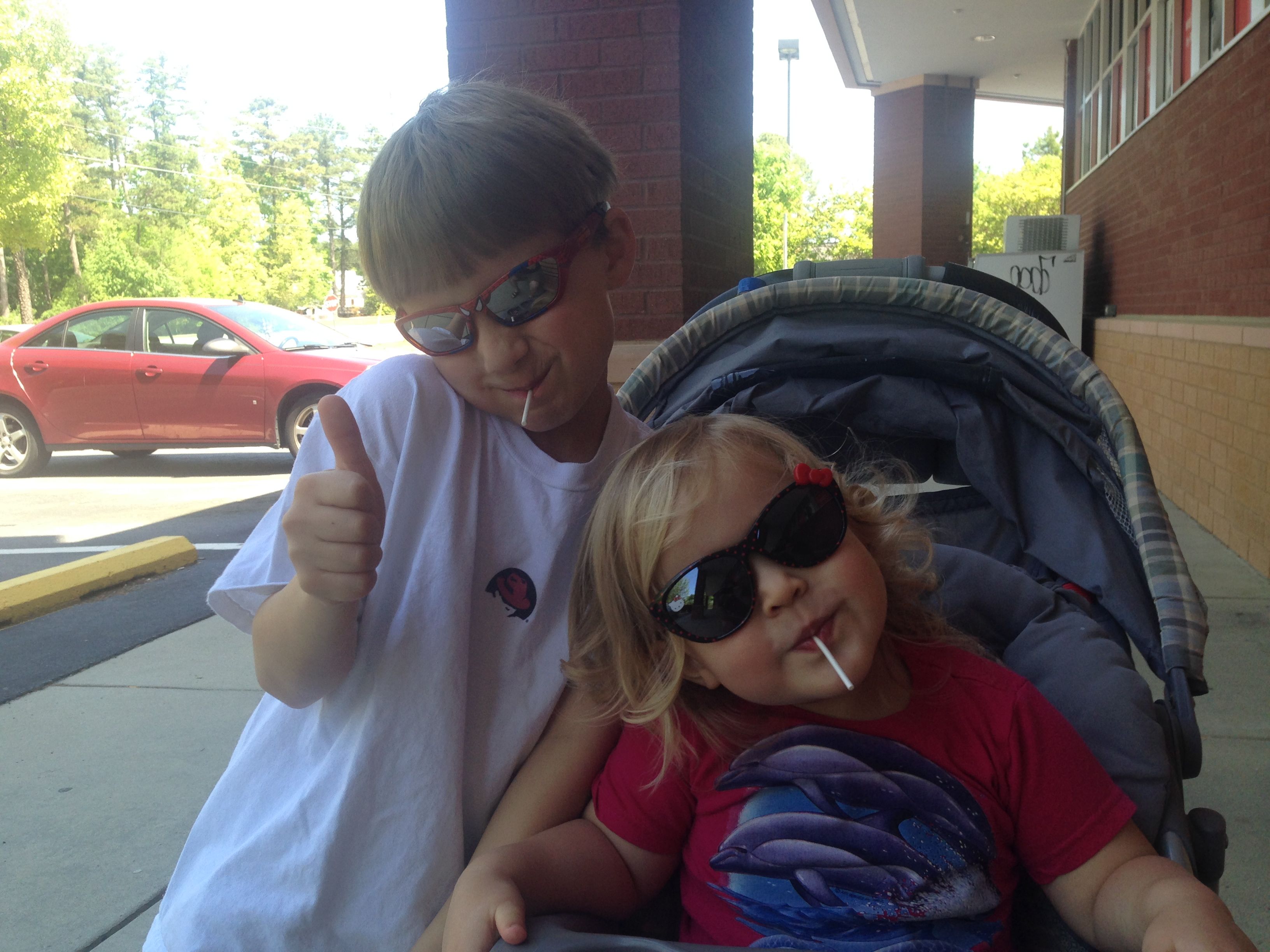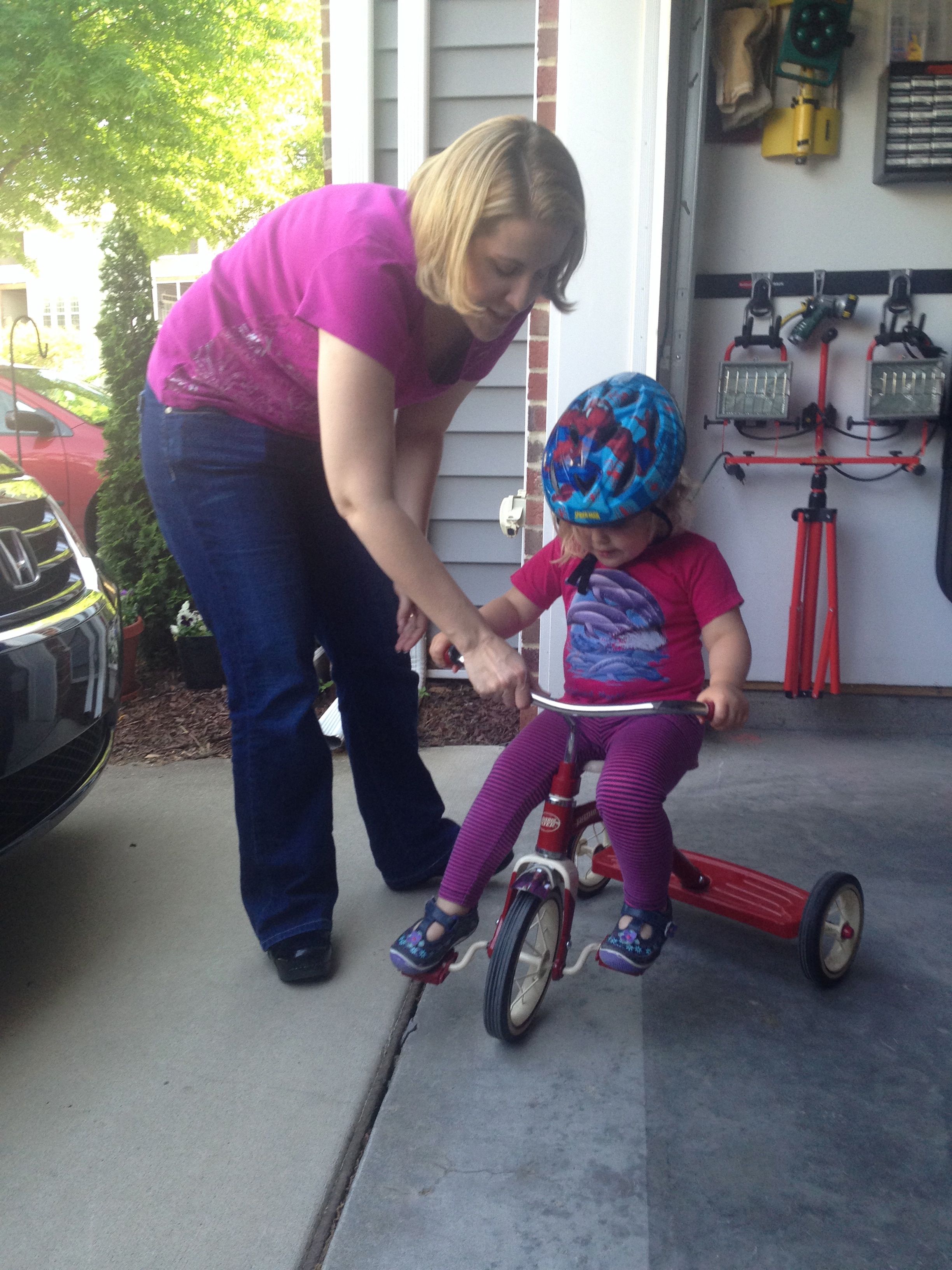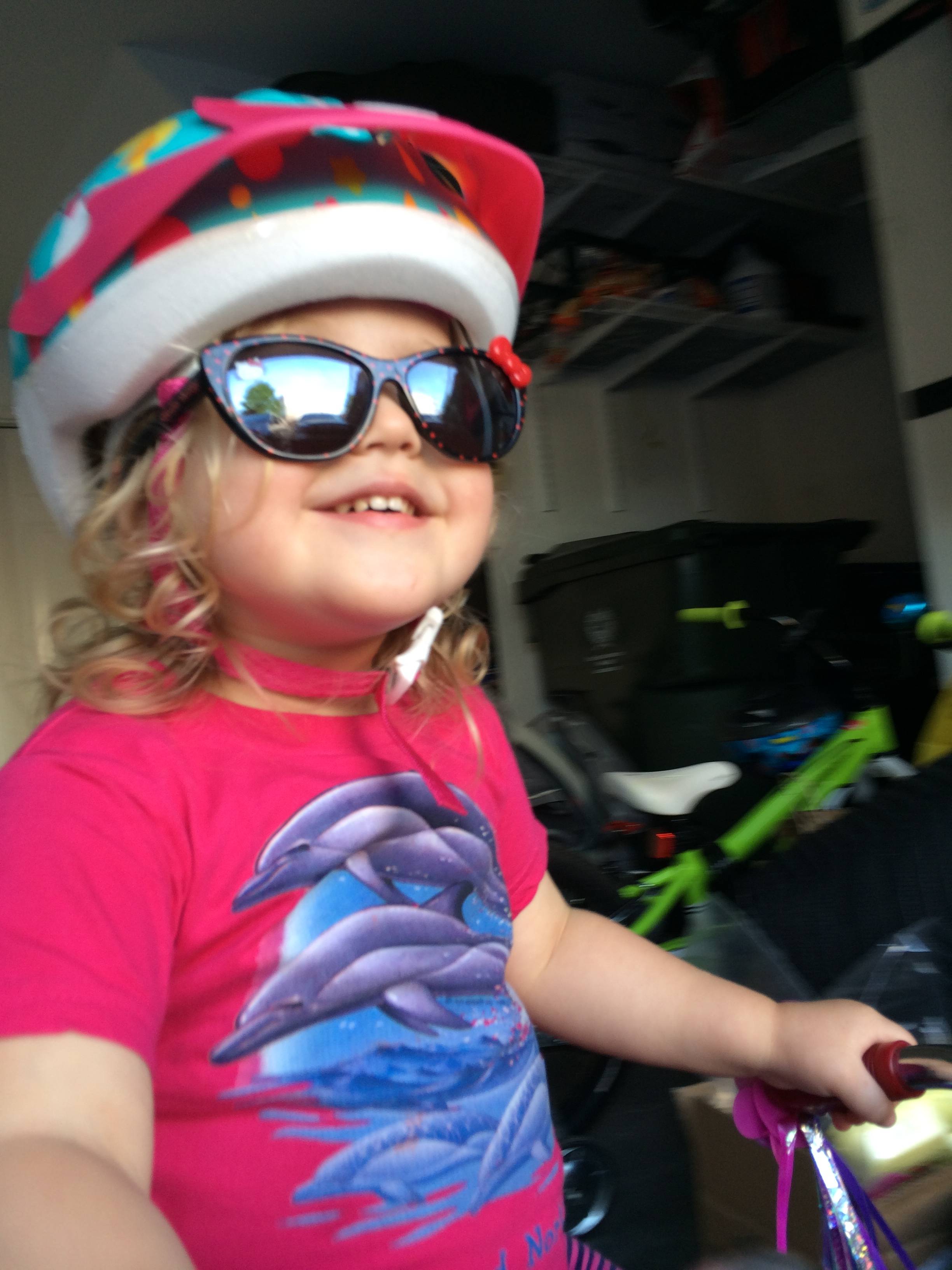 Today, Brian had a playdate with one of his good buddies from Root, Ladd! He was so excited to have Ladd come over for the first time, and a little surprised–Ladd arrived with a brand-new cast on his arm. He’d taken a tumble at school on Friday and it turned out, he’d broken it. Brian knew about hurt arms after his own hairline fracture last fall, and was happy to sign Ladd’s cast before anyone else at school. The boys played video games, staged a big Star Wars battle, and built many creations with Legos. I helped them make smoothies for a snack, and when they were checking out the play kitchen, Brandon surprised Brian with the fruit stand he’s been working on! He’d designed and built this custom set of fold-up shelves to hold the toy food baskets over the past few weeks. Brian was so happy and excited, he gave Brandon the biggest hug! He even seemed a little bit verklempt. 😉 All too soon, the playdate came to an end, and as Ladd was leaving through the garage, he and Brian managed to stall by riding bikes and plasma cars. Ladd’s little sister wanted to get in on the action, and borrowed Kendall’s plasma car–but poor Kendall had just woken up from her nap and did not take kindly to this turn of events! She howled so bad, we brought down the tricycle to try and distract her.. We didn’t expect her to really try to pedal it, since Brian couldn’t do it until well after his 3rd birthday, but she surprised us all! She just took off, forwards even, so quickly we could hardly strap Brian’s helmet on her! After Ladd left, we decided, if we wanted to start good helmet-wearing habits early with her, like we did with Brian, we had to get her a bike helmet, today! So, we took a quick trip over to Target to find a bike helmet for her, and we were happy to find a cute Hello Kitty one! I picked up a cute bathtub tea set for Kendall as well, figuring Brian might enjoy it as well, since he’s forever making us pretend drinks, ice cream, etc. in the bathtub. When we got home, Kendall tried out her new helmet, and rode the trike all around the garage! She was so proud of herself, and of course we were all so happy for her! Still a little amazed how she figured it out so quickly. 🙂 Brian cheered her on, being a really supportive big brother! I unveiled the tea set at bathtime, and as expected, both kids really enjoyed it! The included squirt-toy cupcakes were a nice touch. 😉