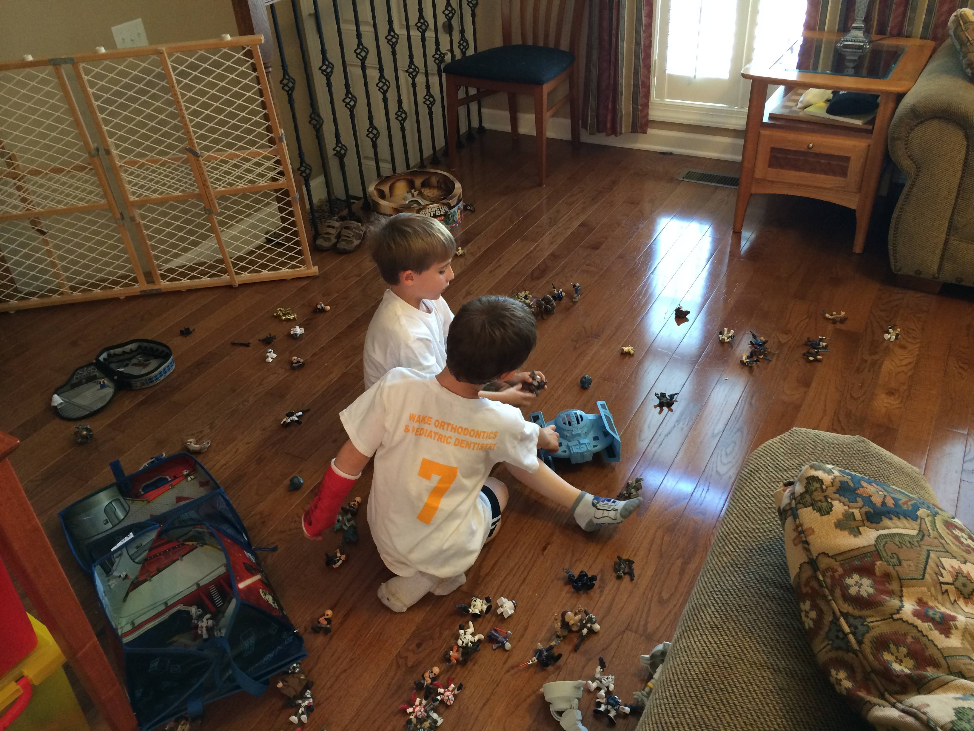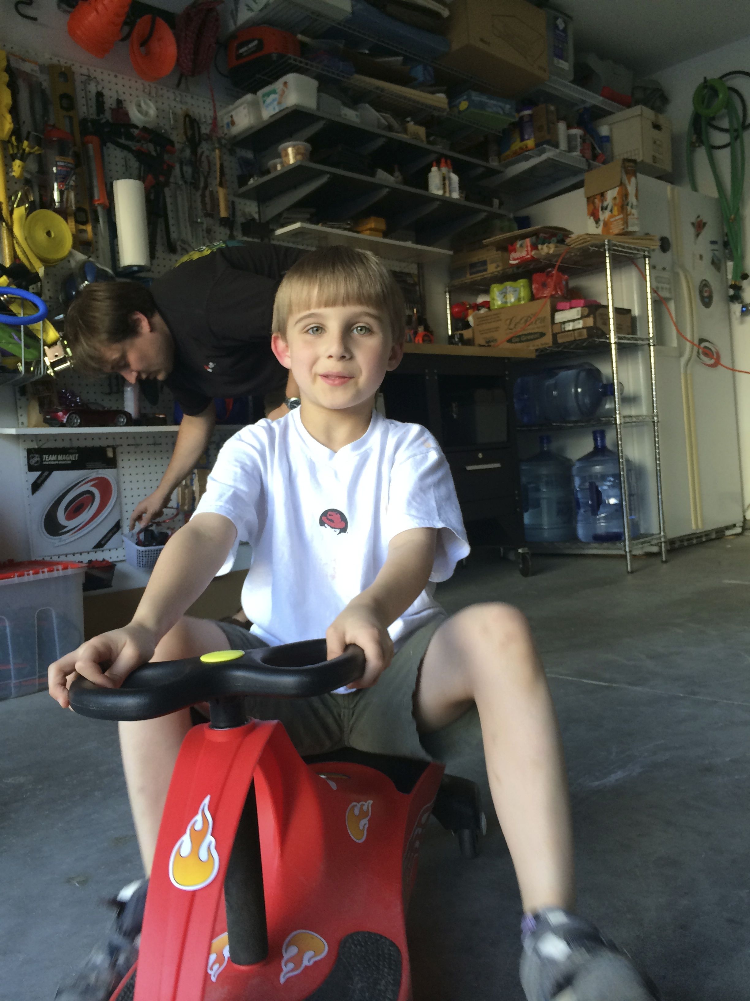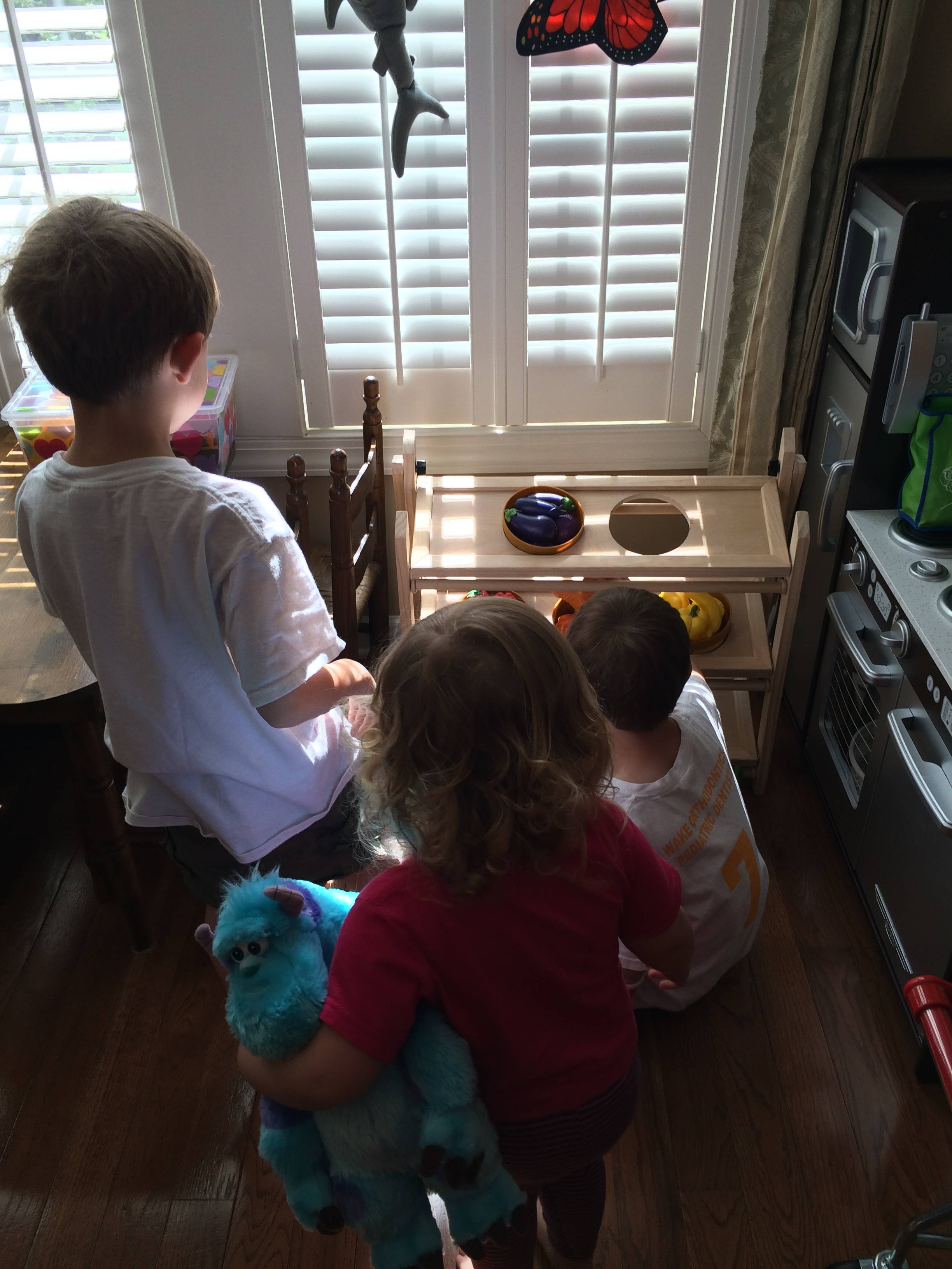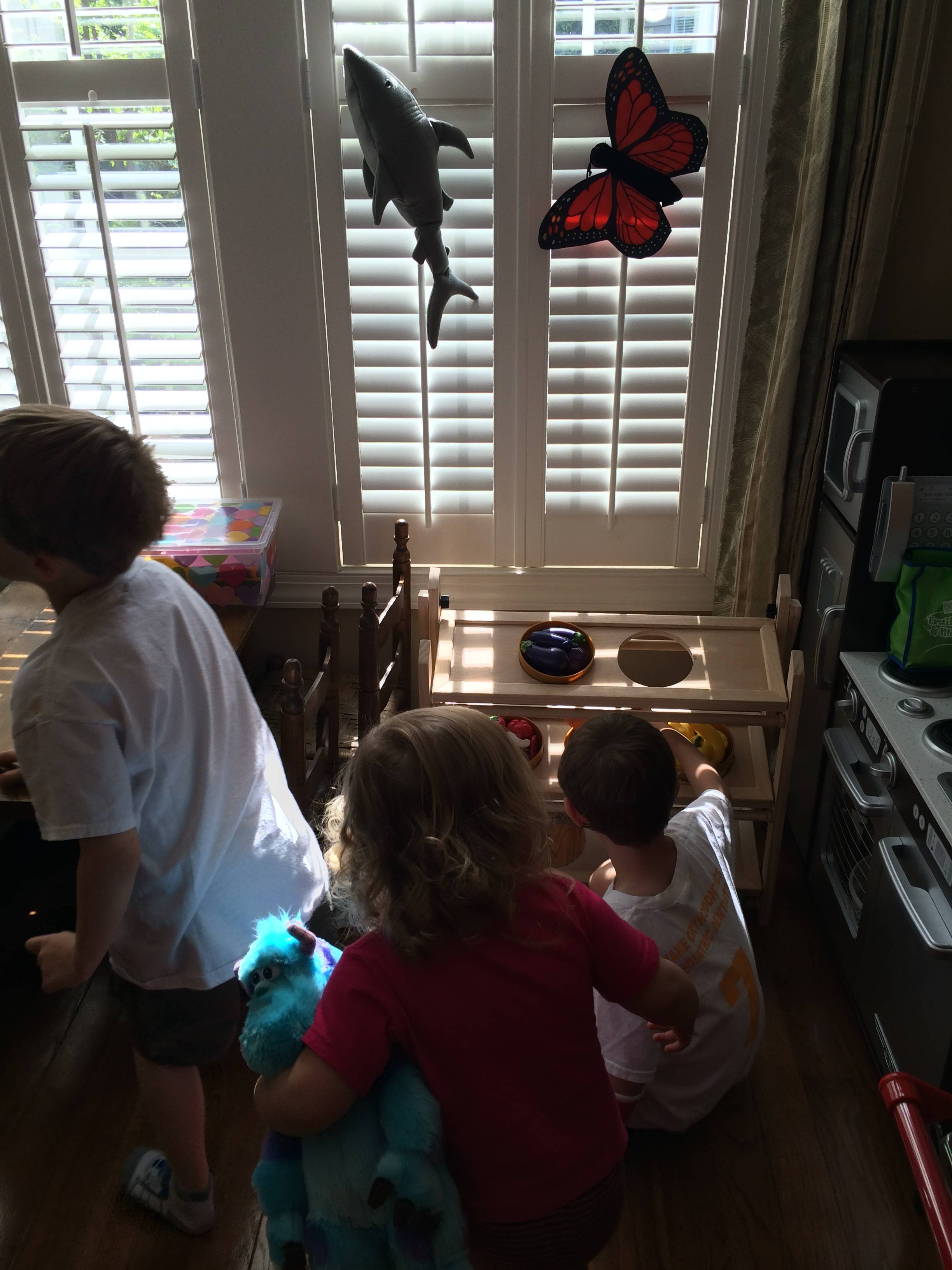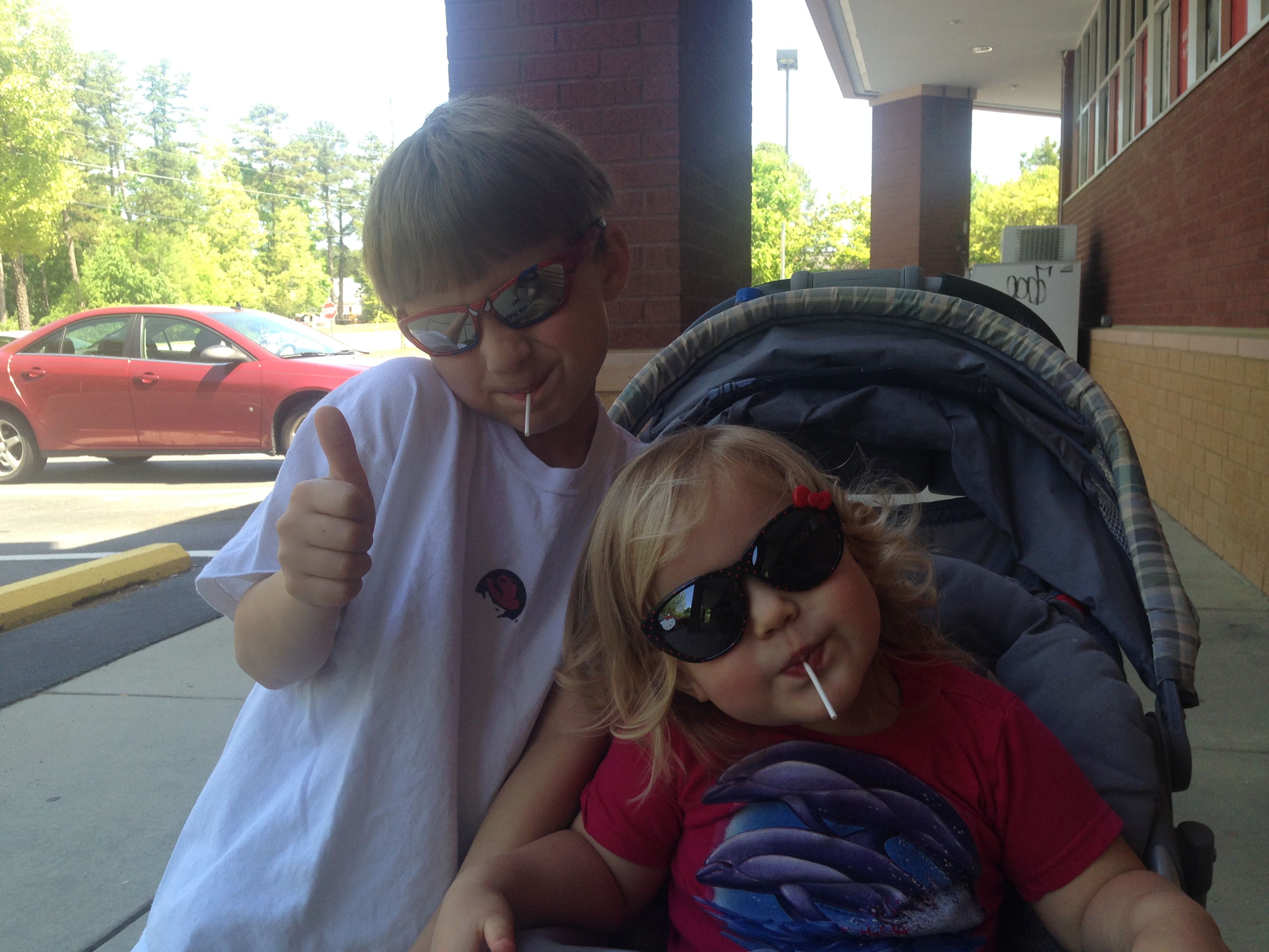 Today, Brian had a playdate with one of his good buddies from Root, Ladd! He was so excited to have Ladd come over for the first time, and a little surprised–Ladd arrived with a brand-new cast on his arm. He’d taken a tumble at school on Friday and it turned out, he’d broken it. Brian knew about hurt arms after his own hairline fracture last fall, and was happy to sign Ladd’s cast before anyone else at school. The boys played video games, staged a big Star Wars battle, and built many creations with Legos. I helped them make smoothies for a snack, and when they were checking out the play kitchen, Brandon surprised Brian with the fruit stand he’s been working on! He’d designed and built this custom set of fold-up shelves to hold the toy food baskets over the past few weeks. Brian was so happy and excited, he gave Brandon the biggest hug! He even seemed a little bit verklempt. 😉 All too soon, the playdate came to an end, and as Ladd was leaving through the garage, he and Brian managed to stall by riding bikes and plasma cars. Ladd’s little sister wanted to get in on the action, and borrowed Kendall’s plasma car–but poor Kendall had just woken up from her nap and did not take kindly to this turn of events! She howled so bad, we brought down the tricycle to try and distract her.. We didn’t expect her to really try to pedal it, since Brian couldn’t do it until well after his 3rd birthday, but she surprised us all! She just took off, forwards even, so quickly we could hardly strap Brian’s helmet on her! After Ladd left, we decided, if we wanted to start good helmet-wearing habits early with her, like we did with Brian, we had to get her a bike helmet, today! So, we took a quick trip over to Target to find a bike helmet for her, and we were happy to find a cute Hello Kitty one! I picked up a cute bathtub tea set for Kendall as well, figuring Brian might enjoy it as well, since he’s forever making us pretend drinks, ice cream, etc. in the bathtub. When we got home, Kendall tried out her new helmet, and rode the trike all around the garage! She was so proud of herself, and of course we were all so happy for her! Still a little amazed how she figured it out so quickly. 🙂 Brian cheered her on, being a really supportive big brother! I unveiled the tea set at bathtime, and as expected, both kids really enjoyed it! The included squirt-toy cupcakes were a nice touch. 😉