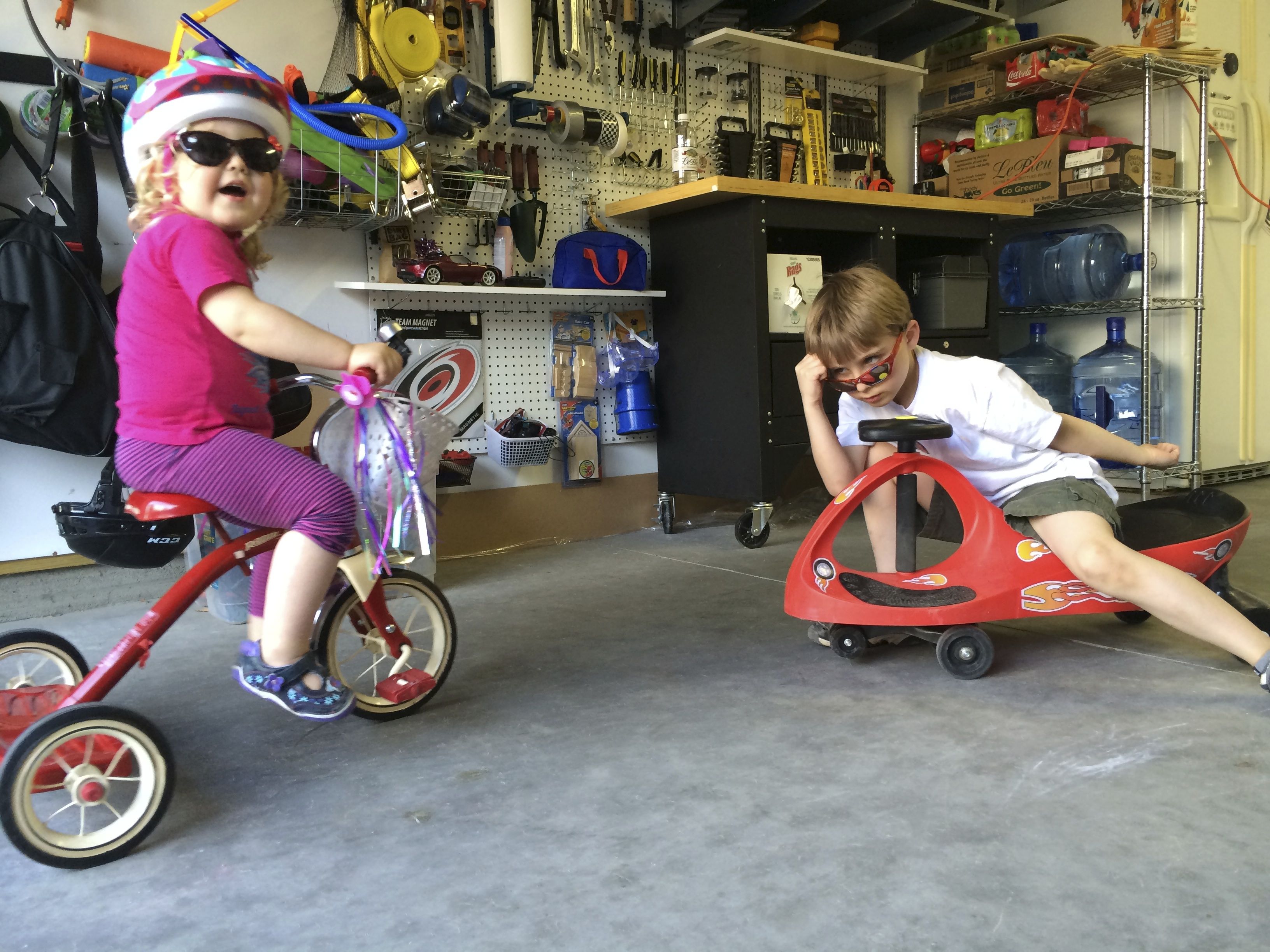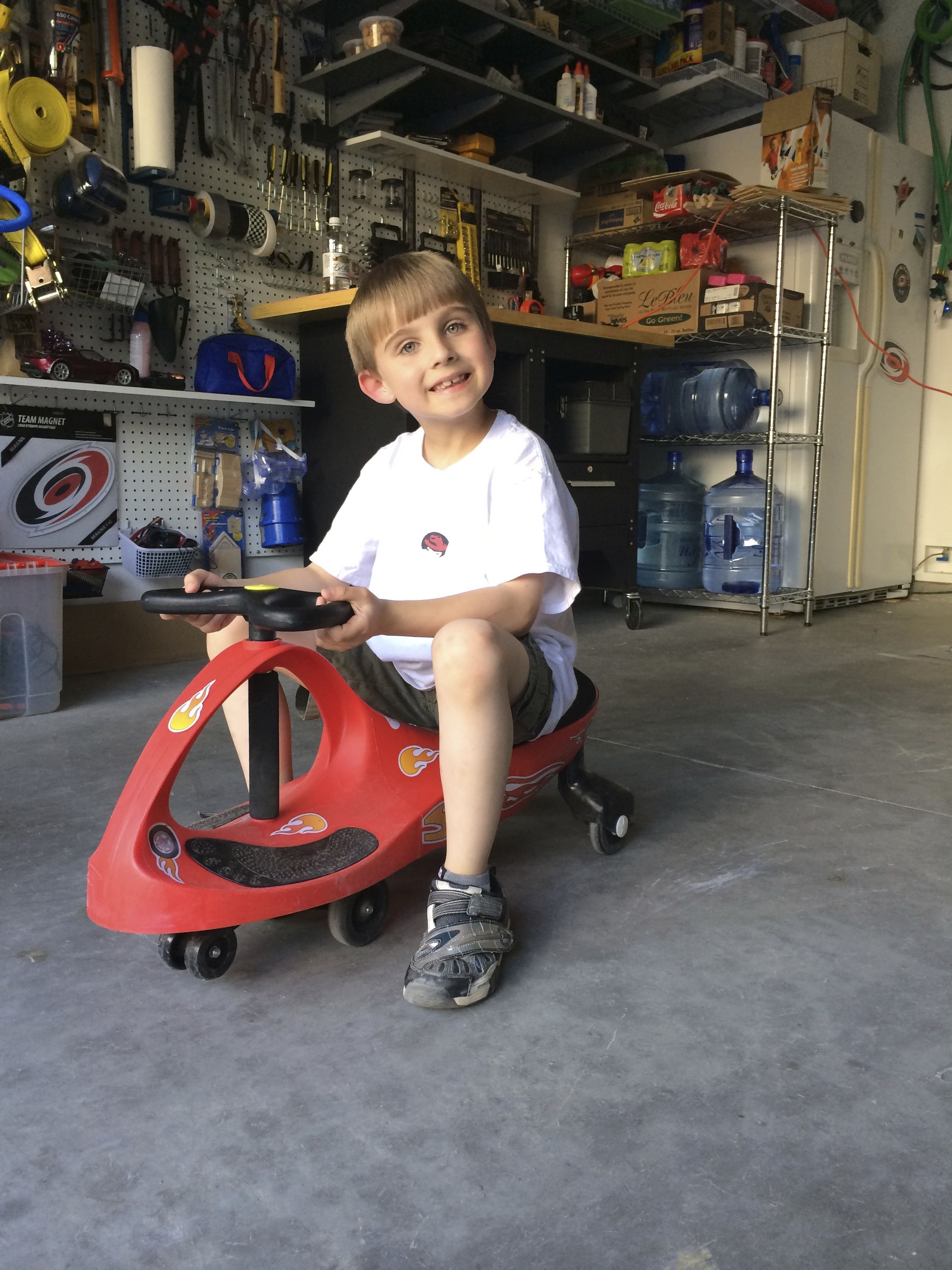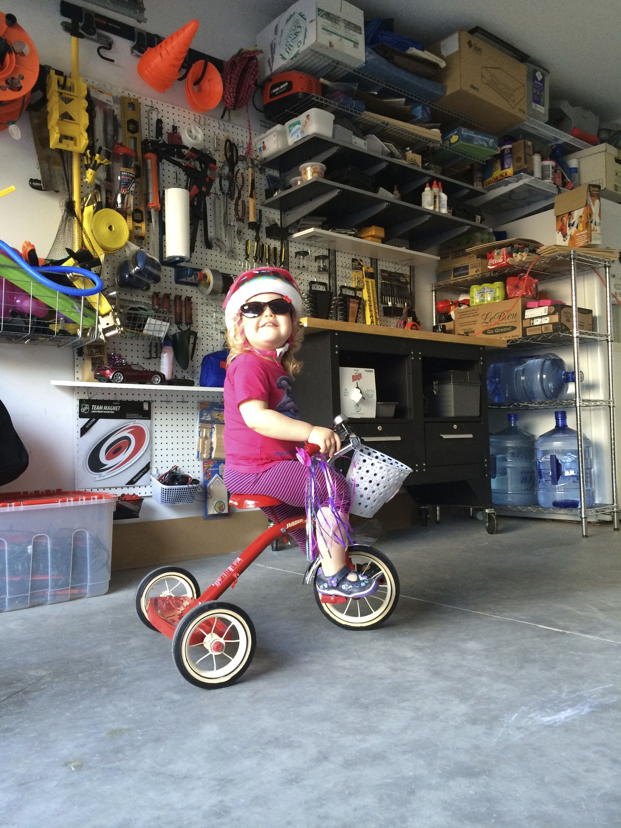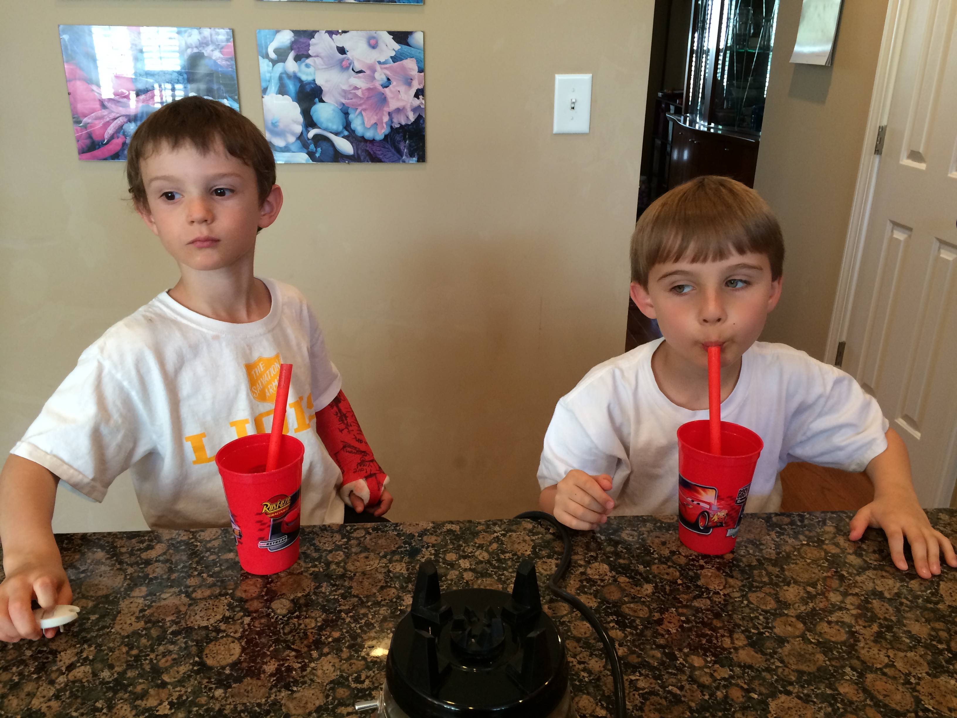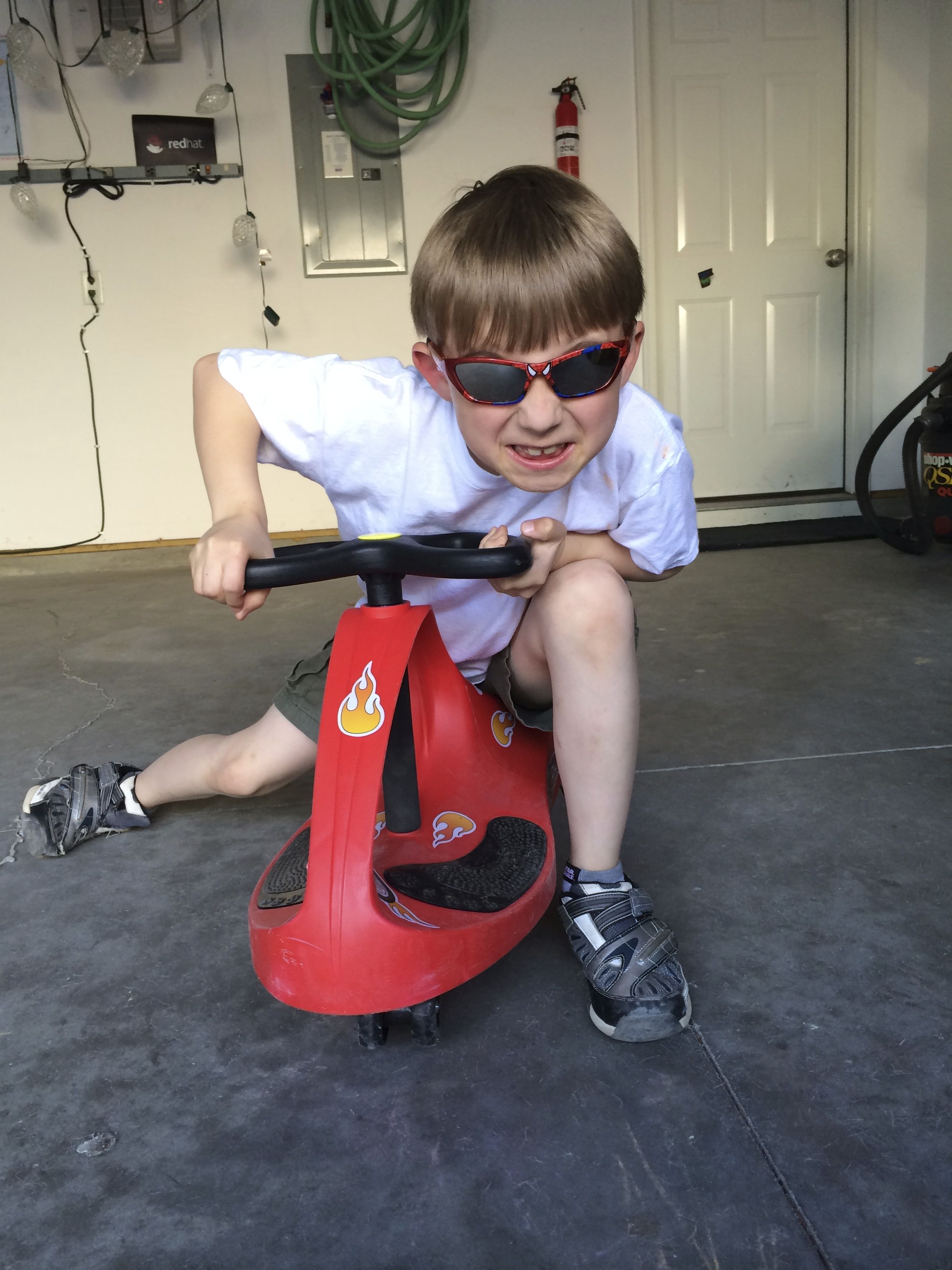 Today, Brian had a playdate with one of his good buddies from Root, Ladd! He was so excited to have Ladd come over for the first time, and a little surprised–Ladd arrived with a brand-new cast on his arm. He’d taken a tumble at school on Friday and it turned out, he’d broken it. Brian knew about hurt arms after his own hairline fracture last fall, and was happy to sign Ladd’s cast before anyone else at school. The boys played video games, staged a big Star Wars battle, and built many creations with Legos. I helped them make smoothies for a snack, and when they were checking out the play kitchen, Brandon surprised Brian with the fruit stand he’s been working on! He’d designed and built this custom set of fold-up shelves to hold the toy food baskets over the past few weeks. Brian was so happy and excited, he gave Brandon the biggest hug! He even seemed a little bit verklempt. 😉 All too soon, the playdate came to an end, and as Ladd was leaving through the garage, he and Brian managed to stall by riding bikes and plasma cars. Ladd’s little sister wanted to get in on the action, and borrowed Kendall’s plasma car–but poor Kendall had just woken up from her nap and did not take kindly to this turn of events! She howled so bad, we brought down the tricycle to try and distract her.. We didn’t expect her to really try to pedal it, since Brian couldn’t do it until well after his 3rd birthday, but she surprised us all! She just took off, forwards even, so quickly we could hardly strap Brian’s helmet on her! After Ladd left, we decided, if we wanted to start good helmet-wearing habits early with her, like we did with Brian, we had to get her a bike helmet, today! So, we took a quick trip over to Target to find a bike helmet for her, and we were happy to find a cute Hello Kitty one! I picked up a cute bathtub tea set for Kendall as well, figuring Brian might enjoy it as well, since he’s forever making us pretend drinks, ice cream, etc. in the bathtub. When we got home, Kendall tried out her new helmet, and rode the trike all around the garage! She was so proud of herself, and of course we were all so happy for her! Still a little amazed how she figured it out so quickly. 🙂 Brian cheered her on, being a really supportive big brother! I unveiled the tea set at bathtime, and as expected, both kids really enjoyed it! The included squirt-toy cupcakes were a nice touch. 😉