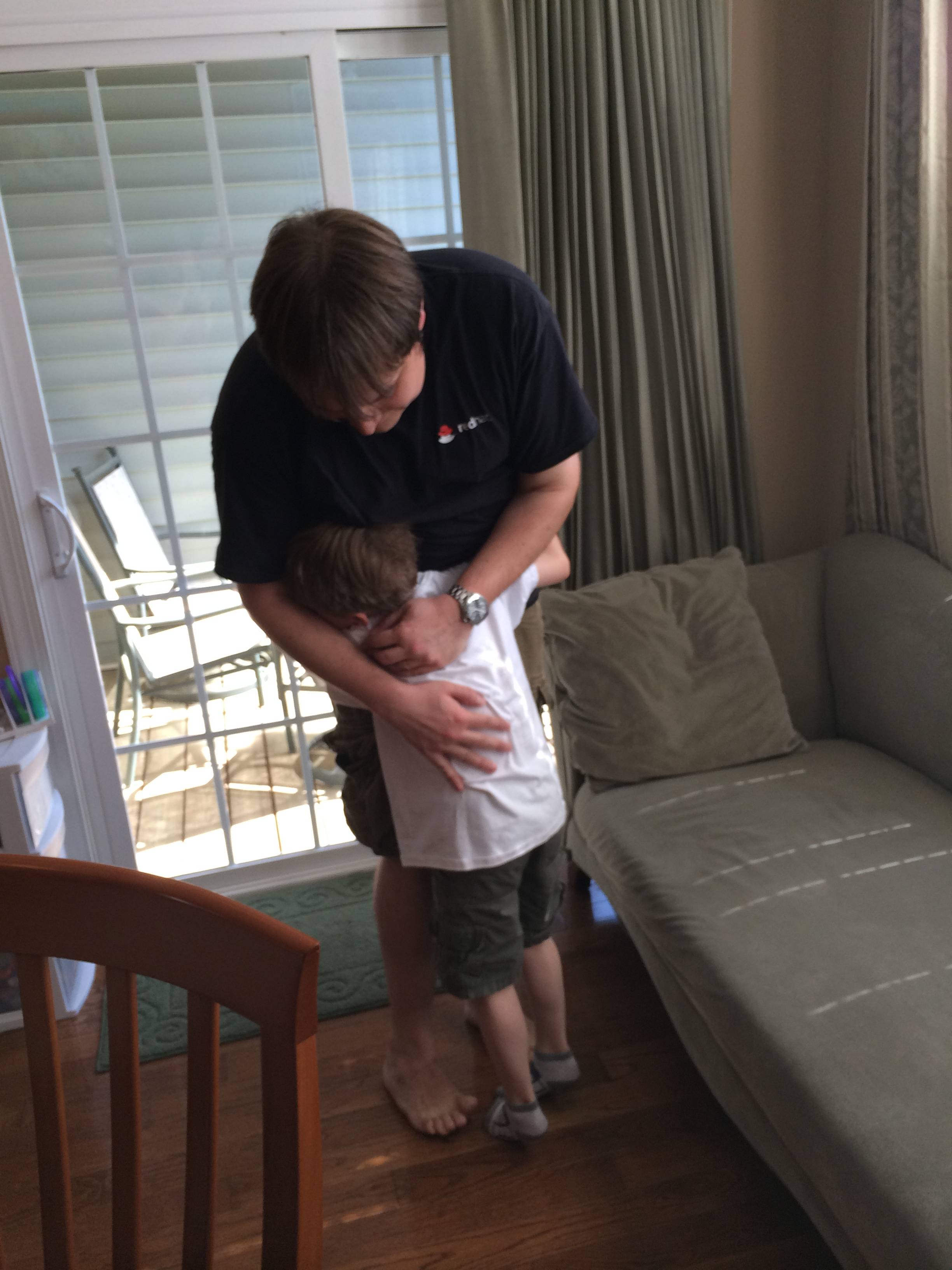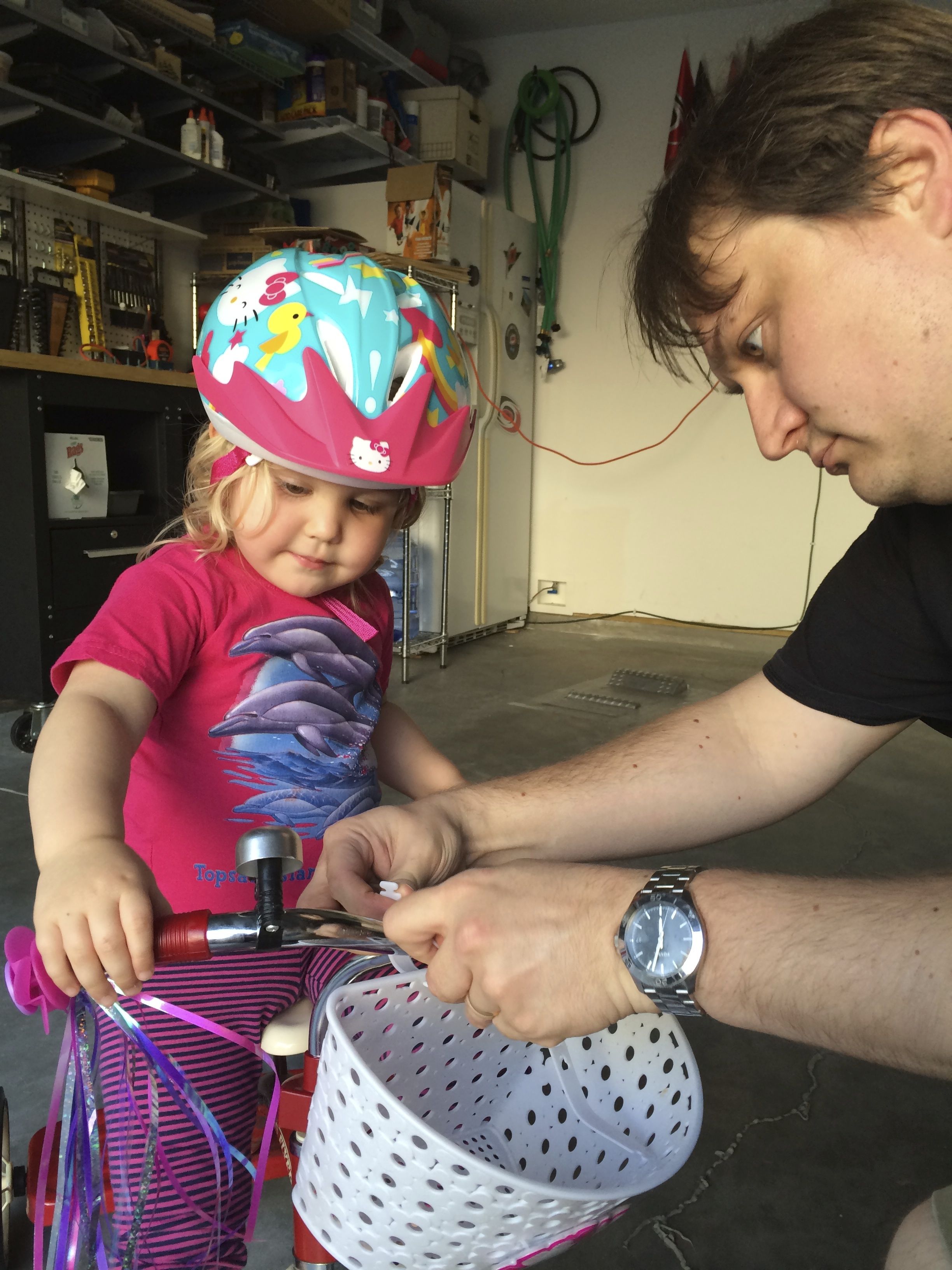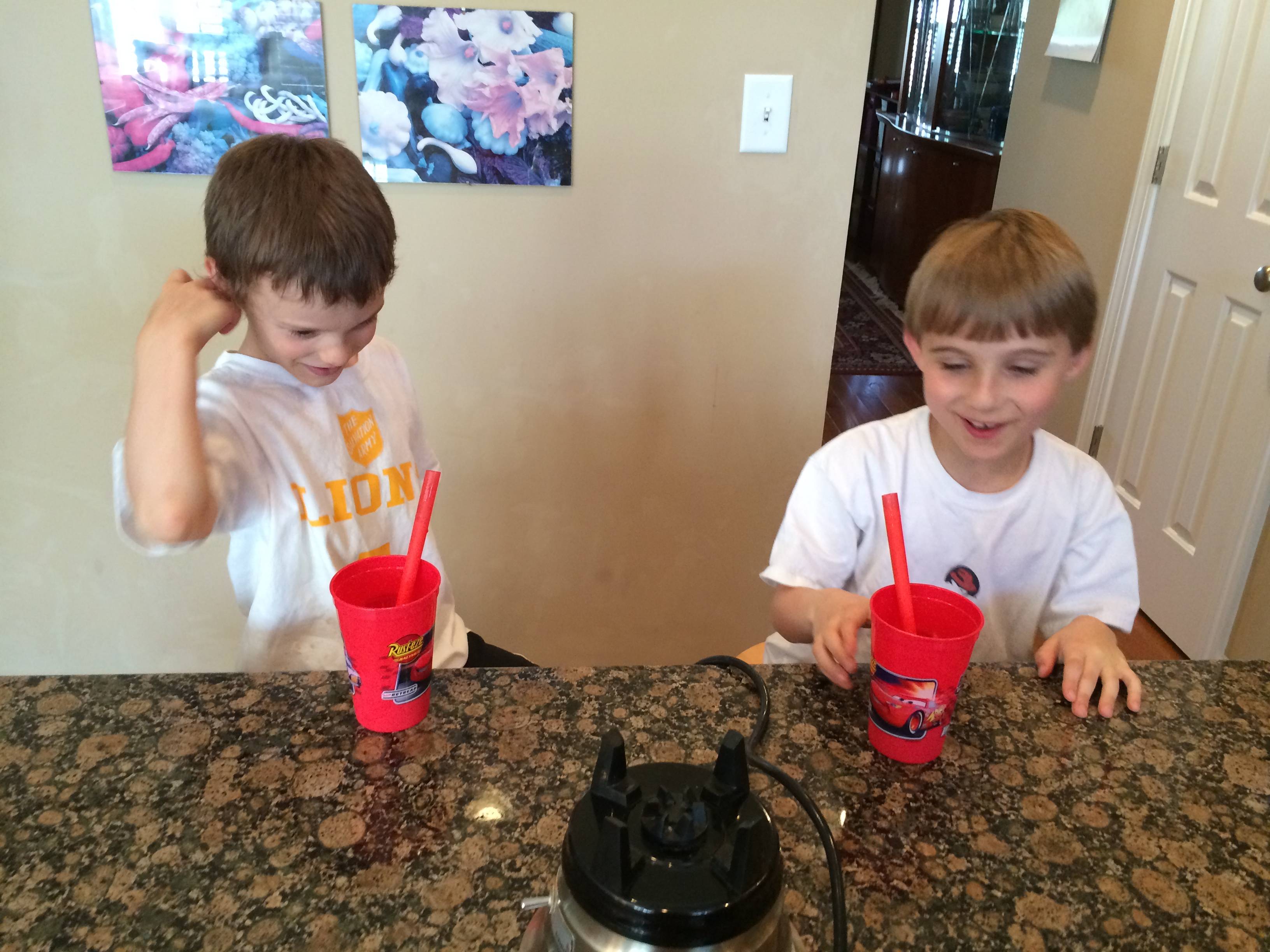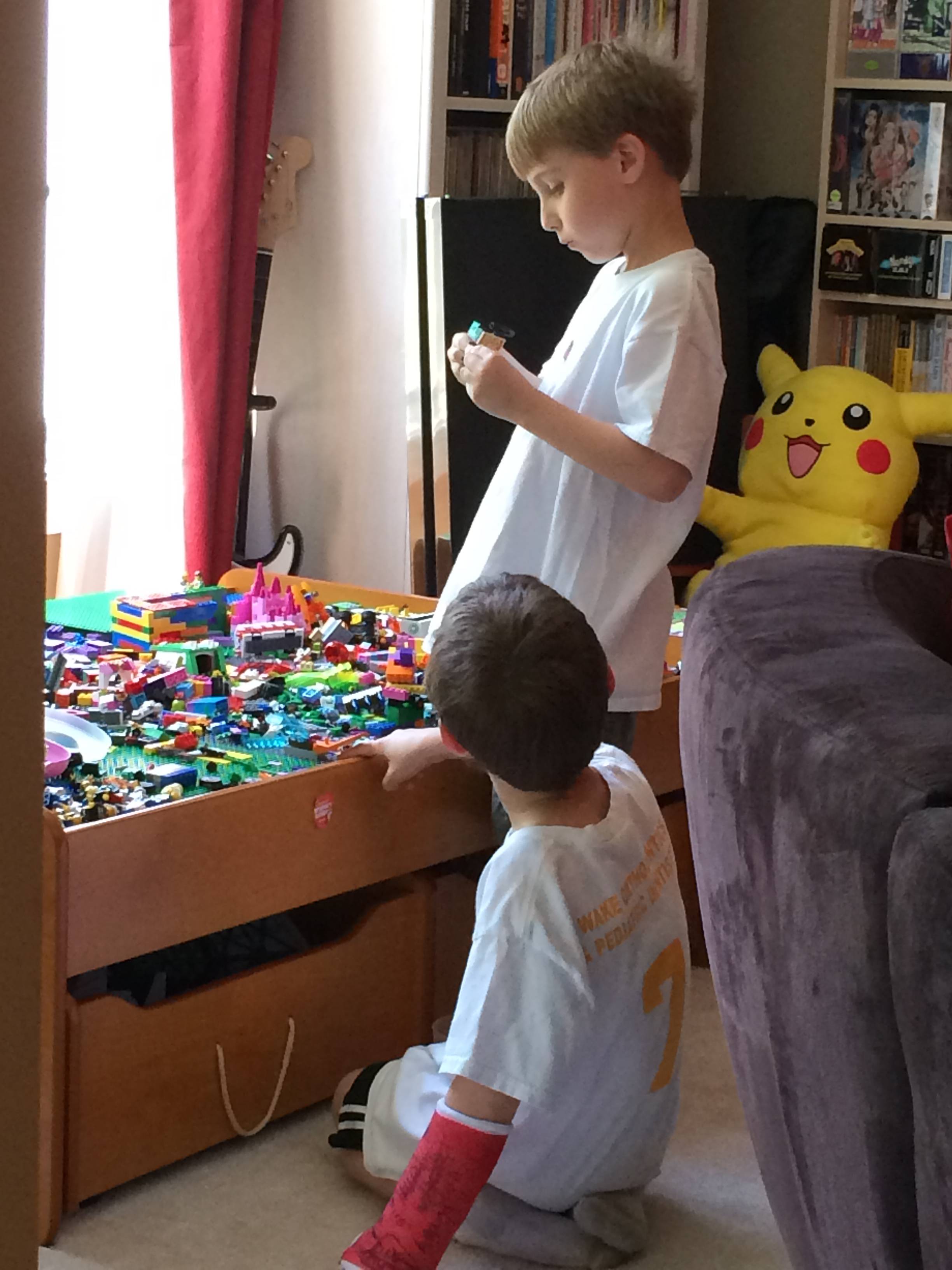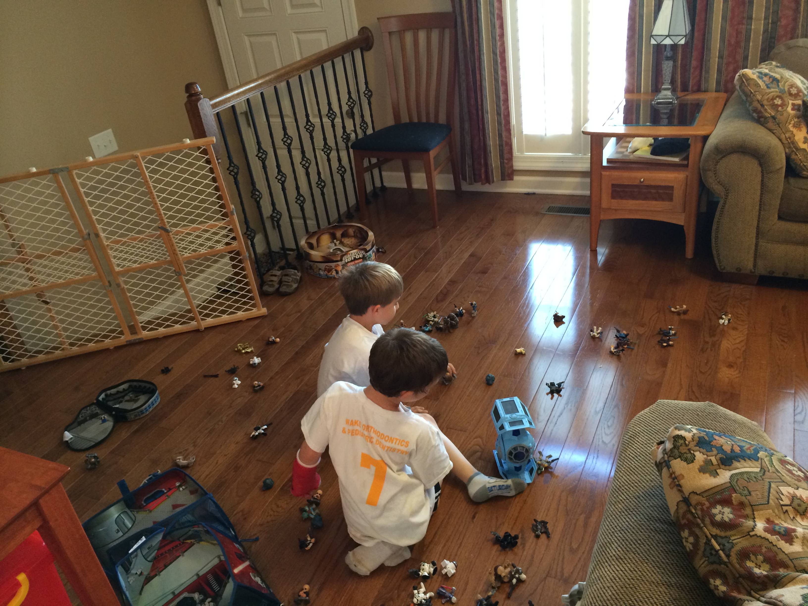 Today, Brian had a playdate with one of his good buddies from Root, Ladd! He was so excited to have Ladd come over for the first time, and a little surprised–Ladd arrived with a brand-new cast on his arm. He’d taken a tumble at school on Friday and it turned out, he’d broken it. Brian knew about hurt arms after his own hairline fracture last fall, and was happy to sign Ladd’s cast before anyone else at school. The boys played video games, staged a big Star Wars battle, and built many creations with Legos. I helped them make smoothies for a snack, and when they were checking out the play kitchen, Brandon surprised Brian with the fruit stand he’s been working on! He’d designed and built this custom set of fold-up shelves to hold the toy food baskets over the past few weeks. Brian was so happy and excited, he gave Brandon the biggest hug! He even seemed a little bit verklempt. 😉 All too soon, the playdate came to an end, and as Ladd was leaving through the garage, he and Brian managed to stall by riding bikes and plasma cars. Ladd’s little sister wanted to get in on the action, and borrowed Kendall’s plasma car–but poor Kendall had just woken up from her nap and did not take kindly to this turn of events! She howled so bad, we brought down the tricycle to try and distract her.. We didn’t expect her to really try to pedal it, since Brian couldn’t do it until well after his 3rd birthday, but she surprised us all! She just took off, forwards even, so quickly we could hardly strap Brian’s helmet on her! After Ladd left, we decided, if we wanted to start good helmet-wearing habits early with her, like we did with Brian, we had to get her a bike helmet, today! So, we took a quick trip over to Target to find a bike helmet for her, and we were happy to find a cute Hello Kitty one! I picked up a cute bathtub tea set for Kendall as well, figuring Brian might enjoy it as well, since he’s forever making us pretend drinks, ice cream, etc. in the bathtub. When we got home, Kendall tried out her new helmet, and rode the trike all around the garage! She was so proud of herself, and of course we were all so happy for her! Still a little amazed how she figured it out so quickly. 🙂 Brian cheered her on, being a really supportive big brother! I unveiled the tea set at bathtime, and as expected, both kids really enjoyed it! The included squirt-toy cupcakes were a nice touch. 😉