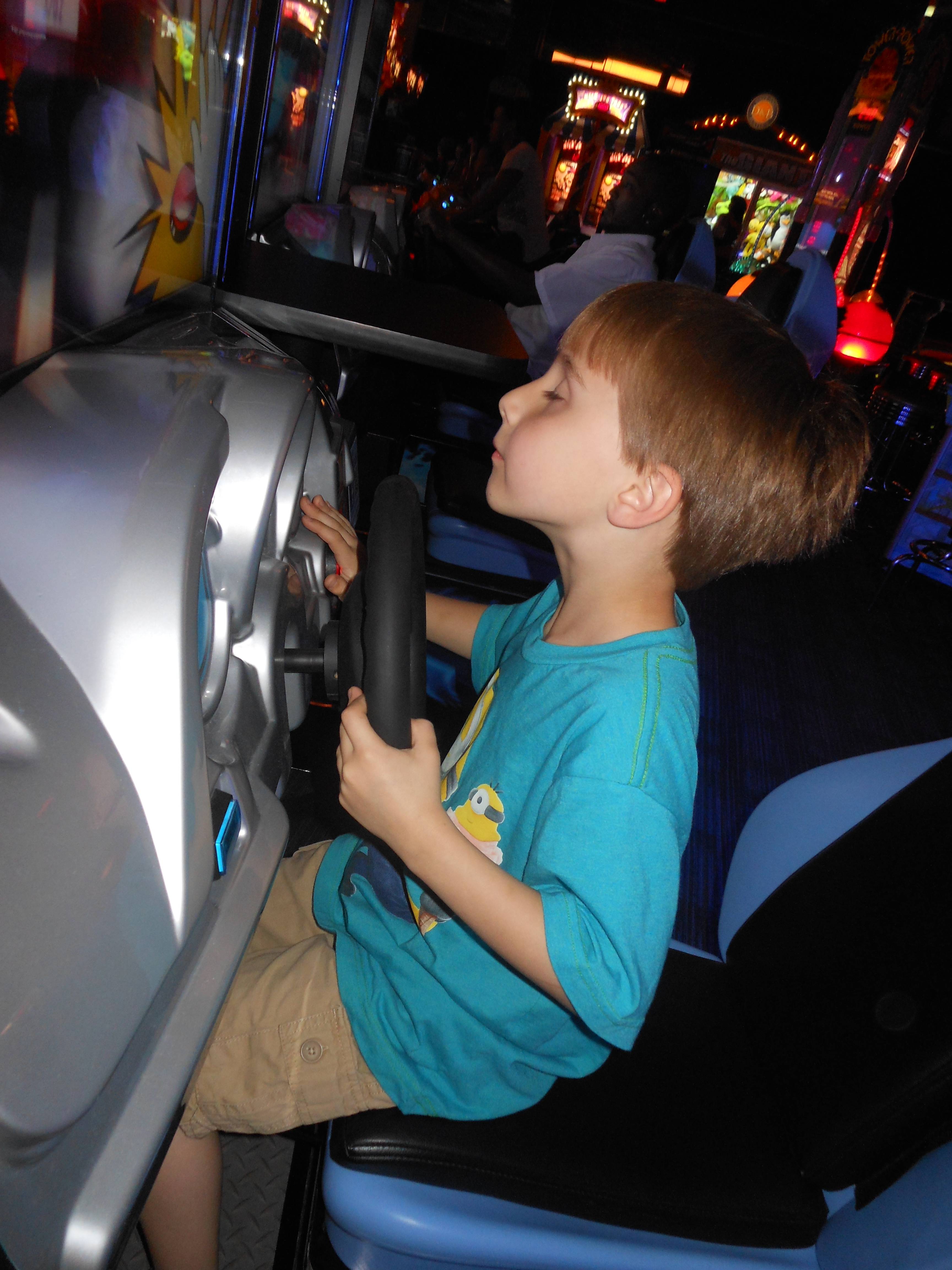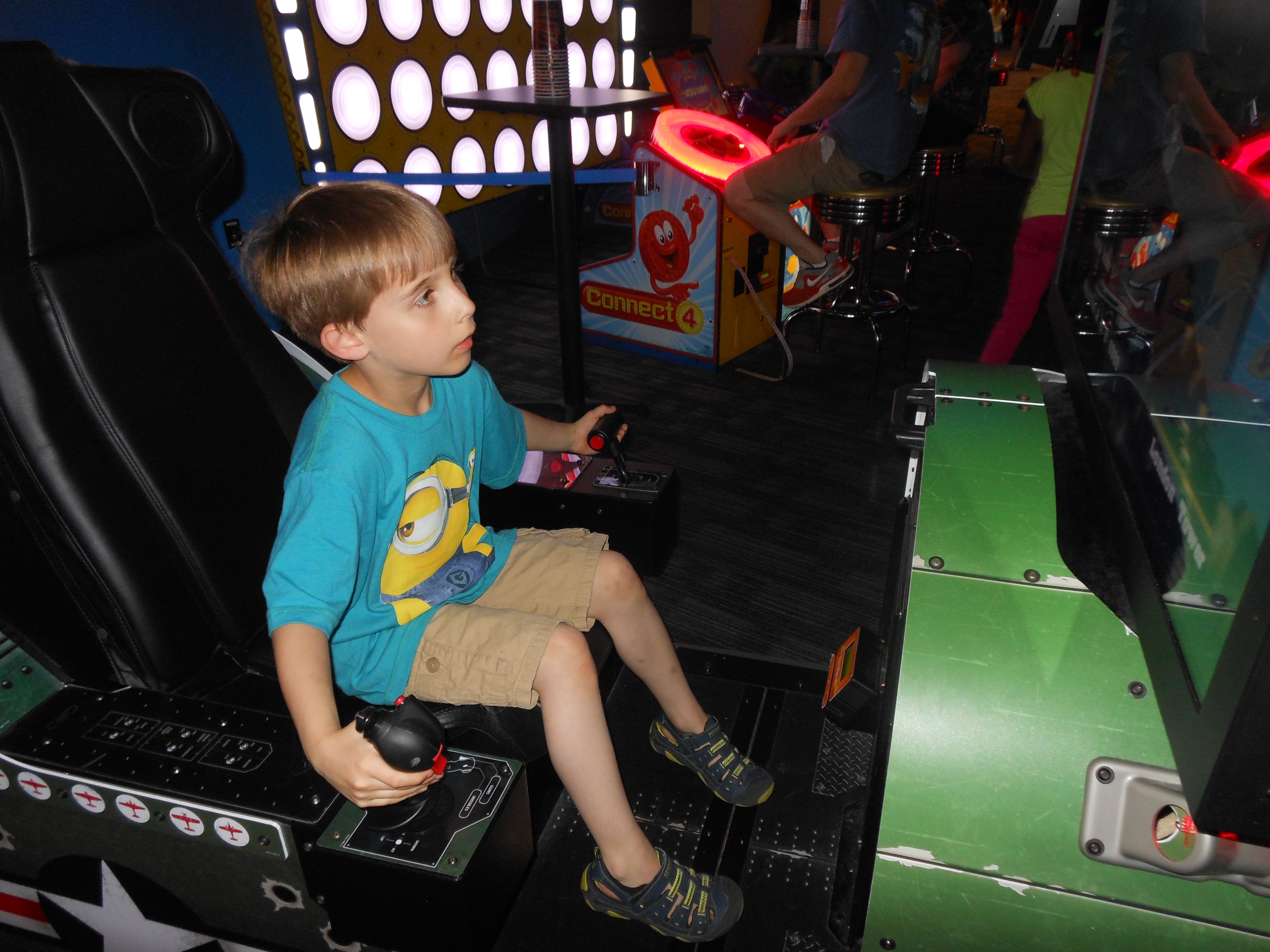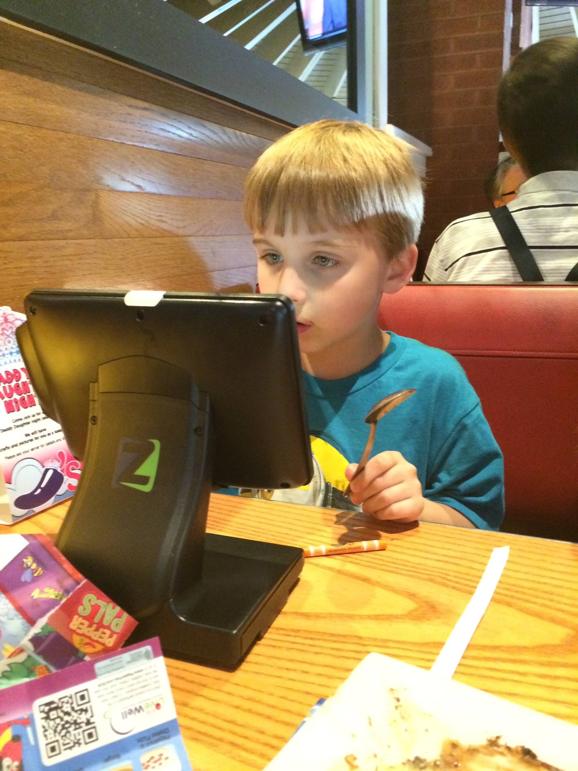 Today was a pretty fun one for Brian!  He got to visit the Lego store to get his friend Eli a birthday present, and he built a pretty epic ship while he was there.  He went to Eli’s party at Dave & Buster’s, his first time going there.  He had a blast, by all accounts.  🙂  After the boys were back home, we decided to keep the party going and head to Chili’s for dinner tonight (Brian’s choice!)  Chili’s now has these tablets on each table, where you can pay your bill, order dessert, and.. play games.  So basically, the boys were in their own world during dinner. 😉  (Update, 8/31/14:  I now curse these darn things, despite the convenience–this started Brian’s obsession with Field Runners, what he calls his “army game”.)  We did get the awesome-as-usual chocolate lava cake for dessert–Kendall was definitely a fan!