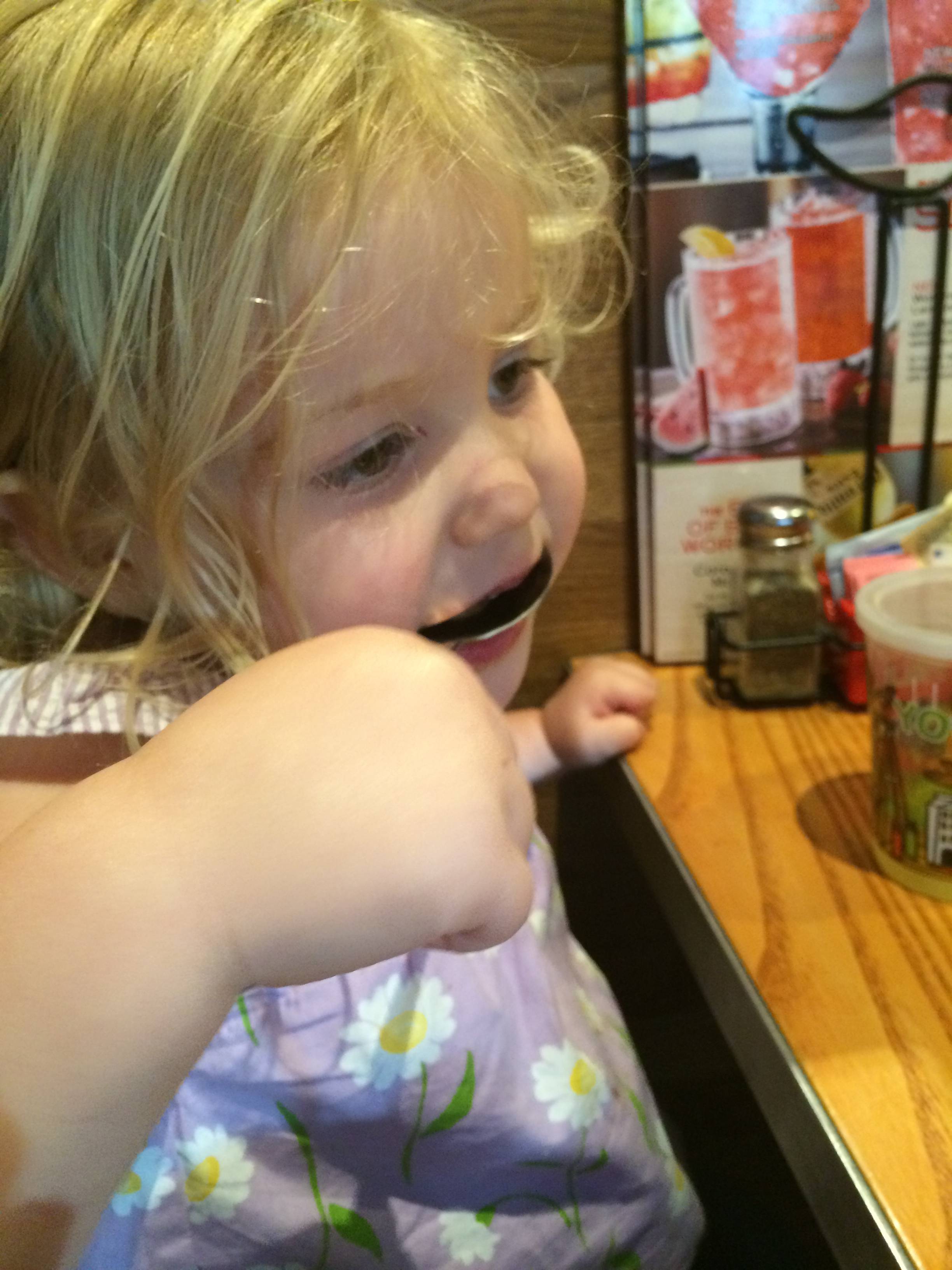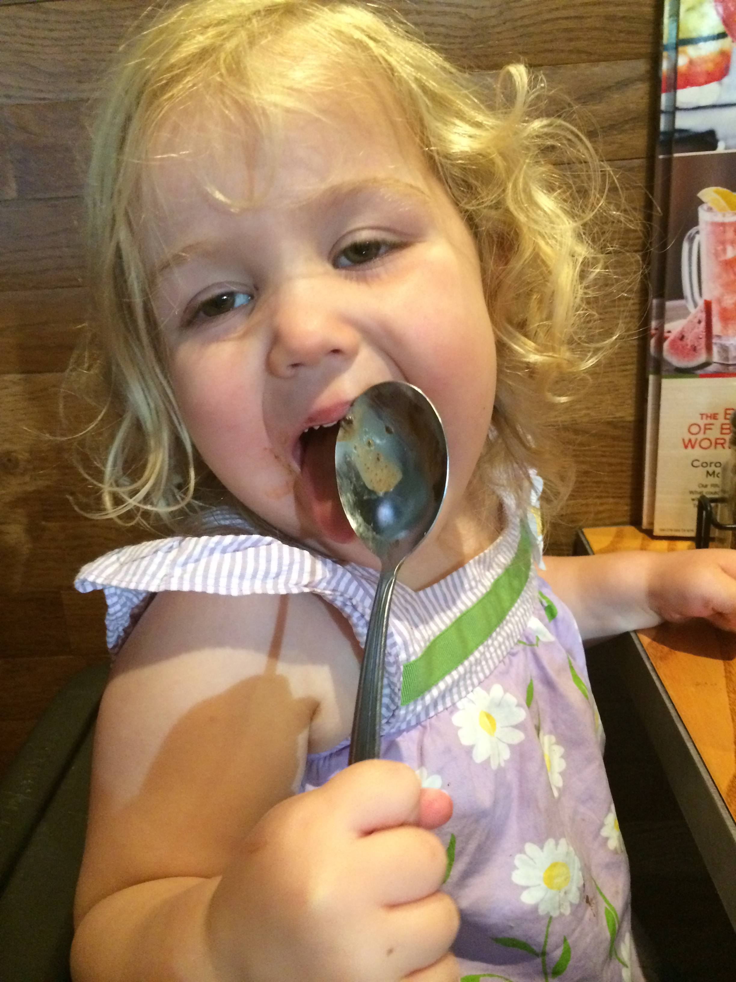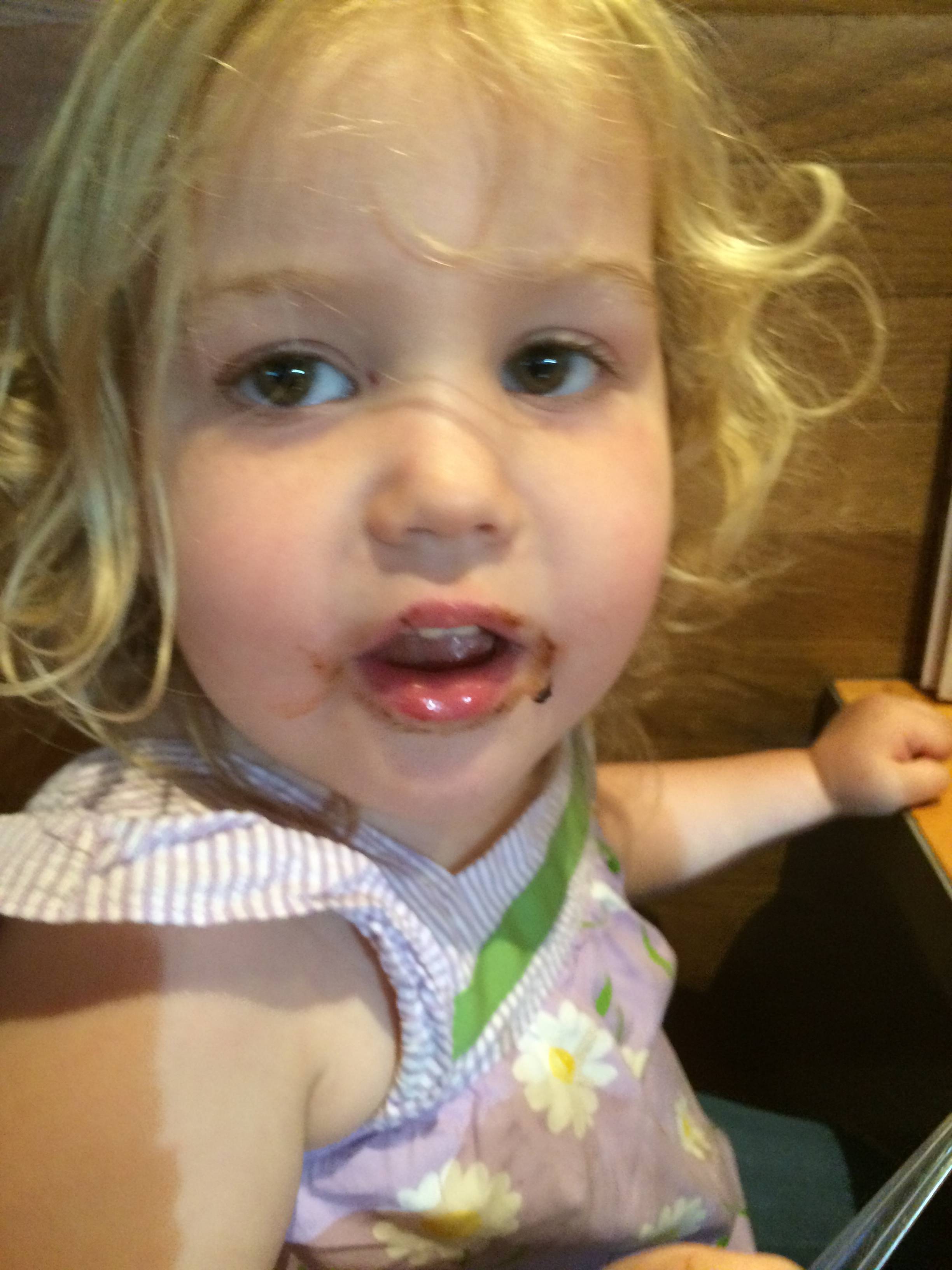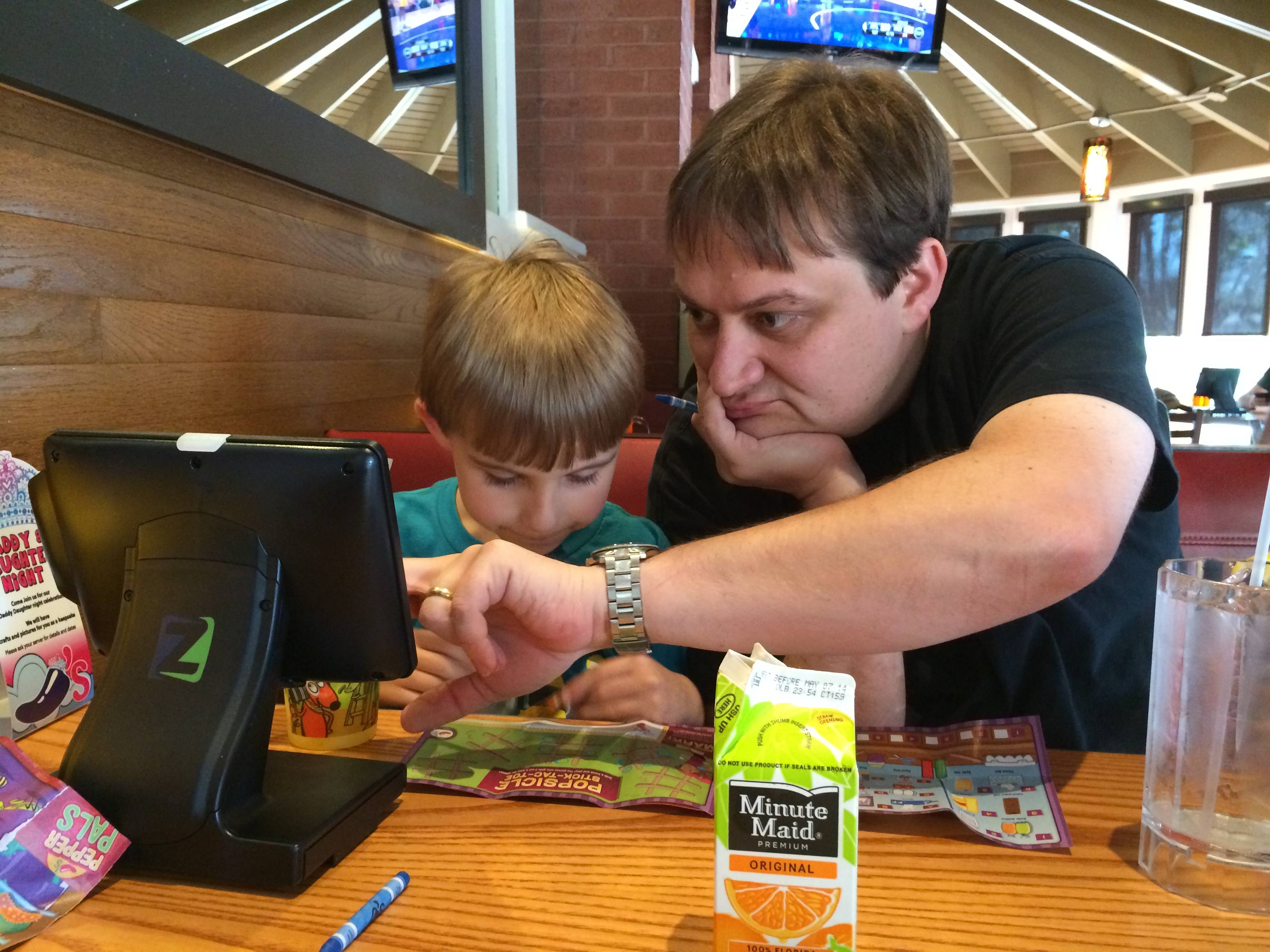 Today was a pretty fun one for Brian!  He got to visit the Lego store to get his friend Eli a birthday present, and he built a pretty epic ship while he was there.  He went to Eli’s party at Dave & Buster’s, his first time going there.  He had a blast, by all accounts.  🙂  After the boys were back home, we decided to keep the party going and head to Chili’s for dinner tonight (Brian’s choice!)  Chili’s now has these tablets on each table, where you can pay your bill, order dessert, and.. play games.  So basically, the boys were in their own world during dinner. 😉  (Update, 8/31/14:  I now curse these darn things, despite the convenience–this started Brian’s obsession with Field Runners, what he calls his “army game”.)  We did get the awesome-as-usual chocolate lava cake for dessert–Kendall was definitely a fan!