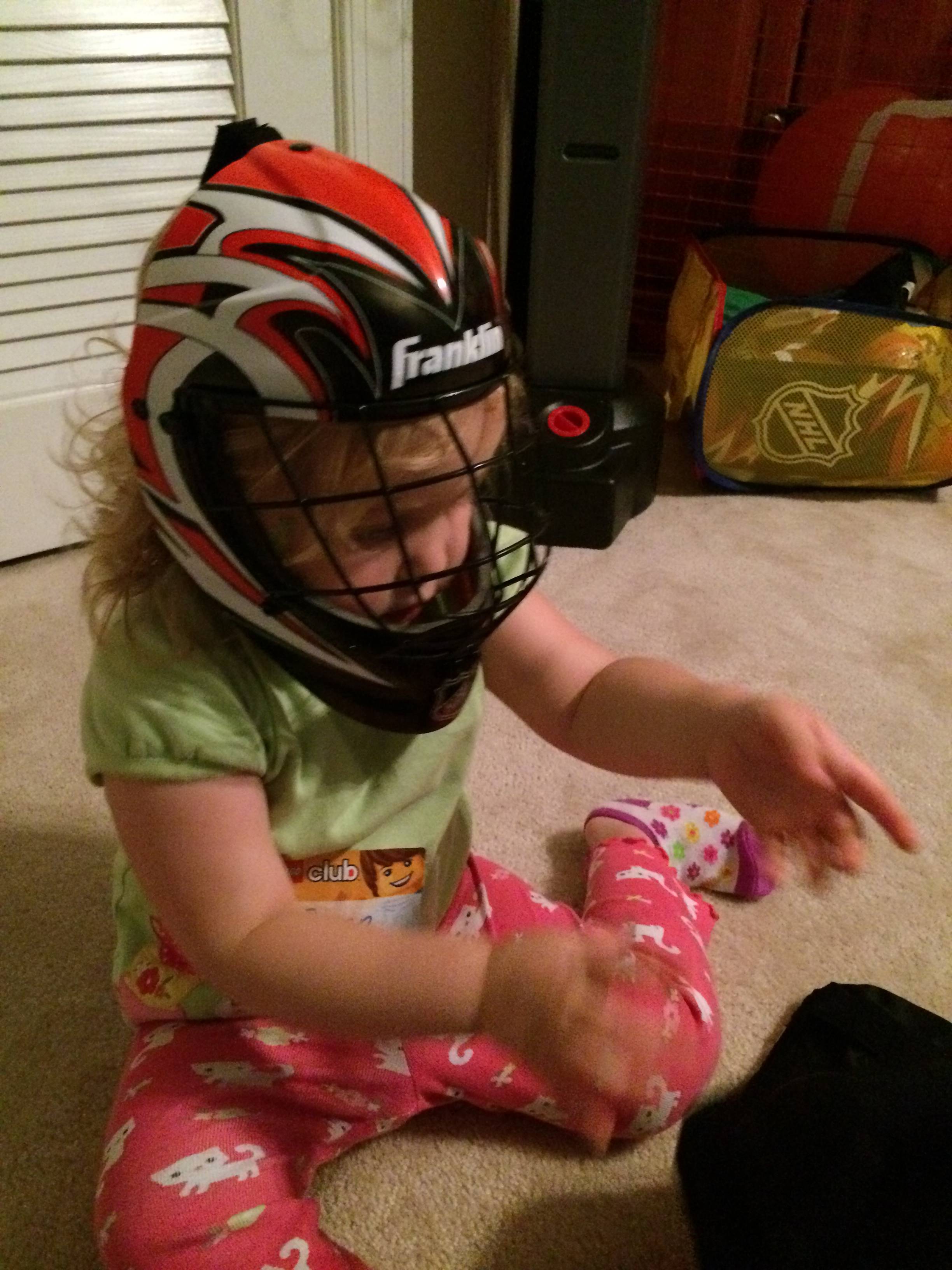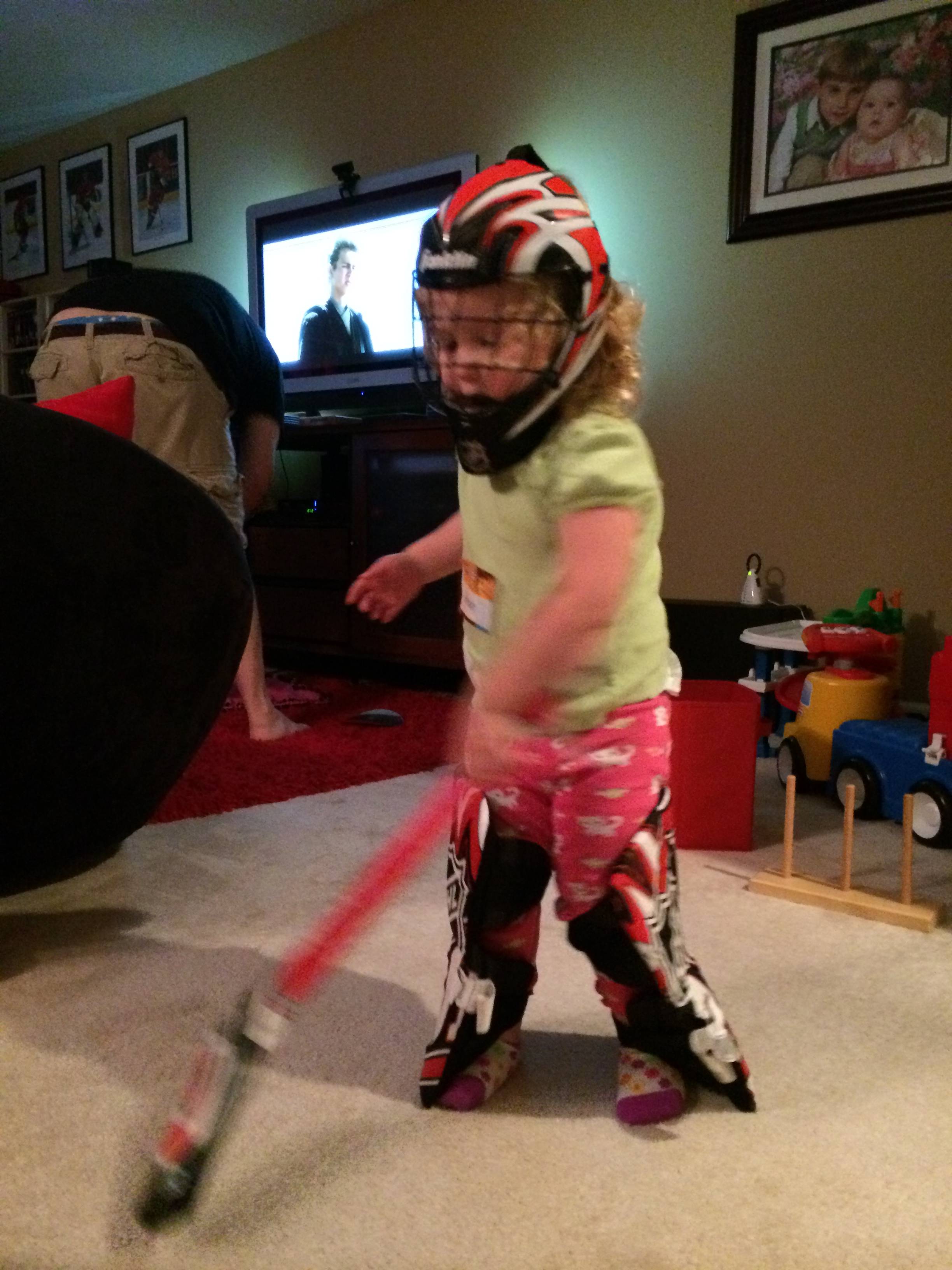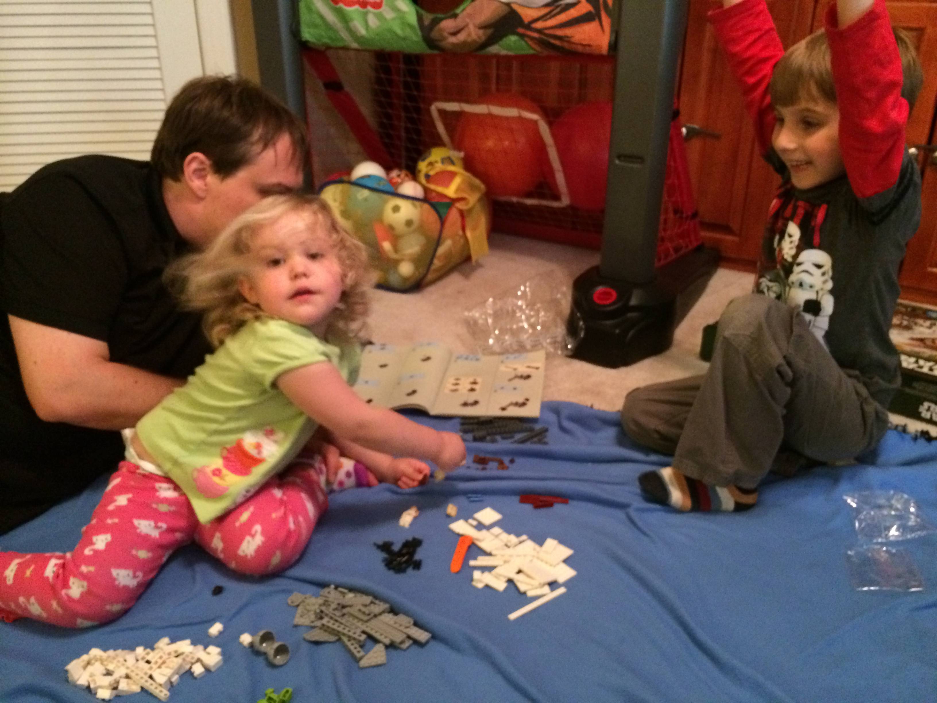 Today we didn’t celebrate Cinco de Mayo in any sort of traditional way–instead, we kept the Star Wars fun going and let Brian start building his Republic Gunship! We were surprised to find that it came with nine bags of parts and two instruction books–this is going to be a whopper of a build! Not to be outdone, Kendall decided to put on Brian’s play hockey gear and run circles around Brian’s building area. 🙂