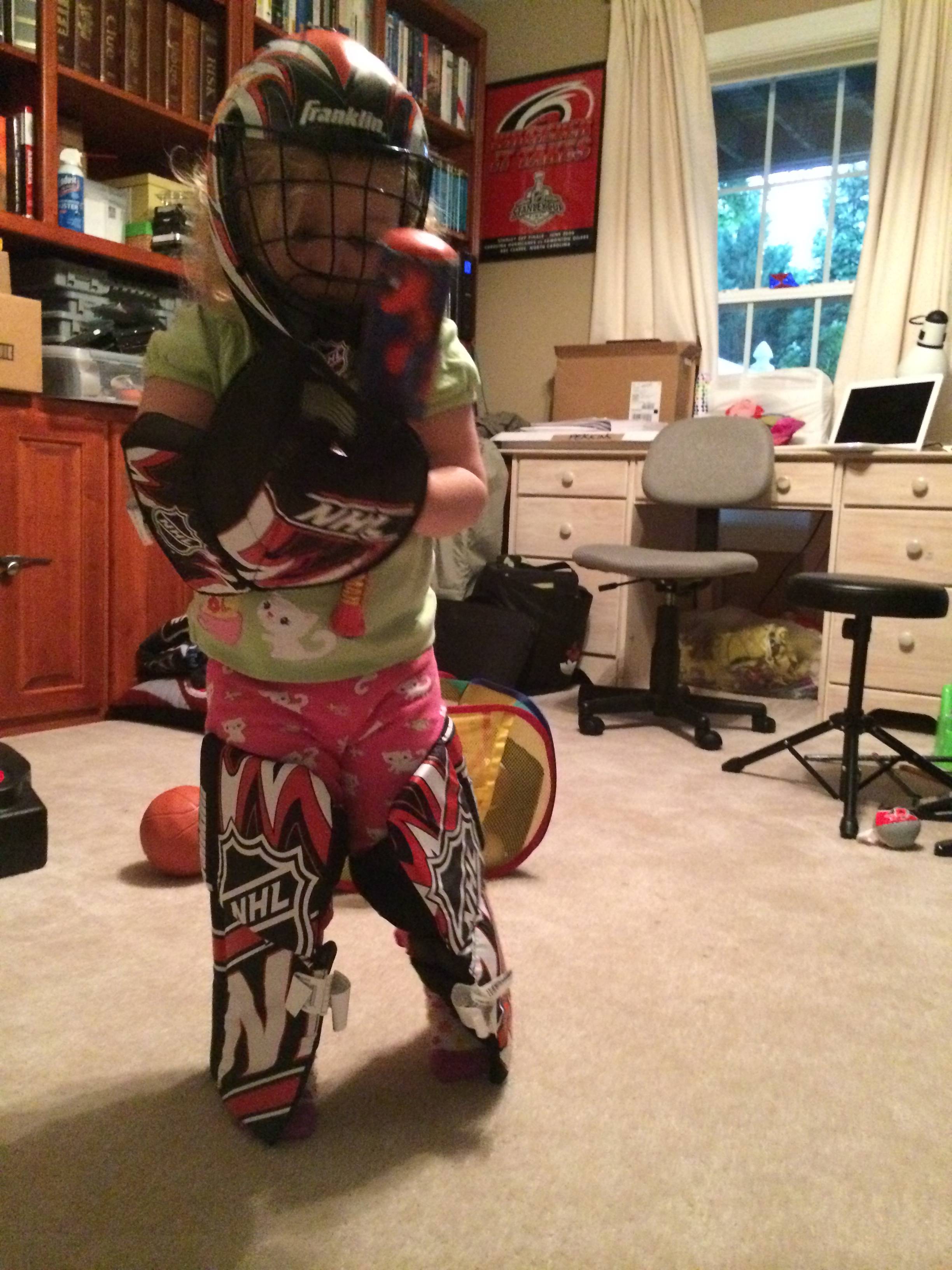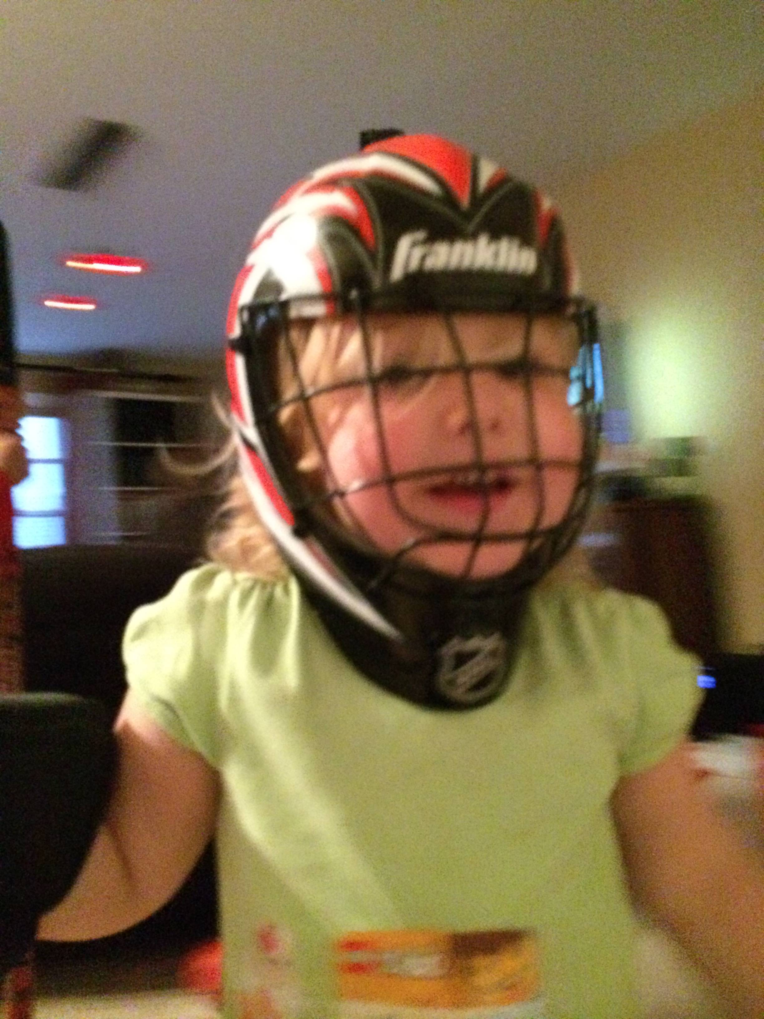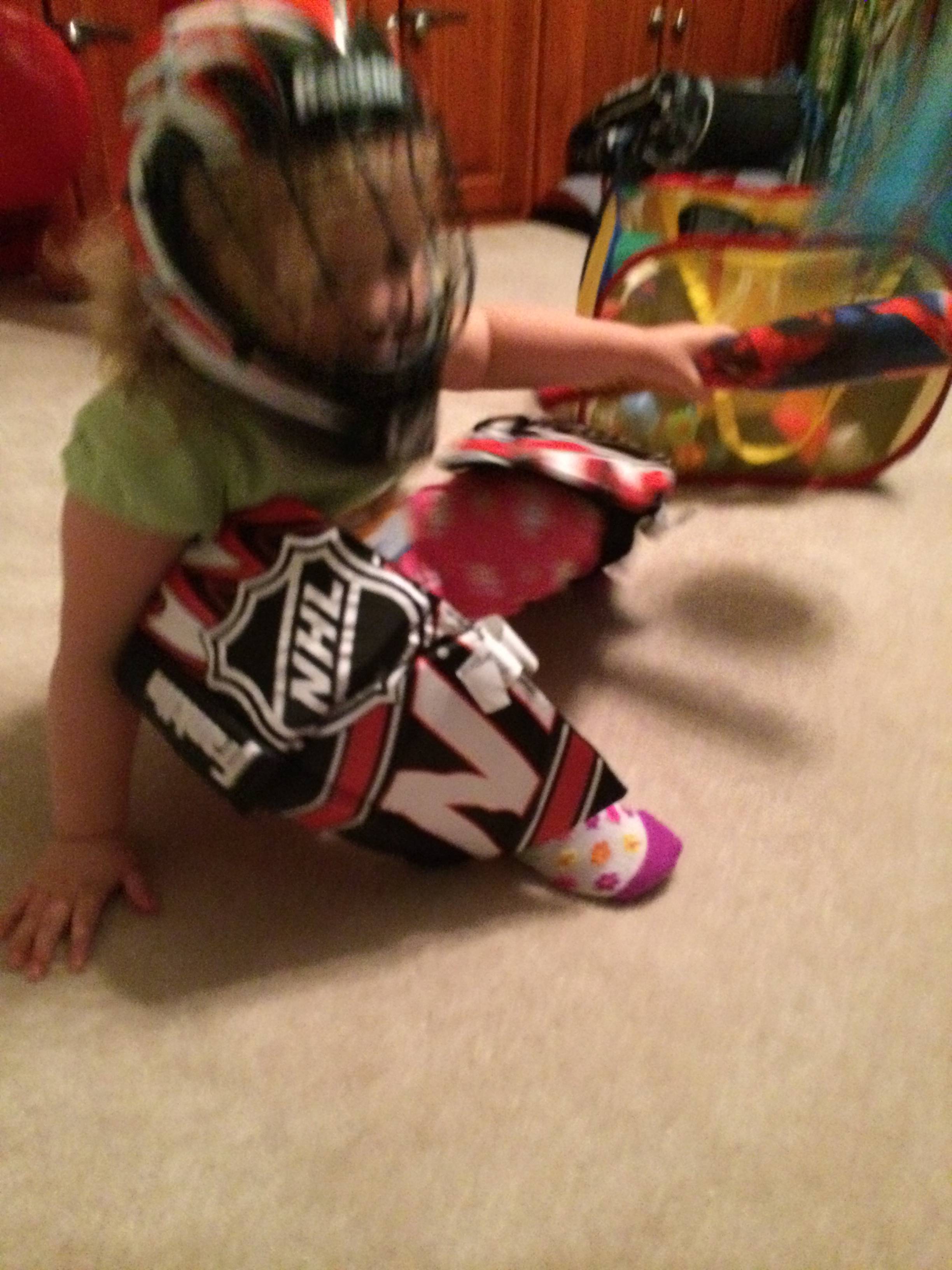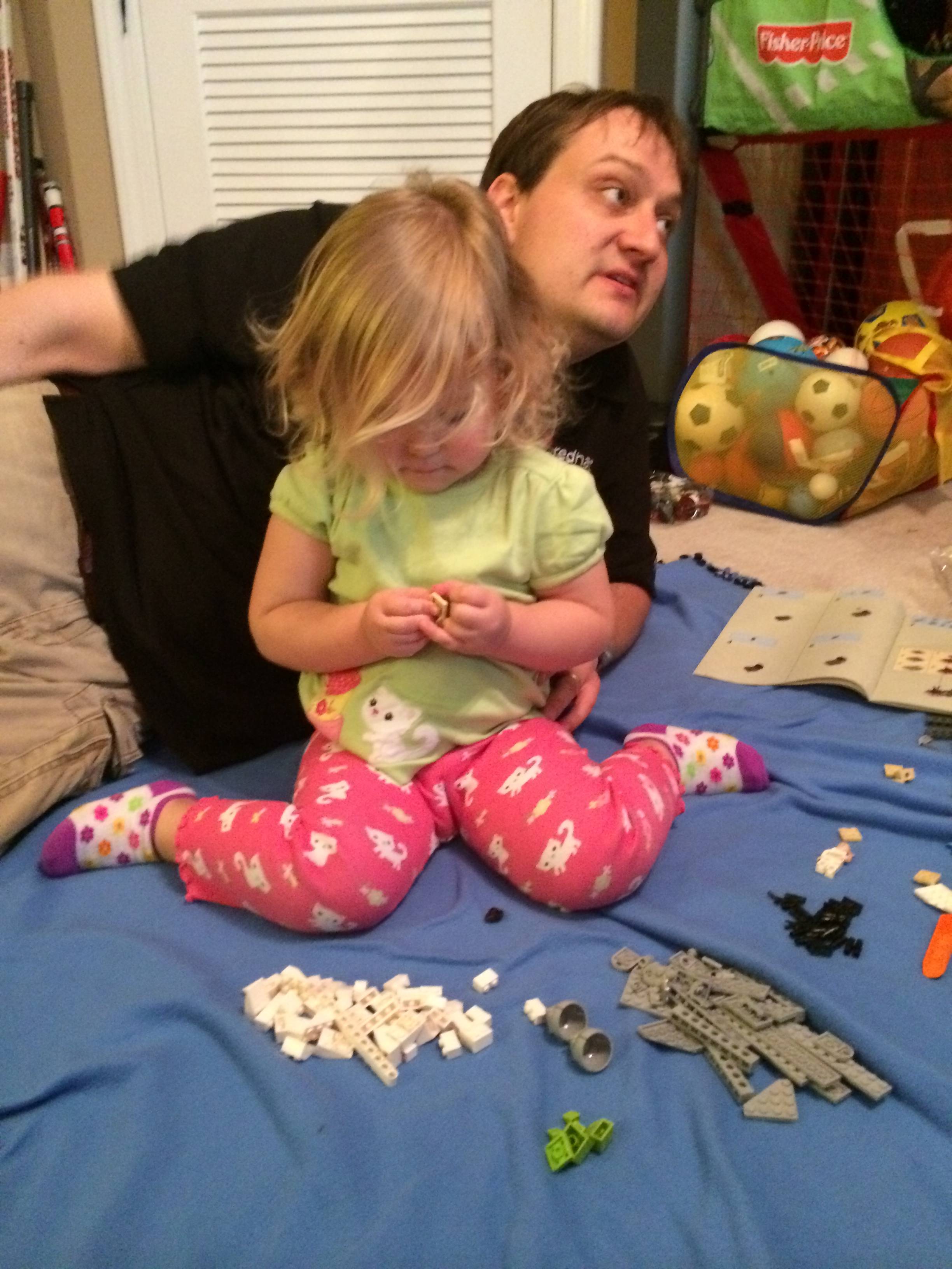 Today we didn’t celebrate Cinco de Mayo in any sort of traditional way–instead, we kept the Star Wars fun going and let Brian start building his Republic Gunship! We were surprised to find that it came with nine bags of parts and two instruction books–this is going to be a whopper of a build! Not to be outdone, Kendall decided to put on Brian’s play hockey gear and run circles around Brian’s building area. 🙂