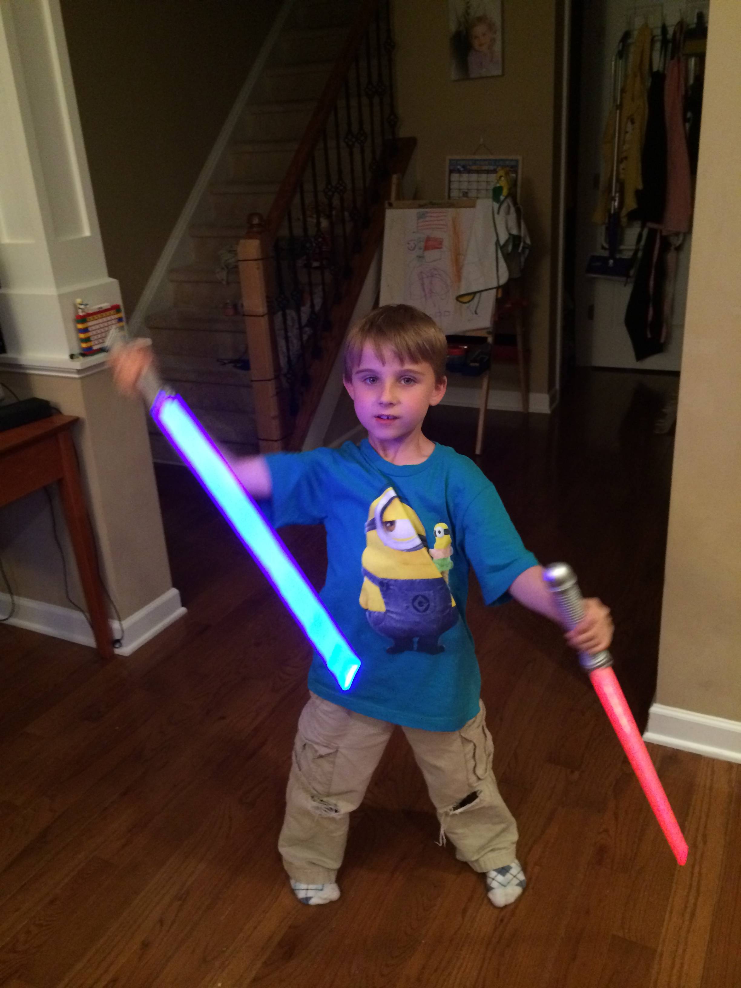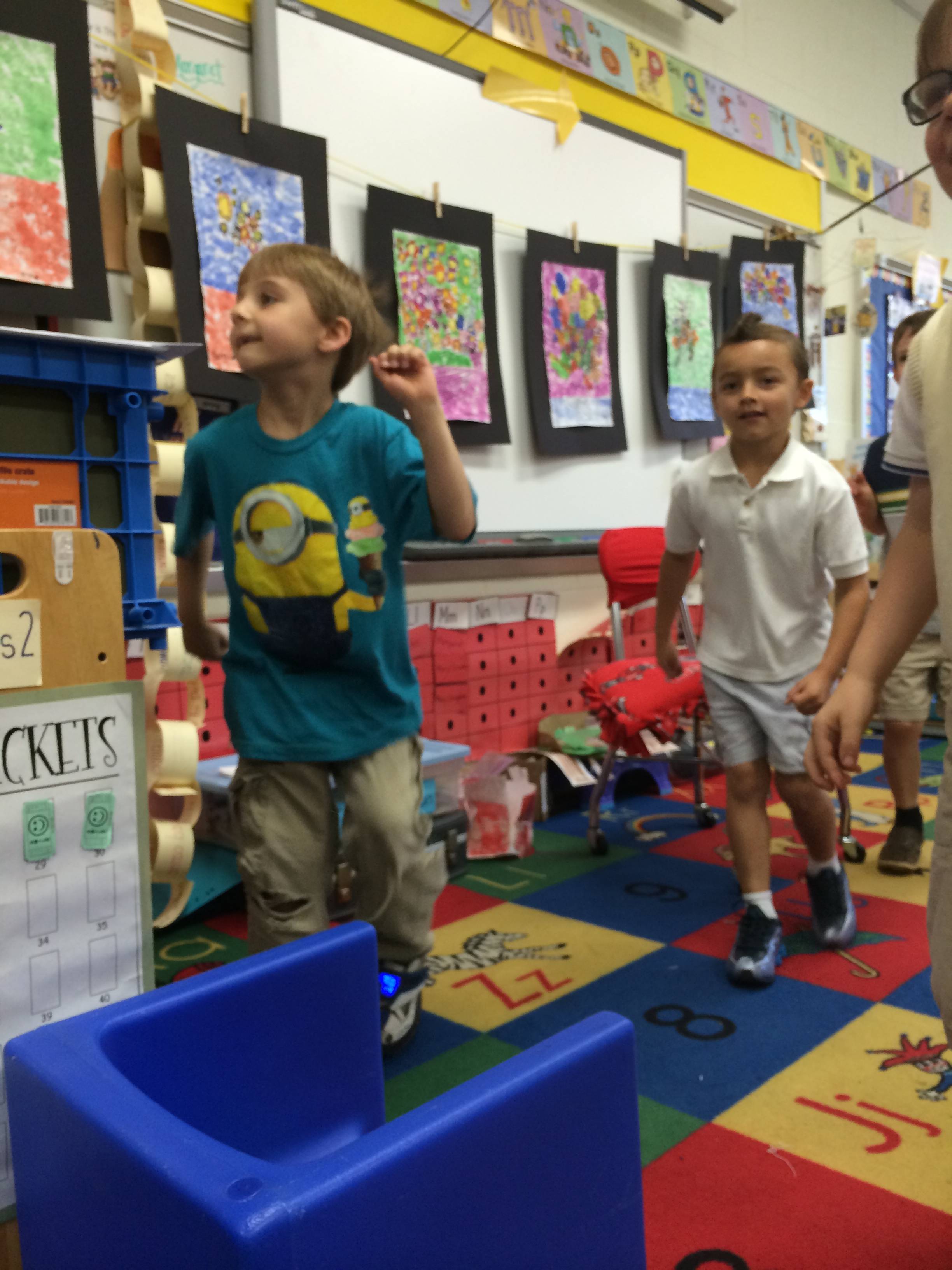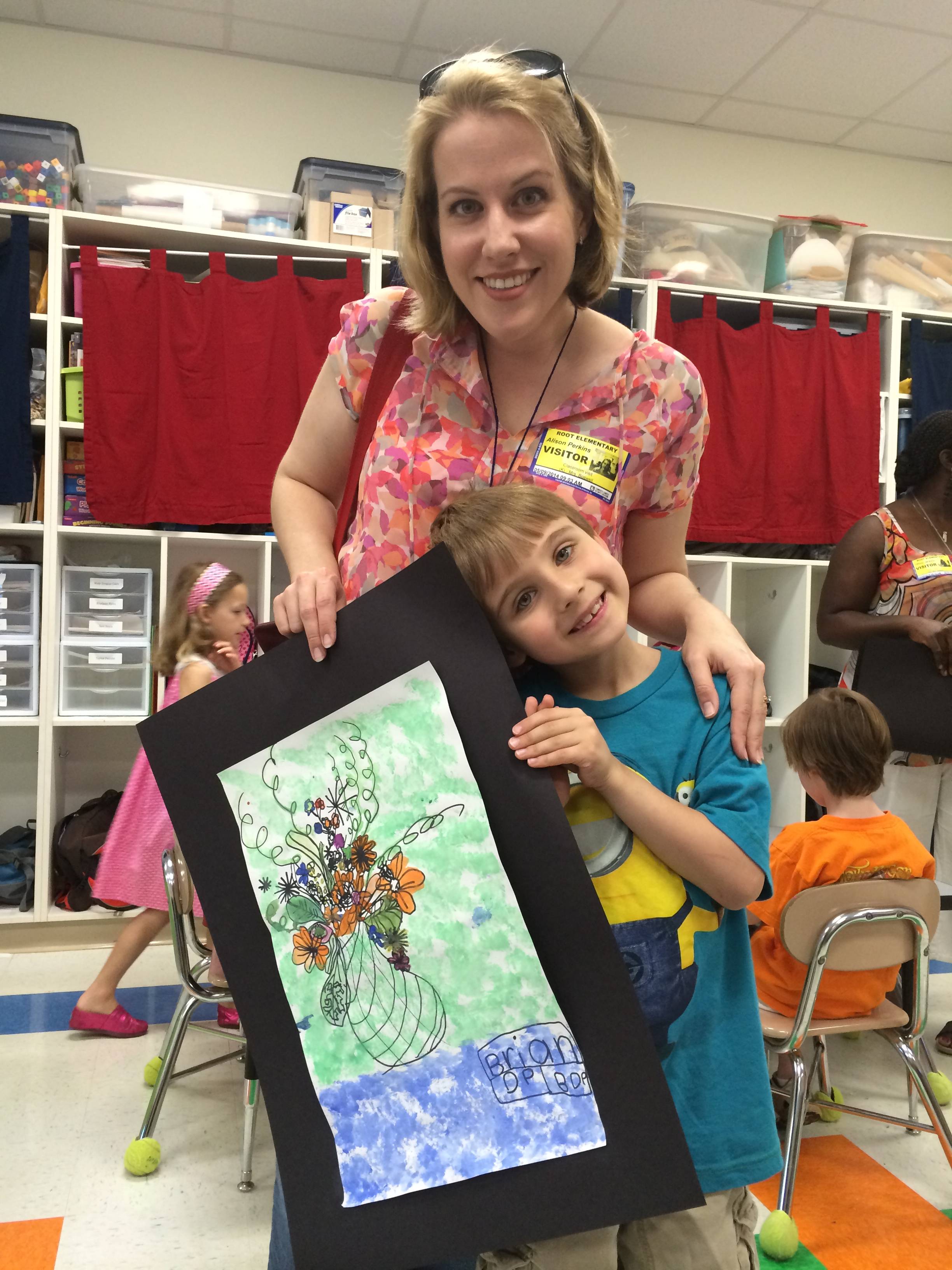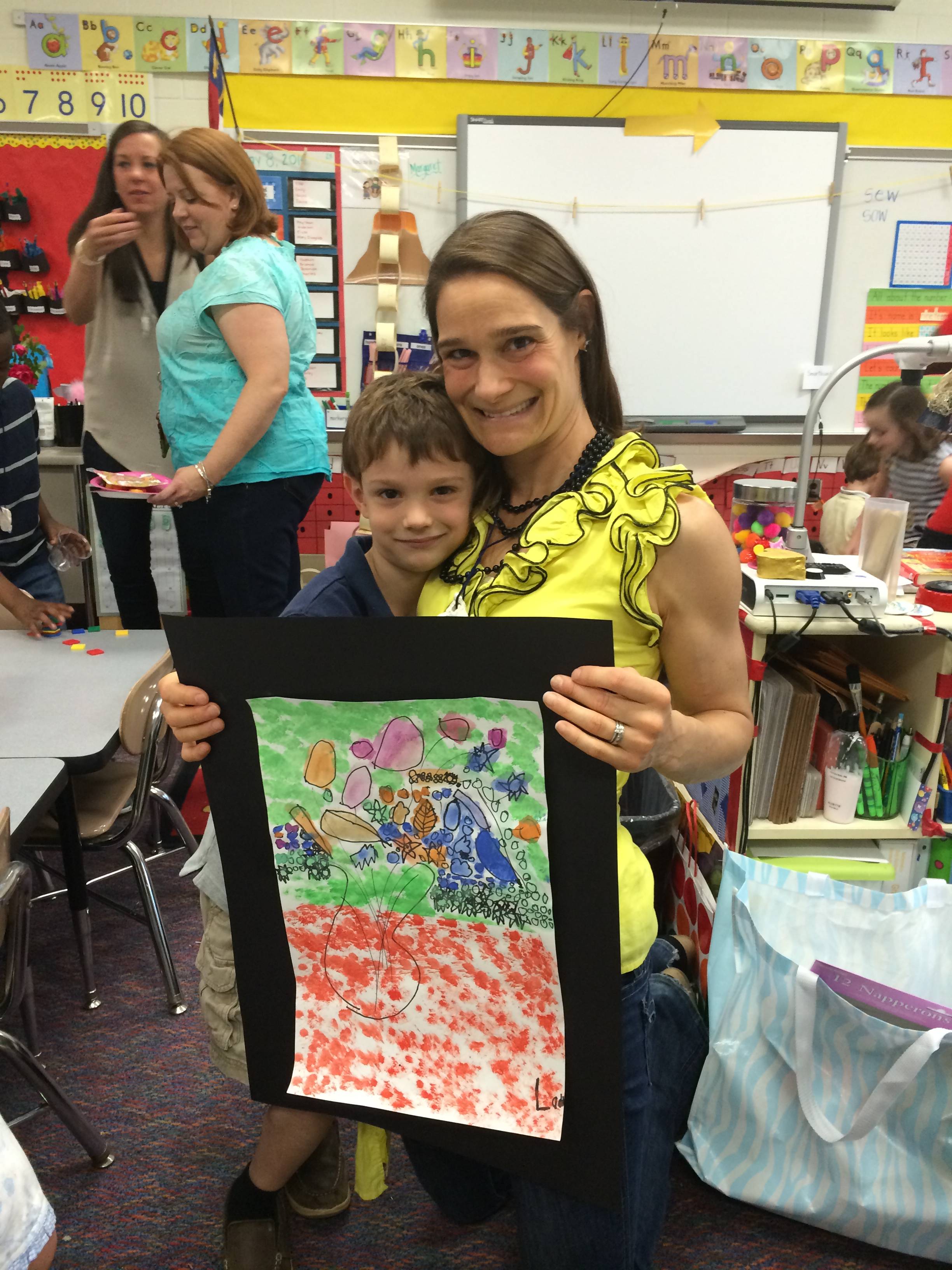 Both of the kids’ schools had events to celebrate Mother’s Day today! I’m not always able to make it to daytime events, but this year, I was able to! Brian’s class invited us moms to come by in the morning to receive our special gifts–a clay pendant, and a beautiful artwork of flowers in a vase! Brian’s teacher said these were suitable for framing, and I think I will absolutely have to do that. Brian’s picture shows such amazing detail, I can tell he really studied the arrangement they used as the model for their still life. I asked Ladd’s mom to take a picture of us, and we did the same for them! Ladd is one of Brian’s best buddies at school. I took pictures of some of Brian’s other artwork that is hanging up in the hall outside of his classroom as well. We were there during morning announcements, which on Fridays end with playing a popular song–today it was the ubiquitous “Happy” by Pharrell, and the kids spontaneously started dancing to it! Brian of course got his groove on for maximum effect, and I had to sneak a video! This afternoon was the Mother’s Day Tea at Goddard, and I got to enjoy a snack of cookies and tea with Miss K. She was very happy to see me, and unabashedly started in on my cookies after she finished her own! It was earlier than our usual pickup, but I decided to go ahead and take her home early and just have some girl time. Kendall wanted to ride her trike, and we played in the garage and enjoyed frozen lemonade. Also included, the morning sing-along in the car to their favorite song “Pompeii” by Bastille, and lightsaber battles with those flimsy toys from the baseball game! They don’t seem to be made for battling at all–I expect they aren’t going to last long with these two!