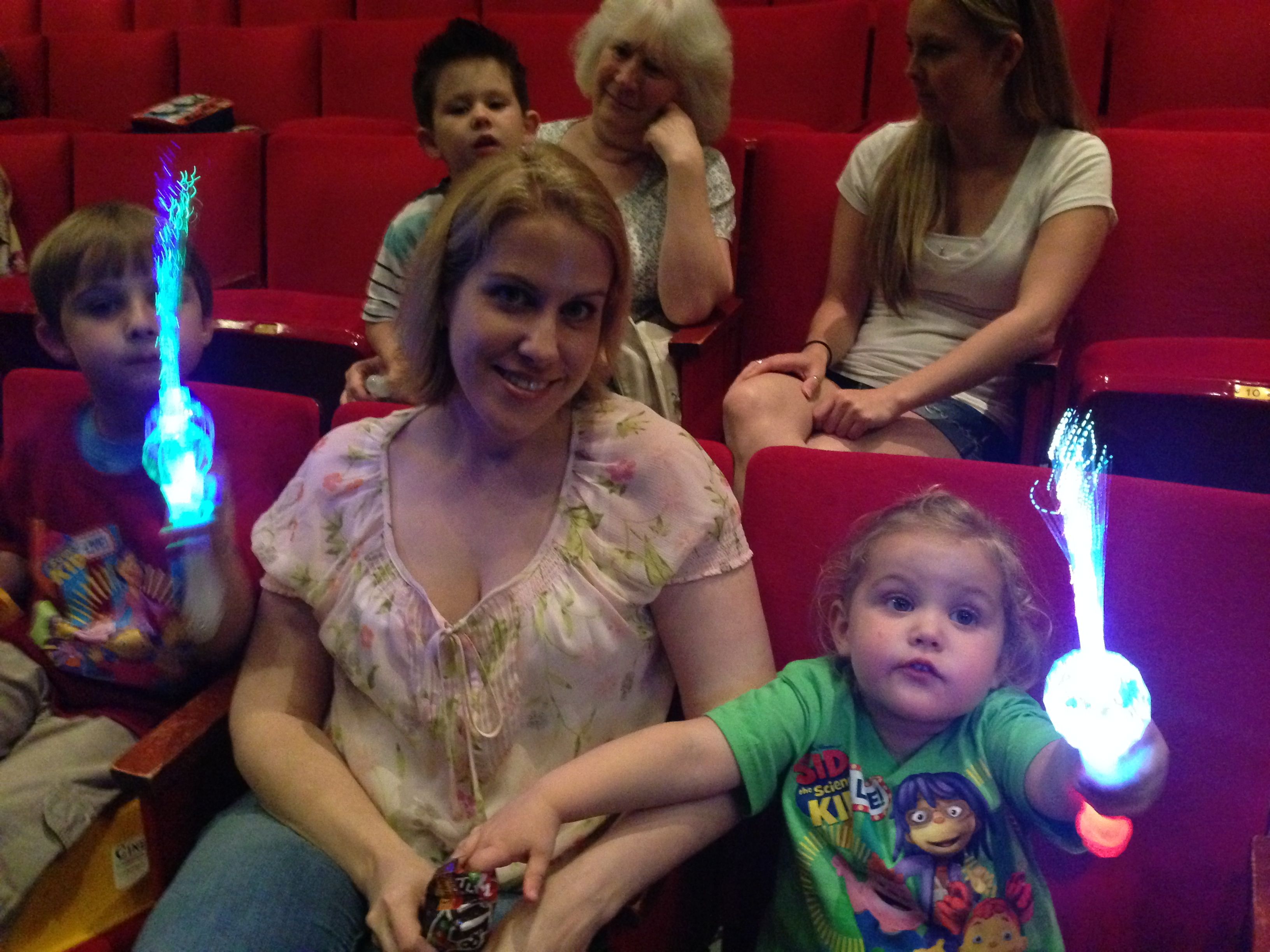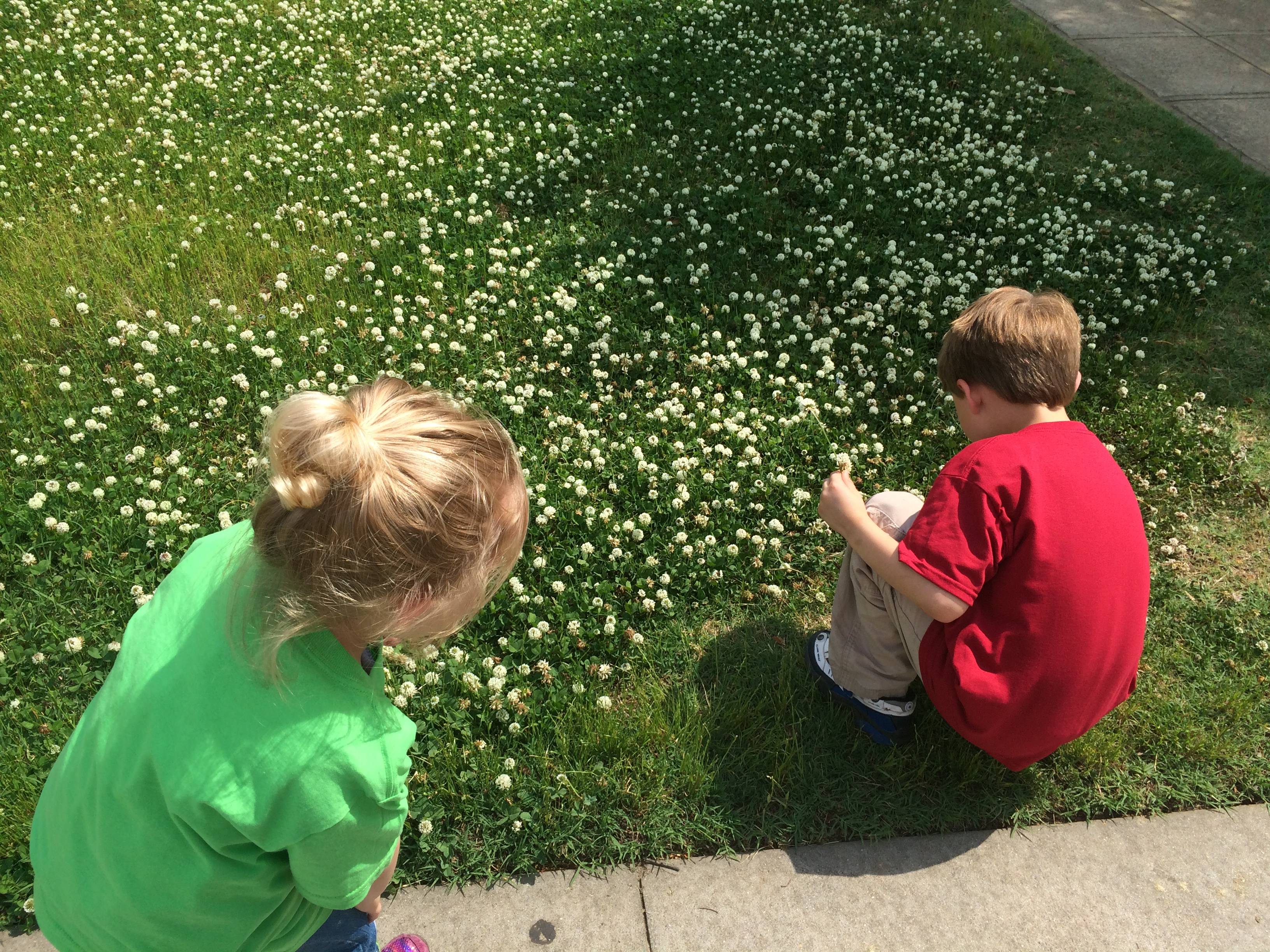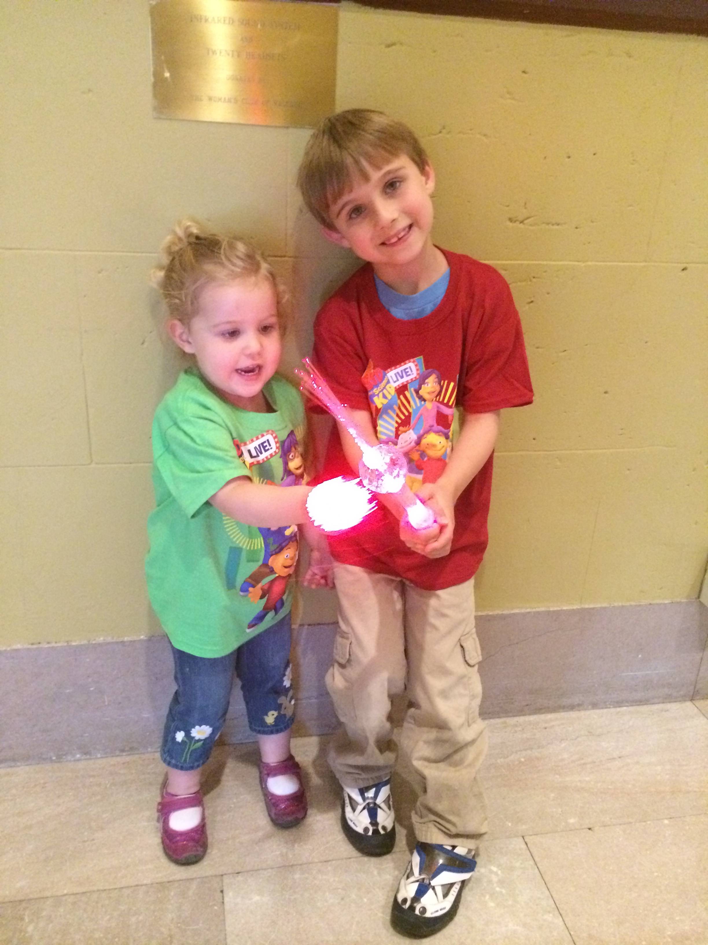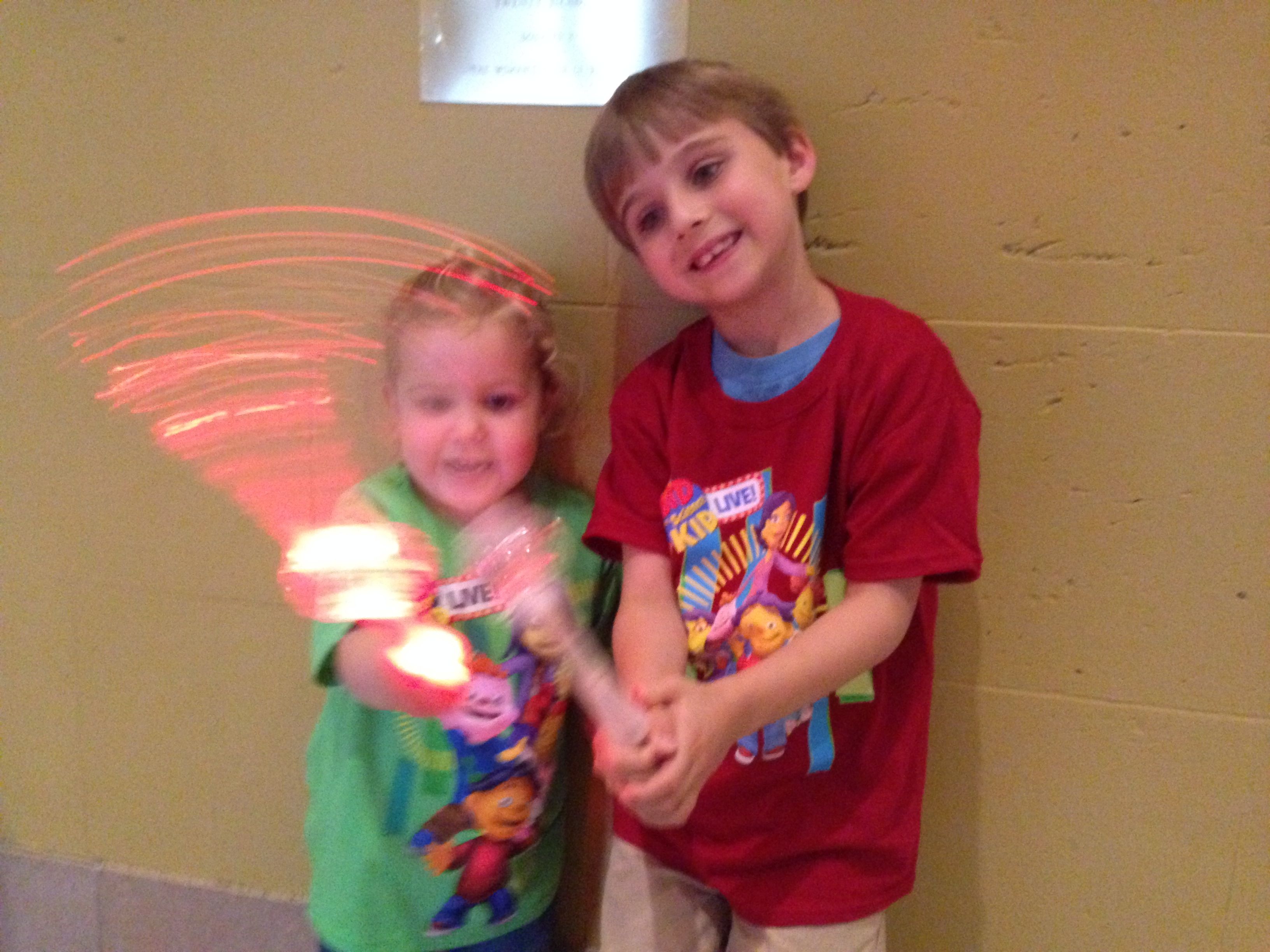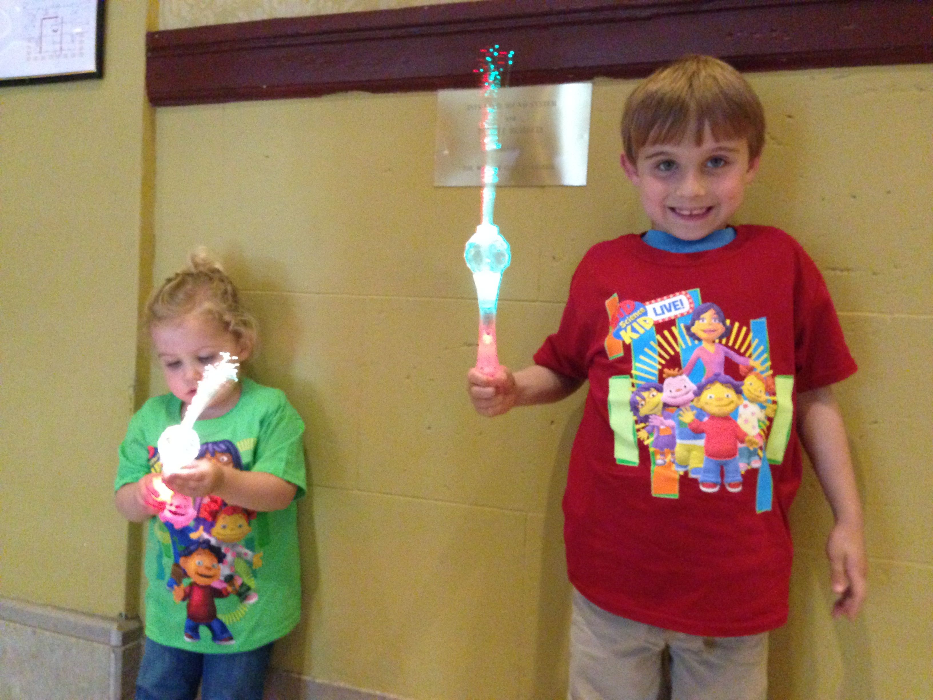 Today, Brandon and the kids let me sleep in! They headed out early to go to Lowe’s Build and Grow, where Brian and Kendall worked together to build a cute flower delivery van! They also bought me a lovely lily plant. It looks like they had a great time building together! When they came home, I was presented with beautiful bouquet of flowers, a fancy coffee from Caribou, and a huge spread of Bruegger’s bagels and sandwiches! Wow, all this, and it’s not even mother’s day yet. 🙂 Soon, it was time for Sid the Science Kid Live! So, we all packed up and were off to Memorial Auditorium. The kids were super excited to be there, and seemed to really get into the show. The theme was learning about the five senses, and a nice selection of their favorite songs from the TV show were featured. Brandon and I were kind of snickering about all the WiLd GeStuREs! and ridiculous OVER ACTING!! that the performers put themselves through, to try and approximate the animation style. It was a little much for us, but the kids really had fun. By intermission, they were so pumped up! They were also begging for the items they saw the other kids with, so we made our way to the swag table. They each picked out a t-shirt, and the crazy overpriced LED light sticks–those marketing folks are brilliant, really, selling $12 plastic items that kids flip out over to a captive audience of parents. 😉 Okay, okay, they really were pretty cool–we’re telling ourselves that they can still use them for Halloween or something..! The second half of the show was probably even more fun and exciting for them, now that they had their light sticks! After the show, they happily played in some clover they saw on the way back to the car. I thought they’d be too warm wearing their new tees on top of their regular shirts, but they wouldn’t take those Sid shirts off for anything! 😀