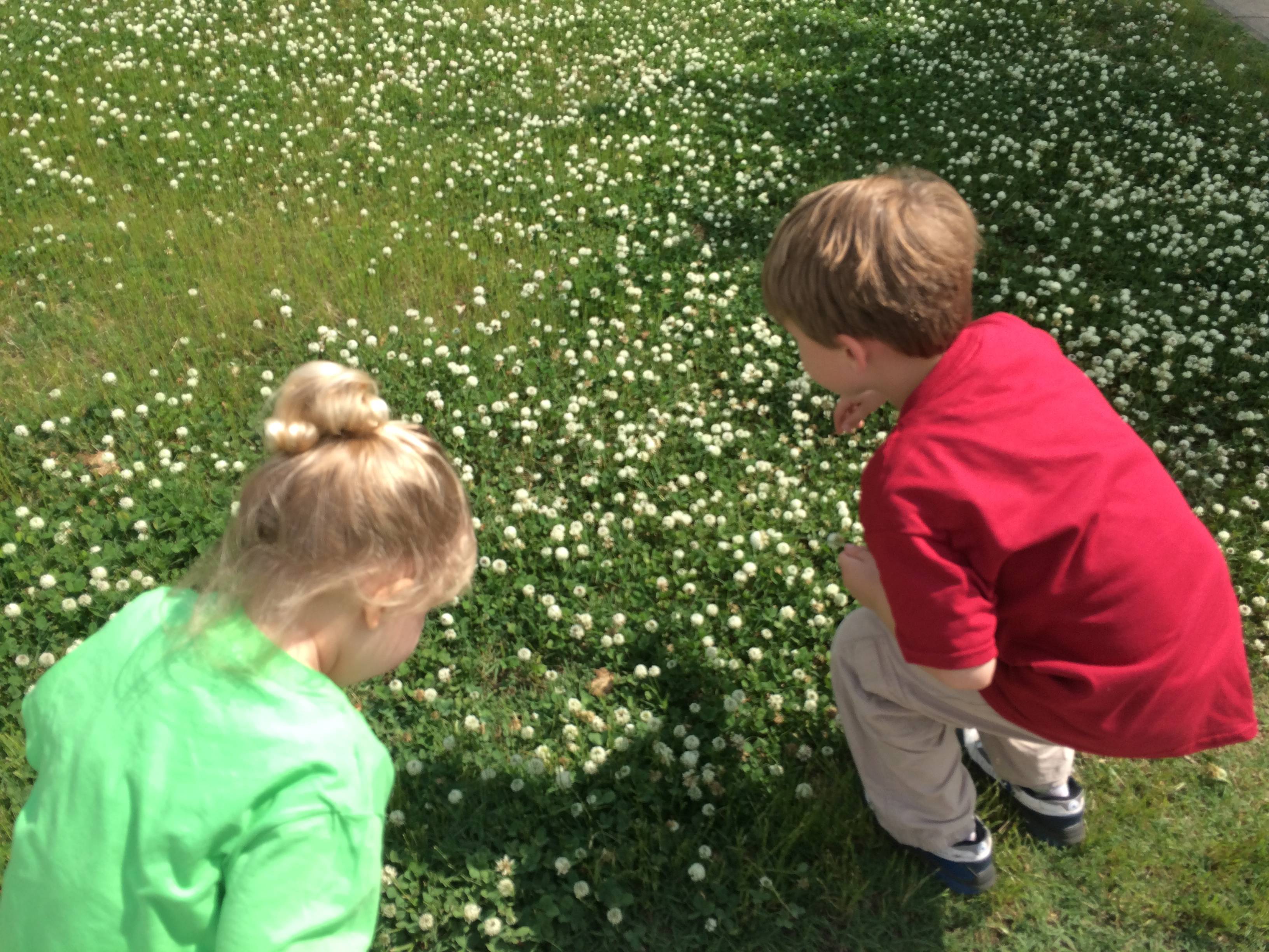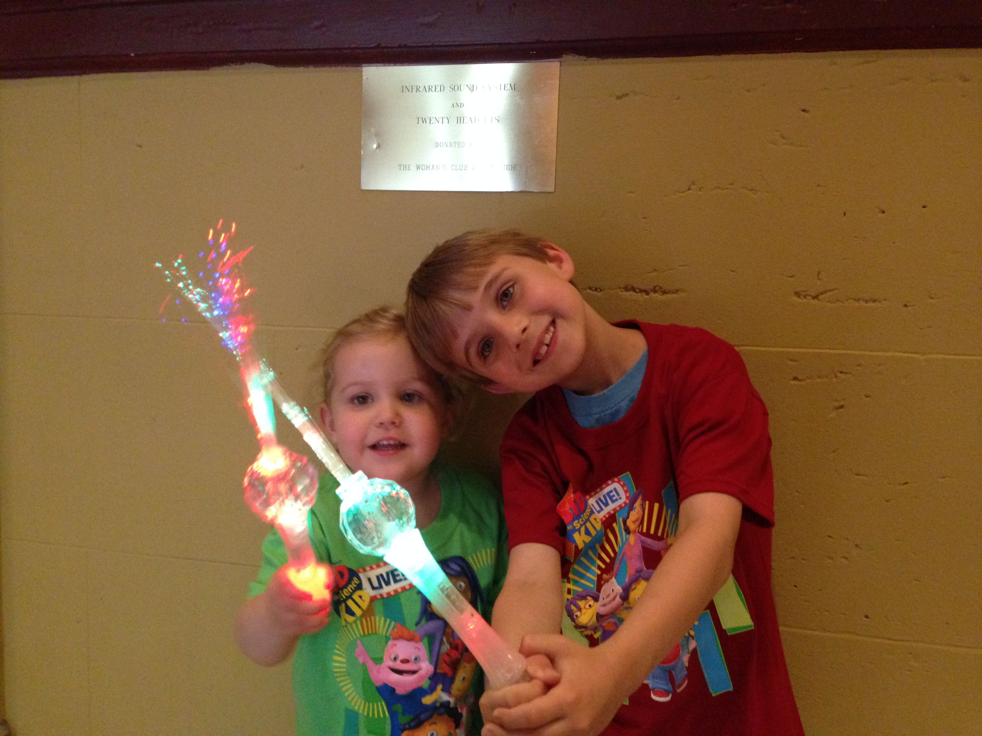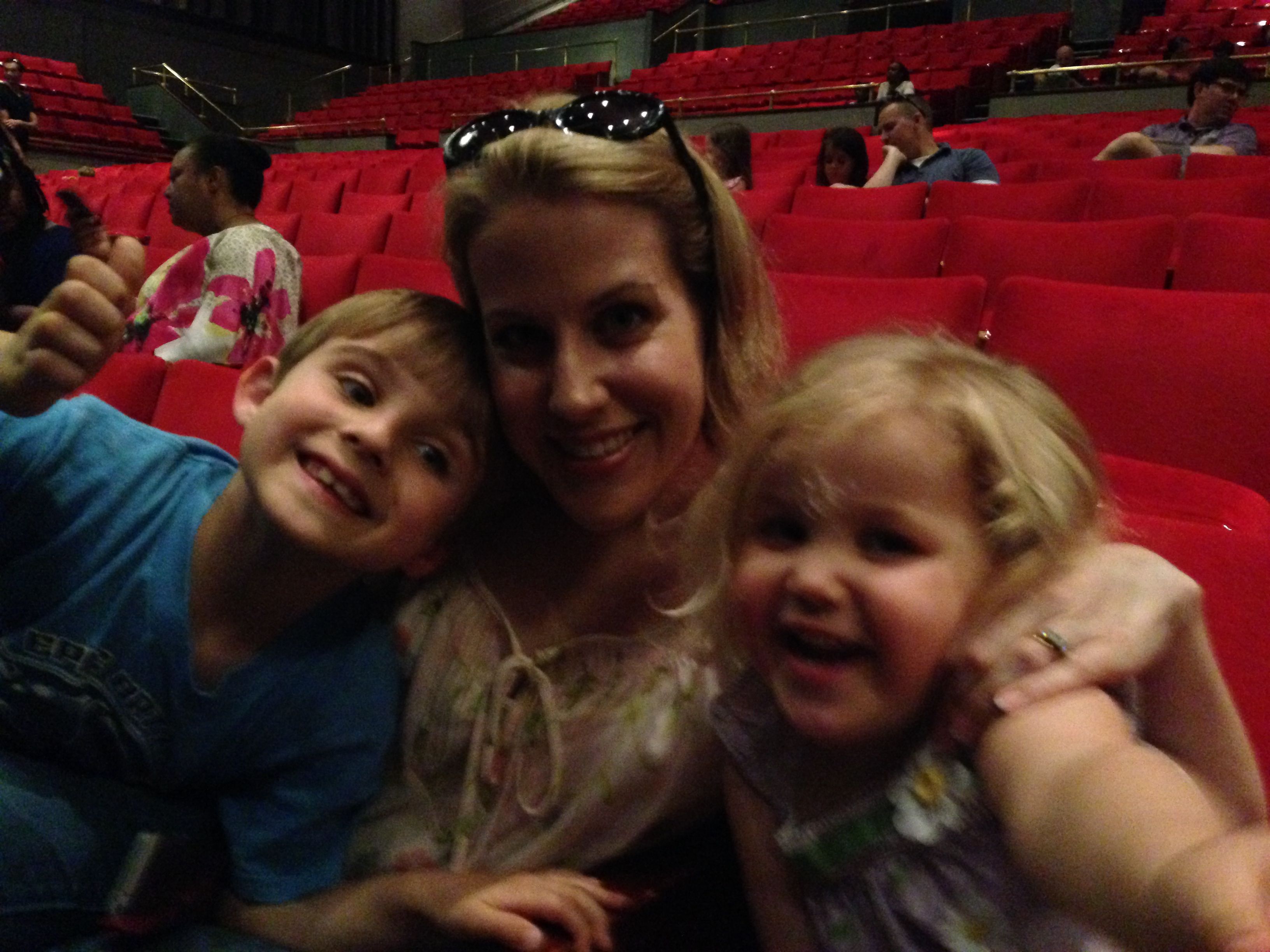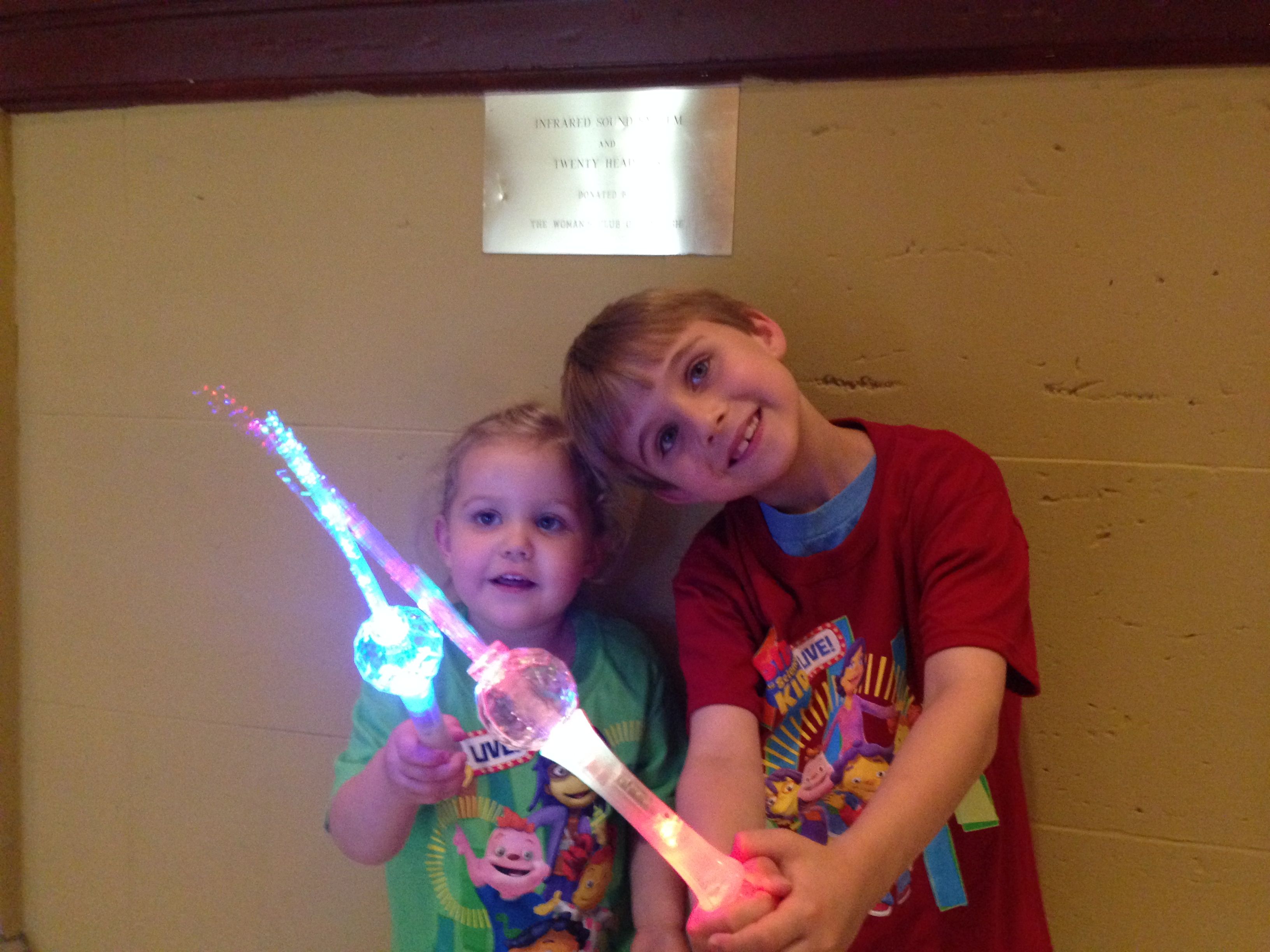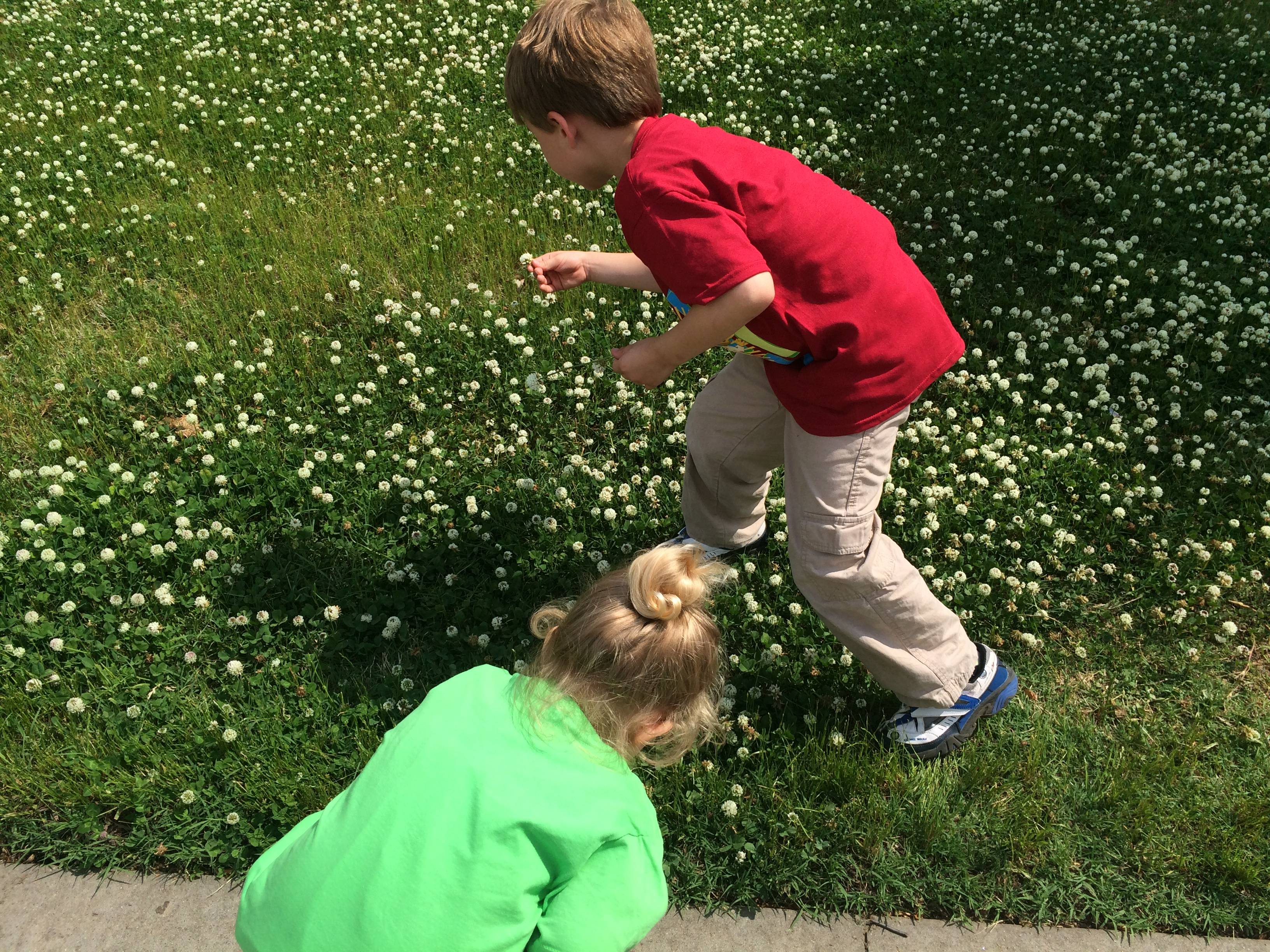 Today, Brandon and the kids let me sleep in! They headed out early to go to Lowe’s Build and Grow, where Brian and Kendall worked together to build a cute flower delivery van! They also bought me a lovely lily plant. It looks like they had a great time building together! When they came home, I was presented with beautiful bouquet of flowers, a fancy coffee from Caribou, and a huge spread of Bruegger’s bagels and sandwiches! Wow, all this, and it’s not even mother’s day yet. 🙂 Soon, it was time for Sid the Science Kid Live! So, we all packed up and were off to Memorial Auditorium. The kids were super excited to be there, and seemed to really get into the show. The theme was learning about the five senses, and a nice selection of their favorite songs from the TV show were featured. Brandon and I were kind of snickering about all the WiLd GeStuREs! and ridiculous OVER ACTING!! that the performers put themselves through, to try and approximate the animation style. It was a little much for us, but the kids really had fun. By intermission, they were so pumped up! They were also begging for the items they saw the other kids with, so we made our way to the swag table. They each picked out a t-shirt, and the crazy overpriced LED light sticks–those marketing folks are brilliant, really, selling $12 plastic items that kids flip out over to a captive audience of parents. 😉 Okay, okay, they really were pretty cool–we’re telling ourselves that they can still use them for Halloween or something..! The second half of the show was probably even more fun and exciting for them, now that they had their light sticks! After the show, they happily played in some clover they saw on the way back to the car. I thought they’d be too warm wearing their new tees on top of their regular shirts, but they wouldn’t take those Sid shirts off for anything! 😀