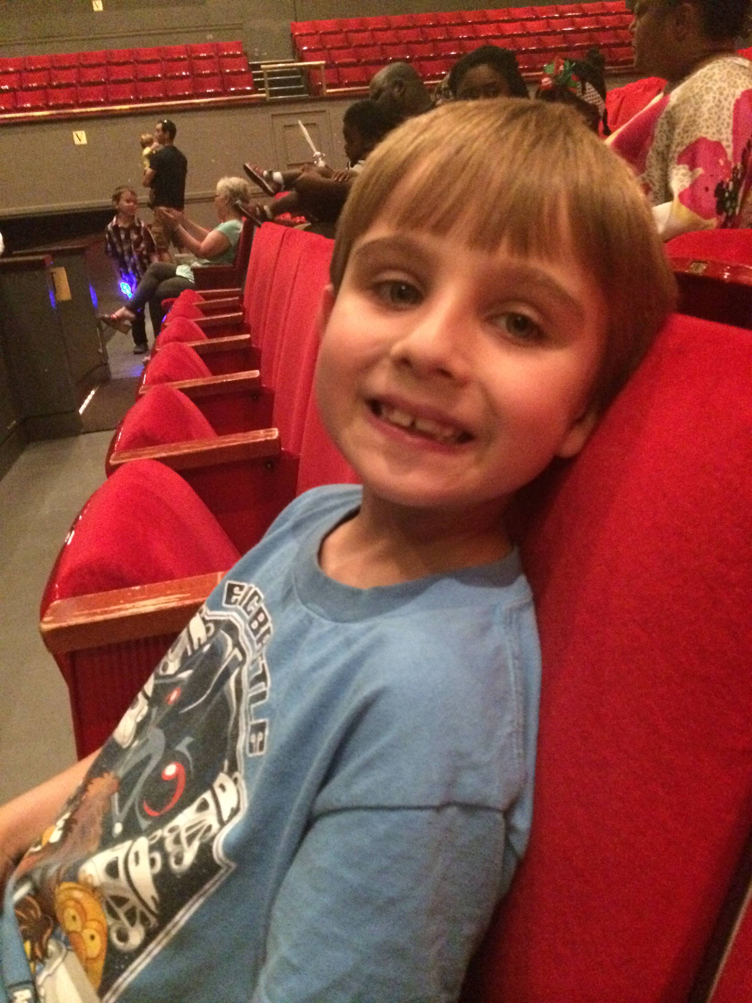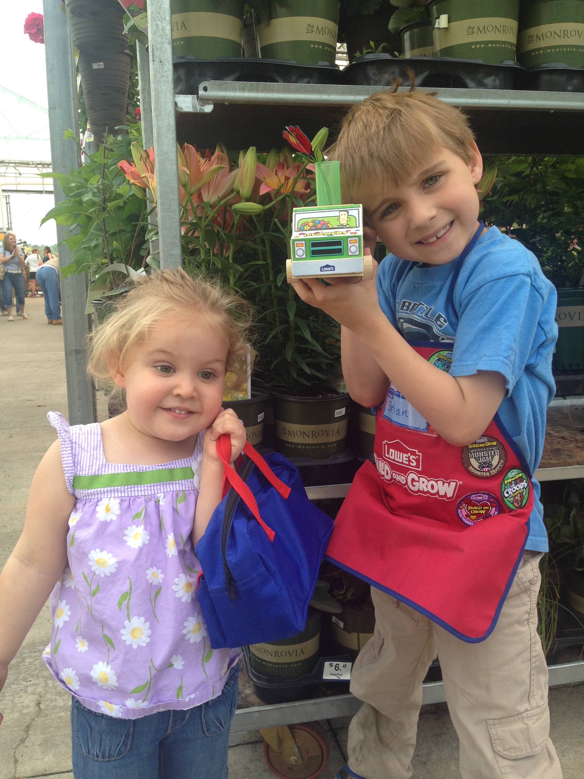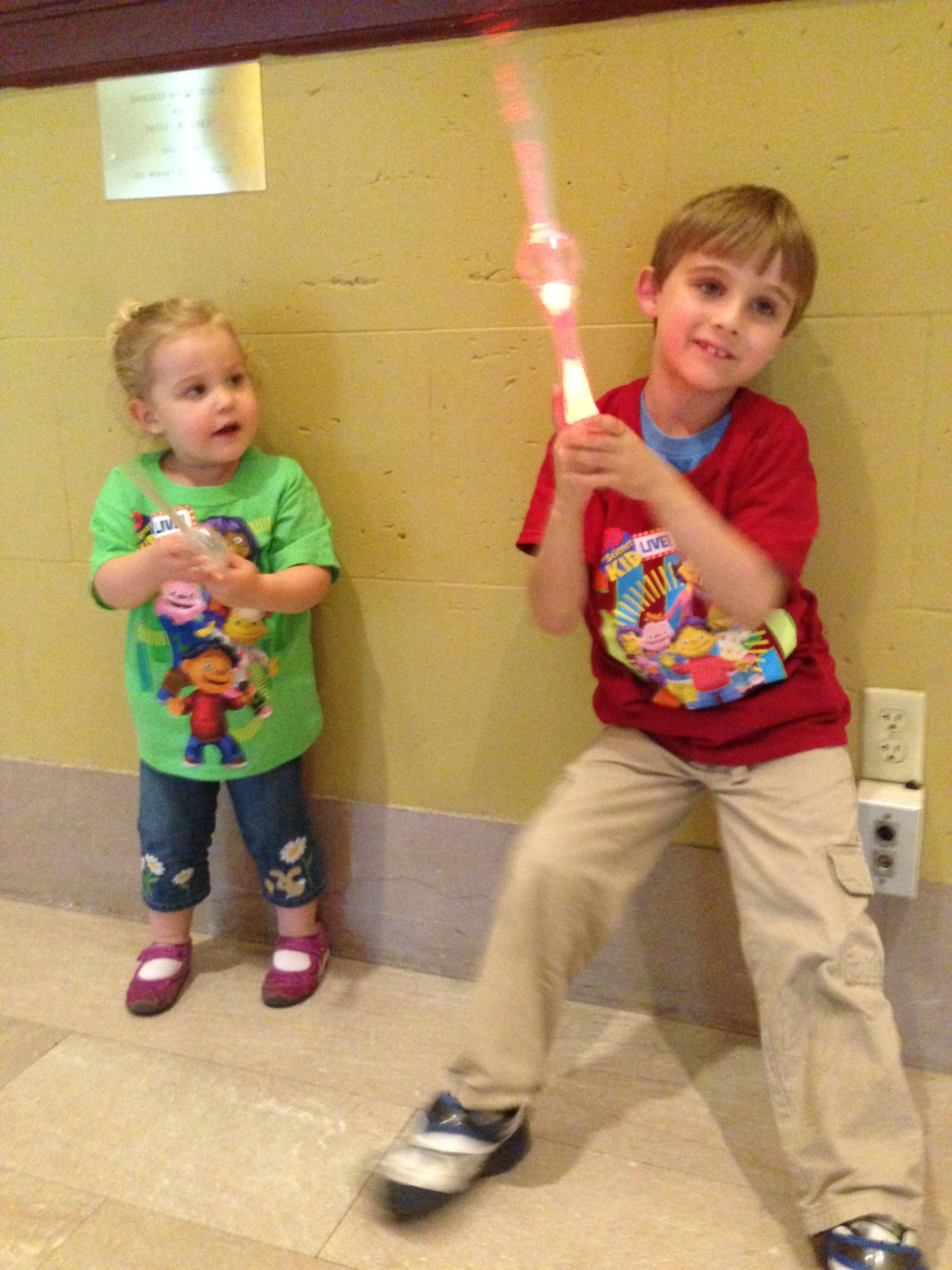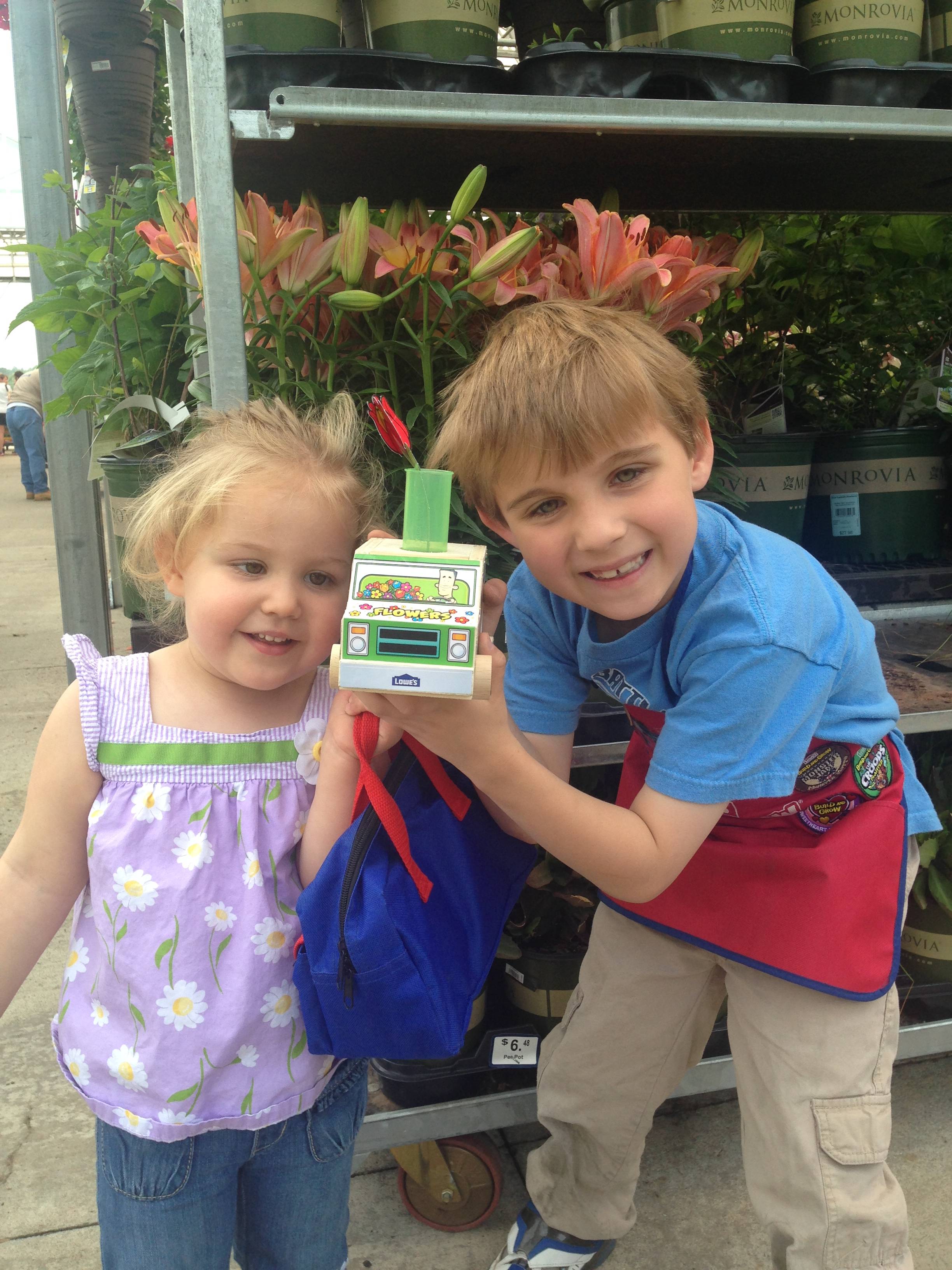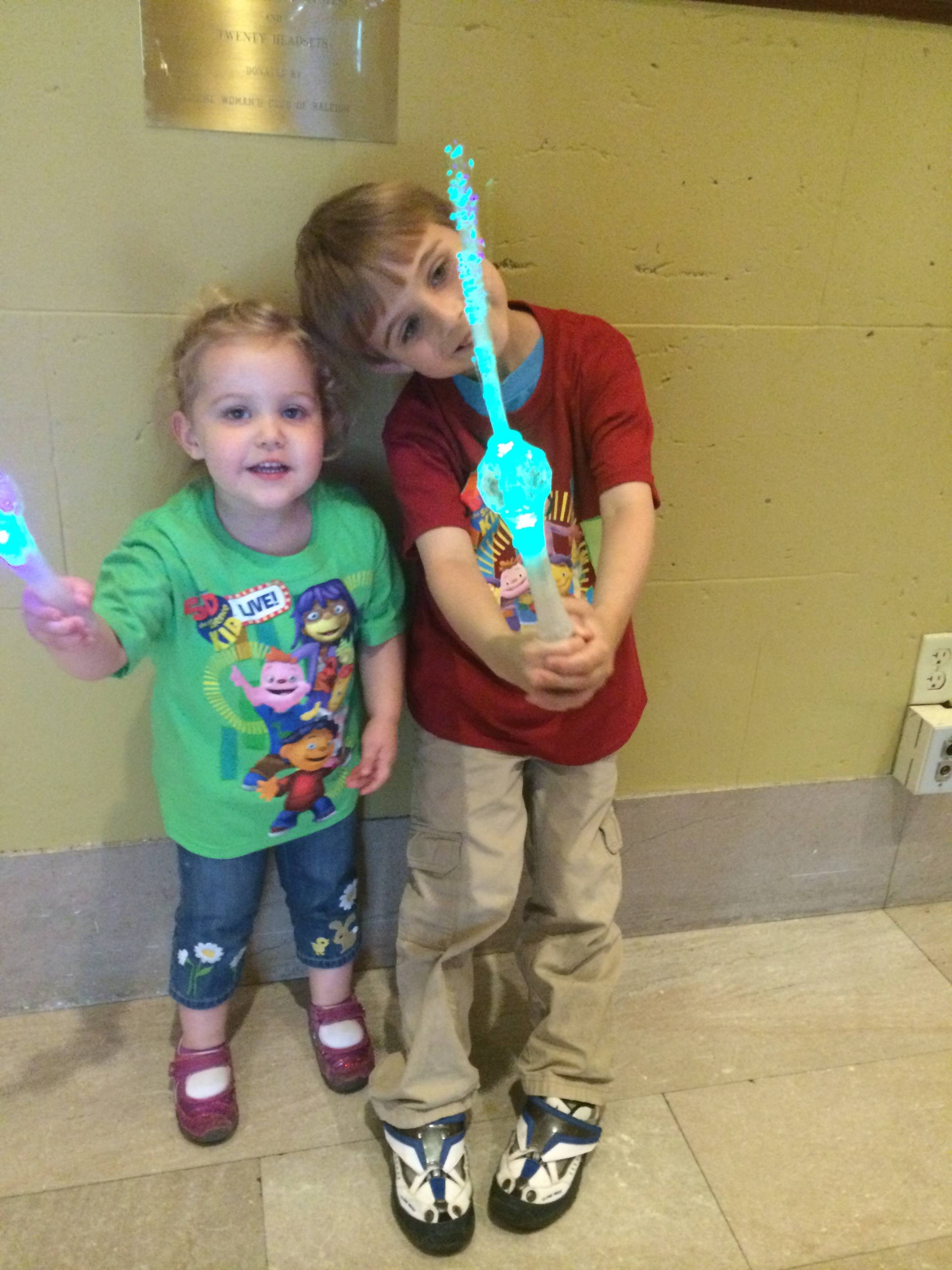 Today, Brandon and the kids let me sleep in! They headed out early to go to Lowe’s Build and Grow, where Brian and Kendall worked together to build a cute flower delivery van! They also bought me a lovely lily plant. It looks like they had a great time building together! When they came home, I was presented with beautiful bouquet of flowers, a fancy coffee from Caribou, and a huge spread of Bruegger’s bagels and sandwiches! Wow, all this, and it’s not even mother’s day yet. 🙂 Soon, it was time for Sid the Science Kid Live! So, we all packed up and were off to Memorial Auditorium. The kids were super excited to be there, and seemed to really get into the show. The theme was learning about the five senses, and a nice selection of their favorite songs from the TV show were featured. Brandon and I were kind of snickering about all the WiLd GeStuREs! and ridiculous OVER ACTING!! that the performers put themselves through, to try and approximate the animation style. It was a little much for us, but the kids really had fun. By intermission, they were so pumped up! They were also begging for the items they saw the other kids with, so we made our way to the swag table. They each picked out a t-shirt, and the crazy overpriced LED light sticks–those marketing folks are brilliant, really, selling $12 plastic items that kids flip out over to a captive audience of parents. 😉 Okay, okay, they really were pretty cool–we’re telling ourselves that they can still use them for Halloween or something..! The second half of the show was probably even more fun and exciting for them, now that they had their light sticks! After the show, they happily played in some clover they saw on the way back to the car. I thought they’d be too warm wearing their new tees on top of their regular shirts, but they wouldn’t take those Sid shirts off for anything! 😀