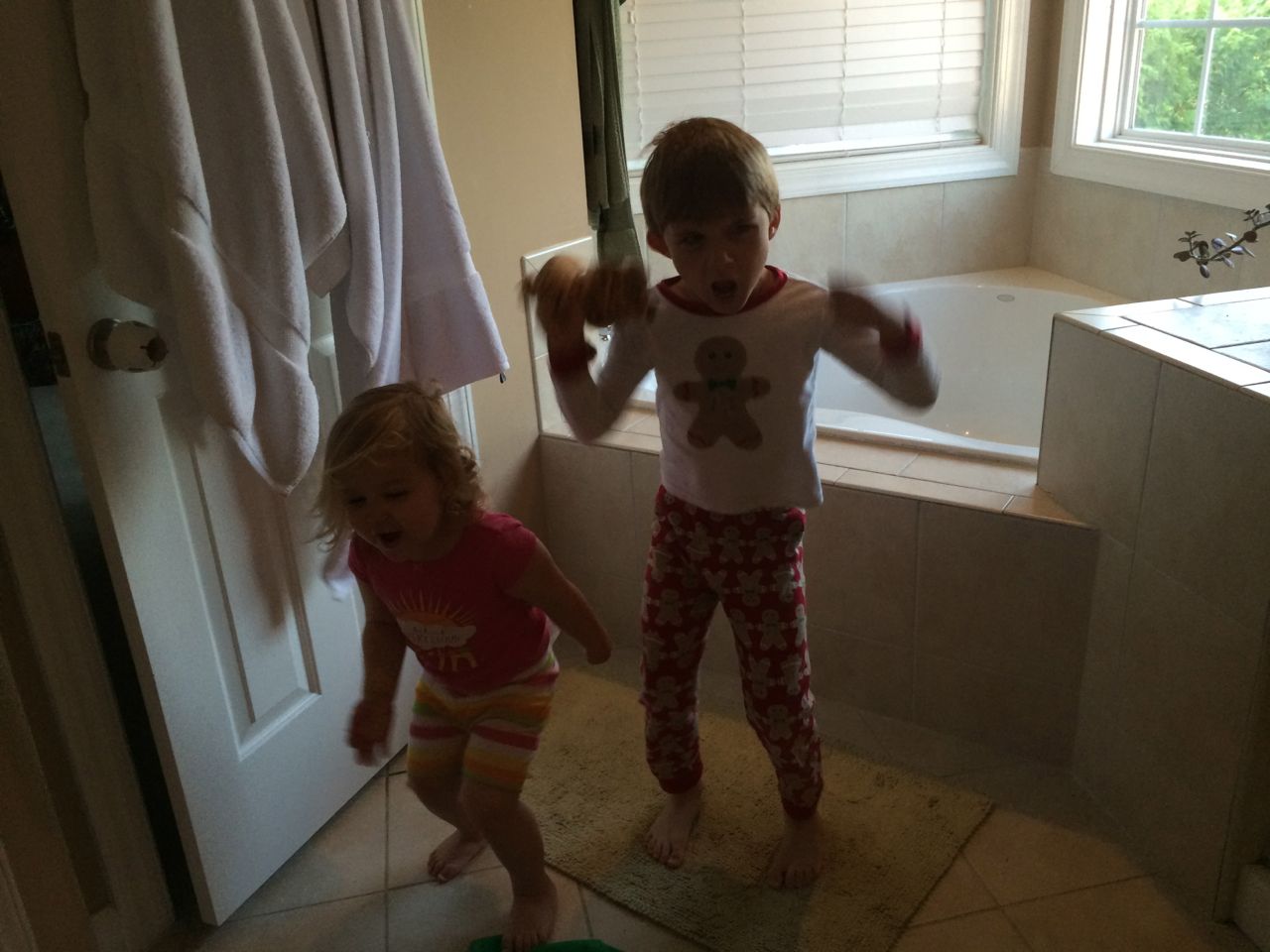 We got Kendall a five-pack of alphabet Star Wars t-shirts in size 4T, thinking she’d have to grow into them.. She’s having none of that, insisting on wearing them Right Now! Most days of the week! And usually, not with anything that even comes close to matching them! Today’s outfit choice wasn’t so wild, and I think the “B is for Boba Fett” shirt might just be her favorite. 😉 Hey, they’re helping her learn her letters, right? Also included, the kids having a wild dance party in our bathroom first thing this morning–it’s always something, waking up to their wild antics!