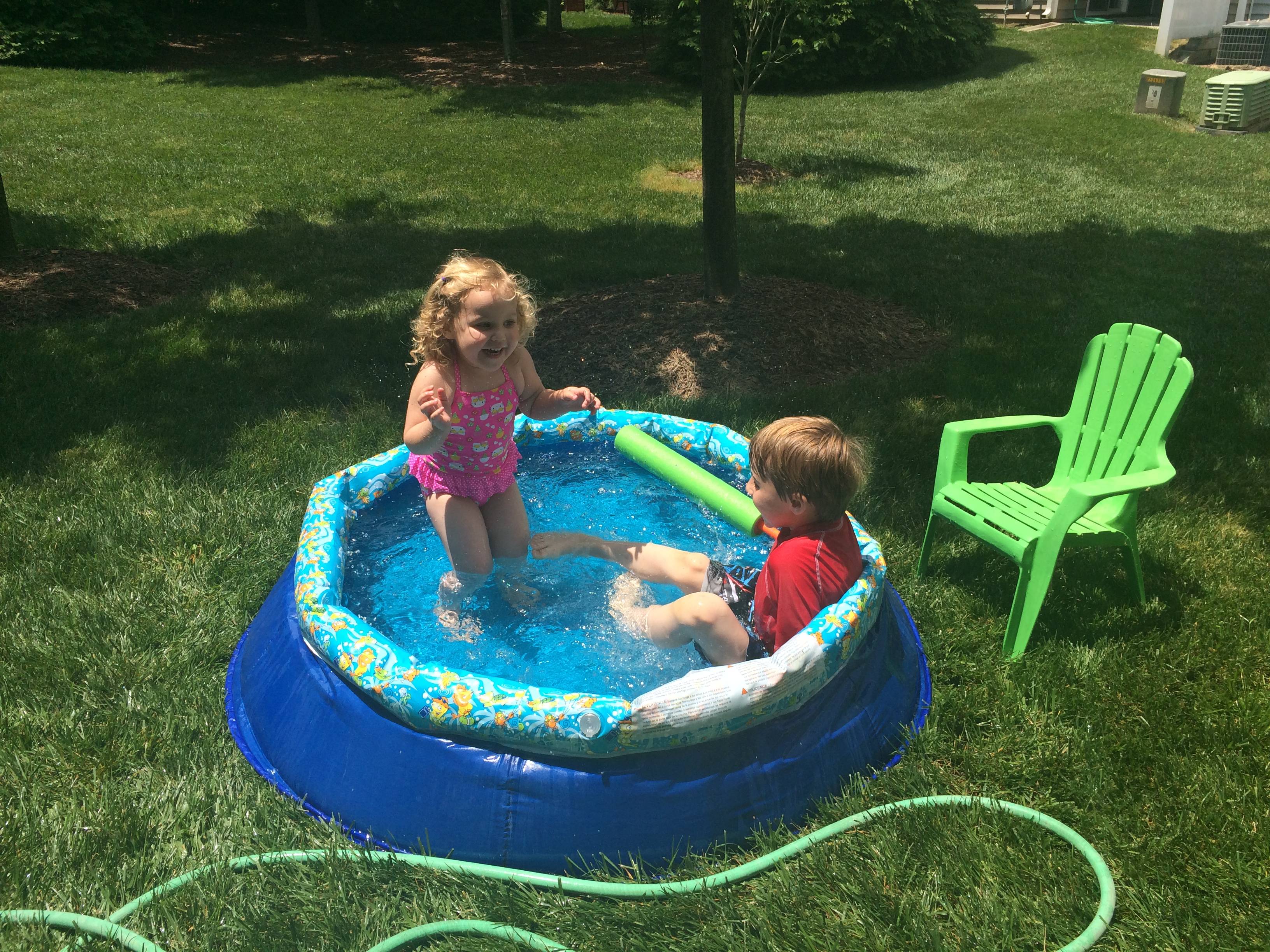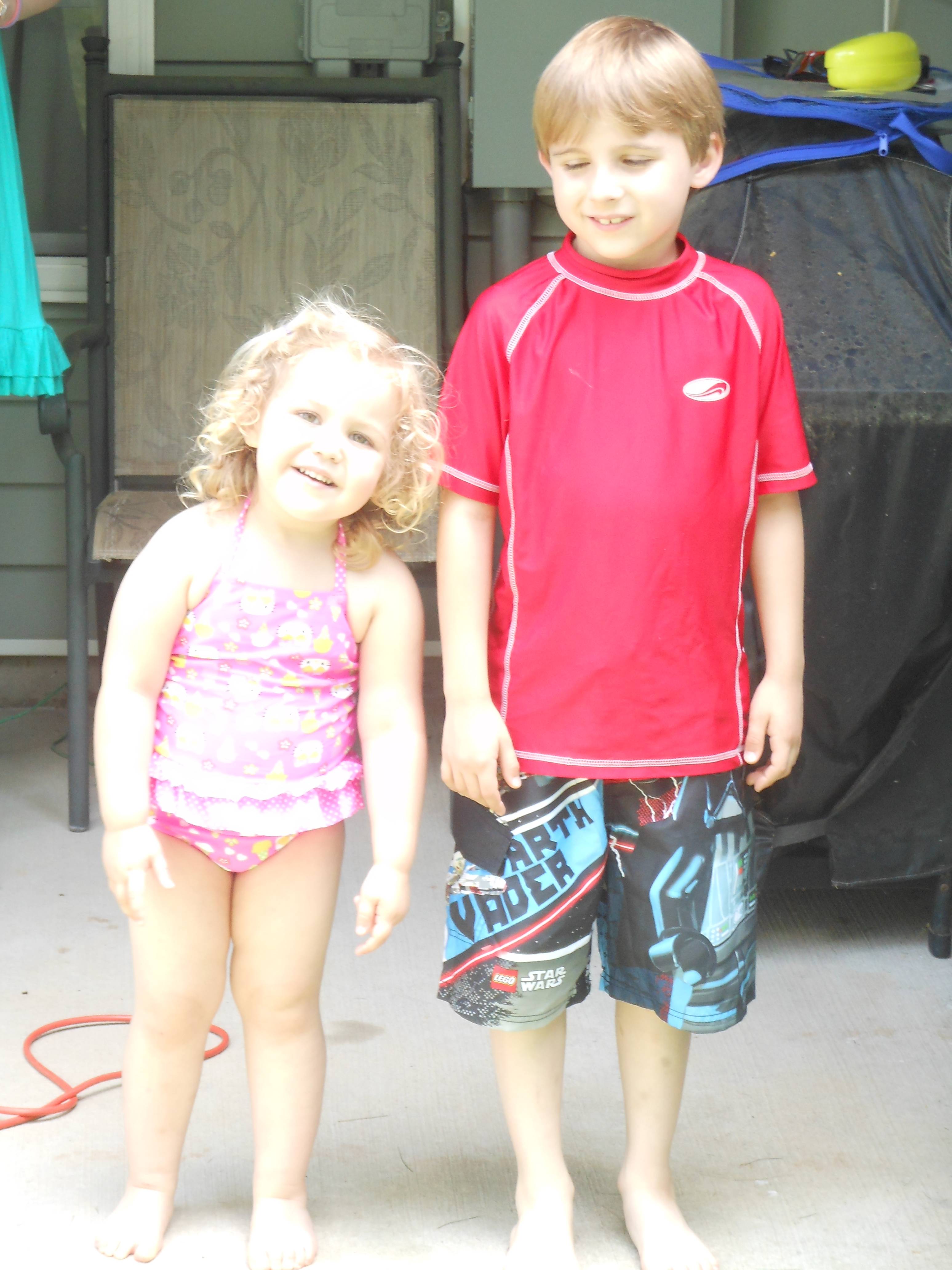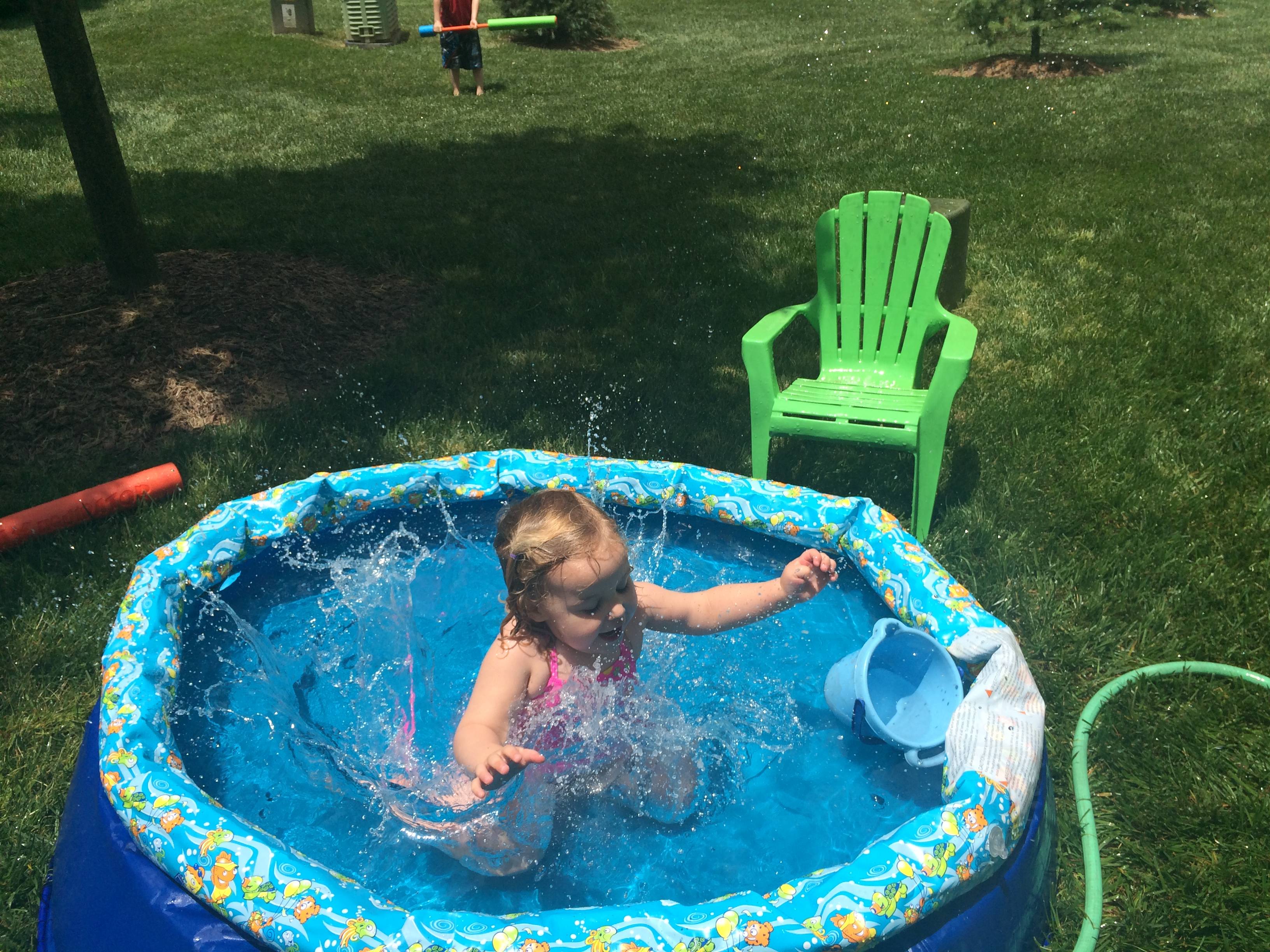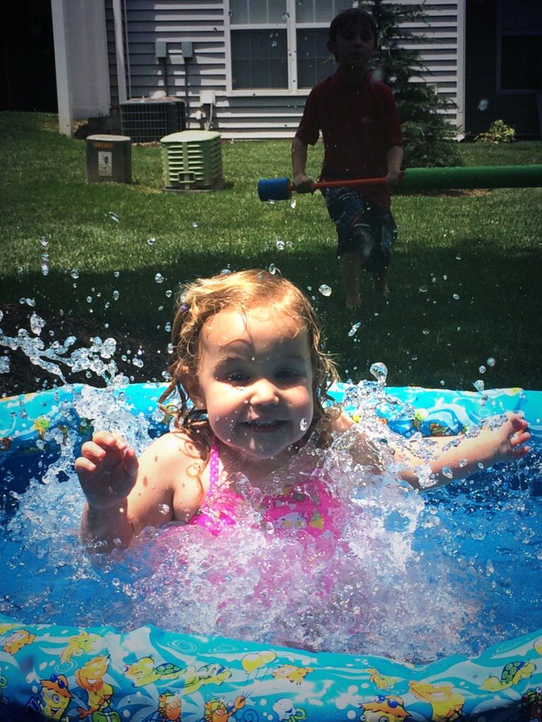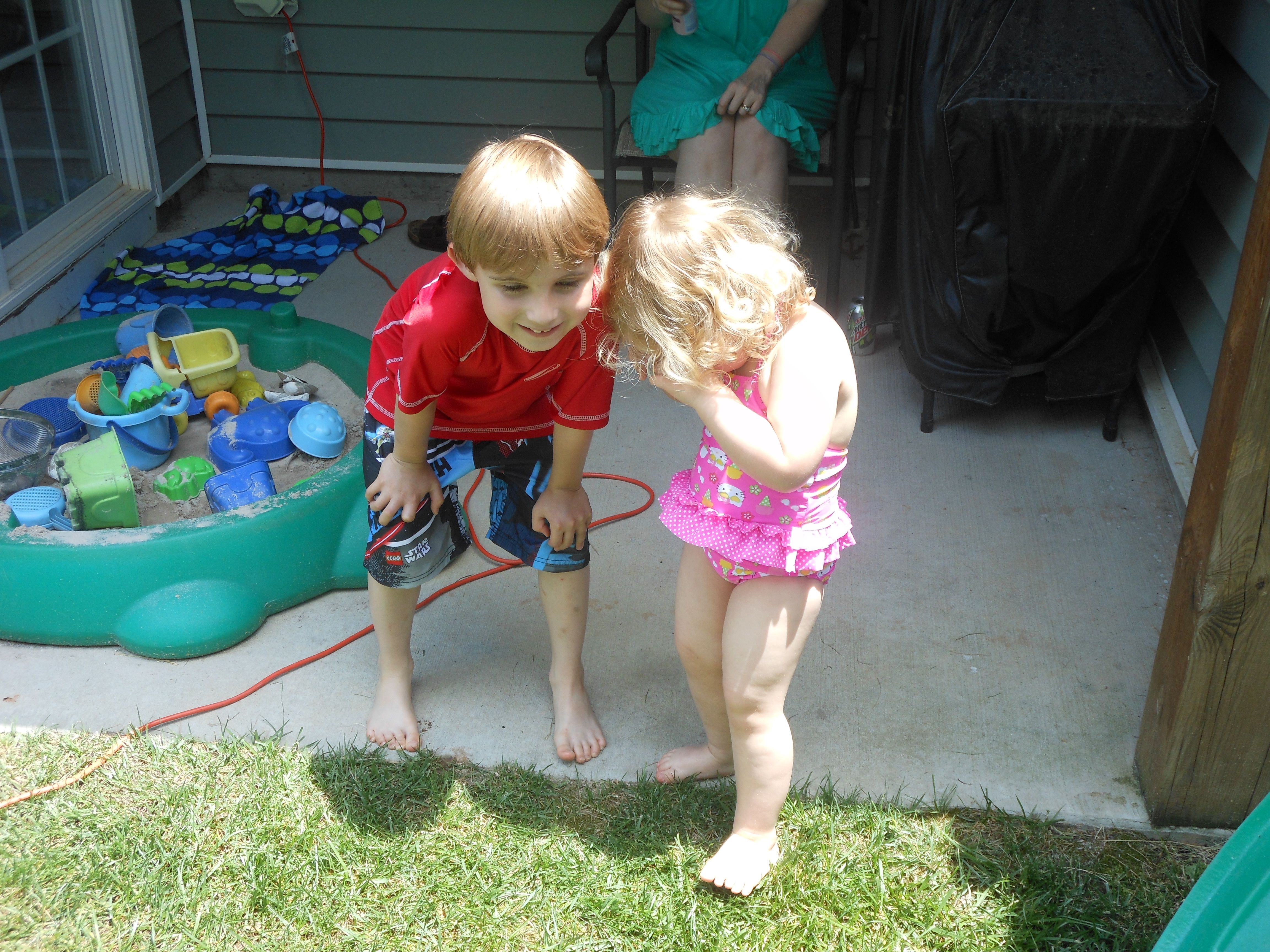 Predictably, this weekend was a hot one!  We decided to let the kids have a splash day to celebrate the summer-like weather.  While the pool was warming up, the kids played with some of their new books from the Goddard book fair–the how-to-draw books were a big hit with Brian!  I couldn’t resist drawing some animals of my own, too. 🙂  Kendall is loving her Lego Duplo Cinderella castle and coach!  Y’all know I’m not all that into the corporate-princess thing, but she really got into this castle at the Lego Kids Fest, and it has some really cool elements.  As much as I realize we don’t need one more Duplo brick in this house, she really, really loved it–and despite his initial “ew, girl stuff” reaction, Brian ended up playing with it, too. 😉  I like how they mixed sets to create some cool features (especially the slide!)  Then, we were outside for splash time!  Kendall is really enjoying her additional height this year–she can climb in and out of the pool much easier than last year!  She is much less wary about the pool, and jumps right in, making the biggest splash she can, squealing with delight!  The foam soakers continue to be a big hit with both kids.  During Kendall’s nap, Brian and I played his Lego Star Wars “Battle of Hoth” game, and in the play kitchen some.  He assures me the steak-and-cauliflower-in-a-bowl is actually a volcano brownie sundae. 😉  Very creative, Brian!