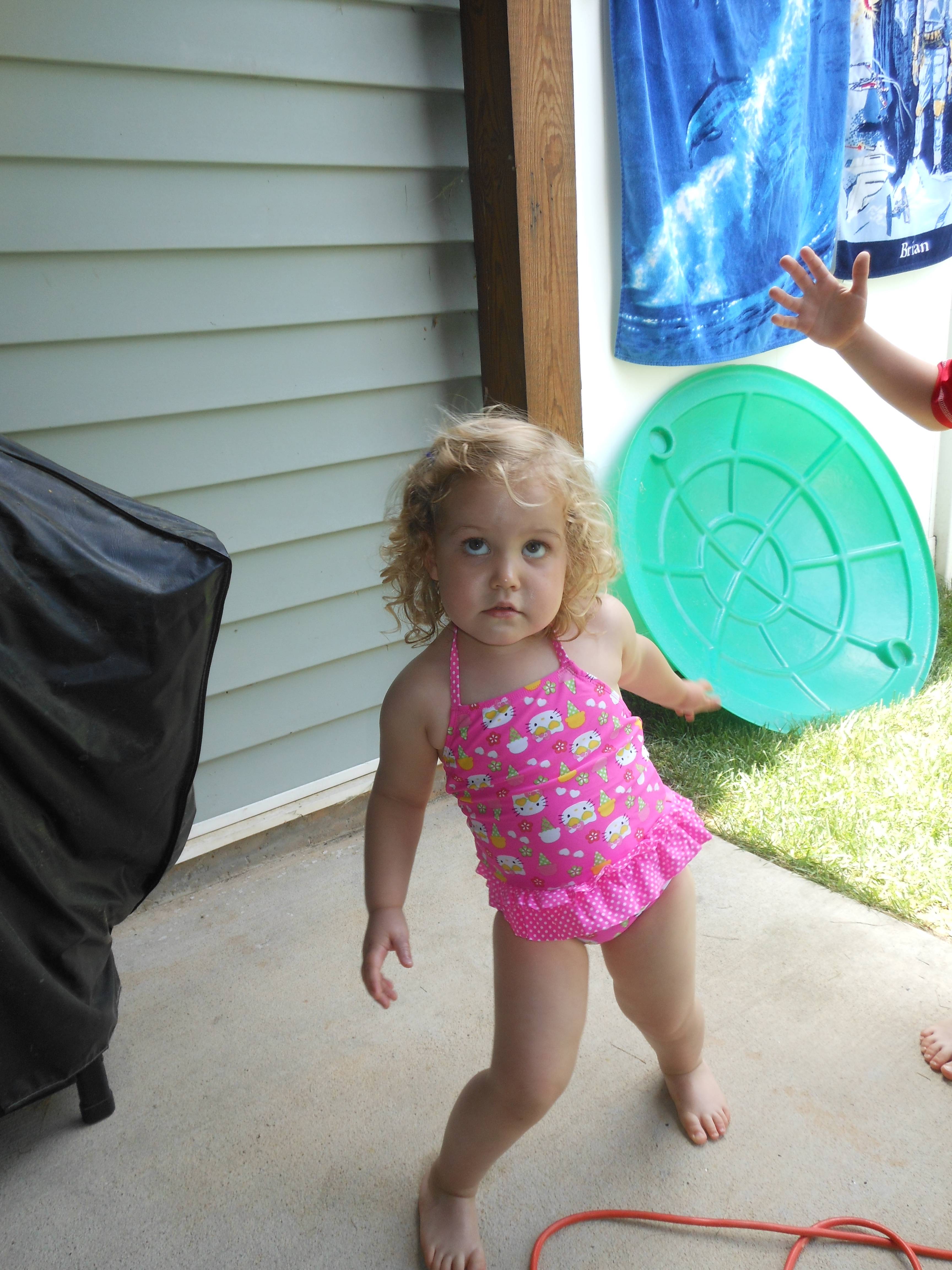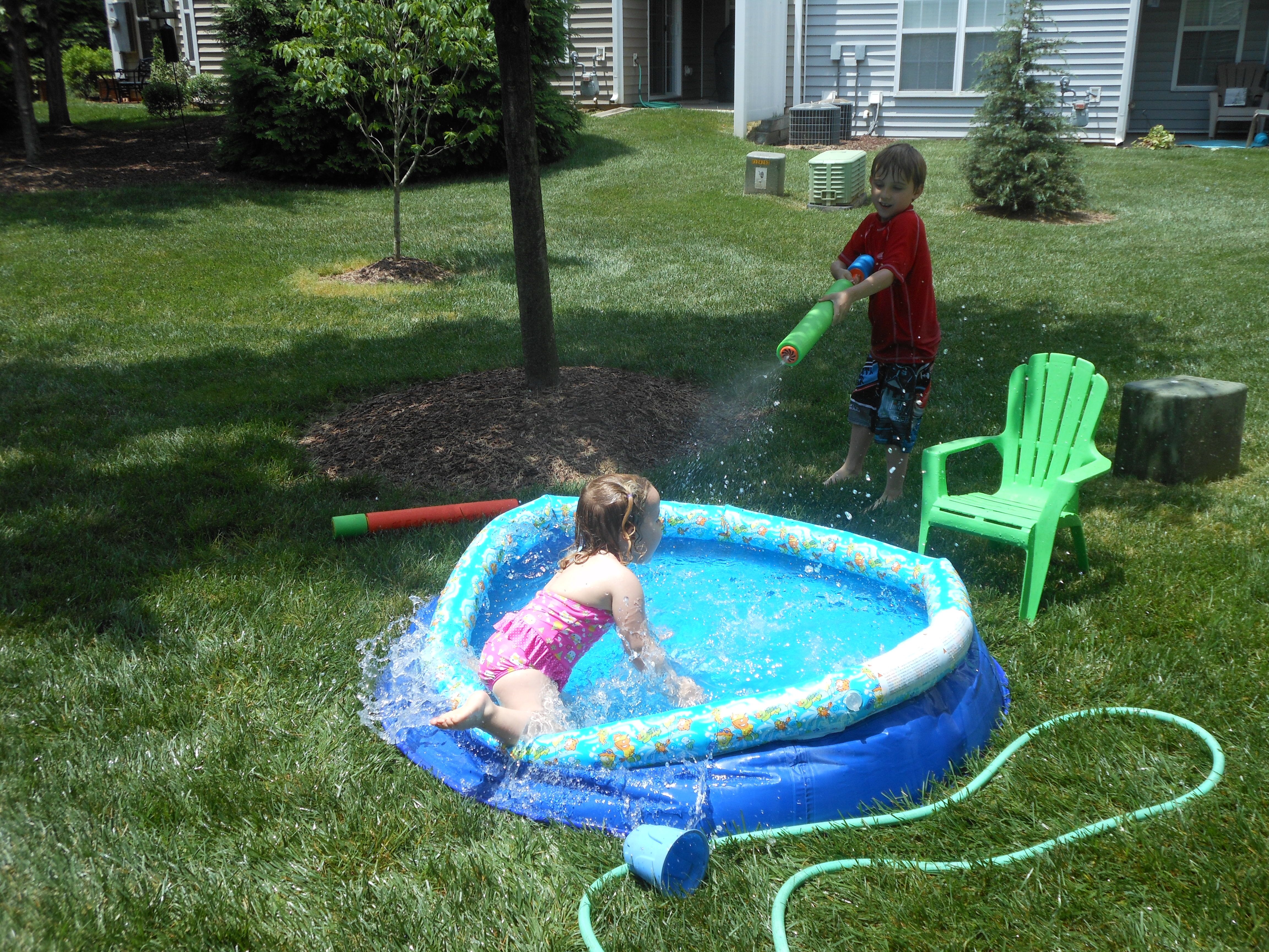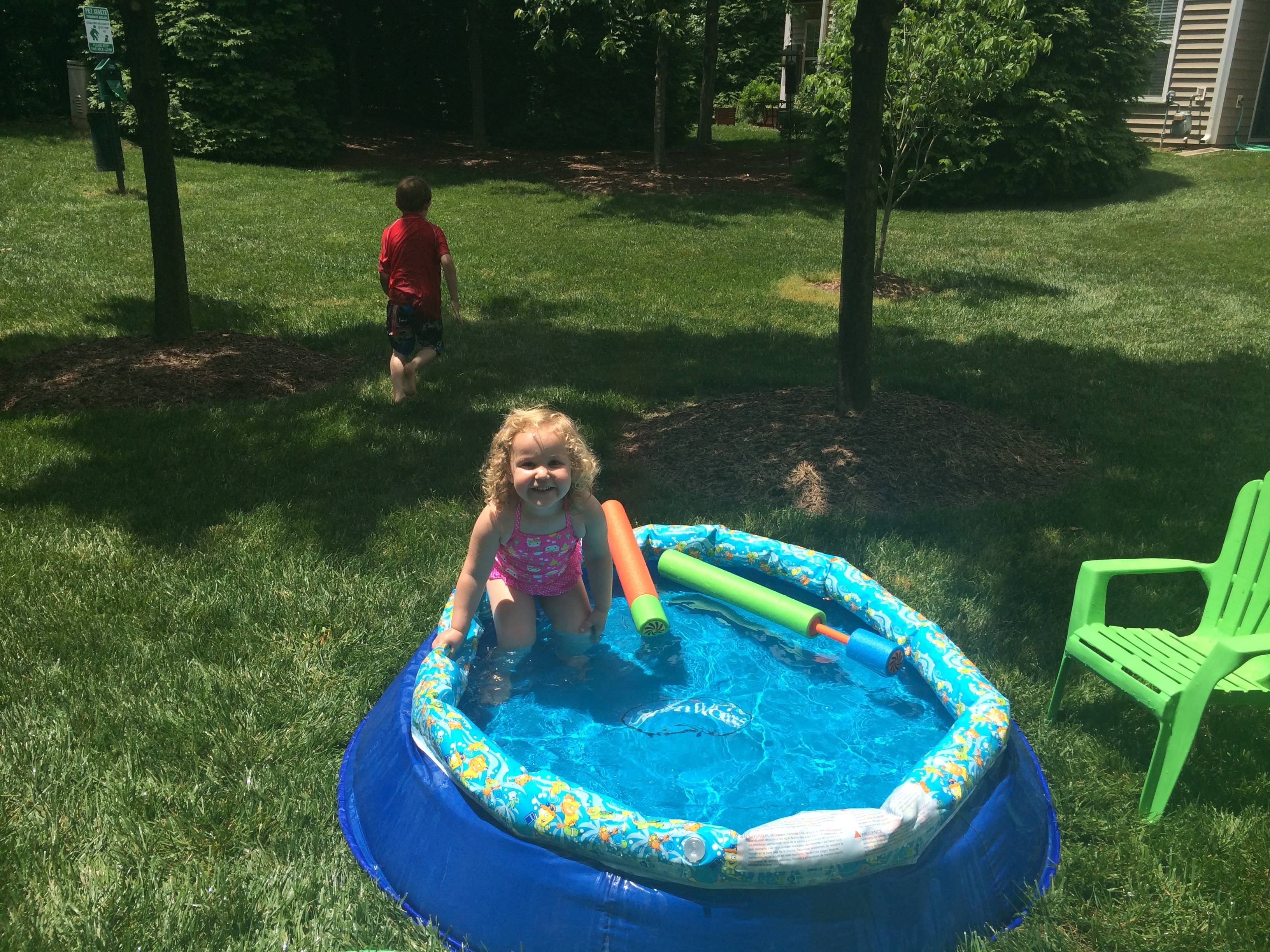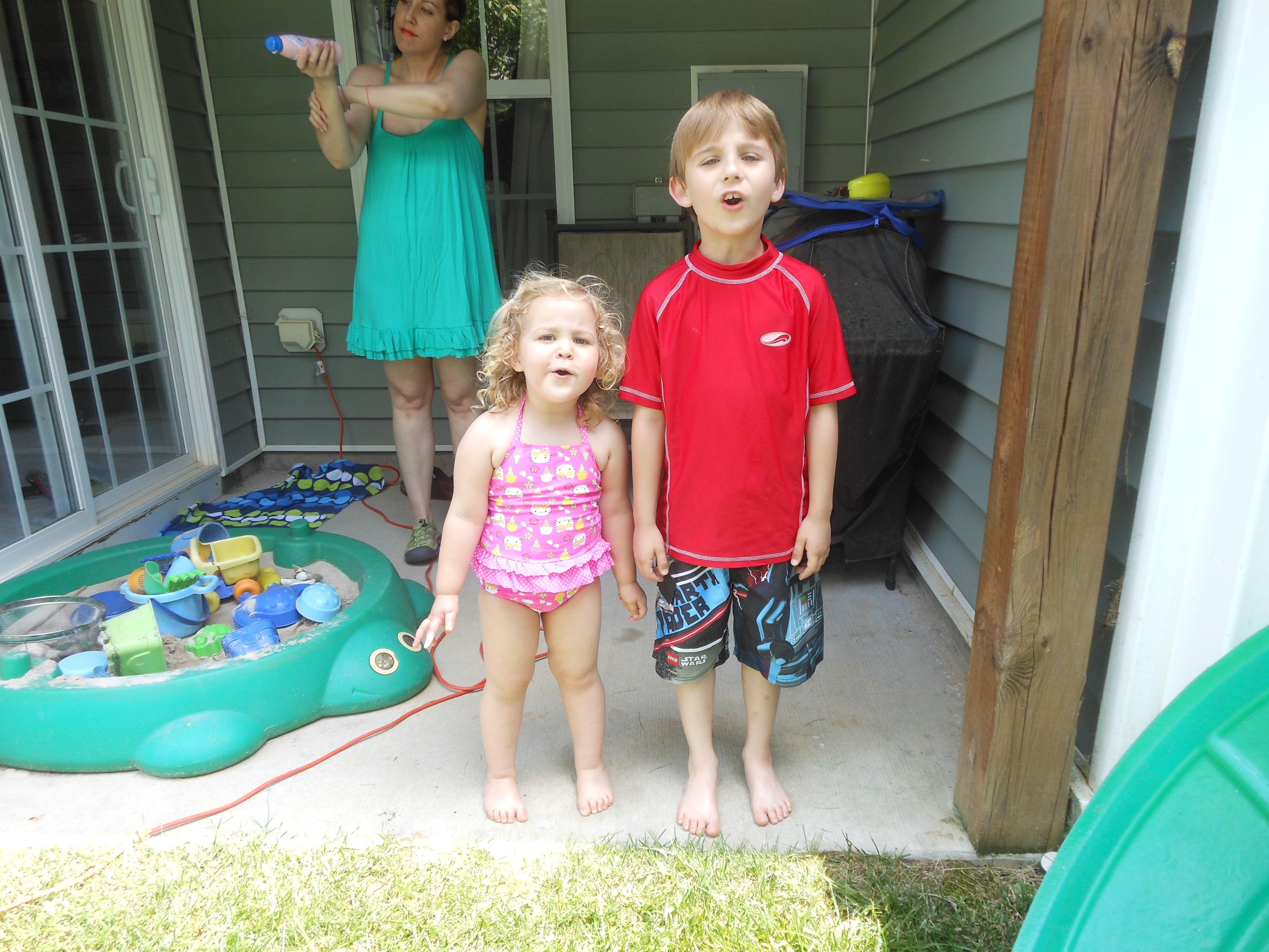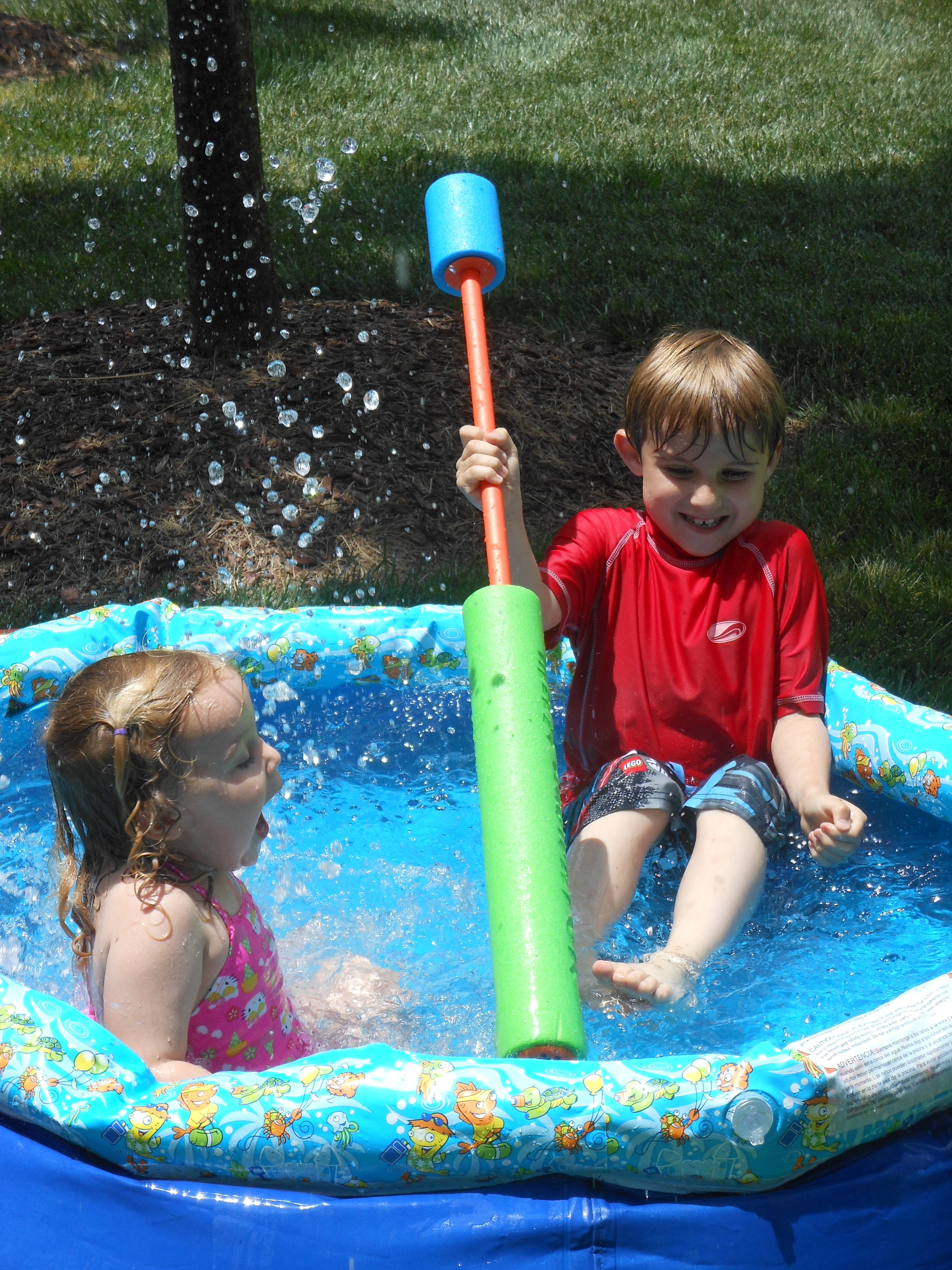 Predictably, this weekend was a hot one!  We decided to let the kids have a splash day to celebrate the summer-like weather.  While the pool was warming up, the kids played with some of their new books from the Goddard book fair–the how-to-draw books were a big hit with Brian!  I couldn’t resist drawing some animals of my own, too. 🙂  Kendall is loving her Lego Duplo Cinderella castle and coach!  Y’all know I’m not all that into the corporate-princess thing, but she really got into this castle at the Lego Kids Fest, and it has some really cool elements.  As much as I realize we don’t need one more Duplo brick in this house, she really, really loved it–and despite his initial “ew, girl stuff” reaction, Brian ended up playing with it, too. 😉  I like how they mixed sets to create some cool features (especially the slide!)  Then, we were outside for splash time!  Kendall is really enjoying her additional height this year–she can climb in and out of the pool much easier than last year!  She is much less wary about the pool, and jumps right in, making the biggest splash she can, squealing with delight!  The foam soakers continue to be a big hit with both kids.  During Kendall’s nap, Brian and I played his Lego Star Wars “Battle of Hoth” game, and in the play kitchen some.  He assures me the steak-and-cauliflower-in-a-bowl is actually a volcano brownie sundae. 😉  Very creative, Brian!