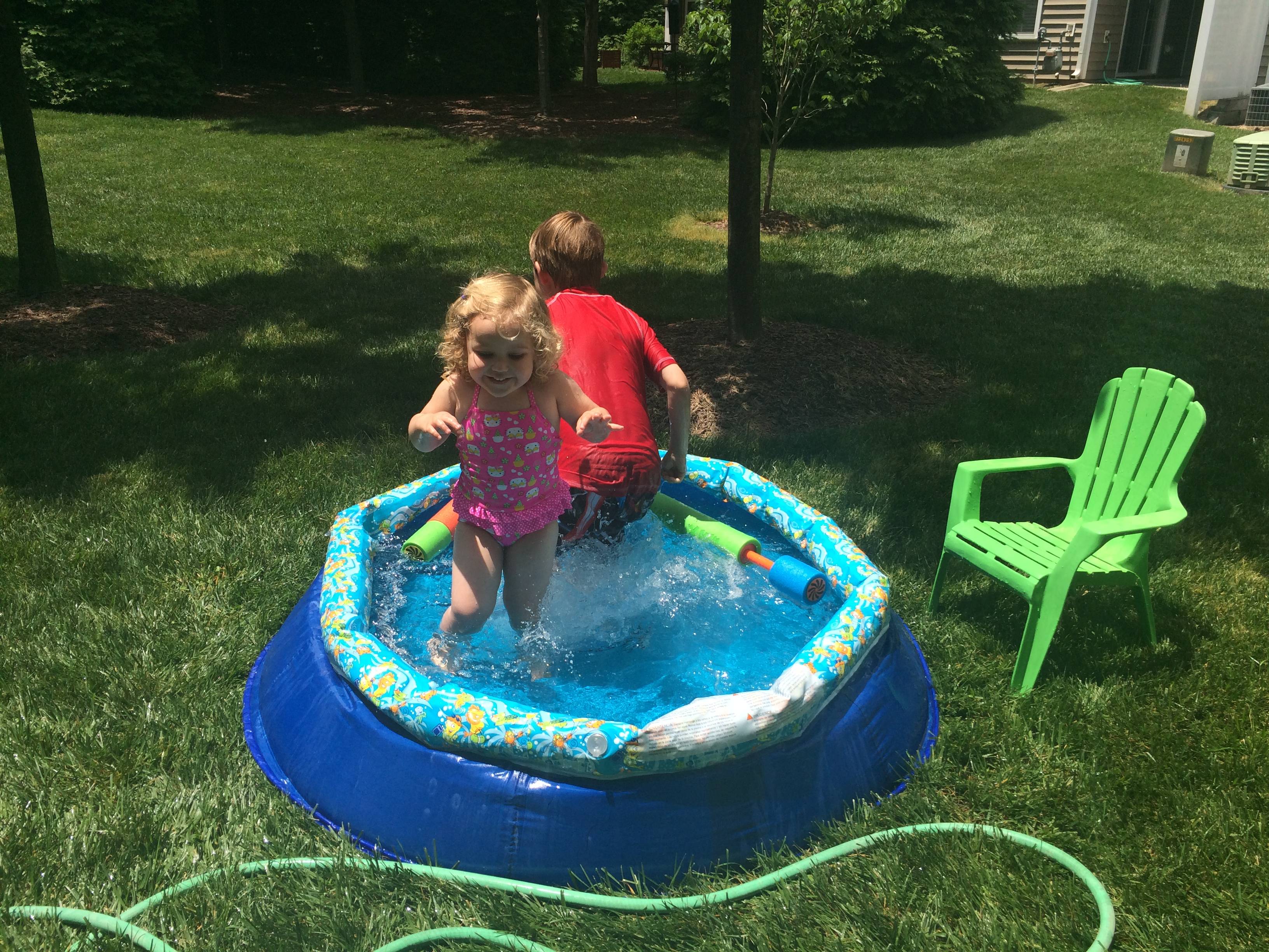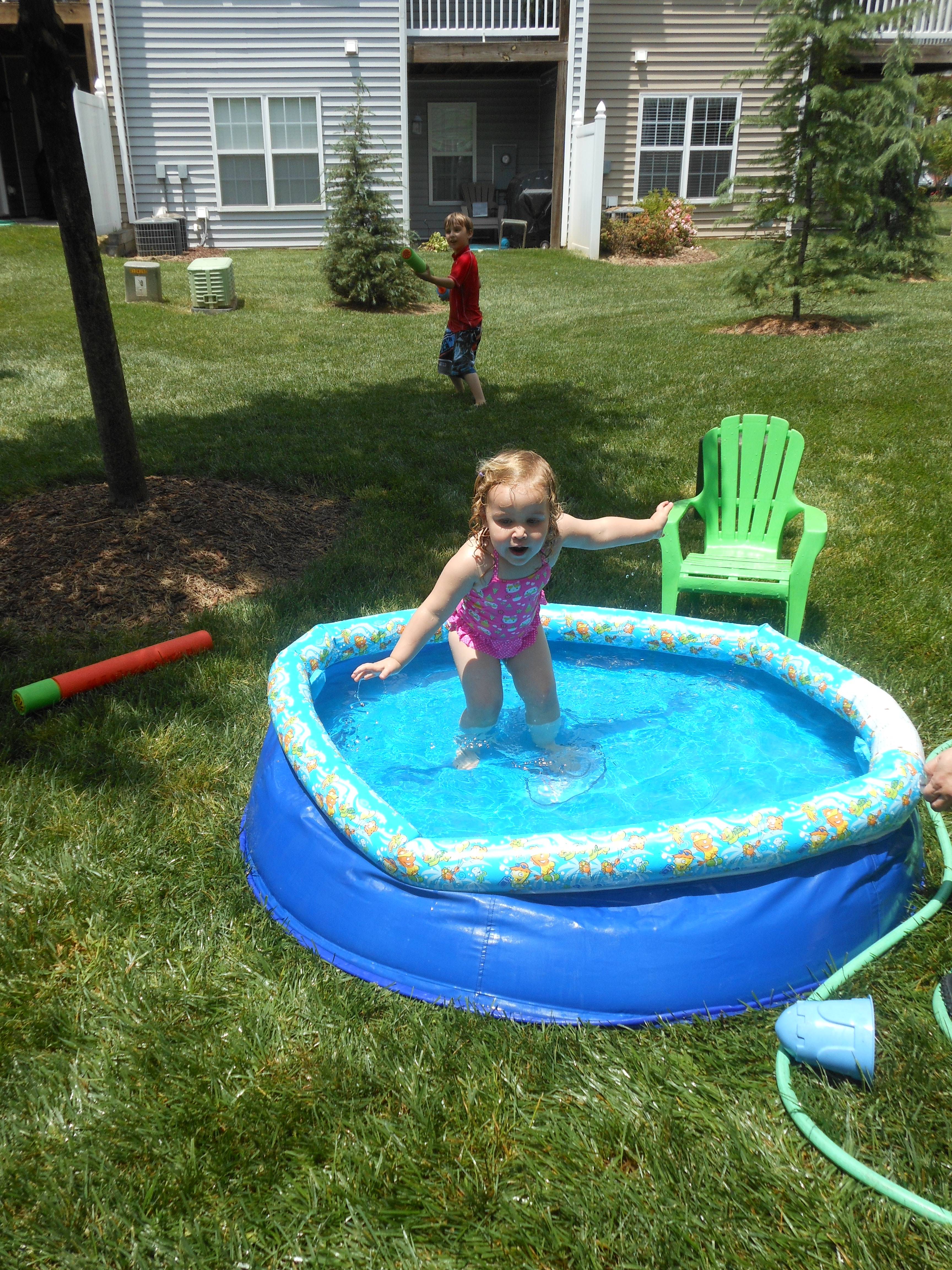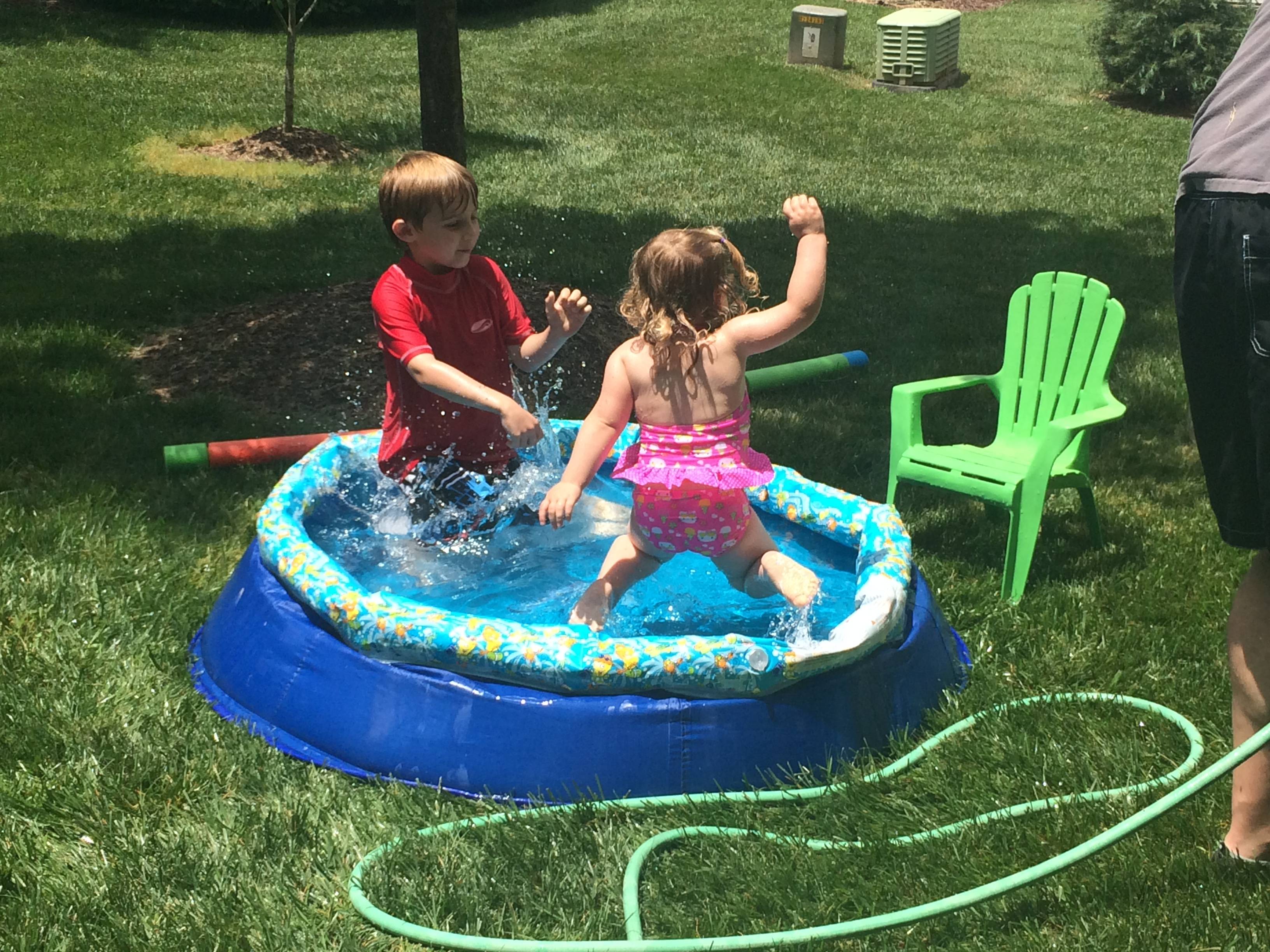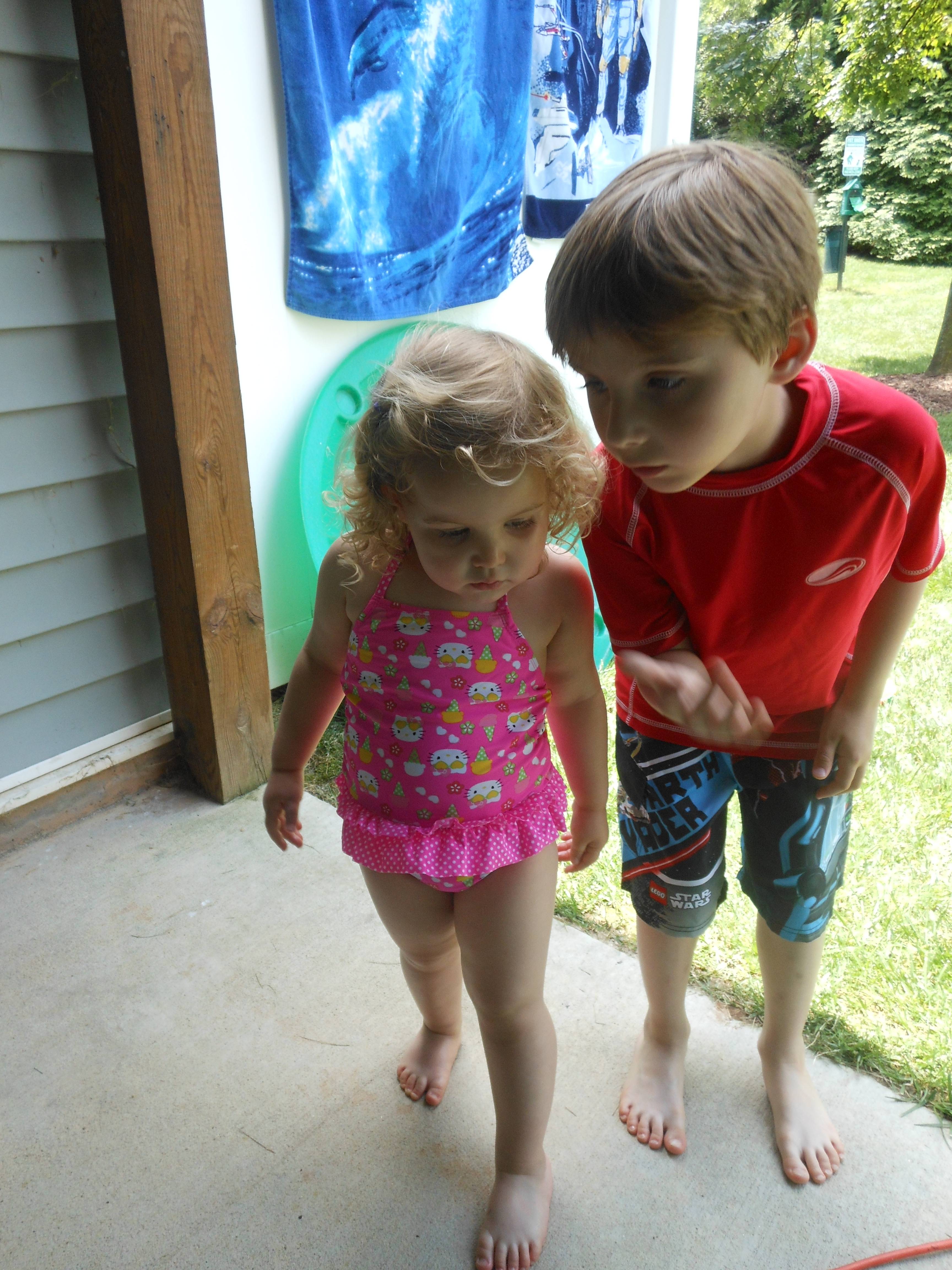 Predictably, this weekend was a hot one!  We decided to let the kids have a splash day to celebrate the summer-like weather.  While the pool was warming up, the kids played with some of their new books from the Goddard book fair–the how-to-draw books were a big hit with Brian!  I couldn’t resist drawing some animals of my own, too. 🙂  Kendall is loving her Lego Duplo Cinderella castle and coach!  Y’all know I’m not all that into the corporate-princess thing, but she really got into this castle at the Lego Kids Fest, and it has some really cool elements.  As much as I realize we don’t need one more Duplo brick in this house, she really, really loved it–and despite his initial “ew, girl stuff” reaction, Brian ended up playing with it, too. 😉  I like how they mixed sets to create some cool features (especially the slide!)  Then, we were outside for splash time!  Kendall is really enjoying her additional height this year–she can climb in and out of the pool much easier than last year!  She is much less wary about the pool, and jumps right in, making the biggest splash she can, squealing with delight!  The foam soakers continue to be a big hit with both kids.  During Kendall’s nap, Brian and I played his Lego Star Wars “Battle of Hoth” game, and in the play kitchen some.  He assures me the steak-and-cauliflower-in-a-bowl is actually a volcano brownie sundae. 😉  Very creative, Brian!