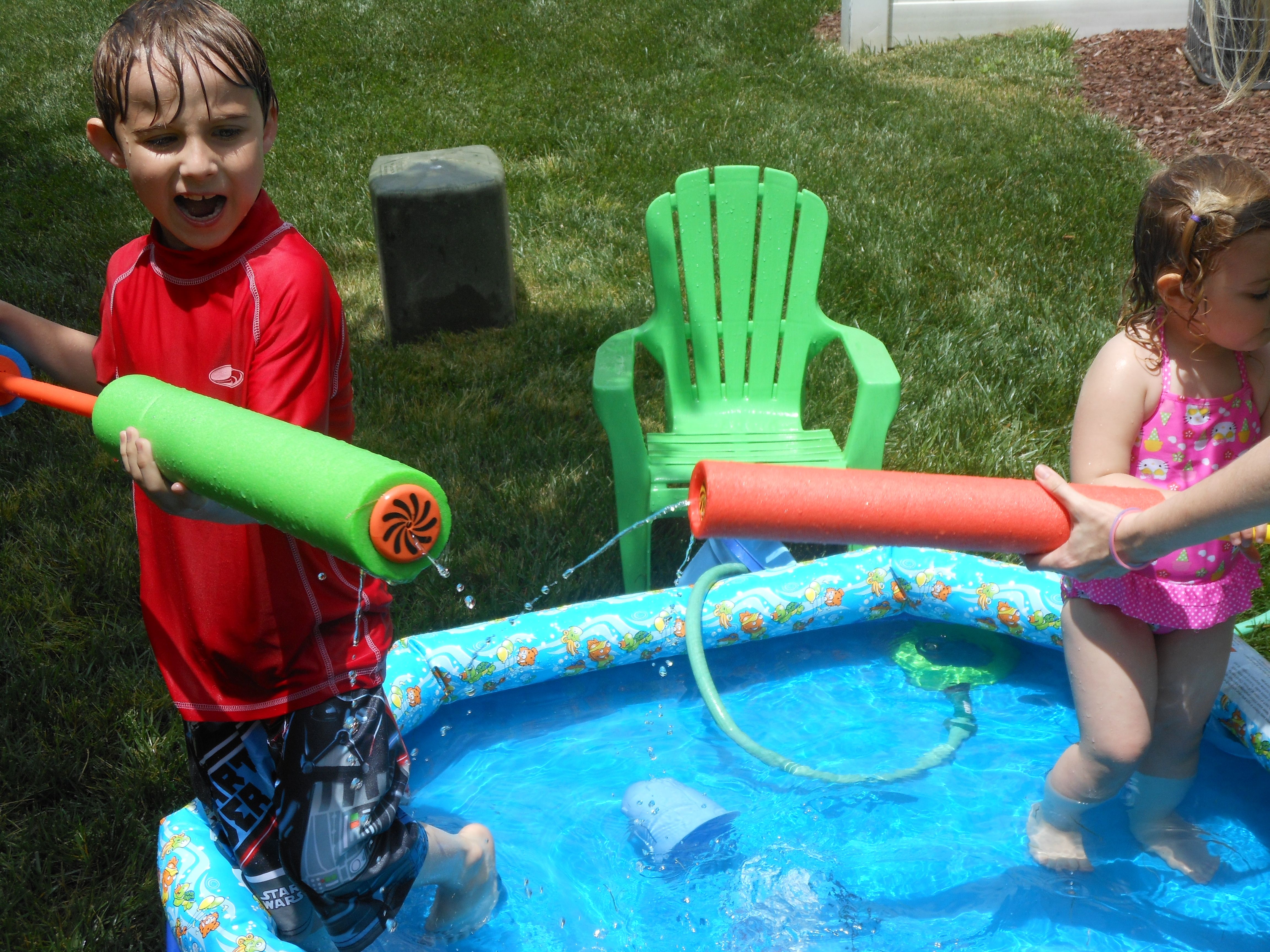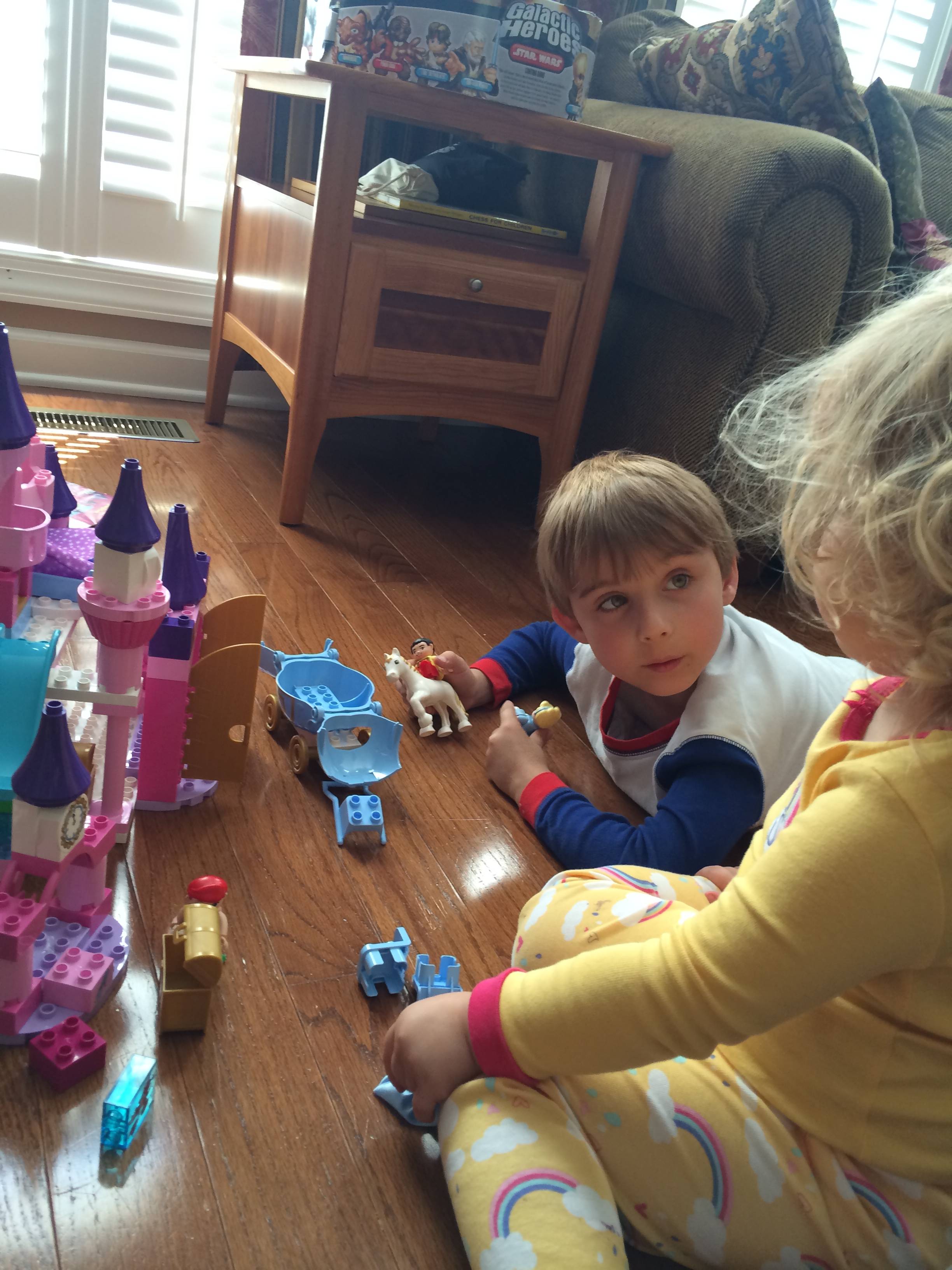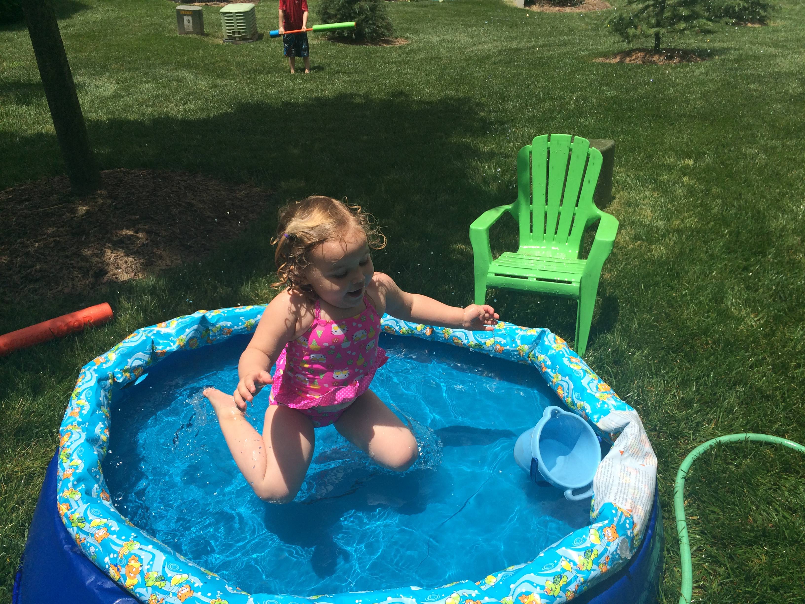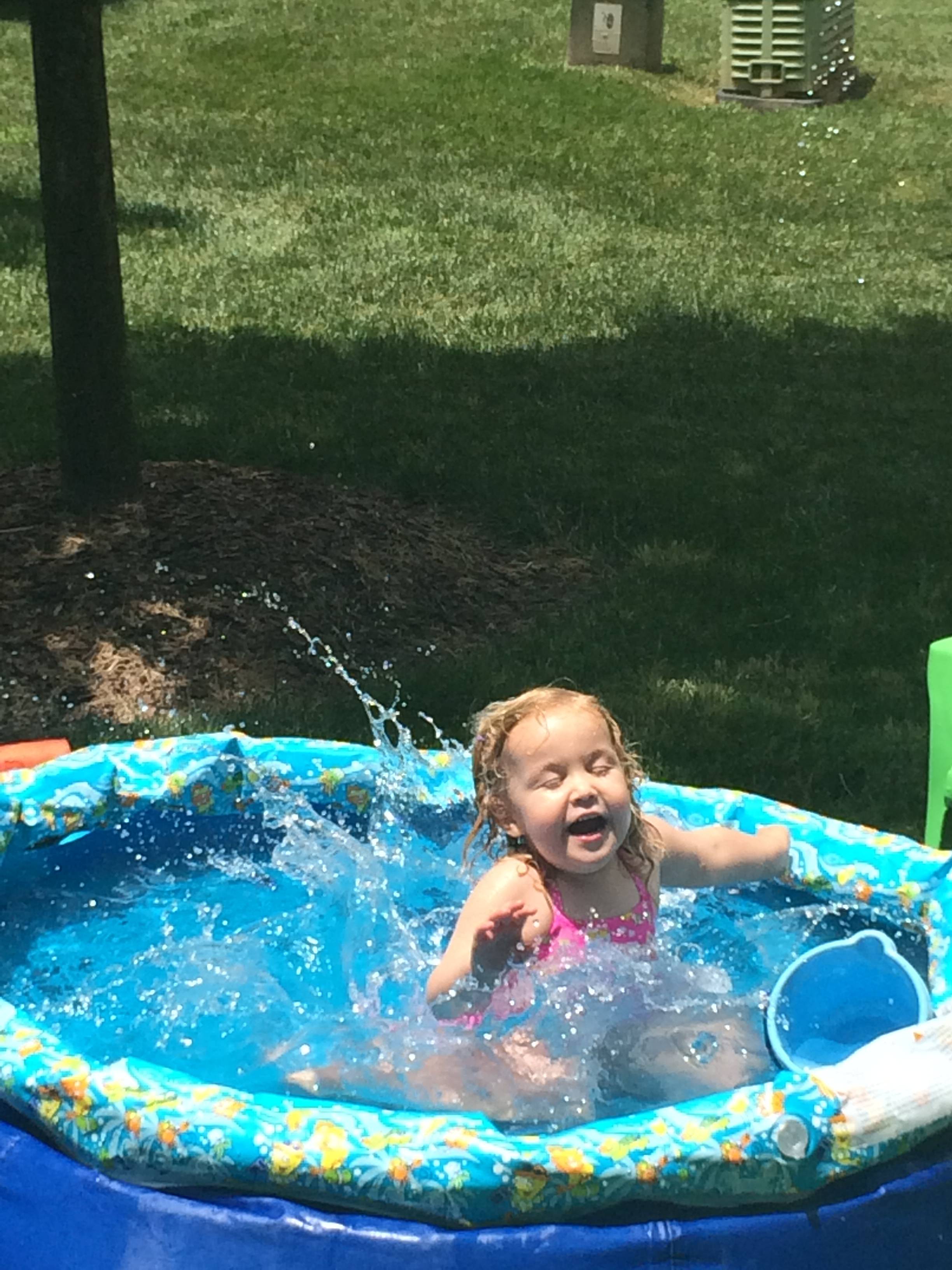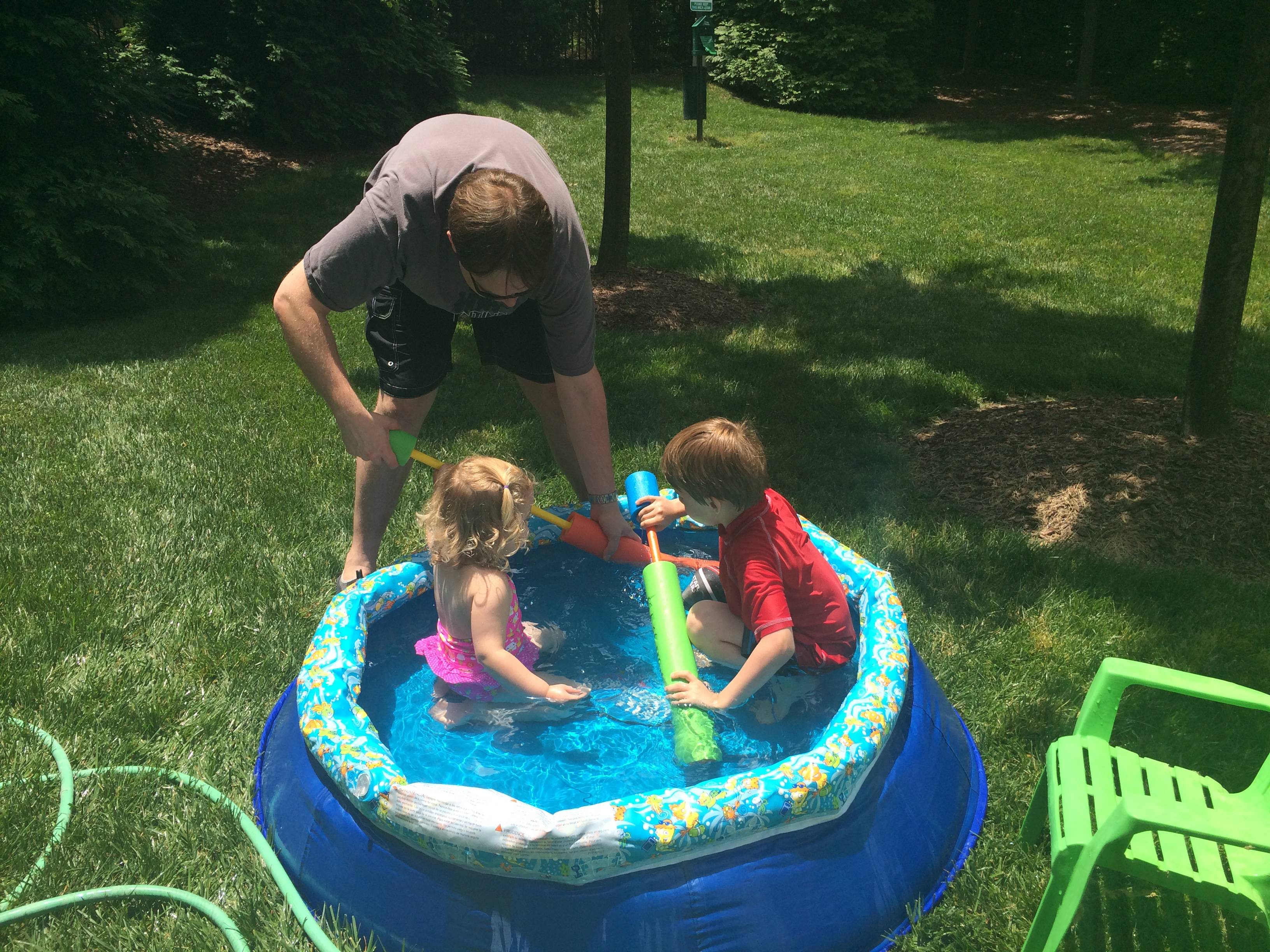 Predictably, this weekend was a hot one!  We decided to let the kids have a splash day to celebrate the summer-like weather.  While the pool was warming up, the kids played with some of their new books from the Goddard book fair–the how-to-draw books were a big hit with Brian!  I couldn’t resist drawing some animals of my own, too. 🙂  Kendall is loving her Lego Duplo Cinderella castle and coach!  Y’all know I’m not all that into the corporate-princess thing, but she really got into this castle at the Lego Kids Fest, and it has some really cool elements.  As much as I realize we don’t need one more Duplo brick in this house, she really, really loved it–and despite his initial “ew, girl stuff” reaction, Brian ended up playing with it, too. 😉  I like how they mixed sets to create some cool features (especially the slide!)  Then, we were outside for splash time!  Kendall is really enjoying her additional height this year–she can climb in and out of the pool much easier than last year!  She is much less wary about the pool, and jumps right in, making the biggest splash she can, squealing with delight!  The foam soakers continue to be a big hit with both kids.  During Kendall’s nap, Brian and I played his Lego Star Wars “Battle of Hoth” game, and in the play kitchen some.  He assures me the steak-and-cauliflower-in-a-bowl is actually a volcano brownie sundae. 😉  Very creative, Brian!
