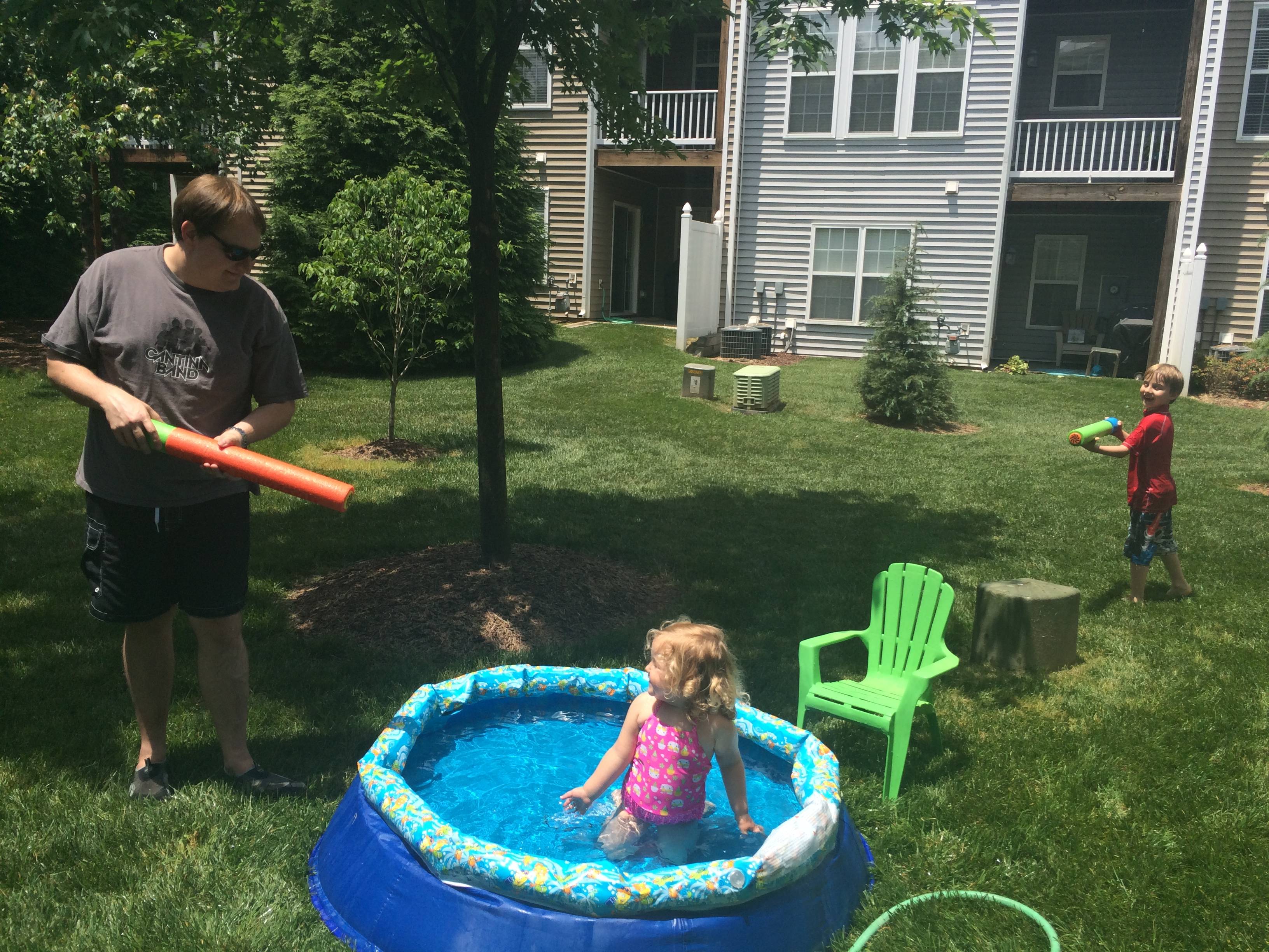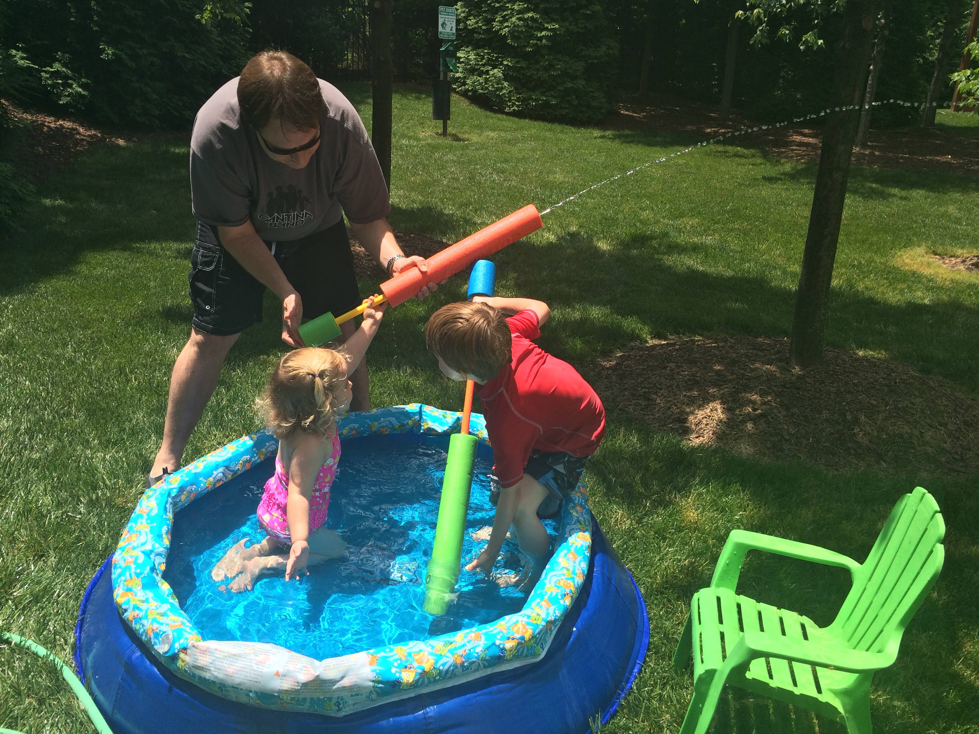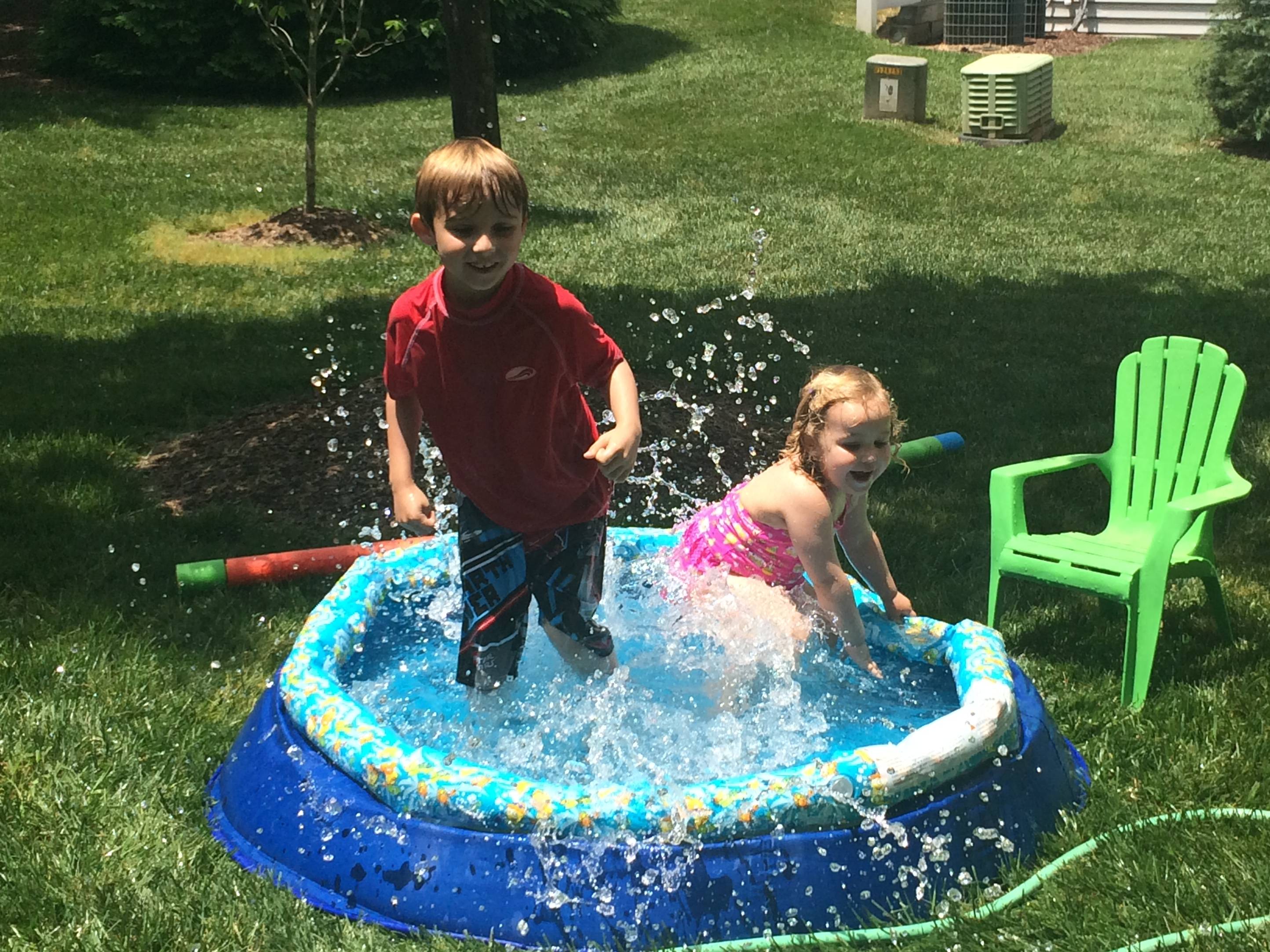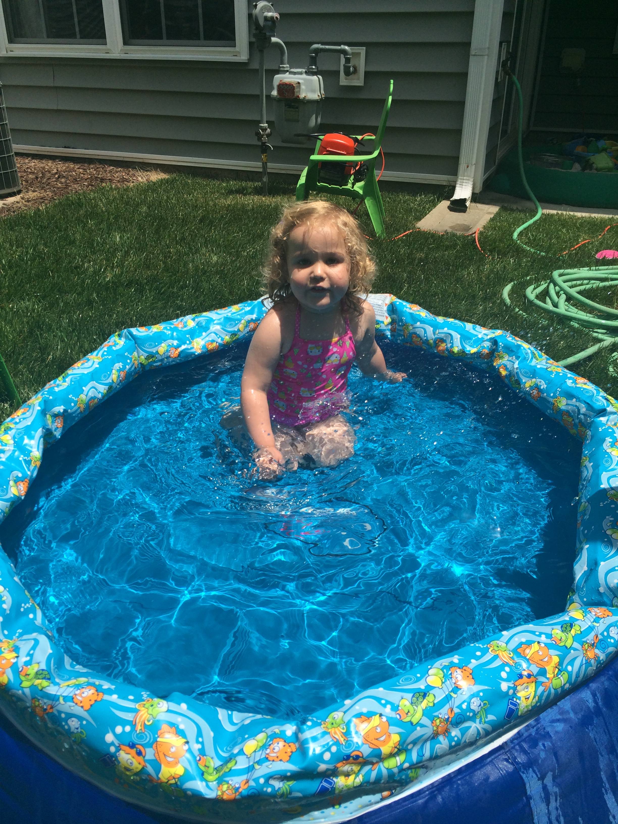 Predictably, this weekend was a hot one!  We decided to let the kids have a splash day to celebrate the summer-like weather.  While the pool was warming up, the kids played with some of their new books from the Goddard book fair–the how-to-draw books were a big hit with Brian!  I couldn’t resist drawing some animals of my own, too. 🙂  Kendall is loving her Lego Duplo Cinderella castle and coach!  Y’all know I’m not all that into the corporate-princess thing, but she really got into this castle at the Lego Kids Fest, and it has some really cool elements.  As much as I realize we don’t need one more Duplo brick in this house, she really, really loved it–and despite his initial “ew, girl stuff” reaction, Brian ended up playing with it, too. 😉  I like how they mixed sets to create some cool features (especially the slide!)  Then, we were outside for splash time!  Kendall is really enjoying her additional height this year–she can climb in and out of the pool much easier than last year!  She is much less wary about the pool, and jumps right in, making the biggest splash she can, squealing with delight!  The foam soakers continue to be a big hit with both kids.  During Kendall’s nap, Brian and I played his Lego Star Wars “Battle of Hoth” game, and in the play kitchen some.  He assures me the steak-and-cauliflower-in-a-bowl is actually a volcano brownie sundae. 😉  Very creative, Brian!