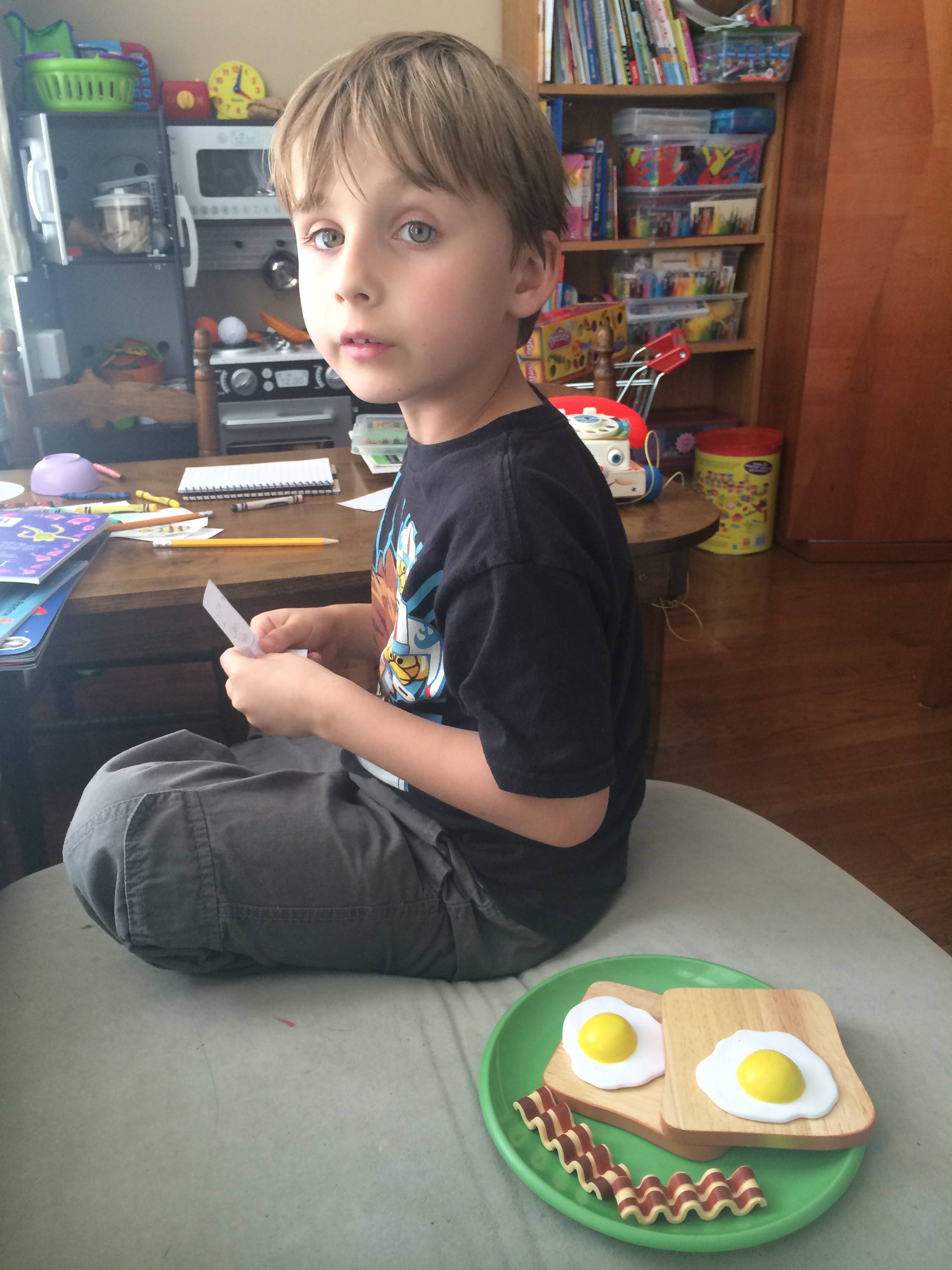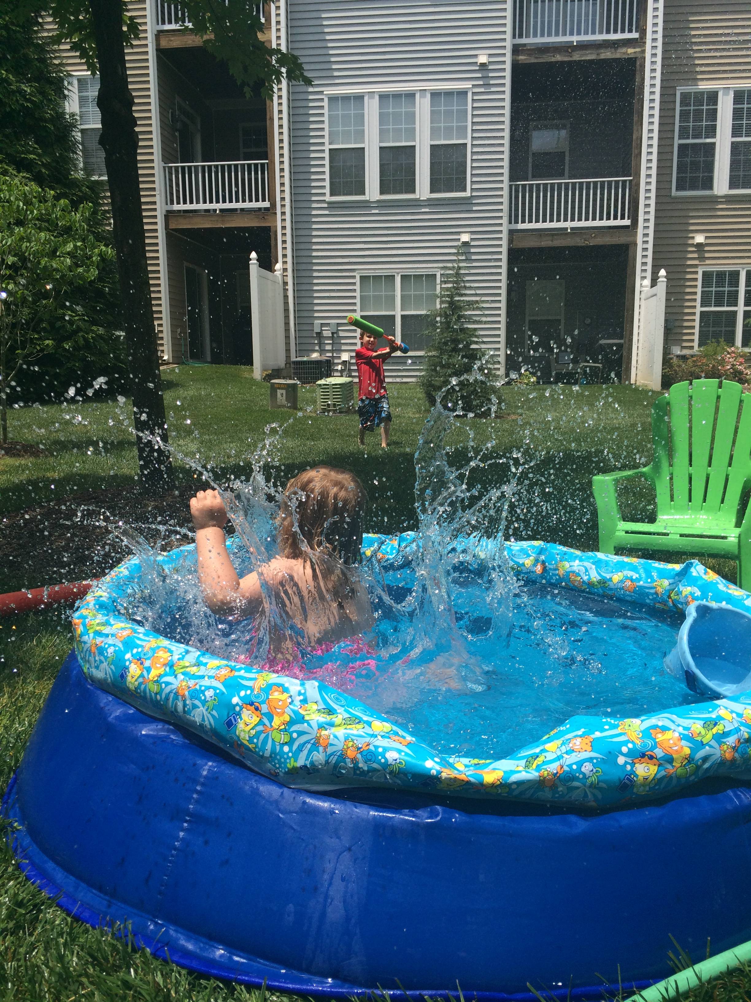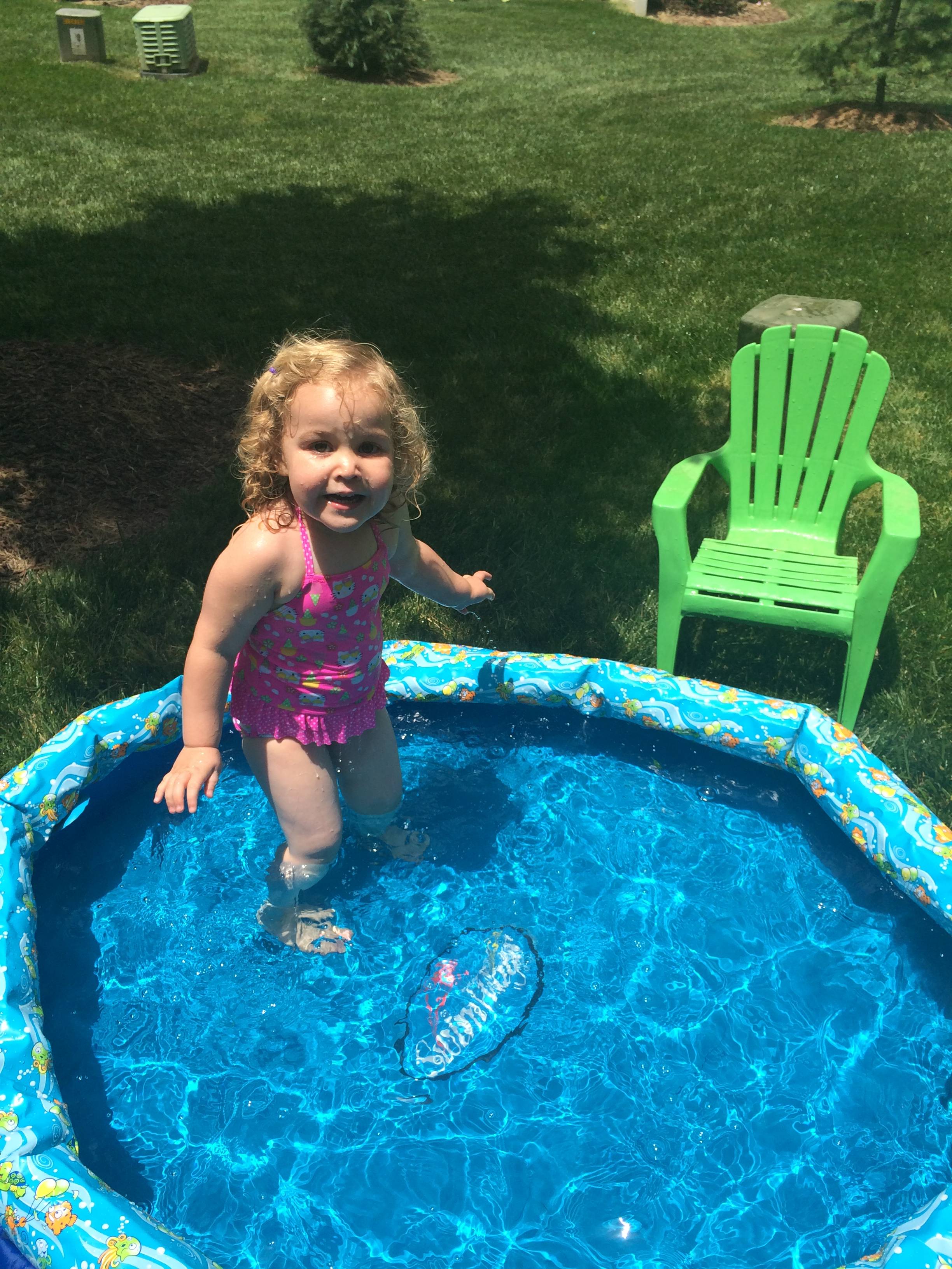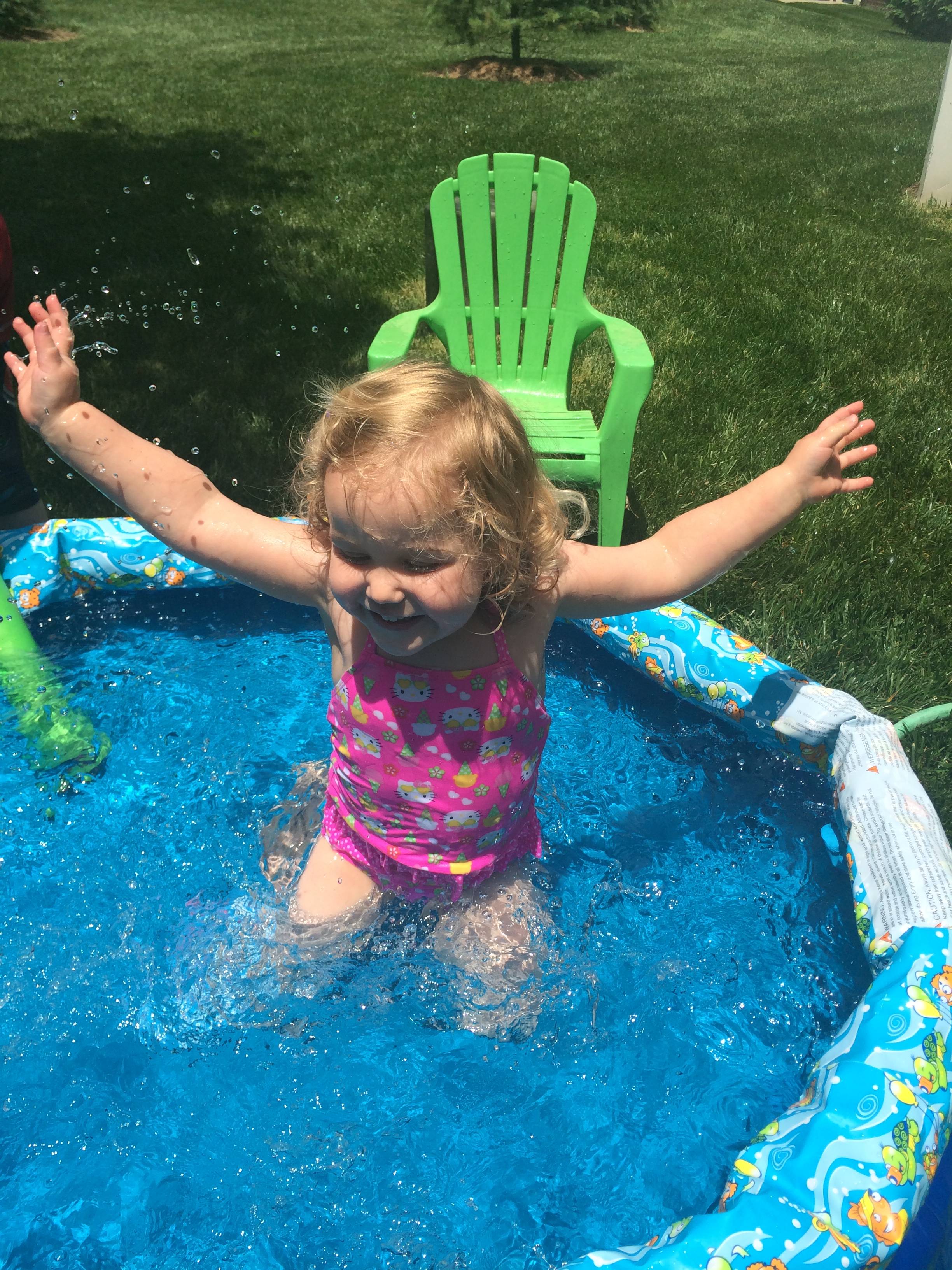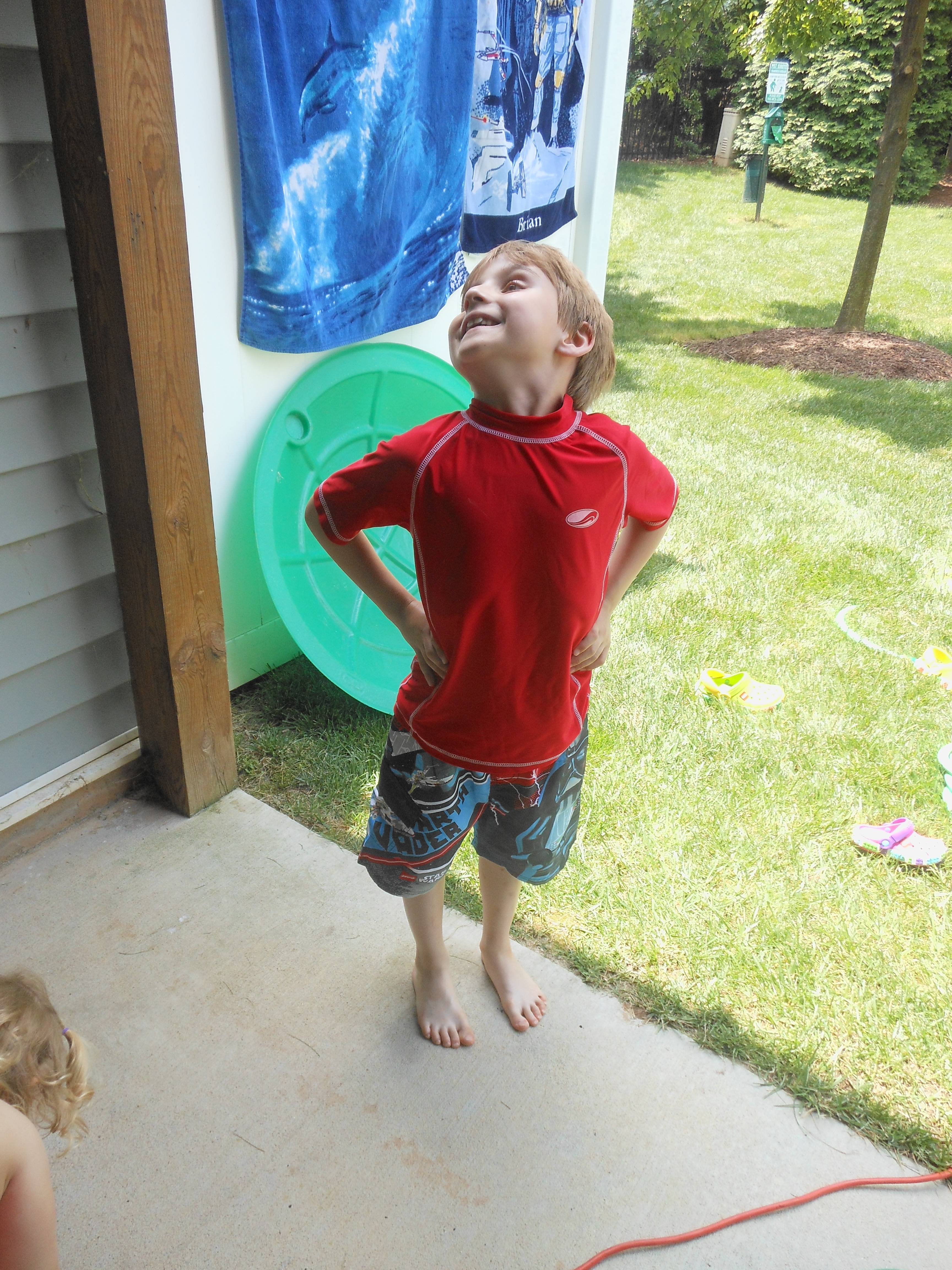 Predictably, this weekend was a hot one!  We decided to let the kids have a splash day to celebrate the summer-like weather.  While the pool was warming up, the kids played with some of their new books from the Goddard book fair–the how-to-draw books were a big hit with Brian!  I couldn’t resist drawing some animals of my own, too. 🙂  Kendall is loving her Lego Duplo Cinderella castle and coach!  Y’all know I’m not all that into the corporate-princess thing, but she really got into this castle at the Lego Kids Fest, and it has some really cool elements.  As much as I realize we don’t need one more Duplo brick in this house, she really, really loved it–and despite his initial “ew, girl stuff” reaction, Brian ended up playing with it, too. 😉  I like how they mixed sets to create some cool features (especially the slide!)  Then, we were outside for splash time!  Kendall is really enjoying her additional height this year–she can climb in and out of the pool much easier than last year!  She is much less wary about the pool, and jumps right in, making the biggest splash she can, squealing with delight!  The foam soakers continue to be a big hit with both kids.  During Kendall’s nap, Brian and I played his Lego Star Wars “Battle of Hoth” game, and in the play kitchen some.  He assures me the steak-and-cauliflower-in-a-bowl is actually a volcano brownie sundae. 😉  Very creative, Brian!