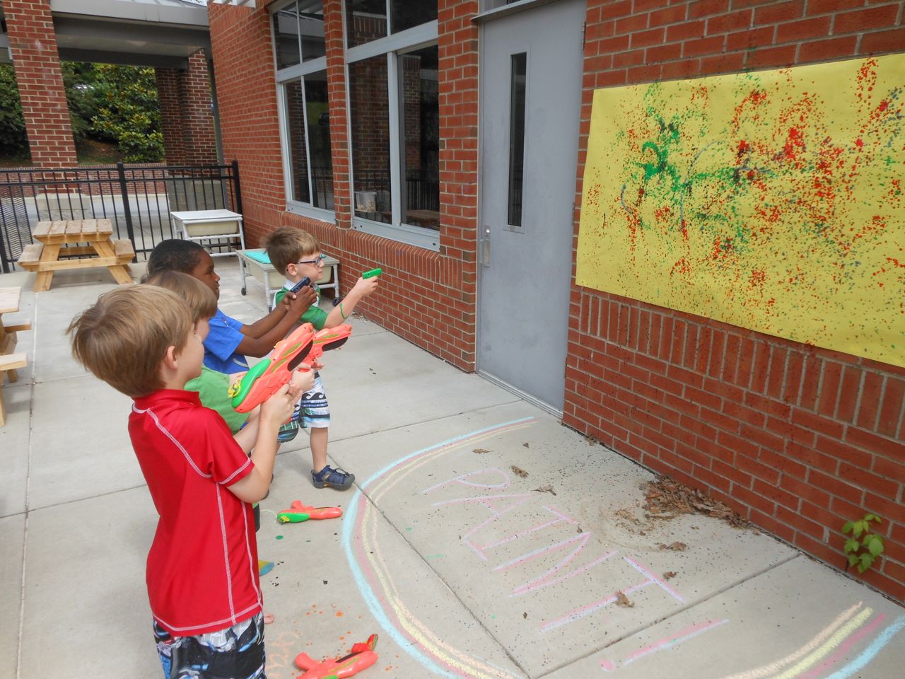 Today was the long-awaited Fun in the Sun event at Root! Brian was pretty excited about getting to go to school in his swimsuit, knowing there will be a lot of fun, messy, and wet activities today! We started out with some breakfast in the classroom, and Brandon got an early Father’s day gift from Brian. The kids did some morning activities while us parent volunteers got things set up outside the classroom. We set up a bunch of different stations, from sponge races, to water balloon baseball, to paint water guns, to shaving cream madness, to bubble scavenger hunts. Brandon was awesome, being the only dad there, he did all the heavy lifting for us, us his organizational skills helped a lot with the layout. We had some extra time, and I’d found a bunch of sidewalk chalk that had been left outside among the clover, so I made some decorations for the stations that were on the paved areas. When the kids came out, they were so surprised! Mrs. Boswell organized the kids into groups, and they rotated through each of the stations. We had to be a little quiet, since it turns out there was some end-of-grade testing going on, but the kids really had an awesome time! Brian particularly loved the shaving cream and the paint water guns. I helped out at the paint station, and Brandon had the sponge races, but after awhile, things sort of devolved into chaos and we all sort of helped out everywhere. When it was time for things to wrap up, Mrs. Boswell let the kids use up the last of the water balloons all together (I was really glad we made so many, so they could do this!) Then, as the kids were getting dressed and cleaned up, we helped clean up outside. We were glad to be there to help out Mrs. Boswell, who had only recently been released from a long stay in the hospital, following a gall bladder surgery that had some complications. The kids settled in and watched and episode of Wild Kratts, one of Brian’s current favorites! You can see him getting down during the theme song. 😉 We headed out and went to work around lunchtime. But that wasn’t all we had in store for today!